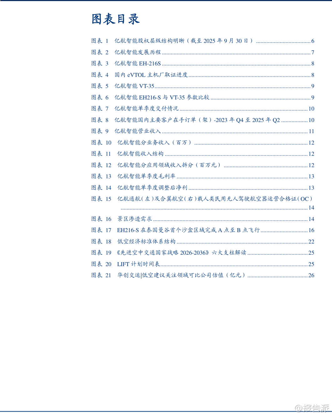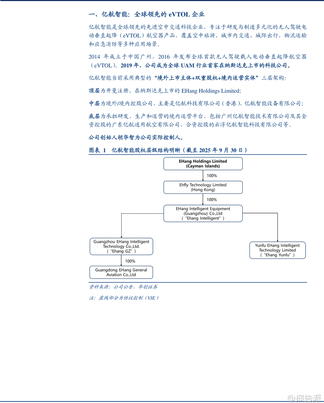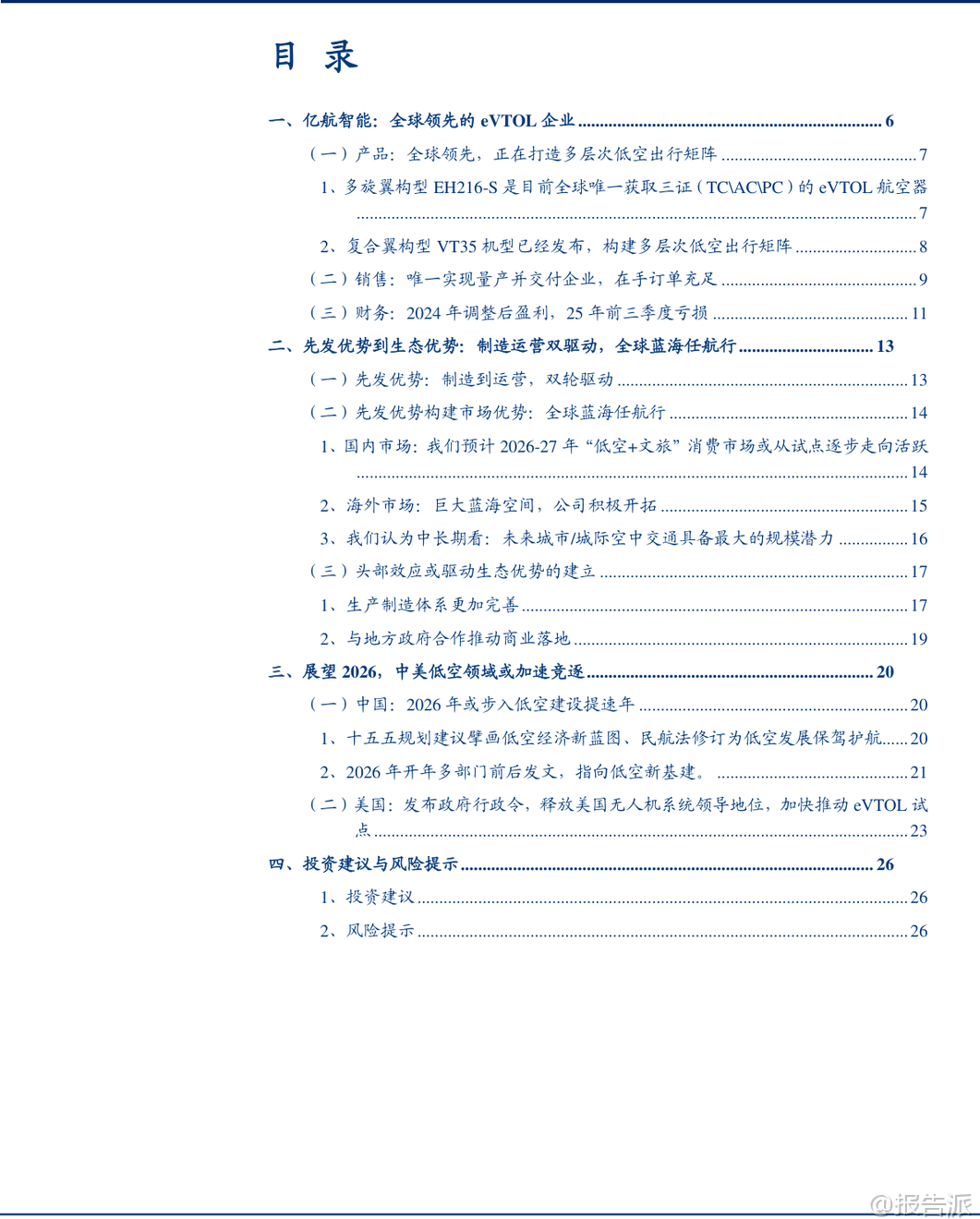 | 亿航智能(EH.US)作为全球领先的eVTOL(电动垂直起降飞行器)企业,正在引领低空经济的产业变革。 本篇由华创证券发布的深度研究报告系统梳理了亿航智能在产品、市场、财务及生态布局方面的核心优势,并展望其在全球低空经济浪潮中的战略前景。 从产品维度看,亿航智能已构建起多层次的低空出行矩阵。 其旗舰产品EH216-S是目前全球唯一获得中国民航局颁发的型号合格证(TC)、标准适航证(AC)和生产许可证(PC)“三证”齐全的无人驾驶载人eVTOL航空器,标志着其正式迈入规模化量产与商业化交付阶段。 该机型为多旋翼构型,具备轻量化、双座无人驾驶、高安全冗余(8轴16桨设计)等特点,适用于城市短途交通与景区空中游览,单机售价约239万元人民币。 2025年10月,公司推出新一代复合翼构型产品VT35,最大航程超过200公里,最大设计速度达216公里/小时以上,有效载荷超200公斤,主要面向城际、跨海、山区等中长途交通场景,进一步完善了产品体系。 在销售与订单方面,亿航智能展现出强劲的市场拓展能力。 截至2025年三季度,公司已累计交付EH216系列飞行器359架,其中2024年全年交付216架,2025年前三季度交付121架,包括首架VT35。 其客户结构以地方政府及其下属文旅企业为主,反映出当前eVTOL应用正从政策推动下的试点示范走向实际落地。 典型合作案例包括合肥市政府采购100架、山西西山文旅500架意向订单、贵州贵旅集团50架采购订单等。 这些合作不仅带来直接收入,更推动了基础设施建设、航线规划与运营资质的获取,为商业化运营奠定基础。 财务表现上,公司处于高速成长期。 2024年实现营业收入4.56亿元,同比增长288.5%,毛利率高达61.4%。 尽管2025年前三季度因交付节奏调整导致收入同比略有下滑,但公司维持全年5亿元收入指引。 值得注意的是,公司在2024年首次实现调整后盈利4309万元,显示出良好的盈利能力。 根据华创证券预测,随着交付量提升,公司有望在2026-2027年实现全面盈利,届时对应调整后净利润的市盈率具备吸引力。 亿航智能的核心竞争力在于其“先发优势”向“生态优势”的转化。 一方面,公司在制造端拥有全球首个“四证齐全”(TC/AC/PC/OC)的企业——2025年3月,旗下运营子公司获得国内首批无人驾驶载人航空器运营合格证(OC),实现了从制造到运营的闭环。 另一方面,公司积极构建产业生态:在供应链上,与英搏尔合作开发电驱动系统,与国轩高科定制动力电池,投资固态电池企业欣界能源,与敏实集团联合开发机舱系统;在市场端,与合肥、威海、长春、安顺等多个地方政府建立战略合作,共建运营中心与产业园区,推动低空经济产业集群发展。 国内市场方面,报告预计2026-2027年“低空+文旅”市场将从试点走向活跃。 假设30%的4A级以上景区引入eVTOL,每景区配置5-10架,则潜在需求可达5000-10000架。 中长期看,城市空中交通潜力巨大——仅按1%渗透率测算,我国巡游出租车存量即对应超1.3万架eVTOL需求。 而在城际交通方面,EH216系列已完成跨越琼州海峡22公里航线飞行,耗时仅18分钟,较传统轮渡效率提升70%以上。 海外市场同样空间广阔。 亿航智能已在全球21个国家开展飞行测试与合作,重点布局泰国、卡塔尔、日本、哈萨克斯坦和卢旺达。 尤其在泰国,公司启动AAM沙盒试点项目,计划2026年底前部署100架EH216用于观光、接驳等服务,有望成为全球首个商业化落地的样板。 此外,卡塔尔完成中东地区首次无人驾驶载人飞行,日本在世博会及富士山区域成功试飞,均验证了产品的国际适应性。 宏观层面,2026年或成为中国低空经济建设提速的关键年份。 “十五五”规划明确提出培育低空经济为新兴支柱产业,新修订的《民用航空法》将于2026年7月施行,为行业发展提供法律保障。 同时,十部门联合发布《低空经济标准体系建设指南》,工信部等五部门推进低空通信网络建设,政策体系正加速完善。 美国亦通过行政命令推动eVTOL试点,中美两国将在全球低空经济领域展开竞逐。 综上所述,亿航智能凭借产品领先、制造成熟、运营资质完备及生态协同优势,已成为低空经济赛道最具竞争力的企业之一。 随着国内政策落地与海外市场的持续开拓,公司有望率先享受万亿级低空经济的蓝海红利。 华创证券首次覆盖给予“推荐”评级,认为其长期价值值得重点关注。 本文由【报告派】研读,输出观点仅作为行业分析! 原文标题:华创证券-亿航智能(EH.US)深度研究报告:华创交运、低空60系列研究(二十八),先发优势到生态优势,制造运营双驱动,全球蓝海任航行 发布时间:2025年 出品方:华创证券
