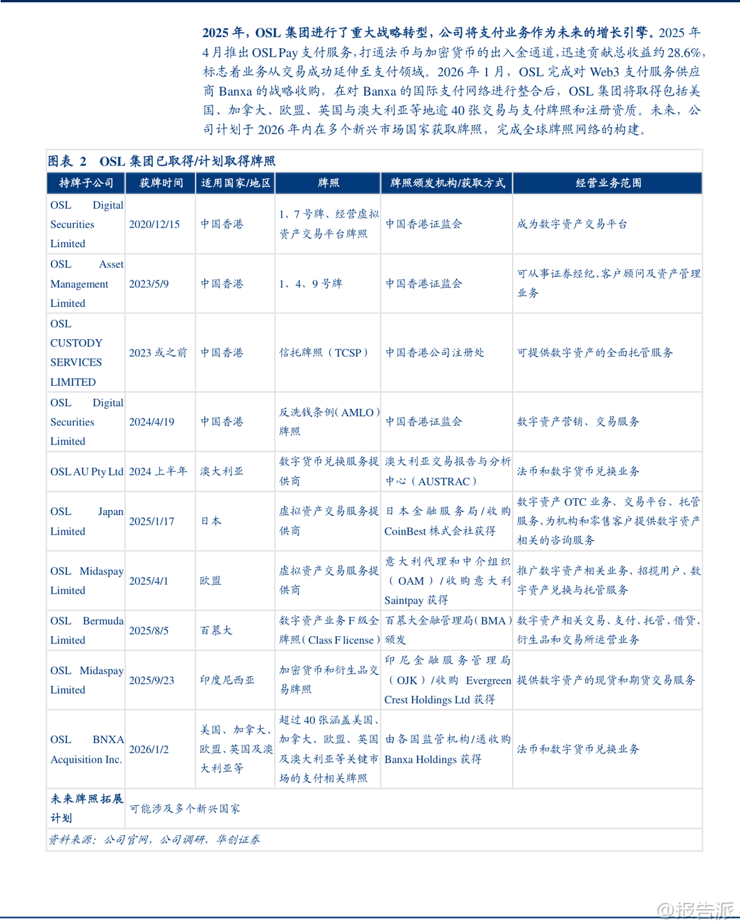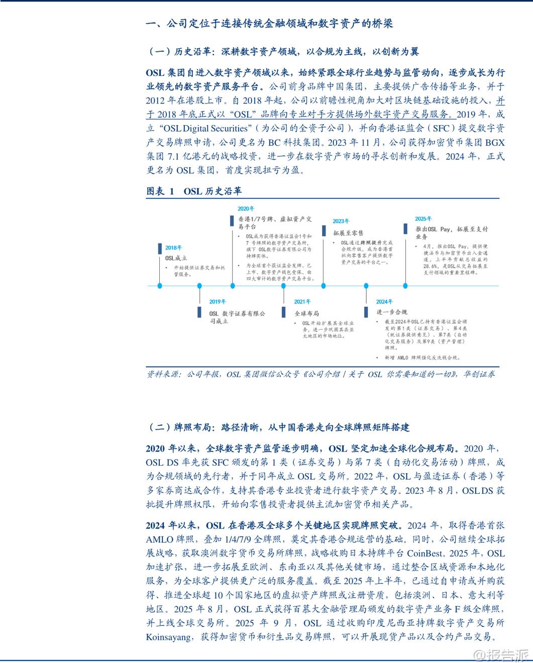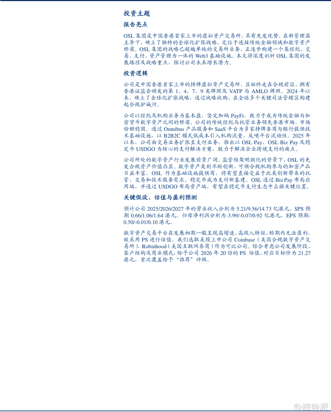 | OSL集团(00863.HK)作为中国香港首家上市的持牌虚拟资产交易所,正凭借其深厚的合规根基与前瞻性的全球化战略布局,在数字资产行业中崭露头角。 公司自2018年进入数字资产领域以来,始终将合规性置于首位,目前已持有香港证监会颁发的第1、4、7、9类牌照以及VATP(虚拟资产交易平台)和AMLO(反洗钱)牌照,构建了坚实的监管护城河。 在新管理层的带领下,OSL确立了以“连接传统金融与数字资产”为核心的战略定位,并通过一系列战略收购加速全球扩张,包括意大利Saintpay、日本CoinBest、印尼Koinsayang以及全球Web3支付基础设施Banxa,逐步建立起覆盖亚太、欧洲、北美等关键市场的合规网络。 2024年成为OSL发展的关键转折点,公司首次实现单年度扭亏为盈。 根据IFRS准则,2024年收入达3.75亿港元,同比增长78.6%,创下历史新高;持续经营业务溢利约5500万港元,相较2023年亏损2.5亿港元大幅改善。 进入2025年上半年,收入继续同比增长58%至1.95亿港元,展现出强劲的增长动能。 值得注意的是,全新推出的支付业务OSL Pay在2025年上半年即贡献收入5590万港元,占总收入比重达29%,迅速成长为公司重要的增量引擎,标志着OSL从传统的交易与经纪平台向综合性数字金融基础设施的成功转型。 公司的业务架构清晰地分为两大支柱:一是以经纪及机构服务为基本盘的传统优势业务,二是以PayFi(支付金融)为核心的第二增长曲线。 在基本盘方面,OSL在香港市场保持领先地位,为华夏基金、嘉实基金等头部机构提供比特币现货ETF的次托管服务,截至2025年上半年托管资产规模达57亿港元,市场份额稳固。 同时,公司通过Omnibus产品为盈透证券(香港)等多家持牌券商与银行提供技术基础设施支持,以B2B2C模式低成本引入机构流量,反哺自身平台流动性,形成了良好的业务闭环。 而真正驱动未来高增长的核心在于其对PayFi生态的全面布局。 OSL围绕企业级跨境支付痛点,打造了三位一体的战略产品矩阵:首先是OSL Pay,作为入金通道解决方案,已于2025年4月推出,主要服务于Web3钱包客户,打通法币与加密货币的兑换路径;其次是OSL Biz Pay,于2025年7月上线,为企业客户提供基于稳定币的高效、低成本跨境支付服务,支持USDT、USDC等主流稳定币,实现“即付即收”,并计划拓展至非洲至欧洲、非洲至香港等新兴市场支付通道;最后是即将于2026年初推出的美元稳定币USDGO,该稳定币由美国联邦特许的Anchorage Digital Bank发行,OSL负责品牌运营与分销,首发部署于Solana链,旨在成为全球企业级支付的合规数字美元基础设施。 这一系列布局使OSL有望在稳定币支付生态中占据核心节点位置。 行业层面,多重利好正推动OSL所处赛道进入高速发展期。 一方面,全球主要经济体如中国香港、美国(GENIUS法案)、欧盟(MiCA)等相继出台明确的稳定币监管框架,合规已成为行业准入的“硬门槛”,凸显了OSL先发合规优势的巨大价值。 另一方面,数字资产类别不断丰富,从现货ETF到质押服务,再到RWA(真实世界资产)代币化浪潮兴起,为OSL这样的基础设施提供商带来了托管、交易和技术服务的广阔需求空间。 特别是RWA市场,预计到2030年全球规模可达16万亿美元,OSL作为具备全栈服务能力的平台,有望深度受益于此轮结构性机遇。 基于对公司未来三年的盈利预测,华创证券预计OSL在2025年因全球扩张投入较大仍将录得亏损,但自2026年起将迎来业绩拐点,归母净利润有望转正,并在2027年实现显著增长。 考虑到公司在合规、牌照、全球化布局方面的稀缺性,以及在企业支付与稳定币领域的领先卡位,分析师给予其2026年20倍PS目标估值,对应目标价21.27港元,首次覆盖即给予“推荐”评级。 当然,投资也需警惕数字资产价格大幅波动、全球监管政策变动以及行业竞争加剧等潜在风险。 总体而言,OSL集团正站在合规化与创新化的交汇点上,致力于成为传统金融与数字世界之间不可或缺的桥梁,其发展前景值得高度关注。 本文由【报告派】研读,输出观点仅作为行业分析! 原文标题:2026-02-16-华创证券-华创证券-OSL集团(00863.HK)深度研究报告:合规为本,把握稳定币与支付新机遇 发布时间:2026年 报告出品方:华创证券