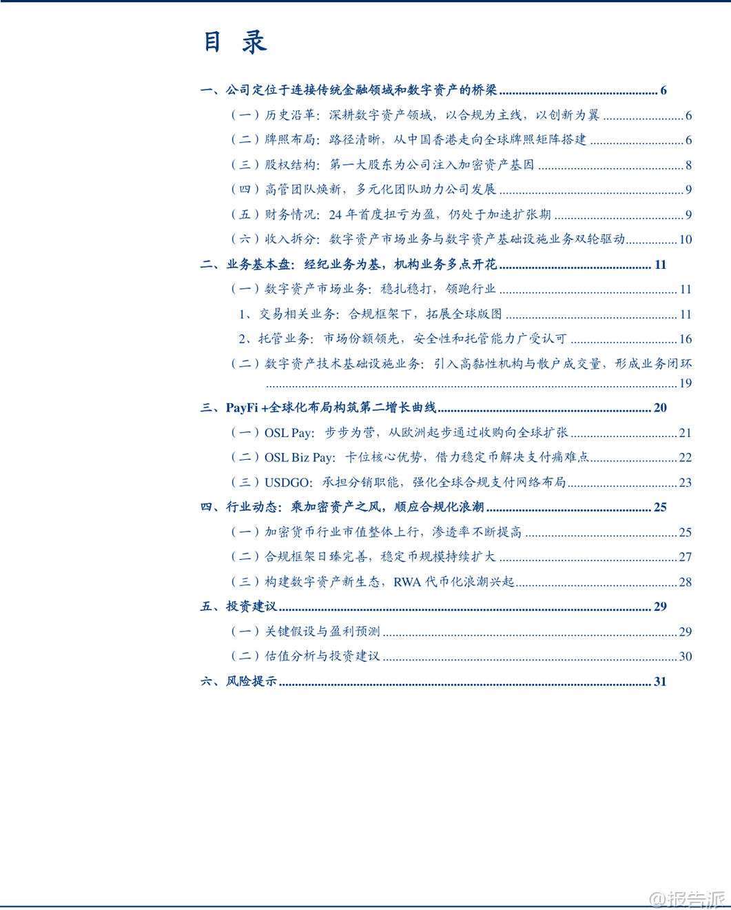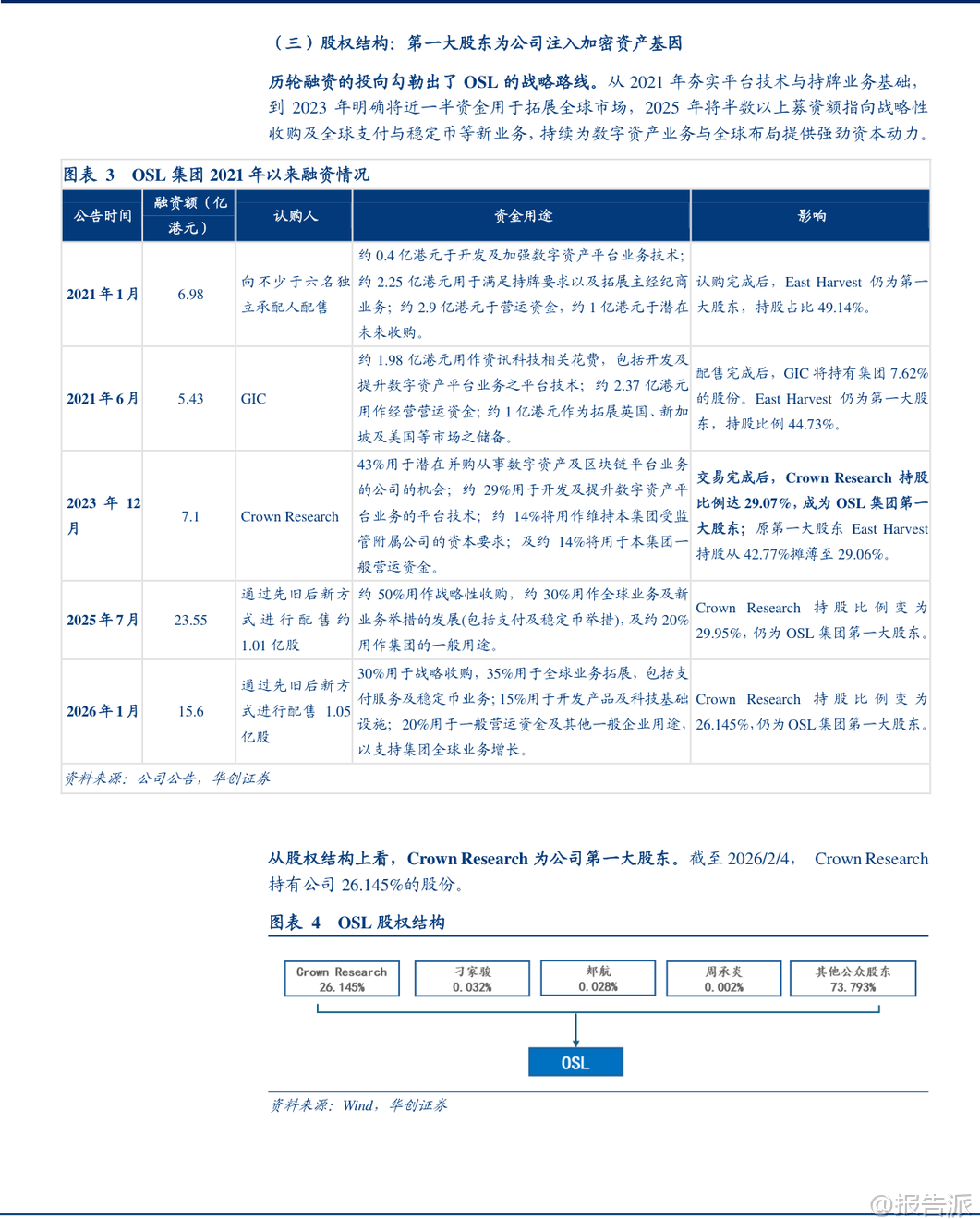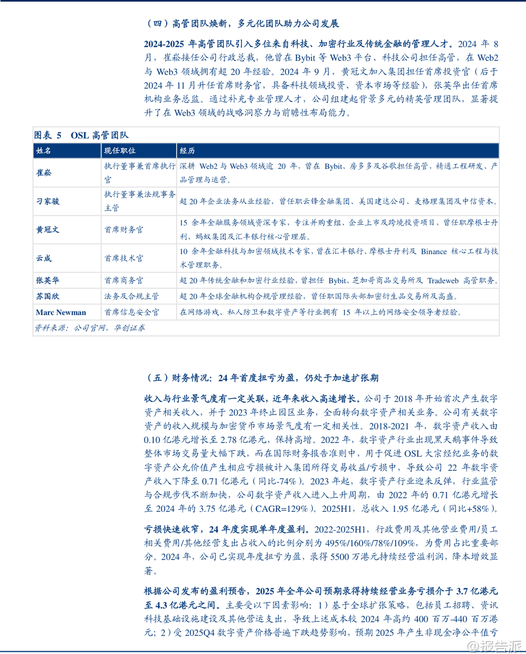 | OSL集团(00863.HK)作为中国香港首家上市的持牌虚拟资产交易所,正凭借其深厚的合规根基与前瞻性的全球化战略布局,在数字资产行业中崭露头角。 公司自2018年进入数字资产领域以来,始终将合规性置于首位,目前已持有香港证监会颁发的第1、4、7、9类牌照以及VATP(虚拟资产交易平台)和AMLO(反洗钱)牌照,构建了坚实的监管护城河。 在新管理层的带领下,OSL确立了以“连接传统金融与数字资产”为核心的战略定位,并通过一系列战略收购加速全球扩张,包括意大利Saintpay、日本CoinBest、印尼Koinsayang以及全球Web3支付基础设施Banxa,逐步建立起覆盖亚太、欧洲、北美等关键市场的合规网络。 2024年成为OSL发展的关键转折点,公司首次实现单年度扭亏为盈。 根据IFRS准则,2024年收入达3.75亿港元,同比增长78.6%,创下历史新高;持续经营业务溢利约5500万港元,相较2023年亏损2.5亿港元大幅改善。 进入2025年上半年,收入继续同比增长58%至1.95亿港元,展现出强劲的增长动能。 值得注意的是,全新推出的支付业务OSL Pay在2025年上半年即贡献收入5590万港元,占总收入比重达29%,迅速成长为公司重要的增量引擎,标志着OSL从传统的交易与经纪平台向综合性数字金融基础设施的成功转型。 公司的业务架构清晰地分为两大支柱:一是以经纪及机构服务为基本盘的传统优势业务,二是以PayFi(支付金融)为核心的第二增长曲线。 在基本盘方面,OSL在香港市场保持领先地位,为华夏基金、嘉实基金等头部机构提供比特币现货ETF的次托管服务,截至2025年上半年托管资产规模达57亿港元,市场份额稳固。 同时,公司通过Omnibus产品为盈透证券(香港)等多家持牌券商与银行提供技术基础设施支持,以B2B2C模式低成本引入机构流量,反哺自身平台流动性,形成了良好的业务闭环。 而真正驱动未来高增长的核心在于其对PayFi生态的全面布局。 OSL围绕企业级跨境支付痛点,打造了三位一体的战略产品矩阵:首先是OSL Pay,作为入金通道解决方案,已于2025年4月推出,主要服务于Web3钱包客户,打通法币与加密货币的兑换路径;其次是OSL Biz Pay,于2025年7月上线,为企业客户提供基于稳定币的高效、低成本跨境支付服务,支持USDT、USDC等主流稳定币,实现“即付即收”,并计划拓展至非洲至欧洲、非洲至香港等新兴市场支付通道;最后是即将于2026年初推出的美元稳定币USDGO,该稳定币由美国联邦特许的Anchorage Digital Bank发行,OSL负责品牌运营与分销,首发部署于Solana链,旨在成为全球企业级支付的合规数字美元基础设施。 这一系列布局使OSL有望在稳定币支付生态中占据核心节点位置。 行业层面,多重利好正推动OSL所处赛道进入高速发展期。 一方面,全球主要经济体如中国香港、美国(GENIUS法案)、欧盟(MiCA)等相继出台明确的稳定币监管框架,合规已成为行业准入的“硬门槛”,凸显了OSL先发合规优势的巨大价值。 另一方面,数字资产类别不断丰富,从现货ETF到质押服务,再到RWA(真实世界资产)代币化浪潮兴起,为OSL这样的基础设施提供商带来了托管、交易和技术服务的广阔需求空间。 特别是RWA市场,预计到2030年全球规模可达16万亿美元,OSL作为具备全栈服务能力的平台,有望深度受益于此轮结构性机遇。 基于对公司未来三年的盈利预测,华创证券预计OSL在2025年因全球扩张投入较大仍将录得亏损,但自2026年起将迎来业绩拐点,归母净利润有望转正,并在2027年实现显著增长。 考虑到公司在合规、牌照、全球化布局方面的稀缺性,以及在企业支付与稳定币领域的领先卡位,分析师给予其2026年20倍PS目标估值,对应目标价21.27港元,首次覆盖即给予“推荐”评级。 当然,投资也需警惕数字资产价格大幅波动、全球监管政策变动以及行业竞争加剧等潜在风险。 总体而言,OSL集团正站在合规化与创新化的交汇点上,致力于成为传统金融与数字世界之间不可或缺的桥梁,其发展前景值得高度关注。 本文由【报告派】研读,输出观点仅作为行业分析! 原文标题:2026-02-16-华创证券-华创证券-OSL集团(00863.HK)深度研究报告:合规为本,把握稳定币与支付新机遇 发布时间:2026年 报告出品方:华创证券
