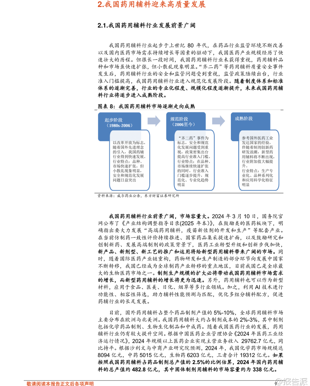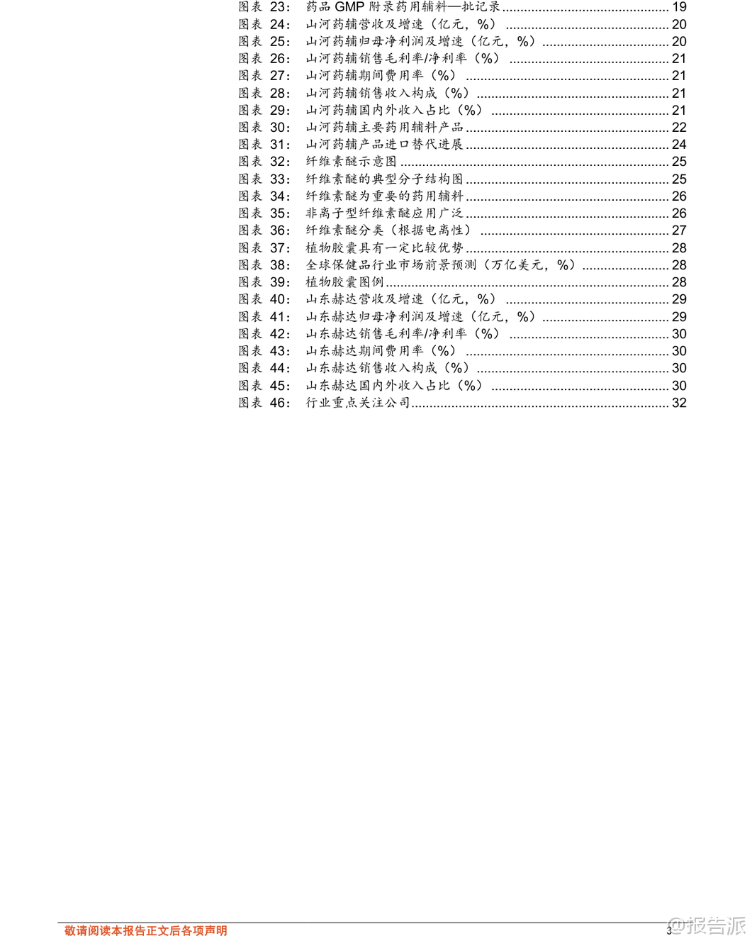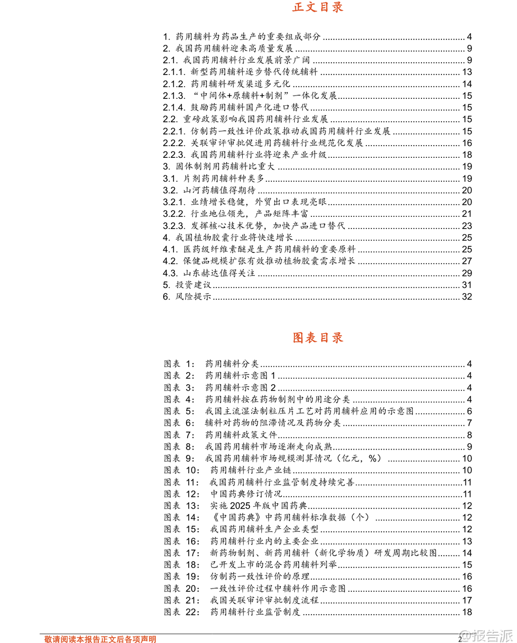| 在医药产业升级与政策驱动的双重背景下,药用辅料这一“小而美”的细分赛道正迎来历史性发展机遇。 作为药品制剂不可或缺的基础材料,药用辅料不仅承担赋形、稳定等基础功能,更在控释、增溶、提升生物利用度等方面发挥关键作用。 近年来,随着监管体系日趋完善、标准不断升级,我国药用辅料行业正从过去的“小散乱”阶段加速迈向专业化、规模化和高质量发展的成熟期。 政策红利持续释放,为行业发展注入强劲动力。 2025年10月1日起施行的《中国药典》(2025年版)是行业重要里程碑,其药用辅料标准新增52个,总数达387个,增幅达15.5%,标志着我国药用辅料标准体系正加速与国际接轨。 更重要的是,国家药监局于2026年1月1日实施《药品生产质量管理规范》药用辅料附录,首次将药用辅料纳入GMP管理范畴,对生产企业的质量管理体系提出更高要求。 这两大重磅政策叠加仿制药一致性评价和关联审评审批制度的深化,彻底改变了“重原料、轻辅料”的传统格局,药用辅料企业从幕后走向台前,成为制剂企业紧密协作的战略伙伴,行业地位显著提升。 在此背景下,国产替代进口成为核心主线。 长期以来,高端药用辅料市场被德国默克、法国罗盖特等国际巨头垄断。 但以山河药辅为代表的国内龙头企业正强势突围。 该公司专注于口服固体制剂辅料,微晶纤维素、硬脂酸镁、羟丙甲纤维素等核心产品产销量位居国内前列。 公司通过参与国家标准制定、掌握喷雾干燥微晶纤维素等核心技术,实现了对日本同类产品的性能超越,已成功助力超170个项目实现辅料国产化转型,尤其在国际贸易环境波动时期,成为保障供应链安全的坚实后盾。 其外贸出口亮眼,海外收入占比持续提升,多个产品获得美国DMF备案和欧盟EXCIPACT认证,国际化布局成效显著。 与此同时,新兴领域——植物胶囊市场展现出爆发式增长潜力。 传统明胶胶囊因动物源性风险(如疯牛病)、宗教限制及易吸湿等问题,正面临挑战。 以羟丙基甲基纤维素(HPMC)为主要原料的植物胶囊凭借其纯植物来源、高稳定性、低含水量、无交联反应风险以及符合清真、犹太教规等优势,成为产业升级的重要方向。 全球保健品市场的稳健增长(预计2028年达1.4万亿美元)是当前植物胶囊最主要的需求驱动力。 据预测,全球植物胶囊市场规模将从2024年的15.35亿美元增长至2031年的25.68亿美元。 未来,随着技术进步解决溶出度问题,植物胶囊在对吸湿性敏感的中药制剂等领域也有望打开广阔空间。 山东赫达是植物胶囊领域的领军企业,其核心竞争力在于构建了“纤维素醚-植物胶囊”一体化产业链。 公司不仅是国内领先的医药级纤维素醚生产商,更是少数能生产不含凝胶剂的高端HPMC空心胶囊的企业之一。 这种上下游协同模式赋予其显著的成本和技术优势。 尽管曾遭遇美国“双反”调查,但公司积极应对,最终获得的反倾销税率较初裁大幅降低超过150个百分点,充分展现了其强大的国际竞争实力和抗风险能力。 其产能持续释放,有望在未来市场扩张中占据有利地位。 综合来看,我国药用辅料行业正处于量变到质变的关键节点。 一方面,在政策强监管下,行业集中度将加速提升,具备研发实力、质量管控能力和规模优势的龙头企业将脱颖而出;另一方面,以植物胶囊为代表的创新辅料顺应消费升级和产业升级趋势,成长空间巨大。 投资者应重点关注山河药辅、山东赫达等在各自细分领域具备核心技术壁垒和先发优势的优质企业。 当然,也需警惕政策执行不及预期、国产替代进程放缓、消费降级影响保健品需求等潜在风险。 总体而言,“小而美”的药辅行业,正迎来属于它的大时代。 本文由【报告派】研读,输出观点仅作为行业分析! 原文标题:2026-02-24-东方财富证券-东方财富证券-医药生物行业专题研究:“小而美”药辅行业迎来产业升级 发布时间:2026年 出品方:东方财富证券
