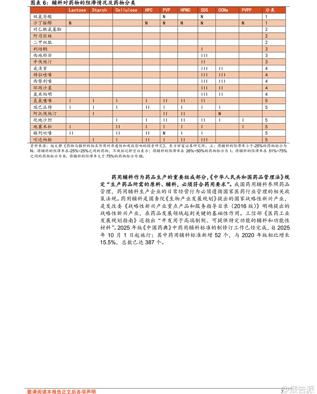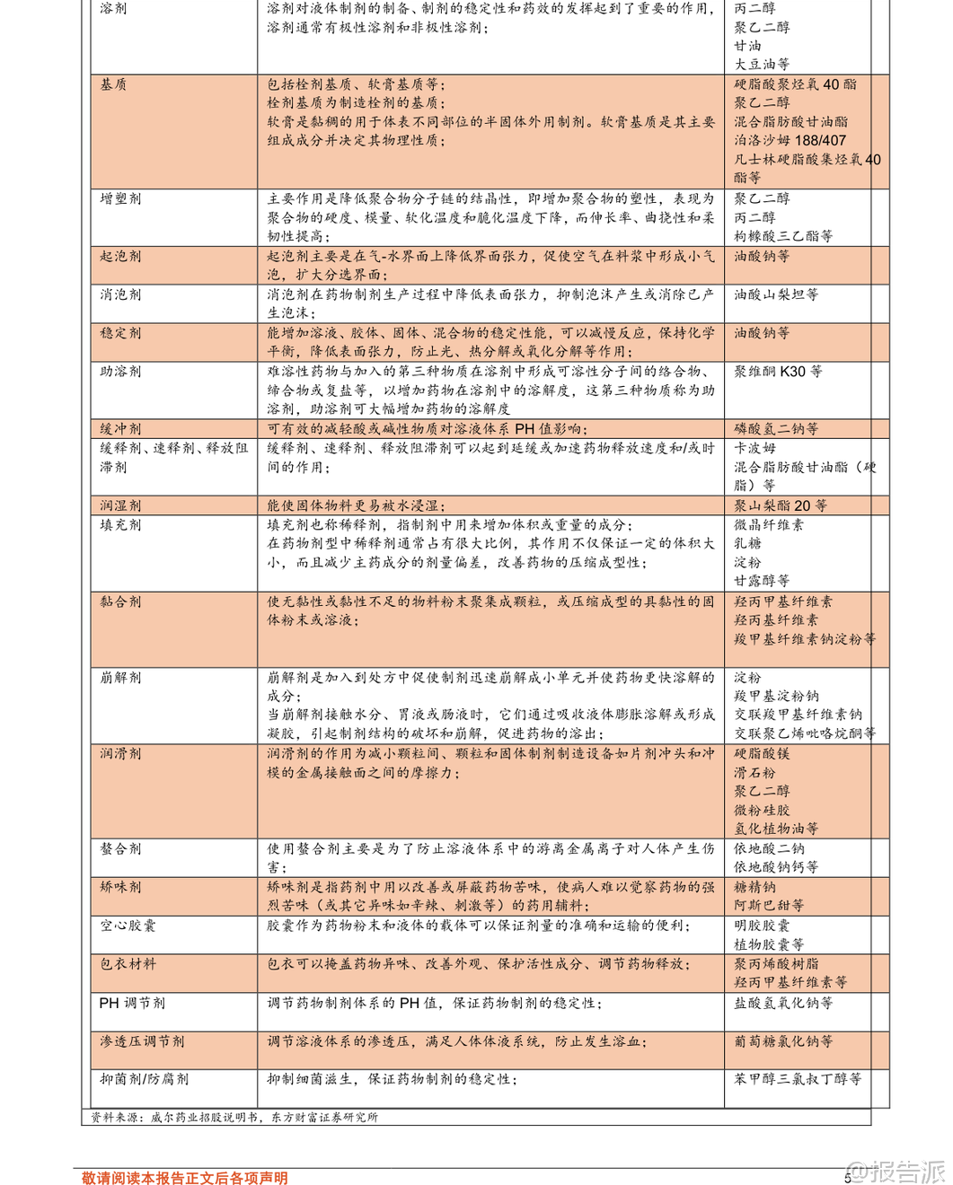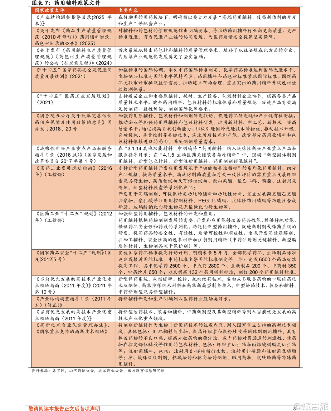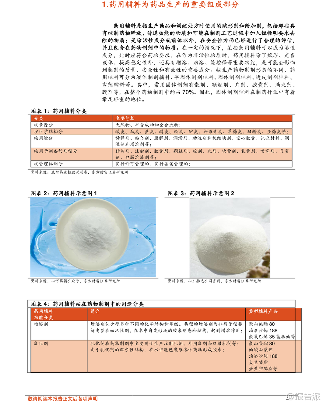 | 在医药产业升级与政策驱动的双重背景下,药用辅料这一“小而美”的细分赛道正迎来历史性发展机遇。 作为药品制剂不可或缺的基础材料,药用辅料不仅承担赋形、稳定等基础功能,更在控释、增溶、提升生物利用度等方面发挥关键作用。 近年来,随着监管体系日趋完善、标准不断升级,我国药用辅料行业正从过去的“小散乱”阶段加速迈向专业化、规模化和高质量发展的成熟期。 政策红利持续释放,为行业发展注入强劲动力。 2025年10月1日起施行的《中国药典》(2025年版)是行业重要里程碑,其药用辅料标准新增52个,总数达387个,增幅达15.5%,标志着我国药用辅料标准体系正加速与国际接轨。 更重要的是,国家药监局于2026年1月1日实施《药品生产质量管理规范》药用辅料附录,首次将药用辅料纳入GMP管理范畴,对生产企业的质量管理体系提出更高要求。 这两大重磅政策叠加仿制药一致性评价和关联审评审批制度的深化,彻底改变了“重原料、轻辅料”的传统格局,药用辅料企业从幕后走向台前,成为制剂企业紧密协作的战略伙伴,行业地位显著提升。 在此背景下,国产替代进口成为核心主线。 长期以来,高端药用辅料市场被德国默克、法国罗盖特等国际巨头垄断。 但以山河药辅为代表的国内龙头企业正强势突围。 该公司专注于口服固体制剂辅料,微晶纤维素、硬脂酸镁、羟丙甲纤维素等核心产品产销量位居国内前列。 公司通过参与国家标准制定、掌握喷雾干燥微晶纤维素等核心技术,实现了对日本同类产品的性能超越,已成功助力超170个项目实现辅料国产化转型,尤其在国际贸易环境波动时期,成为保障供应链安全的坚实后盾。 其外贸出口亮眼,海外收入占比持续提升,多个产品获得美国DMF备案和欧盟EXCIPACT认证,国际化布局成效显著。 与此同时,新兴领域——植物胶囊市场展现出爆发式增长潜力。 传统明胶胶囊因动物源性风险(如疯牛病)、宗教限制及易吸湿等问题,正面临挑战。 以羟丙基甲基纤维素(HPMC)为主要原料的植物胶囊凭借其纯植物来源、高稳定性、低含水量、无交联反应风险以及符合清真、犹太教规等优势,成为产业升级的重要方向。 全球保健品市场的稳健增长(预计2028年达1.4万亿美元)是当前植物胶囊最主要的需求驱动力。 据预测,全球植物胶囊市场规模将从2024年的15.35亿美元增长至2031年的25.68亿美元。 未来,随着技术进步解决溶出度问题,植物胶囊在对吸湿性敏感的中药制剂等领域也有望打开广阔空间。 山东赫达是植物胶囊领域的领军企业,其核心竞争力在于构建了“纤维素醚-植物胶囊”一体化产业链。 公司不仅是国内领先的医药级纤维素醚生产商,更是少数能生产不含凝胶剂的高端HPMC空心胶囊的企业之一。 这种上下游协同模式赋予其显著的成本和技术优势。 尽管曾遭遇美国“双反”调查,但公司积极应对,最终获得的反倾销税率较初裁大幅降低超过150个百分点,充分展现了其强大的国际竞争实力和抗风险能力。 其产能持续释放,有望在未来市场扩张中占据有利地位。 综合来看,我国药用辅料行业正处于量变到质变的关键节点。 一方面,在政策强监管下,行业集中度将加速提升,具备研发实力、质量管控能力和规模优势的龙头企业将脱颖而出;另一方面,以植物胶囊为代表的创新辅料顺应消费升级和产业升级趋势,成长空间巨大。 投资者应重点关注山河药辅、山东赫达等在各自细分领域具备核心技术壁垒和先发优势的优质企业。 当然,也需警惕政策执行不及预期、国产替代进程放缓、消费降级影响保健品需求等潜在风险。 总体而言,“小而美”的药辅行业,正迎来属于它的大时代。 本文由【报告派】研读,输出观点仅作为行业分析! 原文标题:2026-02-24-东方财富证券-东方财富证券-医药生物行业专题研究:“小而美”药辅行业迎来产业升级 发布时间:2026年 出品方:东方财富证券
