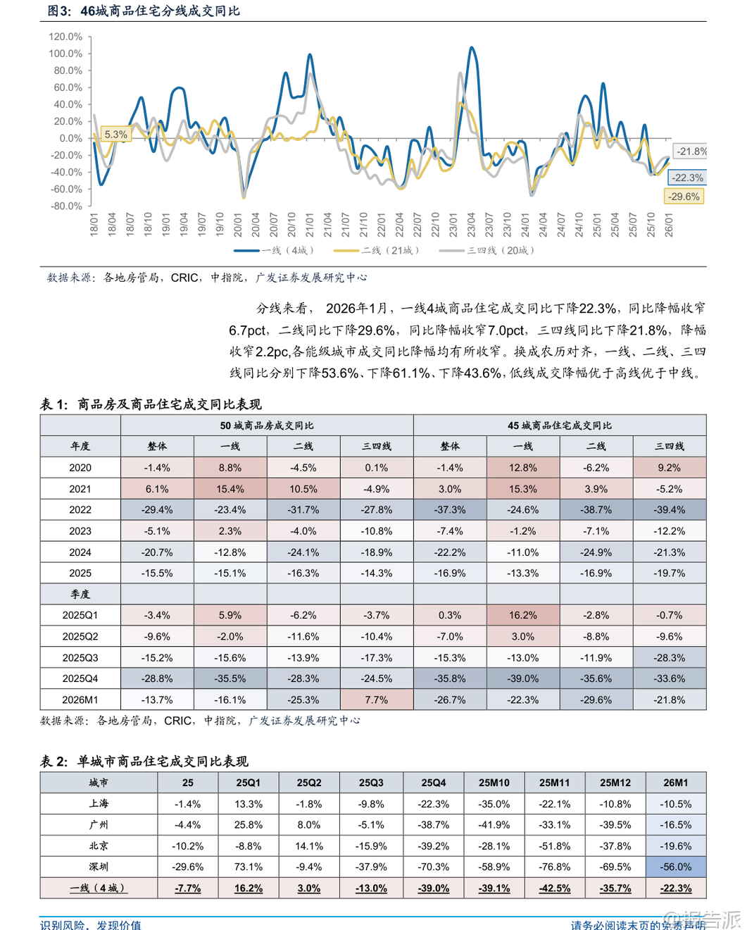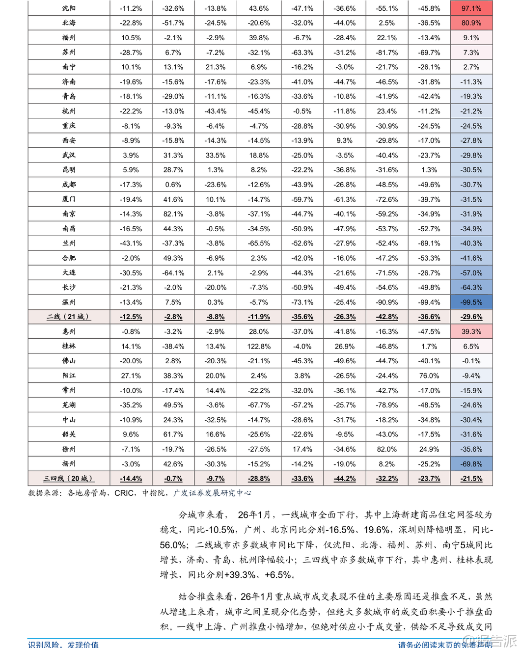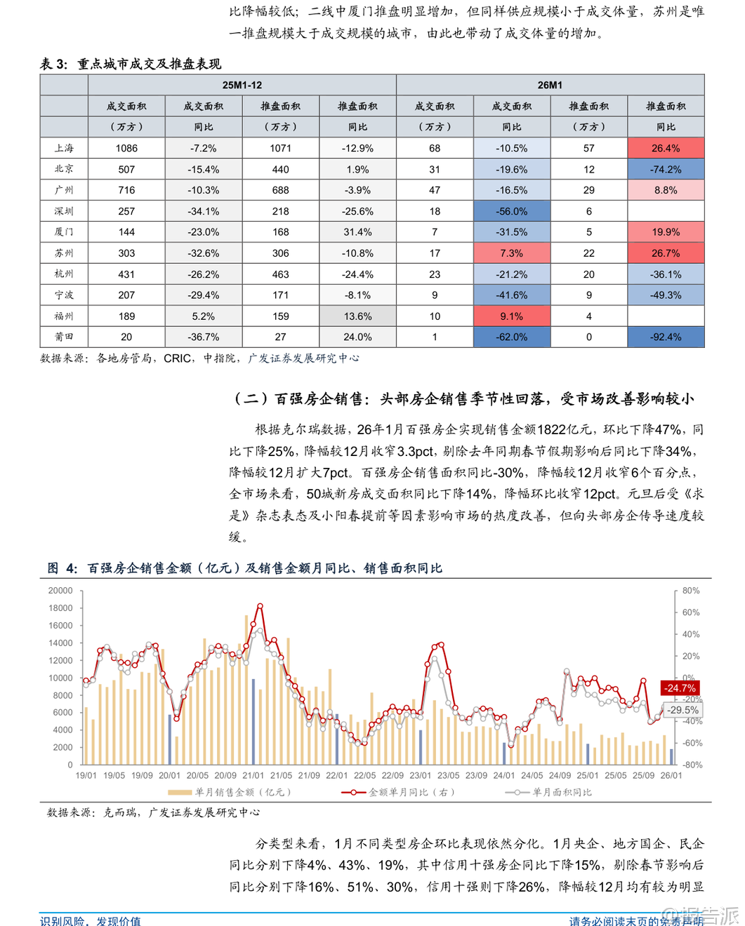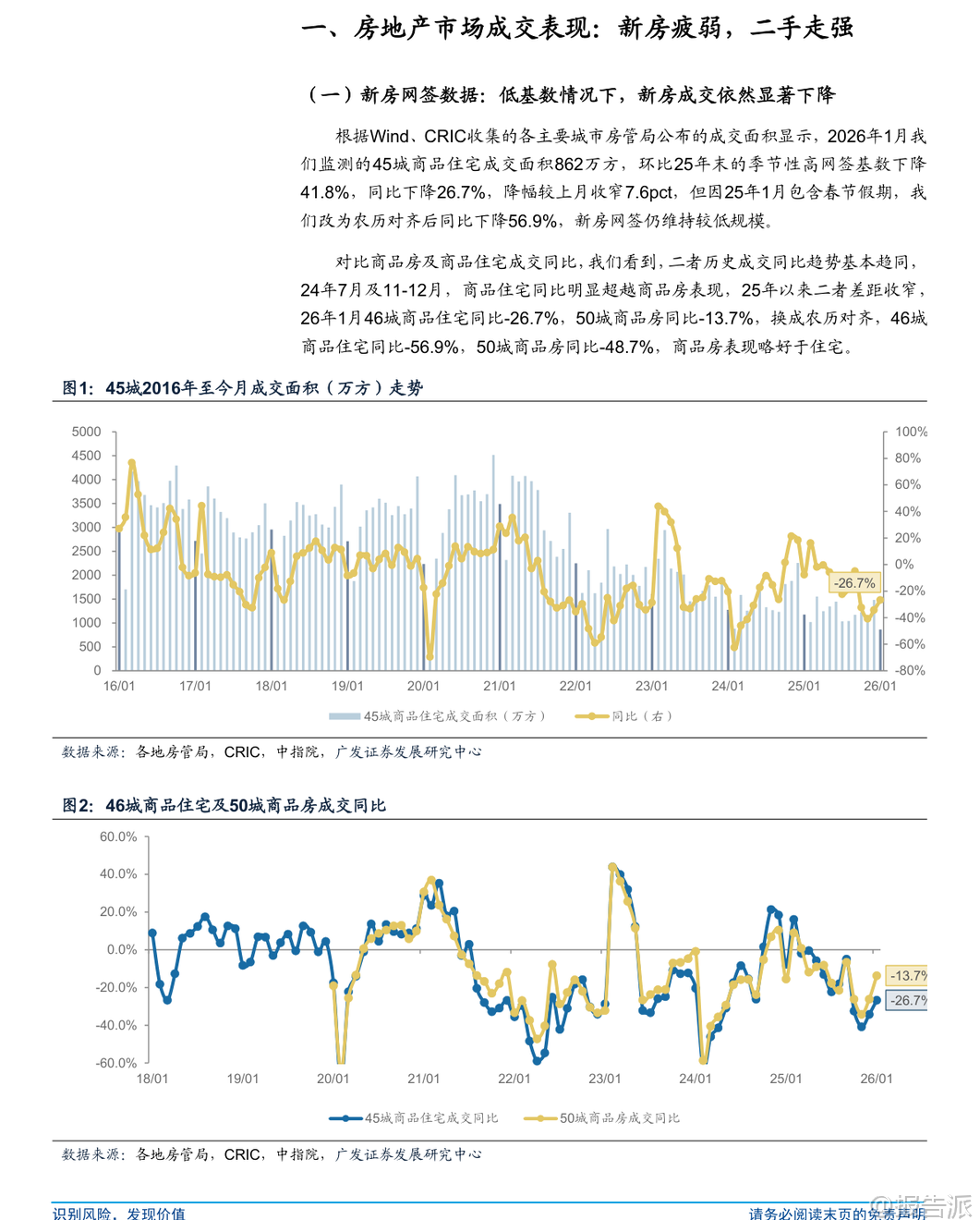 | 2026年开年,中国房地产市场在多重政策支持与市场情绪回暖的推动下,呈现出“新房疲弱、二手走强”的结构性分化格局。 整体来看,市场信心逐步修复,主流房企股价表现亮眼,资本市场的关注度显著提升。 从成交数据看,新房市场依然处于低位。 2026年1月,45城商品住宅网签面积同比下滑27%,若按农历对齐则降幅高达57%,显示新房需求仍显疲软。 分城市能级看,一线、二线、三四线城市均出现不同程度的同比下降,其中深圳跌幅最为明显。 但值得注意的是,部分二线城市如沈阳、北海、福州等出现逆势增长,显示出局部市场的韧性。 新房成交低迷的主要原因在于推盘量不足,多数城市供应端收缩导致成交量难以回升。 与之形成鲜明对比的是二手房市场的强劲反弹。 80城中介口径下的二手房实时成交套数同比增长73%,剔除春节低基数影响后,农历对齐同比增长12%。 重点城市中,上海、北京、广州、深圳等一线城市均超过荣枯线水平。 更值得关注的是,1月中介口径的重点城市二手成交价格环比上涨2.7%,这是自2025年3月以来首次实现单月正增长,释放出价格企稳的重要信号。 分线看,一线和二线城市价格涨幅分别为3.7%和4.3%,而三四线城市仍小幅下跌0.3%,反映出核心城市的抗跌能力和市场预期改善更为明显。 市场景气度方面,虽然新房去化率持续下滑,重点城市新开盘认购率仅为34%,纯新盘尚有52%,老盘新推仅28%,表明开发商去库存压力巨大,市场整体景气度仍然偏低。 但购房者来访量大幅提升,72城1月来访组数同比增长79%,来访转化率升至5.2%,为2025年7月以来新高,说明潜在购房需求正在积聚,居民信心有所恢复。 政策层面,2026年开年即迎来密集利好,为全年定下宽松基调。 1月2日,《求是》杂志发文强调“改善和稳定房地产市场预期”,提出“政策要一次性给足”,释放强烈维稳信号。 随后财政部延续个人所得税退税政策至2027年底,央行下调结构性金融工具利率,并将开发贷展期年限延长至5年。 更关键的是,“三道红线”监管被实质性取消,标志着行业供给侧限制全面放松,房企融资环境迎来根本性改善。 此外,“以旧换新”成为去库存的核心抓手,上海静安、浦东、徐汇三区率先试点国资收购2000年前老公房用于保障房,有效打通置换链条,激发改善型需求。 土地市场开局冷淡。 1月全国住宅用地出让金924亿元,同比大幅下降48.8%,供地意愿和企业拿地积极性均处低位。 城投拿地面积同比下滑51%,非城投房企拿地面积也下降24%,反映市场参与主体对未来投资仍持谨慎态度。 资本市场反应积极。 1月SW房地产指数上涨4.3%,跑赢大盘2.7个百分点;港股地产板块更是大涨14%,远超恒生指数6.9%的涨幅。 主流开发企业如中国金茂、中国海外宏洋集团、绿城中国等涨幅居前,显示出投资者对优质房企价值修复的强烈预期。 当前行业整体估值仍处历史底部,16家主流A+H房企平均PB仅0.51倍,具备较大修复空间。 总体而言,2026年初房地产市场呈现“政策底明确、情绪底显现、基本面筑底”的特征。 尽管新房销售尚未全面复苏,但二手房量价齐升、政策支持力度空前、资本市场先行反应,均预示着行业最困难的阶段或已过去。 未来关注重点在于节后高频数据能否持续验证回暖趋势,以及“以旧换新”等创新模式的推广效果,这将成为判断本轮周期是否真正见底的关键。 本文由【报告派】研读,输出观点仅作为行业分析! 原文标题:2026-02-26-广发证券-广发证券-房地产行业26年1月市场总结:市场信心逐步回升,主流标的表现优异 发布时间:2026年 报告出品方:广发证券 文档页数:37页