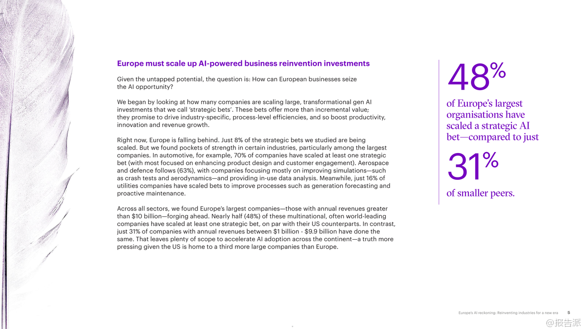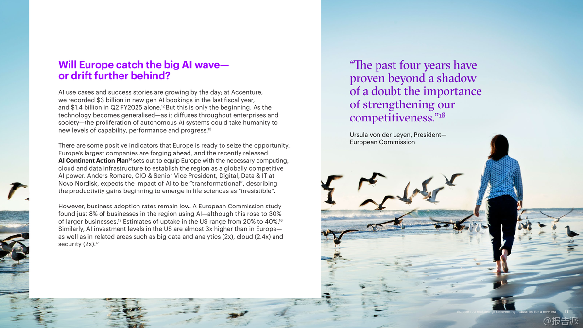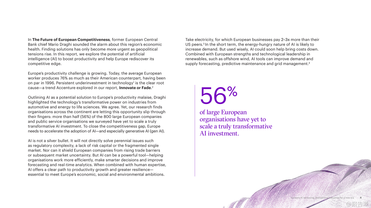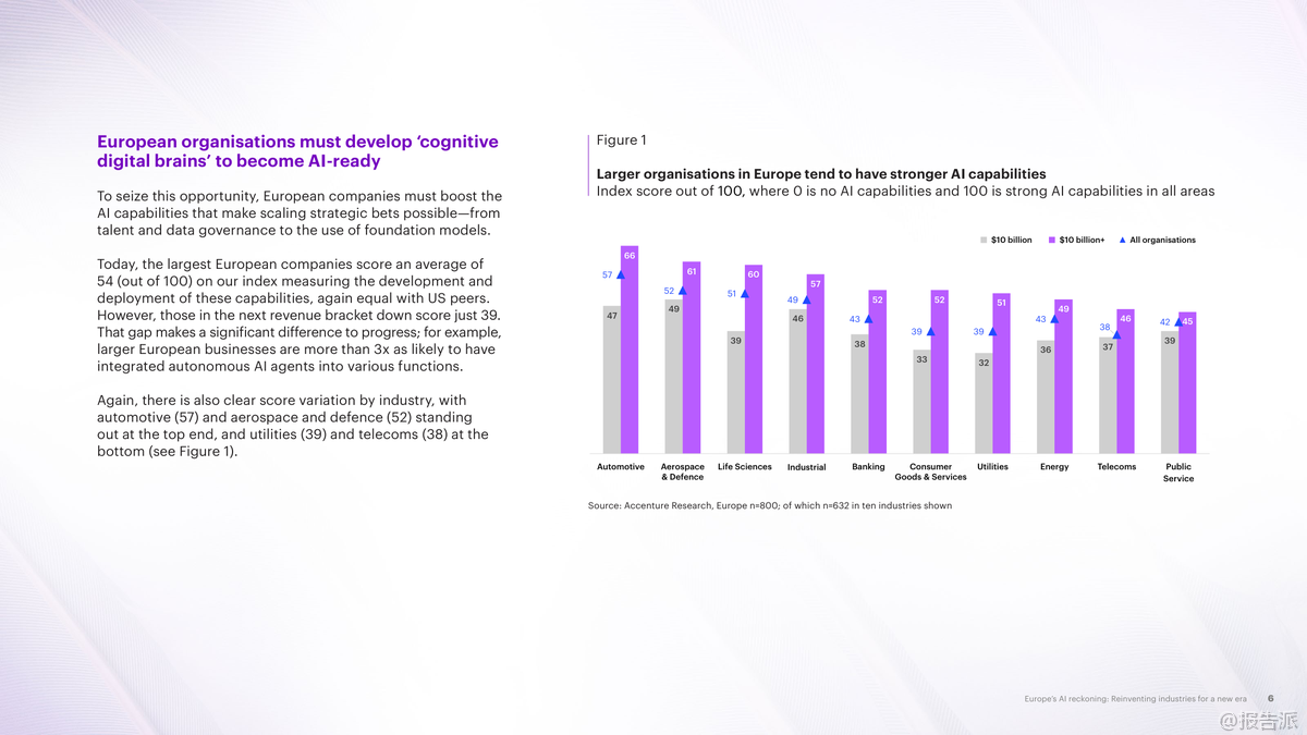 | 欧洲正面临一场深刻的AI变革。 根据埃森哲发布的《2025欧洲AI审视为新时代重塑产业格局机遇评估与把握研究报告》,人工智能被视为重振欧洲竞争力的关键引擎,但当前进展却令人担忧。 报告指出,尽管欧洲在部分领域具备技术优势,整体AI adoption仍显著落后于美国,若不加速行动,恐将拉大差距。 核心数据揭示了严峻现实:在调研的800家大型欧洲企业和公共机构中,高达56%尚未规模化部署真正具有变革意义的AI投资。 仅有8%的战略性AI项目实现全面推广,而美国同类企业的AI投资规模已是欧洲近三倍。 这种滞后背后,是长期存在的技术投入不足、碎片化市场、监管复杂以及风险资本匮乏等结构性难题。 值得注意的是,企业规模成为决定AI能力的关键因素。 营收超百亿美元的欧洲巨头在AI能力建设上已与美国同行持平(指数得分54/100),其中48%已成功落地至少一项战略级AI项目。 然而,年收入在10亿至100亿美元之间的企业,这一比例骤降至31%,其AI能力指数仅为39分。 这暴露出欧洲“长尾型”中小企业群体的普遍薄弱——它们占比较高但资源有限,难以承担高昂的AI转型成本,导致整体生态失衡。 行业层面则呈现明显分化。 汽车(70%)、航空航天与国防(63%)等高端制造业走在前列,得益于对产品设计、仿真测试等场景的深度应用。 而公用事业、电信和能源等关键基础设施行业,AI能力垫底,拖累整体转型步伐。 报告特别强调,工业部门虽贡献超四分之一的GDP且增长潜力巨大,但其AI肌肉(能力与投资综合指标)偏弱,亟需加强。 要扭转局面,报告提出三大方向:一是帮助中小企业“升级打怪”,通过共享算力、数据池和培训支持其融入AI生态;二是培育“主权AI”体系,减少对美科技巨头的依赖,发展本土云服务和可信AI解决方案;三是制定协同的工业战略,推动跨行业、跨国界的数据互通与标准统一,打造有韧性的联邦式AI生态系统。 长远来看,AI并非万能解药,但它能显著提升效率、优化决策、增强韧性。 埃森哲测算,若欧洲所有大型企业能达到领先行业的AI水平,每年可新增近2000亿欧元收入。 真正的赢家或许不是发明最好模型的国家,而是能让AI在全社会日常广泛应用的经济体。 欧洲能否抓住这次“AI觉醒”的机会,将直接决定其未来十年的增长轨迹。 出品方:埃森哲 发布时间:2025年 文档页数:44页
