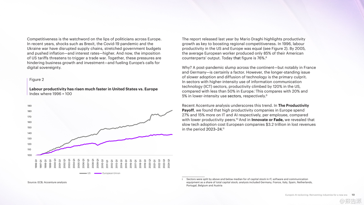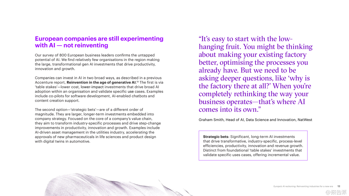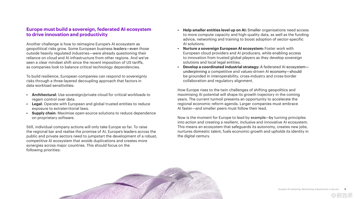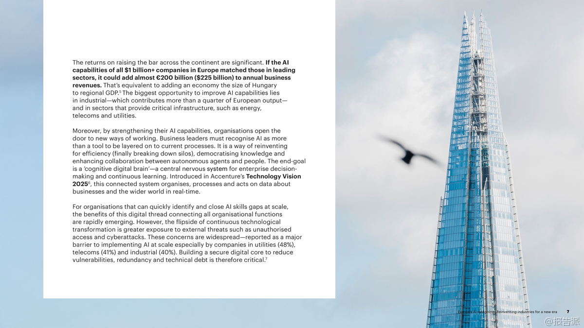 | 欧洲正面临一场深刻的AI变革。 根据埃森哲发布的《2025欧洲AI审视为新时代重塑产业格局机遇评估与把握研究报告》,人工智能被视为重振欧洲竞争力的关键引擎,但当前进展却令人担忧。 报告指出,尽管欧洲在部分领域具备技术优势,整体AI adoption仍显著落后于美国,若不加速行动,恐将拉大差距。 核心数据揭示了严峻现实:在调研的800家大型欧洲企业和公共机构中,高达56%尚未规模化部署真正具有变革意义的AI投资。 仅有8%的战略性AI项目实现全面推广,而美国同类企业的AI投资规模已是欧洲近三倍。 这种滞后背后,是长期存在的技术投入不足、碎片化市场、监管复杂以及风险资本匮乏等结构性难题。 值得注意的是,企业规模成为决定AI能力的关键因素。 营收超百亿美元的欧洲巨头在AI能力建设上已与美国同行持平(指数得分54/100),其中48%已成功落地至少一项战略级AI项目。 然而,年收入在10亿至100亿美元之间的企业,这一比例骤降至31%,其AI能力指数仅为39分。 这暴露出欧洲“长尾型”中小企业群体的普遍薄弱——它们占比较高但资源有限,难以承担高昂的AI转型成本,导致整体生态失衡。 行业层面则呈现明显分化。 汽车(70%)、航空航天与国防(63%)等高端制造业走在前列,得益于对产品设计、仿真测试等场景的深度应用。 而公用事业、电信和能源等关键基础设施行业,AI能力垫底,拖累整体转型步伐。 报告特别强调,工业部门虽贡献超四分之一的GDP且增长潜力巨大,但其AI肌肉(能力与投资综合指标)偏弱,亟需加强。 要扭转局面,报告提出三大方向:一是帮助中小企业“升级打怪”,通过共享算力、数据池和培训支持其融入AI生态;二是培育“主权AI”体系,减少对美科技巨头的依赖,发展本土云服务和可信AI解决方案;三是制定协同的工业战略,推动跨行业、跨国界的数据互通与标准统一,打造有韧性的联邦式AI生态系统。 长远来看,AI并非万能解药,但它能显著提升效率、优化决策、增强韧性。 埃森哲测算,若欧洲所有大型企业能达到领先行业的AI水平,每年可新增近2000亿欧元收入。 真正的赢家或许不是发明最好模型的国家,而是能让AI在全社会日常广泛应用的经济体。 欧洲能否抓住这次“AI觉醒”的机会,将直接决定其未来十年的增长轨迹。 出品方:埃森哲 发布时间:2025年 文档页数:44页