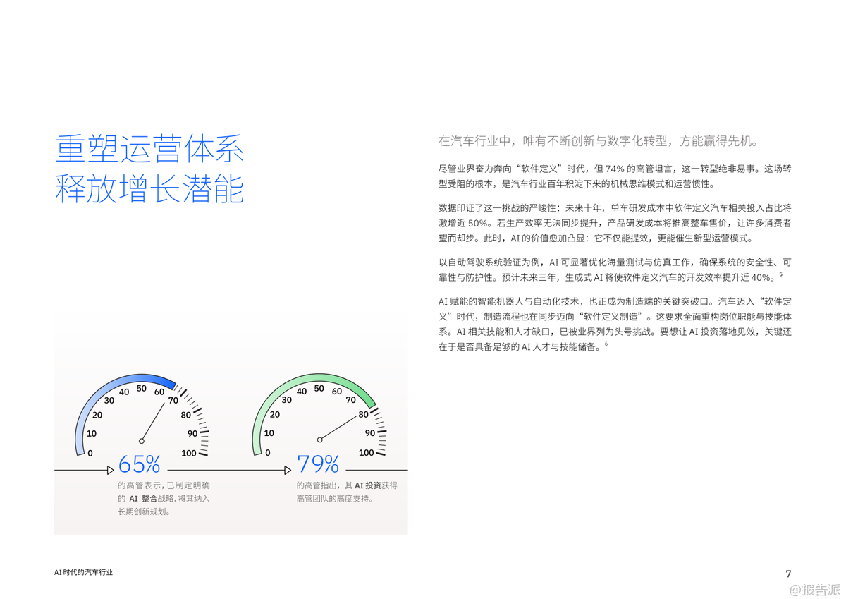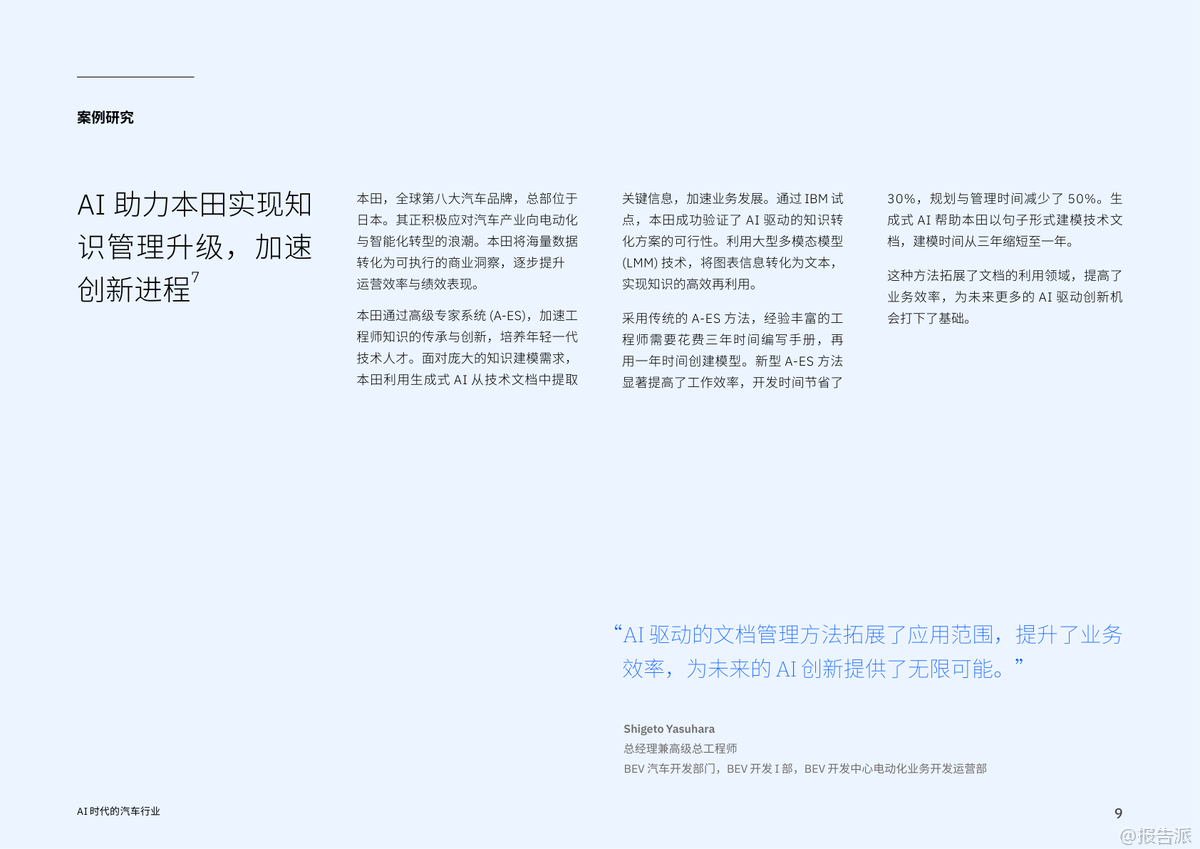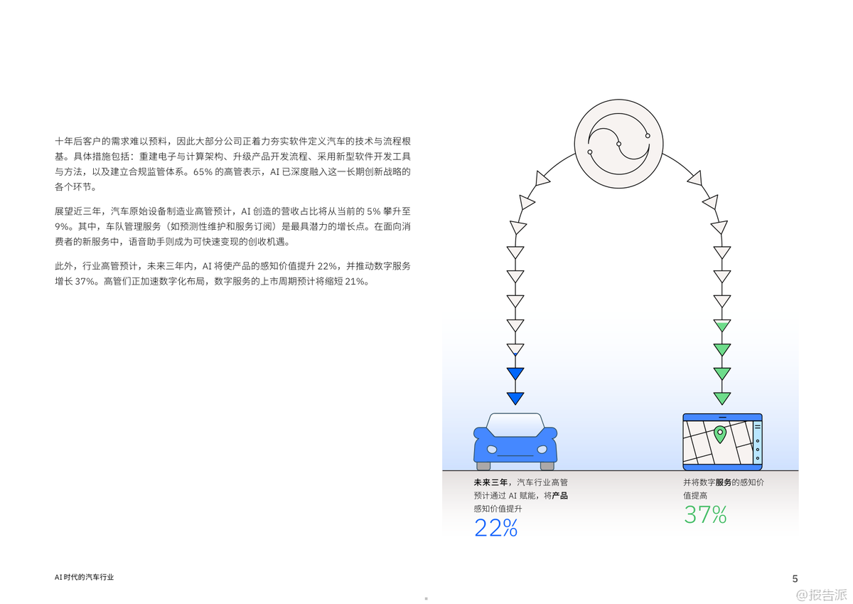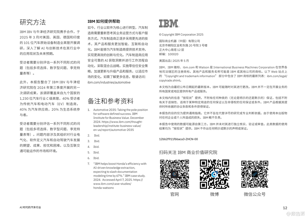 | 当前,全球汽车行业正经历一场深刻的“范式转变”,从传统的机械制造迈向“软件定义汽车”(Software-Defined Vehicle, SDV)与人工智能深度融合的新纪元。 根据IBM商业价值研究院的最新调研,高达74%的汽车行业高管认为,未来十年新车将全面进入“软件定义+AI赋能”的双驱动时代。 这意味着汽车不再仅仅是交通工具,而是逐渐演变为一个集智能交互、数据处理与持续进化的移动数字平台。 AI正成为这场变革的核心引擎。 报告显示,61%的汽车制造商高管相信,AI将在未来三年显著提升企业营收;63%认为AI投资将带来可量化的竞争优势;更有64%的企业已制定明确的AI整合战略,79%的AI项目获得了高层的强力支持。 这表明,AI已不再是概念探索,而是进入规模化落地的关键阶段。 随着软件定义汽车的发展,商业模式也在发生根本性转变。 预计到2035年,汽车制造商51%的收入将来自数字化服务与软件,远超目前的15%。 其中,自动驾驶与高级驾驶辅助系统(ADAS)有望为每辆车每月带来约269美元的持续性收入。 而语音助手、预测性维护、个性化车载娱乐等智能服务,则成为快速变现的重要切入点。 边缘AI与云端AI的协同架构,正在塑造下一代智能汽车体验。 由于车载网络不稳定和算力限制,轻量化的边缘AI被广泛应用于语音交互、故障预警和驾驶行为监测等实时场景;而更复杂的个性化推荐与用户画像分析,则由云端AI完成。 这种混合模式既能保障响应速度,又能实现深度智能,成为行业主流技术路径。 然而,转型之路并非坦途。 74%的高管承认,软件定义汽车的推进面临巨大挑战,根源在于根深蒂固的机械思维与传统运营模式。 软件研发投入预计将增加近50%,若效率无法同步提升,将直接推高整车成本。 在此背景下,AI的作用尤为关键——它不仅能提升研发效率,还能重构制造、销售与服务体系。 例如,生成式AI有望在未来三年内提升软件开发效率近40%,而AI驱动的仿真测试则大幅加快自动驾驶系统的验证进程。 在营销与服务端,AI同样释放巨大潜力。 预计未来三年,AI赋能的个性化服务将使客户终身价值、留存率与成交率同步提升25%,客户服务效率提升7%,营销资源配置优化5%。 随着OTA(空中下载)升级普及,车企与用户的关系从一次性交易转向全生命周期互动,售后服务也向智能化、预防性方向演进。 典型案例显示,本田通过引入IBM的生成式AI技术,将技术文档建模时间从三年缩短至一年,效率提升达67%,极大加速了知识传承与创新迭代。 总体来看,AI不仅是技术工具,更是推动汽车产业价值链重构的战略支点。 企业需从技术底座、运营体系到商业模式进行全面升级,方能在智能出行的新赛道中抢占先机。 出品方:IBM 发布时间:2025年 文档页数:12页