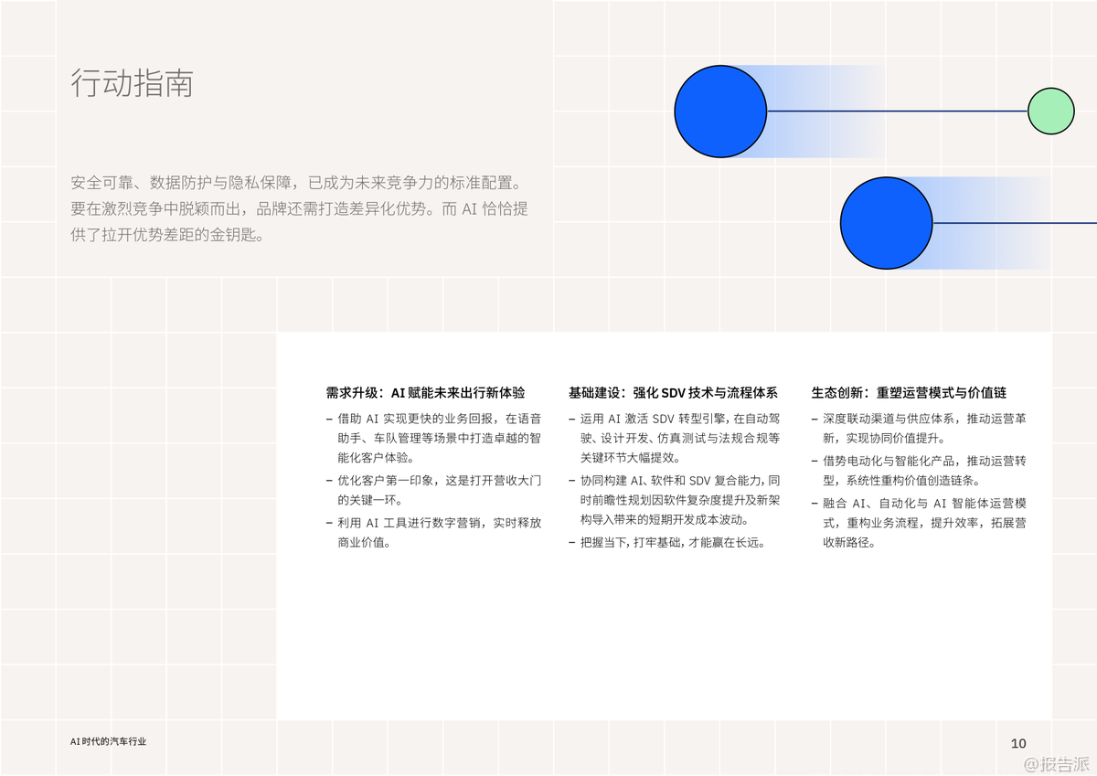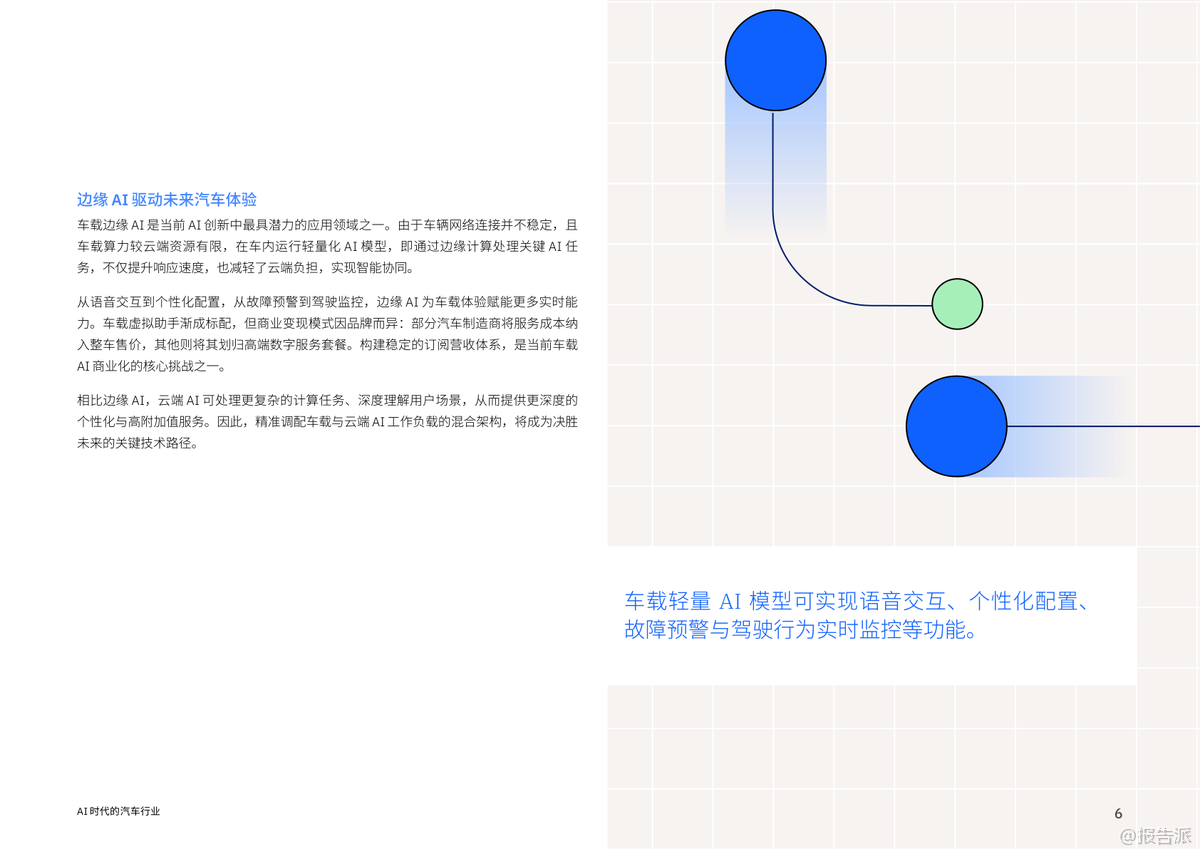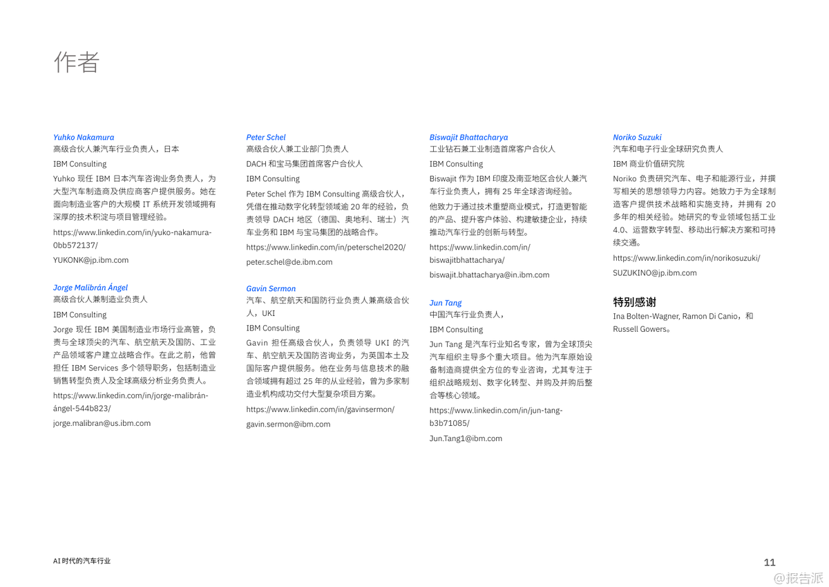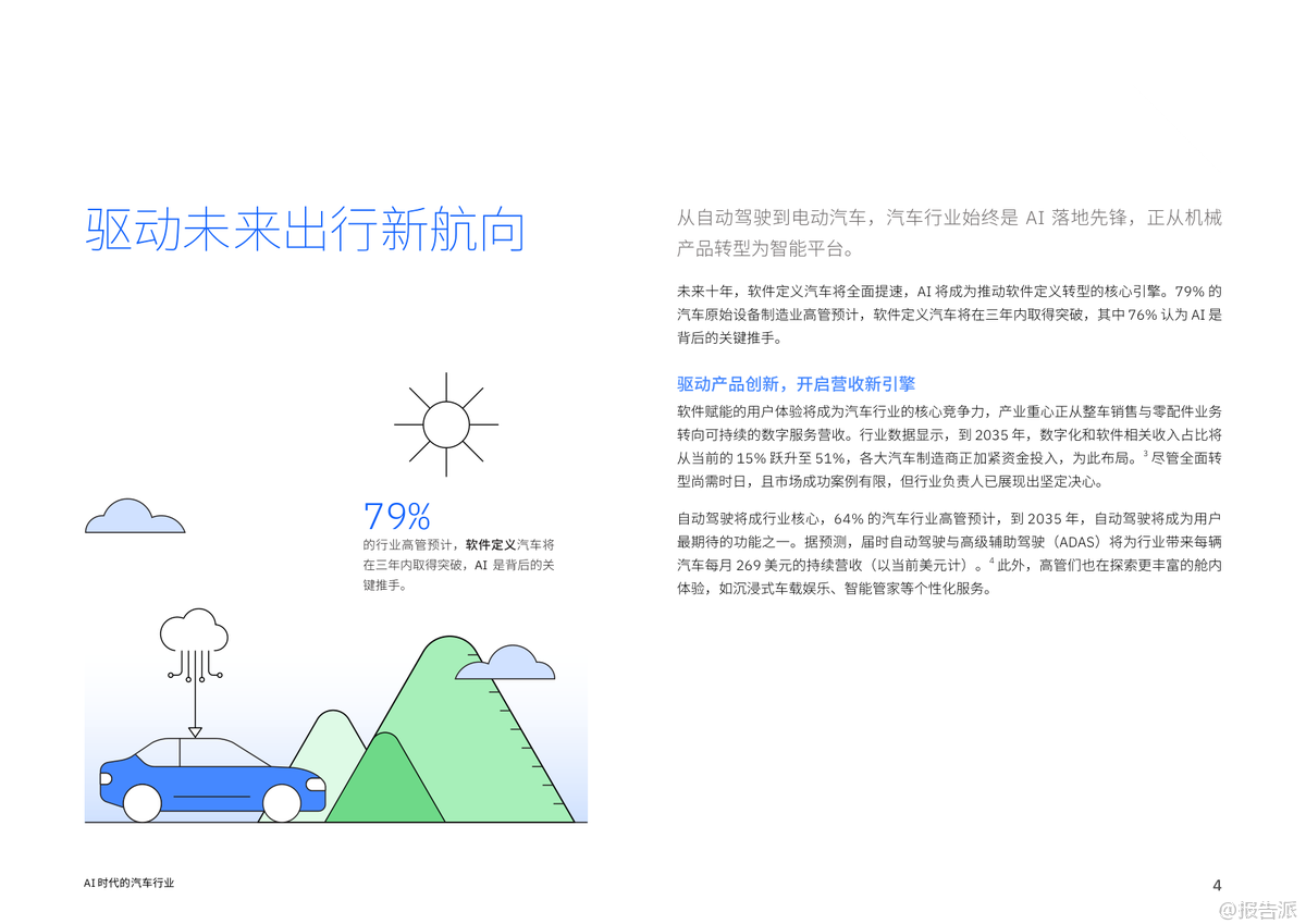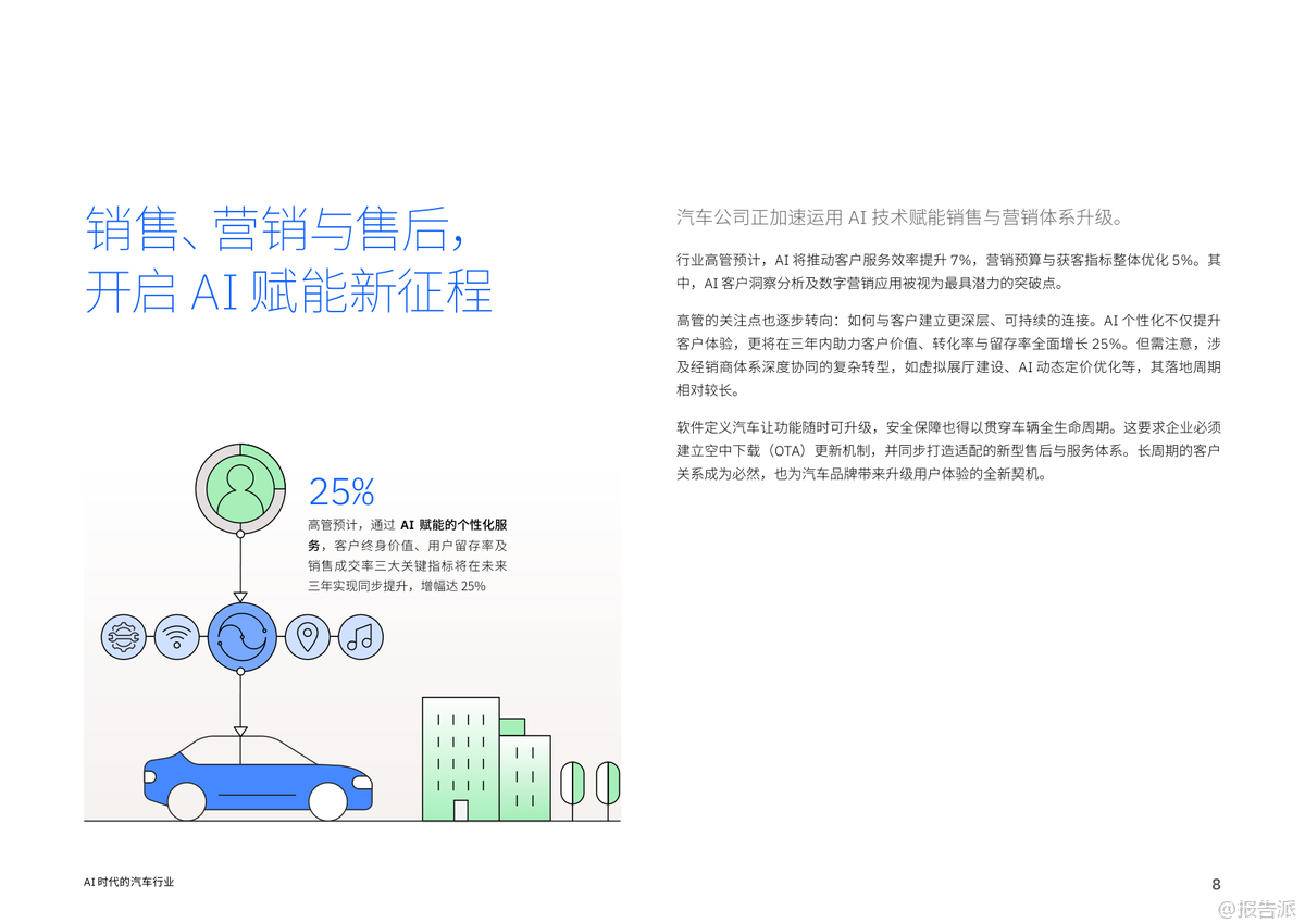 | 当前,全球汽车行业正经历一场深刻的“范式转变”,从传统的机械制造迈向“软件定义汽车”(Software-Defined Vehicle, SDV)与人工智能深度融合的新纪元。 根据IBM商业价值研究院的最新调研,高达74%的汽车行业高管认为,未来十年新车将全面进入“软件定义+AI赋能”的双驱动时代。 这意味着汽车不再仅仅是交通工具,而是逐渐演变为一个集智能交互、数据处理与持续进化的移动数字平台。 AI正成为这场变革的核心引擎。 报告显示,61%的汽车制造商高管相信,AI将在未来三年显著提升企业营收;63%认为AI投资将带来可量化的竞争优势;更有64%的企业已制定明确的AI整合战略,79%的AI项目获得了高层的强力支持。 这表明,AI已不再是概念探索,而是进入规模化落地的关键阶段。 随着软件定义汽车的发展,商业模式也在发生根本性转变。 预计到2035年,汽车制造商51%的收入将来自数字化服务与软件,远超目前的15%。 其中,自动驾驶与高级驾驶辅助系统(ADAS)有望为每辆车每月带来约269美元的持续性收入。 而语音助手、预测性维护、个性化车载娱乐等智能服务,则成为快速变现的重要切入点。 边缘AI与云端AI的协同架构,正在塑造下一代智能汽车体验。 由于车载网络不稳定和算力限制,轻量化的边缘AI被广泛应用于语音交互、故障预警和驾驶行为监测等实时场景;而更复杂的个性化推荐与用户画像分析,则由云端AI完成。 这种混合模式既能保障响应速度,又能实现深度智能,成为行业主流技术路径。 然而,转型之路并非坦途。 74%的高管承认,软件定义汽车的推进面临巨大挑战,根源在于根深蒂固的机械思维与传统运营模式。 软件研发投入预计将增加近50%,若效率无法同步提升,将直接推高整车成本。 在此背景下,AI的作用尤为关键——它不仅能提升研发效率,还能重构制造、销售与服务体系。 例如,生成式AI有望在未来三年内提升软件开发效率近40%,而AI驱动的仿真测试则大幅加快自动驾驶系统的验证进程。 在营销与服务端,AI同样释放巨大潜力。 预计未来三年,AI赋能的个性化服务将使客户终身价值、留存率与成交率同步提升25%,客户服务效率提升7%,营销资源配置优化5%。 随着OTA(空中下载)升级普及,车企与用户的关系从一次性交易转向全生命周期互动,售后服务也向智能化、预防性方向演进。 典型案例显示,本田通过引入IBM的生成式AI技术,将技术文档建模时间从三年缩短至一年,效率提升达67%,极大加速了知识传承与创新迭代。 总体来看,AI不仅是技术工具,更是推动汽车产业价值链重构的战略支点。 企业需从技术底座、运营体系到商业模式进行全面升级,方能在智能出行的新赛道中抢占先机。 出品方:IBM 发布时间:2025年 文档页数:12页