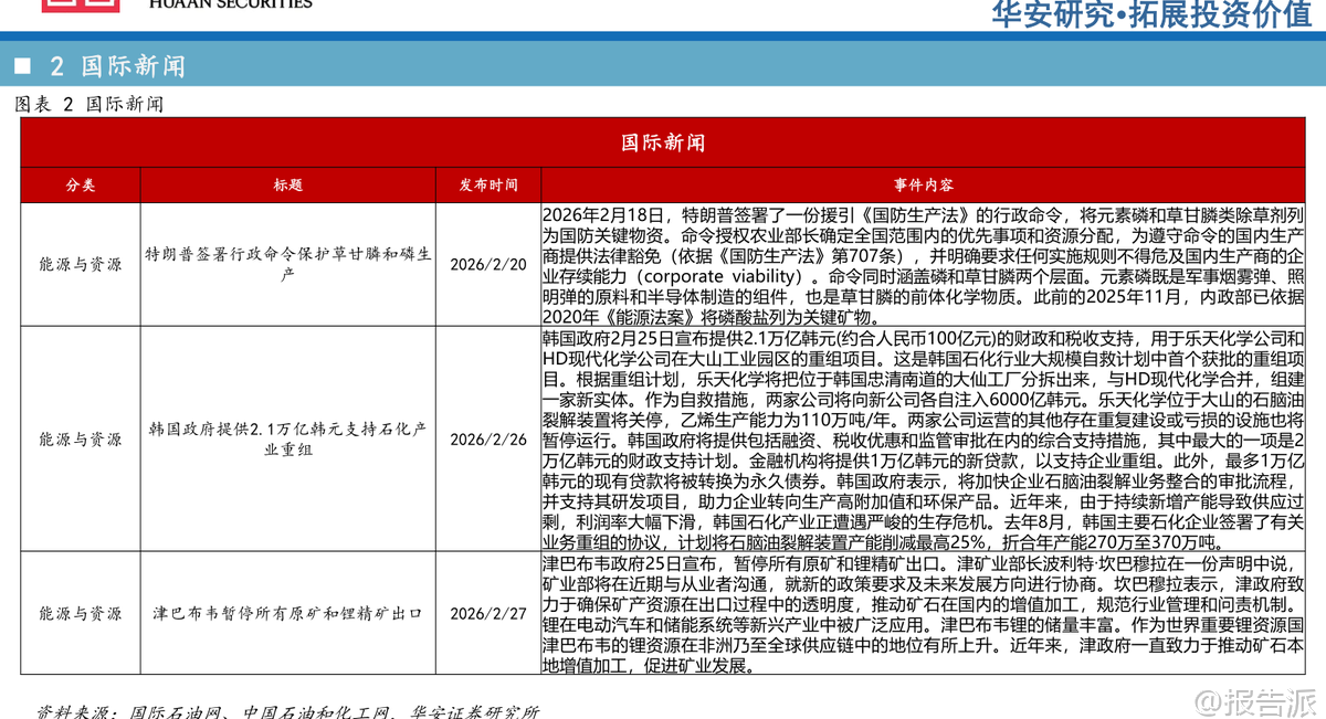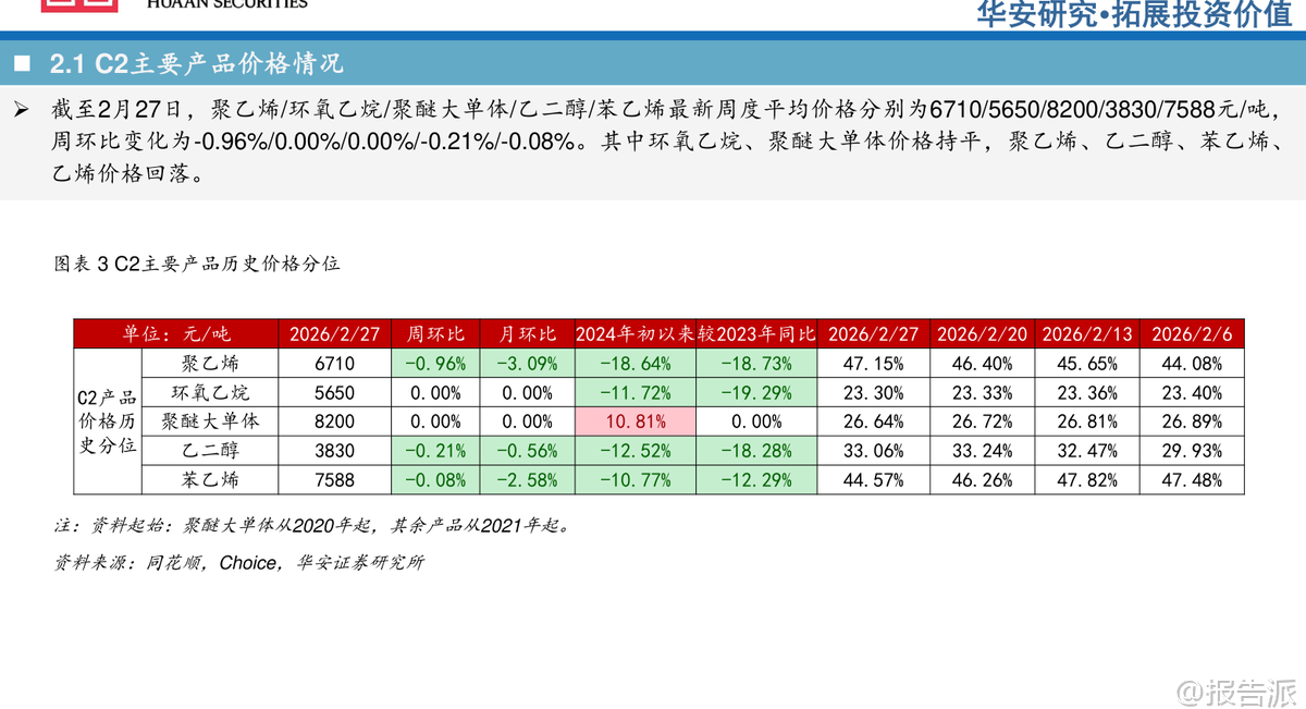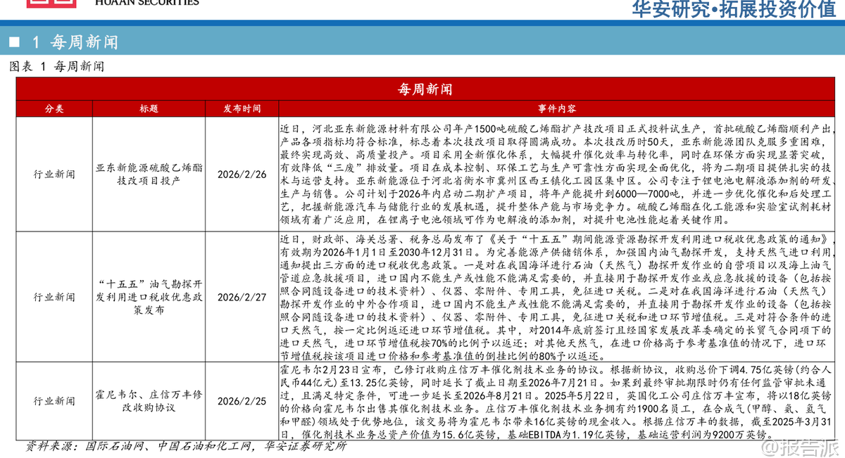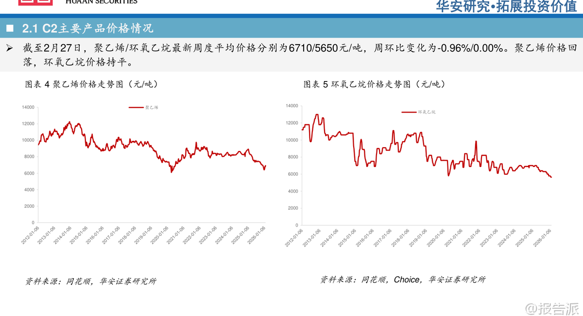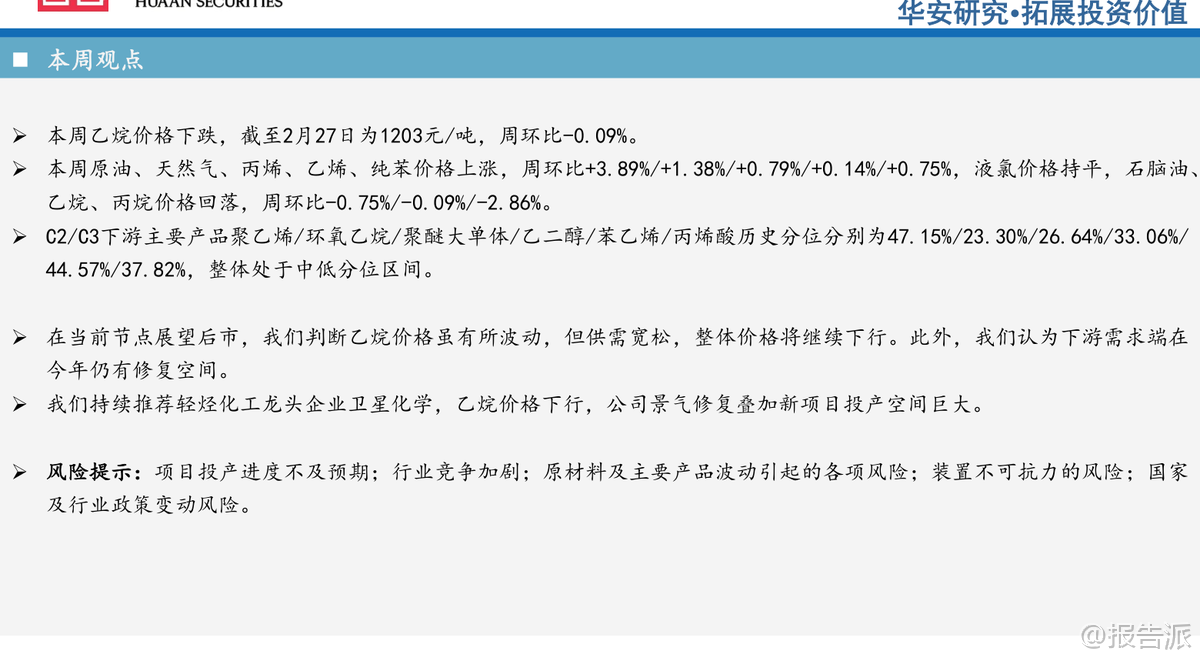 | 本周,华安证券发布《卫星化学及烯烃行业周度动态跟踪》报告,对2026年初的烯烃产业链价格、供需格局、竞争路线及重点企业估值进行了全面分析。 整体来看,当前乙烷等原料价格处于下行通道,叠加下游需求修复预期,轻烃化工龙头企业迎来景气度回升窗口期。 从原料端看,截至2月27日,乙烷价格为1203元/吨,周环比微跌0.09%,虽短期波动但整体呈现供需宽松态势,预计后续价格将继续下行。 与此同时,原油、天然气、丙烯、乙烯、纯苯等主要原料价格则出现上涨,周涨幅分别为3.89%、1.38%、0.79%、0.14%和0.75%。 而石脑油、丙烷价格分别回落0.75%和2.86%。 液氯价格持平。 原料走势分化反映出不同能源路径的成本差异正在扩大,尤其乙烷裂解路线因原料成本优势进一步凸显。 在C2下游产品方面,聚乙烯、环氧乙烷、聚醚大单体、乙二醇、苯乙烯、丙烯酸的历史价格分位分别为47.15%、23.30%、26.64%、33.06%、44.57%、37.82%,整体处于中低位水平,意味着当前产品利润空间相对有限,但也为后续需求复苏提供了弹性空间。 具体来看,截至2月27日,聚乙烯报6710元/吨(周降0.96%),环氧乙烷5650元/吨(持平),聚醚大单体8200元/吨(持平),乙二醇3830元/吨(降0.21%),苯乙烯7588元/吨(降0.08%)。 乙烯价格回落至5430元/吨,周降幅达2.34%。 C3系列产品中,丙烯酸、丙烯酸丁酯价格均持平于5900元/吨和6725元/吨,聚丙烯小幅上涨0.39%至6666元/吨。 尽管终端产品价格整体稳定或略有回调,但部分价差指标已现积极变化。 例如,C2路线中“乙烯-乙烷”价差达3894元/吨,周环比微增0.23%,显示乙烷裂解仍具备较强盈利能力;而“聚乙烯-乙烯”价差收窄至1272元/吨,反映下游加工利润承压。 C3路线中,“丙烯-丙烷”价差大幅上升51.10%至657元/吨,主要受丙烷价格回落推动,PDH(丙烷脱氢)路线盈利边际改善明显。 从竞争路线角度看,油头路线“乙烯-石脑油价差”为-1572元/吨,虽环比改善3.74%,但仍处于深度亏损状态;MTO(甲醇制烯烃)路线价差为4161元/吨,环比提升1.23%。 相比之下,乙烷裂解路线凭借低廉且稳定的原料成本,在现金成本和完全成本上均显著优于石脑油制、煤制等其他路径,竞争优势持续拉大。 下游需求方面,汽车与房地产两大关键领域表现分化。 截至1月底,汽车销量234.6万辆,环比下降28.3%;而2025年全年房屋竣工面积达20894万平方米,12月单月竣工同比大幅增长355%,显示地产后周期需求有所回暖,利好聚烯烃、环氧乙烷衍生物等材料消费。 政策层面亦释放积极信号。 国内方面,“十五五”期间油气勘探开发进口税收优惠政策落地,涉及设备免税及天然气增值税返还,有助于保障能源供应安全。 国际上,韩国政府宣布提供2.1万亿韩元支持乐天化学与HD现代化学重组,计划关停部分石脑油裂解装置,削减产能以应对行业过剩压力,侧面印证全球石化行业正进入结构性调整阶段。 此外,津巴布韦暂停锂精矿出口,旨在推动本地深加工,反映资源国对价值链掌控意愿增强。 在企业估值方面,华安证券重点推荐轻烃化工龙头——卫星化学。 根据2月27日收盘价测算,其2024年EPS为1.80元,2025年预计1.65元,2026年有望达2.52元,对应PE分别为11.41倍、14.76倍和9.67倍,估值具备吸引力。 相较之下,万华化学、宝丰能源等也处于合理区间,而部分企业如东华能源、中化国际仍面临盈利压力。 综合判断,当前乙烷价格下行趋势明确,叠加新项目投产带来的成长性,卫星化学等具备原料保障和成本优势的企业将迎来景气修复周期。 尽管存在项目进度、行业竞争加剧、原材料波动等风险,但在全球能源结构转型与国内产业升级背景下,轻烃化工赛道长期价值依然突出。 投资者可重点关注具备一体化布局、技术领先和成本控制能力的头部企业。 本文由【报告派】研读,输出观点仅作为行业分析! 原文标题:原文标题:2026-03-02-华安证券-华安证券-卫星化学及烯烃行业周度动态跟踪 发布时间:2026年 报告出品方:华安证券 文档页数:34页
