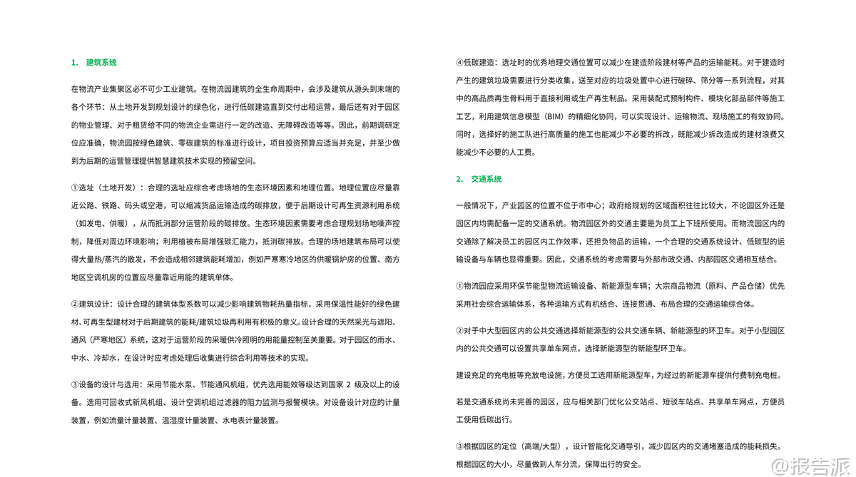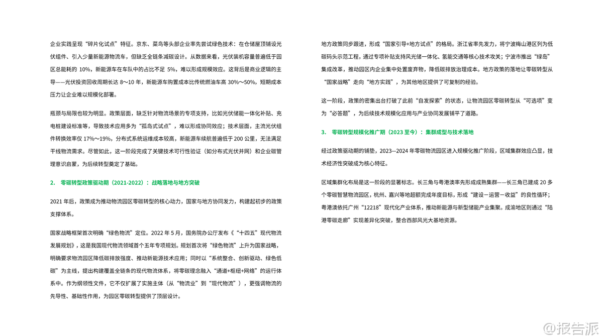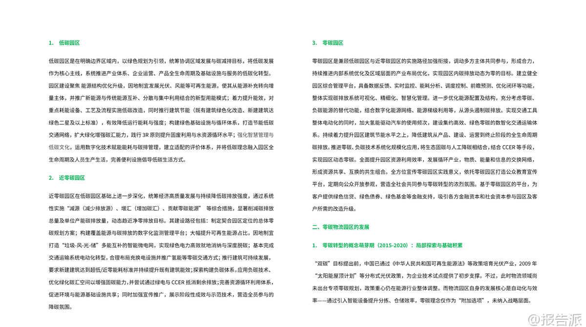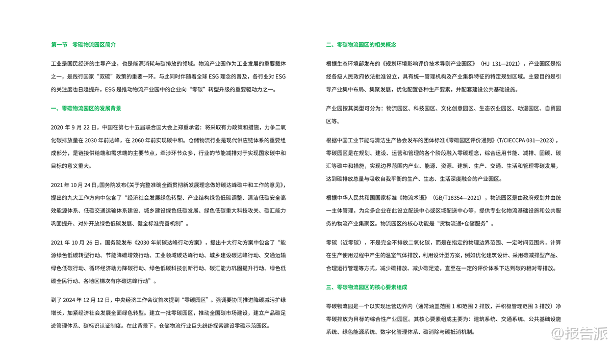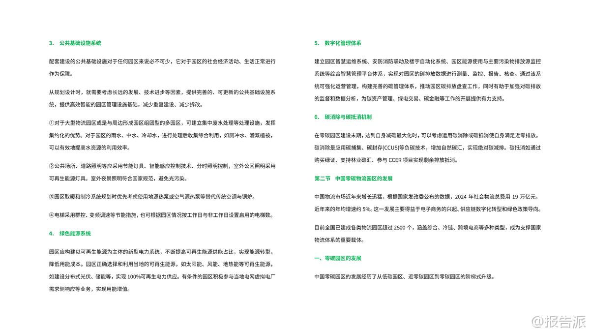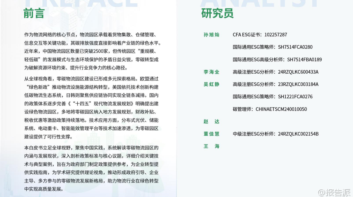 | 在“双碳”目标驱动下,零碳物流园区正从概念走向规模化实践,成为现代物流体系升级与ESG战略落地的关键载体。 本白皮书由上海现代服务业联合会与荣续智库联合发布,系统梳理了全球与中国零碳物流园区的发展脉络、技术路径与标杆案例,为行业提供了兼具战略高度与实操价值的参考框架。 从发展背景看,中国物流园区数量已超2500家,但传统模式高能耗、高排放的问题突出。 国家“十四五”规划明确提出建设绿色物流园区,中央经济工作会议将“建立一批零碳园区”列为2025年重点任务,政策顶层设计加速推进。 国际上,《全球零碳货运倡议》、IMO净零框架等也对跨境物流脱碳提出明确要求,形成内外协同的转型压力与动力。 零碳物流园区的核心在于构建覆盖建筑、交通、能源、管理全系统的低碳生态。 其核心要素包括六大维度:一是建筑系统,通过绿色建材、装配式建造、BIM设计实现低碳化;二是交通系统,推广新能源车辆、智能调度、人车分流以降低运输排放;三是公共基础设施,实现水循环利用、节能照明与智慧电梯;四是绿色能源系统,以分布式光伏、储能、氢能为核心构建100%可再生电力供应;五是数字化管理体系,依托智慧运维平台实现碳排放实时监测与优化;六是碳消除与碳抵消机制,结合CCUS技术与CCER交易完成最终中和。 技术应用层面,白皮书展示了多项前沿实践。 京东“亚洲一号”西安园区通过10万平方米屋顶光伏+10MWh储能系统,实现绿电100%自给,并创新“隔墙售电”模式创收;普洛斯宝山园区借助云智慧月台管理系统,使车辆入园效率提升95%;宁波梅山零碳港则打造“风光储一体化”能源体系,绿电消纳率达65%,电动集卡占比42%,并探索氢能与余热回收新技术。 欧洲方面,安博(Prologis)荷兰埃因霍温DC4园区成为全球首个获ILFI零碳认证的工业建筑,通过C2C理念选材、全面电气化与1.4MW光伏系统,实现发电量远超用电量,盈余电力反哺电网。 标准与认证体系也在逐步完善。 国内《零碳园区评价通则》《零碳物流园区创建与评价技术规范》等团体标准相继出台,构建了涵盖碳排放强度、清洁能源占比、绿色交通覆盖率等指标的评估框架。 国际上,ISO Net Zero Standard预计2025年底发布,将提供全球统一核算语言。 认证不仅带来品牌溢价,还可规避碳关税风险,如欧盟NG认证产品溢价可达30%。 当前,零碳物流园区已进入规模化推广期。 长三角、粤港澳、成渝地区率先形成集群效应,地方政策支持力度加大。 例如江苏对零碳园区最高补贴100万元,云南推动“物流+新能源”融合模式,上海实施“光伏+”工程。 企业层面,京东、普洛斯、安博、DHL等头部玩家积极布局,形成“龙头企业示范+产业链协同”的发展格局。 然而挑战依然存在。 初期投资成本高、技术成熟度不一、跨区域协同机制缺失等问题制约普及。 未来破局需多方合力:政府应完善财政激励与碳市场机制;企业需强化全生命周期碳管理能力;技术端需持续降本增效,尤其在氢能储运、长时储能等领域突破。 唯有如此,零碳物流园区才能真正从“样板间”走向“商品房”,助力中国物流业实现绿色跃迁。 本文由【报告派】研读,输出观点仅作为行业分析! 原文标题:2026-03-03-荣续智库-零碳物流园区发展白皮书 发布时间:2026年 出品方:荣续智库 文档页数:65页