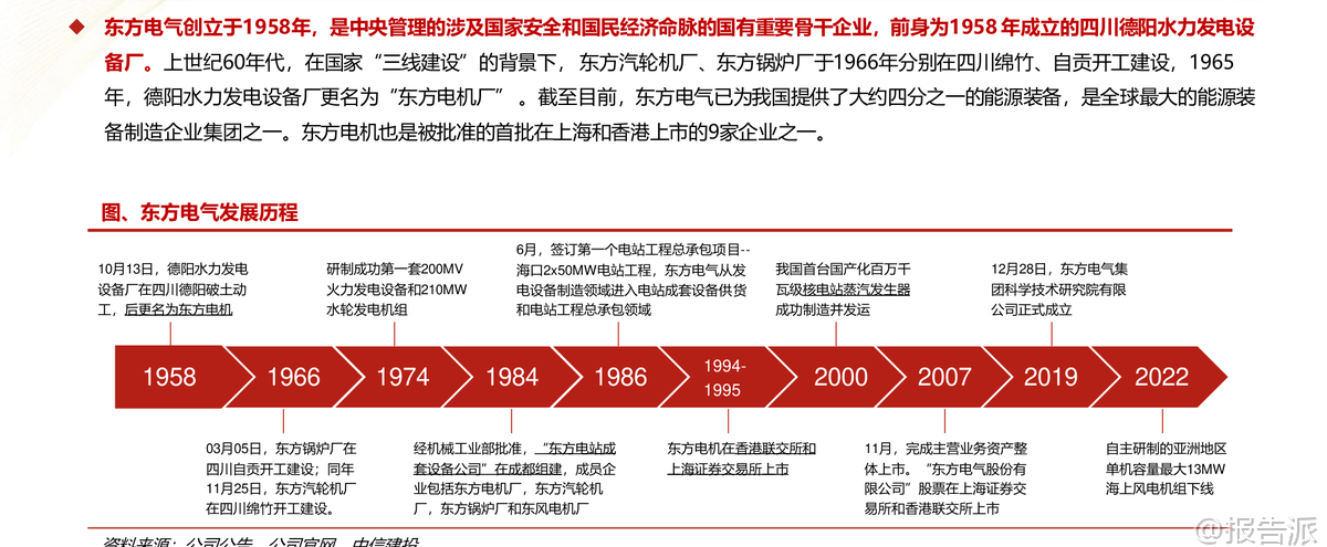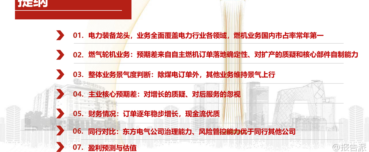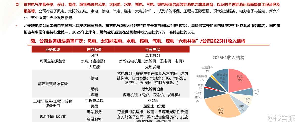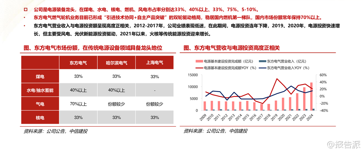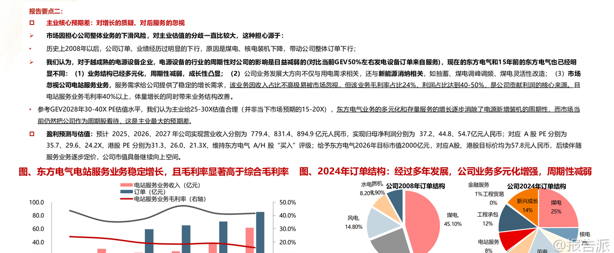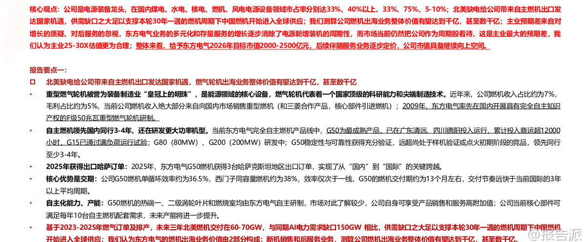 | 东方电气(600875.SH,1072.HK)作为中国电力装备制造领域的龙头企业,正迎来前所未有的发展机遇。 根据中信建投于2026年3月发布的深度研究报告,公司不仅在国内传统电源设备市场占据绝对领先地位,更凭借完全自主知识产权的重型燃气轮机技术,有望实现从“中国制造”向“全球供应”的历史性跨越。 报告指出,东方电气在煤电、水电、核电、燃机等核心电源设备领域的市占率分别高达33%、40%以上、33%和75%,尤其在燃气轮机领域长期稳居国内第一。 近年来,公司持续推进业务多元化布局,形成了风电、太阳能、水电、核电、气电、煤电“六电并举”,以及节能环保、工程与贸易、现代制造服务、新兴产业“五业协同”的发展格局。 这一战略有效降低了对单一电源投资周期的依赖,增强了整体经营的稳定性。 当前最大的市场预期差在于对公司成长性的低估。 长期以来,市场将东方电气视为典型的周期股,给予其15-20倍PE估值。 但中信建投认为,随着公司电站服务业务的持续增长和利润贡献度提升,其商业模式已发生根本性转变。 数据显示,公司电站服务业务收入虽仅占约8%,但毛利占比达24%,利润贡献高达40-50%,且毛利率长期维持在40%以上,远高于公司综合毛利率。 这部分存量后市场服务具有高频、刚需特性,能提供稳定现金流,是典型的“长坡厚雪”赛道。 参考海外巨头GE Vernova的服务订单占比已达50%,中信建投认为东方电气主业应享有25-30倍PE估值更为合理。 燃气轮机出海成为本轮价值重估的核心驱动力。 公司历时15年自主研发的F级50兆瓦重型燃气轮机G50,已于2023年实现商业化运行,累计运行超12000小时,技术成熟度领先国内同行3-4年。 2025年,G50成功斩获哈萨克斯坦3台出口订单,标志着国产重型燃机首次进入国际市场。 其核心竞争优势在于极短的交付周期——仅需13个月左右,远快于国际巨头普遍3年以上的排产周期,在北美等地缺电背景下具备极强竞争力。 更重要的是,G50实现了热端一、二级涡轮叶片和燃烧室等核心部件100%自主化,打破了国外技术封锁。 这不仅规避了高昂的技术授权费和进口成本,更使公司在新机销售和后续长达20-30年的长期服务协议(LTSA)中独享高附加值。 据测算,仅新机销售部分,在中性预期下即可贡献600亿元市值;若未来3-4年内累计装机达100台,后服务市场年利润可达15亿元,对应市值空间600亿元。 综合来看,燃机出海业务整体价值有望达到千亿甚至数千亿级别。 财务层面,公司订单持续高增,2024年新增订单达1011亿元,同比增长17%,2025年前三季度继续同比增长9%。 由于设备交付周期普遍在2-4年,当前强劲的订单为未来几年业绩提供了坚实支撑。 盈利预测方面,预计2025-2027年归母净利润分别为37.2、44.8、54.7亿元,对应2026年目标市值2000-2500亿元,维持A/H股“买入”评级。 伴随服务业务价值逐步被市场认知,公司市值具备显著向上空间。 本文由【报告派】研读,输出观点仅作为行业分析! 原文标题:2026-03-04-中信建投-东方电气(600875)深度报告:中国GEV走向世界 发布时间:2026年 出品方:中信建投 文档页数:49页