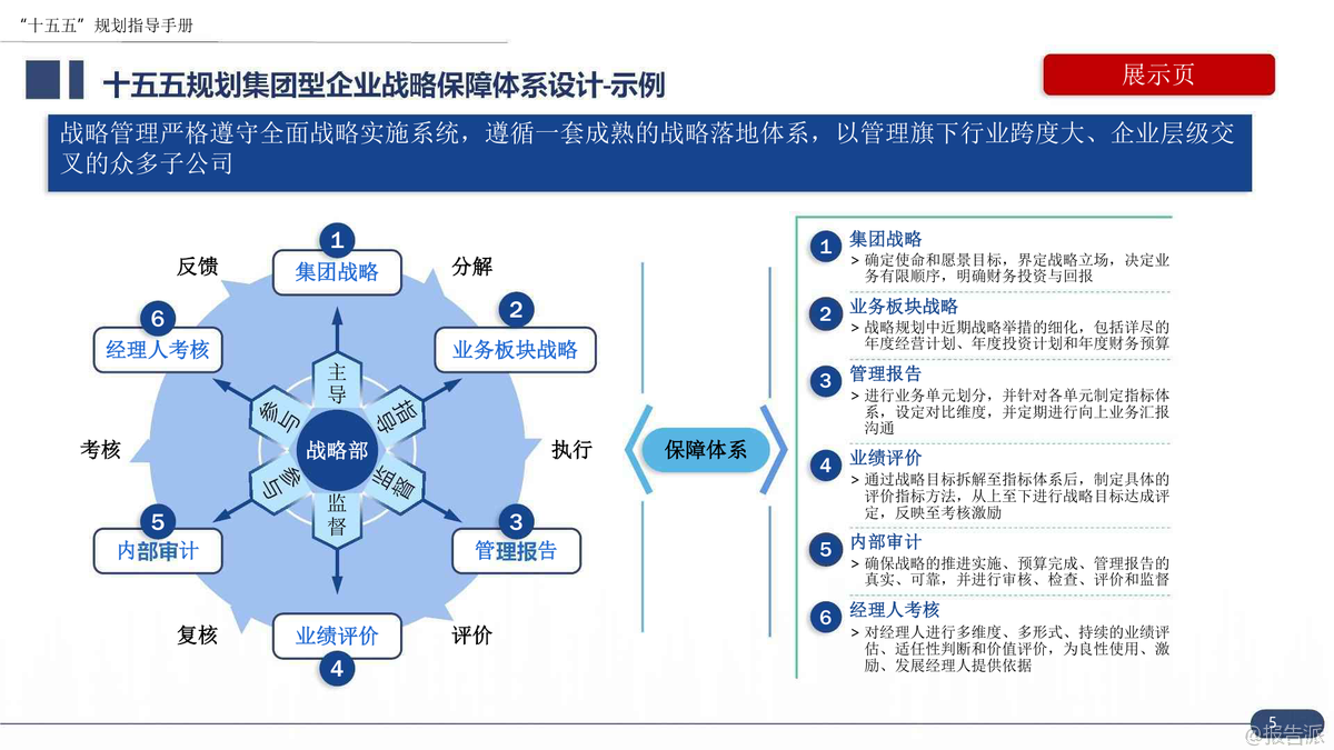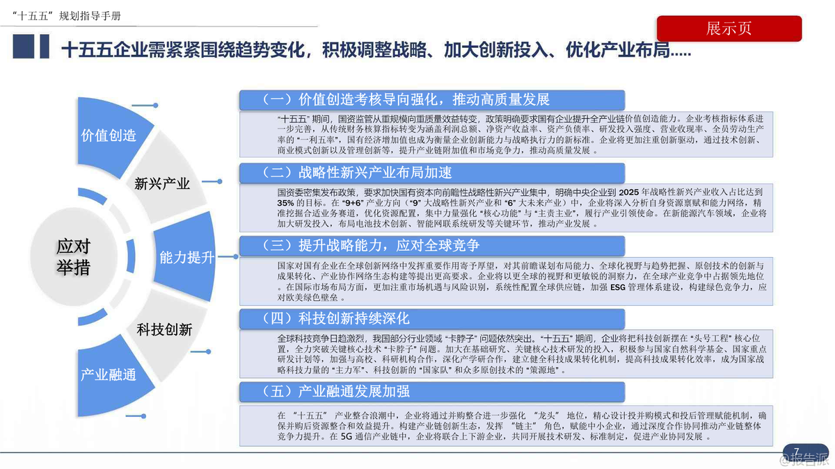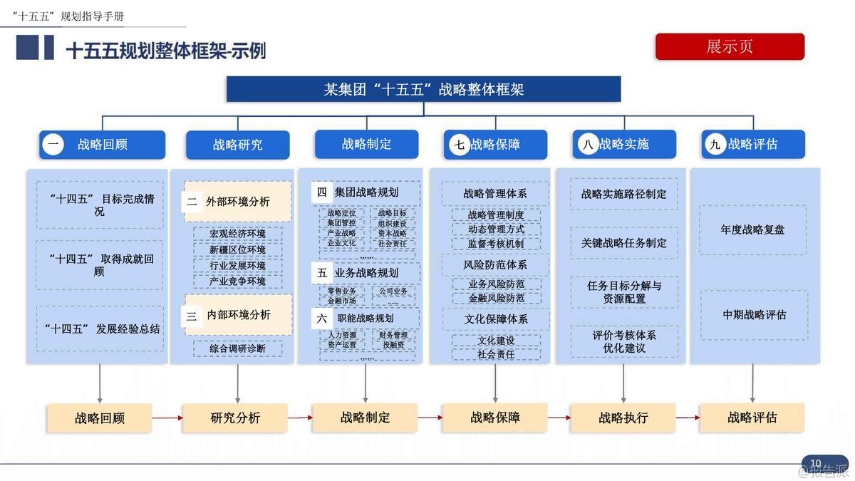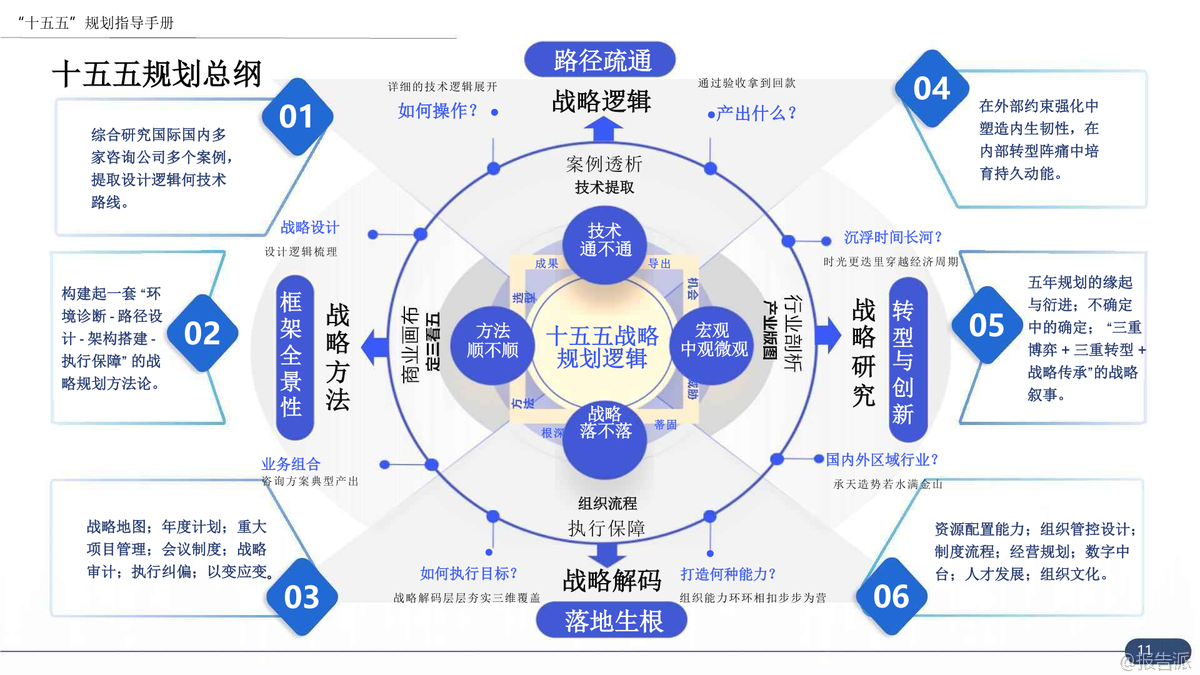 | 在“十五五”规划即将全面铺开的关键节点,一份名为《2025年10月11日更新-大型央国企“十五五”企业战略规划编制实战指南》的深度报告,为国有企业乃至整个中国企业的战略升级提供了系统性框架。 这份长达171页的实战手册,不仅是对国家战略的深刻解读,更是对央国企如何在复杂环境中实现高质量发展的全景式导航。 报告首先厘清了国家五年规划与企业五年规划的内在关联。 国家层面的五年规划为企业提供了宏观环境和战略指引,而企业规划则是国家目标在微观层面的落实。 尤其对于承担“国家队”角色的大型央国企而言,其规划必须服务于国家经济安全、科技进步和民生保障等核心使命。 报告强调,企业规划需在“国家战略+市场逻辑”双轮驱动下,既承担起“强链补链”、突破“卡脖子”技术的产业引领责任,也要实现国有资产的保值增值。 在宏观环境研判上,报告指出“十五五”时期企业将面临“外部约束强化”与“内部转型阵痛”的双重挑战。 国际上,地缘政治博弈、全球产业链重构、绿色转型加速形成“三重博弈”;国内则面临增长动能转换、改革进入深水区、人口结构变迁的“三重转型”。 对此,报告提出企业需构建“内生韧性”与“持久动能”。 为应对复杂局面,报告系统性地介绍了7大核心战略工具,形成了一套从战略设计到执行保障的完整闭环。 其中,BLM业务领先模型和华为“五看三定”模型,为企业提供了从市场洞察到战略落地的清晰路径。 商业模式画布(BMC)则帮助企业拆解“怎么赚钱、靠啥赚钱”的底层逻辑。 而GE矩阵、波士顿矩阵等分析工具,则用于诊断业务组合,优化资源配置。 尤为关键的是,报告强调了“战略解码”的重要性,通过OKR、平衡计分卡等工具,将宏大的战略目标层层分解为可量化、可执行的部门与个人任务,打通了“战略到执行”的最后一公里。 在战略内容上,报告明确了五大核心举措:一是强化价值创造,以“一利五率”等新考核体系引导高质量发展;二是加速布局战略性新兴产业,力争“十五五”末收入占比达35%;三是全面提升科技创新能力,成为国家战略科技力量;四是加强产业融通,发挥“链主”作用;五是深化全球化布局,构建绿色竞争力。 整份报告不仅是方法论的集合,更是一份凝聚共识、破解迷局的行动宣言,为央国企在“十五五”新征程上指明了方向。 出品方:报告派 发布时间:2025年 文档页数:171页