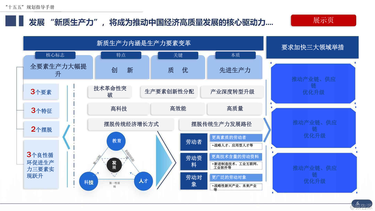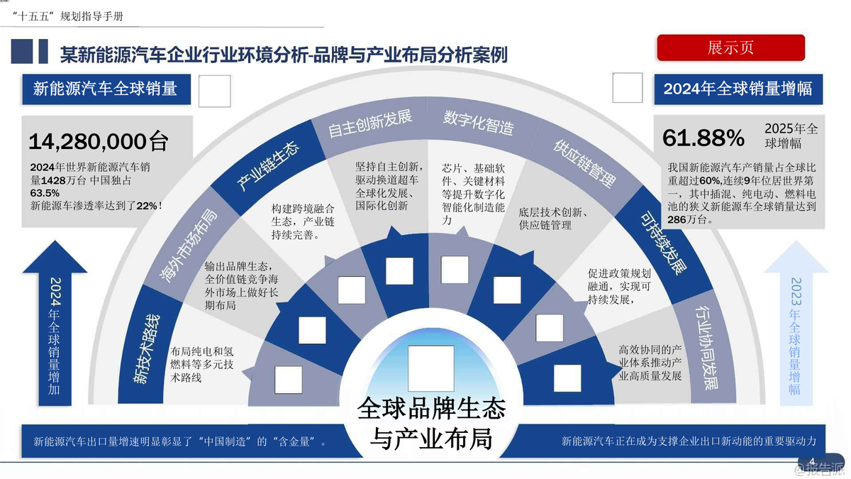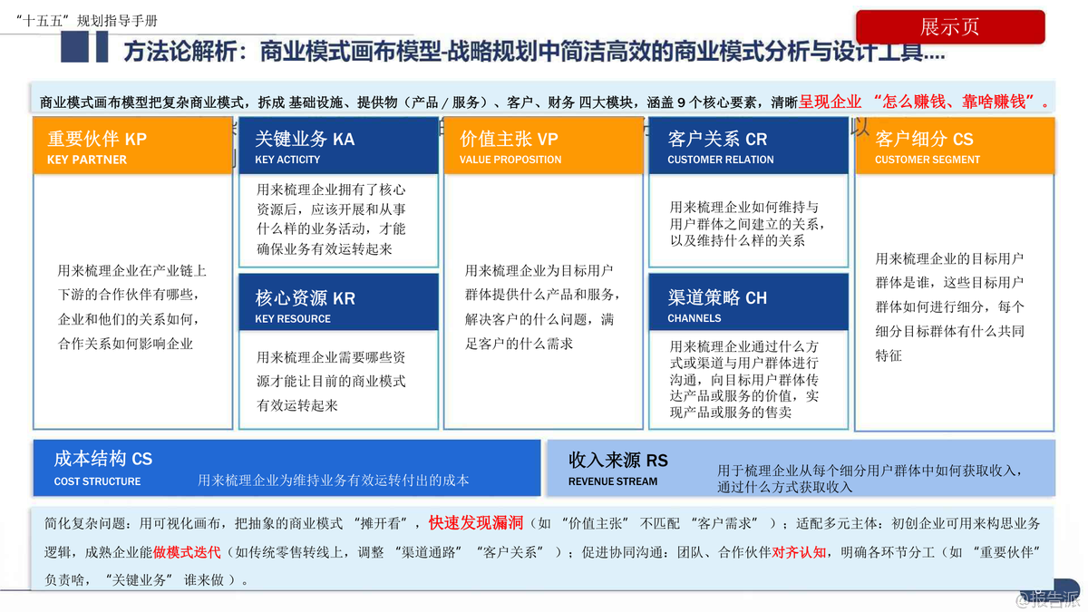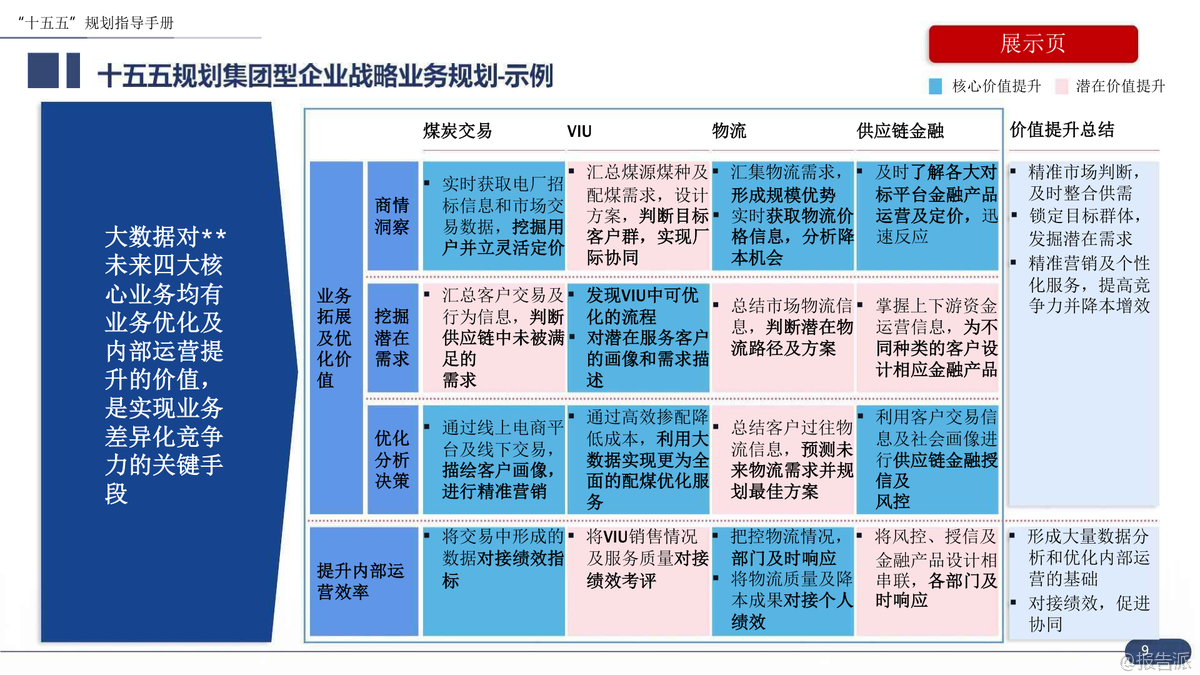 | 在“十五五”规划即将全面铺开的关键节点,一份名为《2025年10月11日更新-大型央国企“十五五”企业战略规划编制实战指南》的深度报告,为国有企业乃至整个中国企业的战略升级提供了系统性框架。 这份长达171页的实战手册,不仅是对国家战略的深刻解读,更是对央国企如何在复杂环境中实现高质量发展的全景式导航。 报告首先厘清了国家五年规划与企业五年规划的内在关联。 国家层面的五年规划为企业提供了宏观环境和战略指引,而企业规划则是国家目标在微观层面的落实。 尤其对于承担“国家队”角色的大型央国企而言,其规划必须服务于国家经济安全、科技进步和民生保障等核心使命。 报告强调,企业规划需在“国家战略+市场逻辑”双轮驱动下,既承担起“强链补链”、突破“卡脖子”技术的产业引领责任,也要实现国有资产的保值增值。 在宏观环境研判上,报告指出“十五五”时期企业将面临“外部约束强化”与“内部转型阵痛”的双重挑战。 国际上,地缘政治博弈、全球产业链重构、绿色转型加速形成“三重博弈”;国内则面临增长动能转换、改革进入深水区、人口结构变迁的“三重转型”。 对此,报告提出企业需构建“内生韧性”与“持久动能”。 为应对复杂局面,报告系统性地介绍了7大核心战略工具,形成了一套从战略设计到执行保障的完整闭环。 其中,BLM业务领先模型和华为“五看三定”模型,为企业提供了从市场洞察到战略落地的清晰路径。 商业模式画布(BMC)则帮助企业拆解“怎么赚钱、靠啥赚钱”的底层逻辑。 而GE矩阵、波士顿矩阵等分析工具,则用于诊断业务组合,优化资源配置。 尤为关键的是,报告强调了“战略解码”的重要性,通过OKR、平衡计分卡等工具,将宏大的战略目标层层分解为可量化、可执行的部门与个人任务,打通了“战略到执行”的最后一公里。 在战略内容上,报告明确了五大核心举措:一是强化价值创造,以“一利五率”等新考核体系引导高质量发展;二是加速布局战略性新兴产业,力争“十五五”末收入占比达35%;三是全面提升科技创新能力,成为国家战略科技力量;四是加强产业融通,发挥“链主”作用;五是深化全球化布局,构建绿色竞争力。 整份报告不仅是方法论的集合,更是一份凝聚共识、破解迷局的行动宣言,为央国企在“十五五”新征程上指明了方向。 出品方:报告派 发布时间:2025年 文档页数:171页