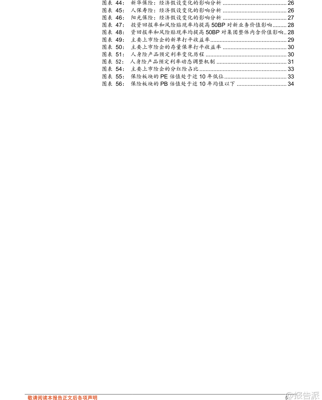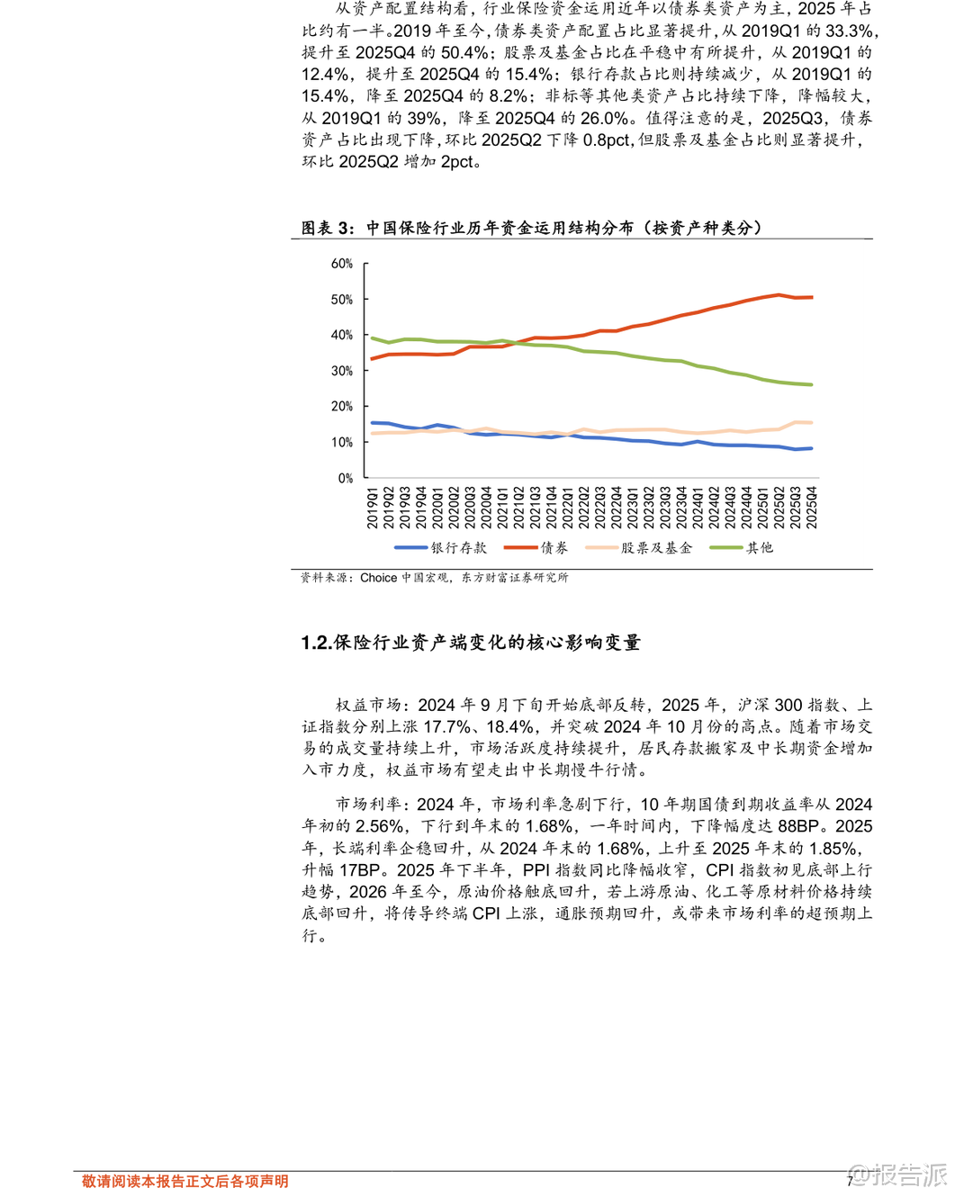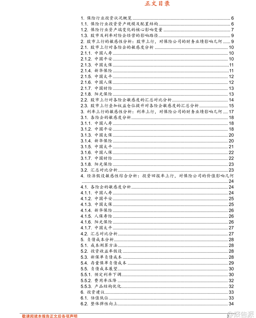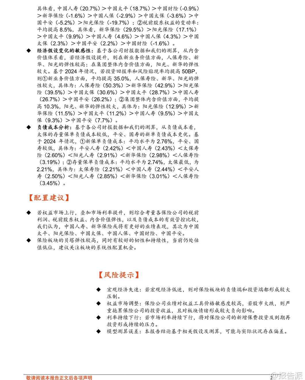| 在当前资本市场与宏观经济环境持续演变的背景下,保险行业的投资端表现正成为影响其整体业绩的核心变量。 根据东方财富证券发布的《非银金融行业深度研究:保险深度,股市及利率影响几何?》报告,从2019年至2026年初,中国保险行业资金运用余额实现快速增长,截至2025年第四季度末已达38.5万亿元,同比增速达15.7%,延续了近年来的扩张趋势。 资产配置结构也发生显著变化:债券类资产占比从2019年第一季度的33.3%提升至2025年第四季度的50.4%,成为险资配置的绝对主力;股票及基金占比则由12.4%上升至15.4%,尤其在2025年第三季度环比增加2个百分点,显示出险企对权益市场的积极布局。 报告指出,权益市场走势和市场利率变动是影响保险公司财务表现的两大关键因素,其影响路径可分为静态与动态两个层面。 静态层面主要体现在时点上的资产价值重估与负债现值调整;动态层面则关乎新增保费与到期再投资的预期收益变化,进而影响长期盈利能力。 具体来看,股市上涨对险企业绩具有明确正向推动作用,而利率上行虽普遍利好股东权益,但对利润的影响存在分化。 在股市上行敏感性方面,基于2024年数据测算,若权益投资价格上涨10%,各险企税前利润平均提升38.7%。 其中,中国太保(+83.4%)、中国人寿(+69.3%)和新华保险(+52.7%)弹性最大,反映出其较高的权益敞口或会计处理特征。 而在税前股东权益方面,新华保险(+18.6%)、中国人寿(+16.1%)和中国太平(+10.3%)更为敏感。 若叠加权益仓位提升10%的情景,敏感性进一步放大,太保、国寿、新华的税前利润增幅可分别达到175.2%、145.6%和110.7%,凸显出“股+仓”双击下的巨大弹性空间。 对于利率上行的敏感性分析显示,若市场利率提升50个基点,各公司税前利润反应不一:中国人寿(+20.7%)和中国太平(+18.7%)呈现显著正向弹性,而其他多数公司如平安(-5.2%)、阳光(-19.7%)等则面临利润压力。 但在税前股东权益维度,除中国财险微降外,其余均受益于利率上行,平均提升8.5%。 新华保险(+29.5%)和阳光保险(+17.1%)弹性突出,表明其资产负债久期匹配更优,在利率抬升环境中能更好地释放利差益。 从内含价值体系看,经济假设的变化同样至关重要。 若投资回报率和风险贴现率同步提高50BP,新业务价值平均增长35.0%,其中人保寿险(+50.3%)、新华保险(+42.9%)和阳光保险(+39.5%)最为敏感。 集团整体内含价值平均提升10.3%,阳光保险(+12.9%)和新华保险(+11.5%)领先,体现出其精算假设对收益率变化的高度响应能力。 负债成本管理亦是决定险企竞争力的关键。 数据显示,2024年主要上市险企新单负债成本均值为2.76%,其中平安人寿(2.42%)和中国人寿(2.43%)最优;存量保单负债成本均值为2.74%,中国太保持有最低水平(2.21%)。 这一差异意味着太保在存量业务的成本管控上更具优势,而平安与国寿在新业务获取上具备更强的定价能力。 展望未来,多重因素将共同推动行业负债成本下行:一是监管推动预定利率与市场利率挂钩的动态调整机制,2025年普通型产品预定利率已降至2.0%的历史低位;二是“报行合一”政策深化执行,有效压降银保与个代渠道费用率;三是产品结构加速向分红险等浮动收益型转型,2025年上半年部分公司分红险占比已超50%,有助于降低刚性负债压力。 综合来看,当权益市场回暖叠加利率上行时,中国人寿与新华保险有望迎来业绩的双重催化,其次为中国太平、阳光保险、中国太保等。 尽管外部环境仍存不确定性——如宏观失速、股市回调、利率持续下行等风险——但当前保险板块估值处于历史低位(PE约7.3倍,近十年0.9%分位),贝塔属性强且具备长期韧性,具备系统性配置价值。 本文由【报告派】研读,输出观点仅作为行业分析! 原文标题:2026-03-05-东方财富证券-东方财富证券-非银金融行业深度研究:保险深度,股市及利率影响几何? 发布时间:2026年 出品方:东方财富证券 文档页数:57页