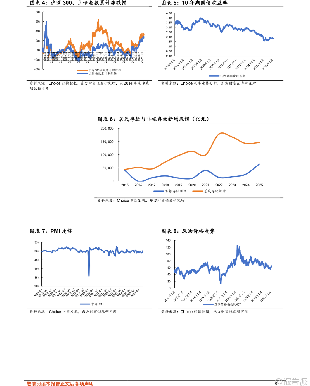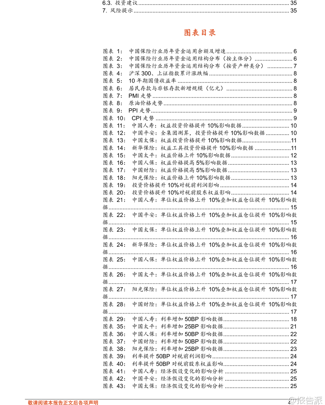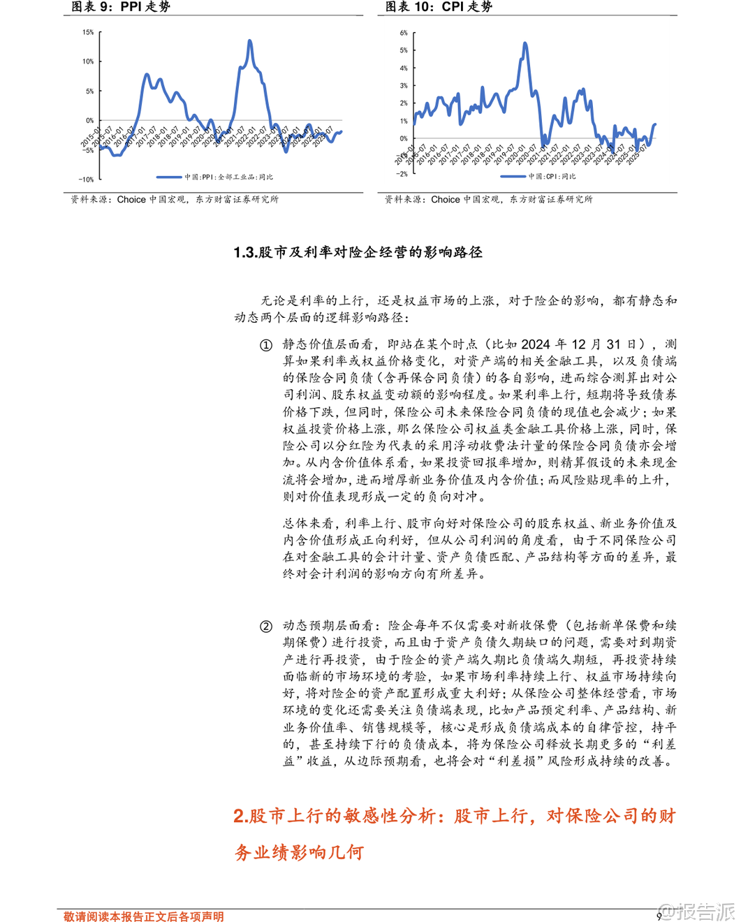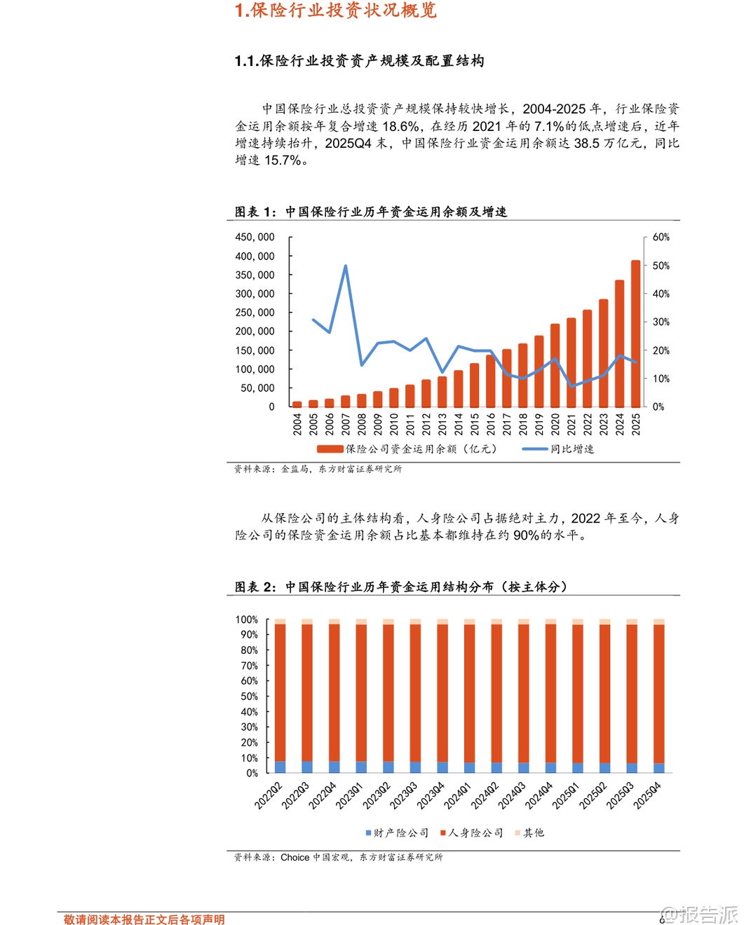 | 在当前资本市场与宏观经济环境持续演变的背景下,保险行业的投资端表现正成为影响其整体业绩的核心变量。 根据东方财富证券发布的《非银金融行业深度研究:保险深度,股市及利率影响几何?》报告,从2019年至2026年初,中国保险行业资金运用余额实现快速增长,截至2025年第四季度末已达38.5万亿元,同比增速达15.7%,延续了近年来的扩张趋势。 资产配置结构也发生显著变化:债券类资产占比从2019年第一季度的33.3%提升至2025年第四季度的50.4%,成为险资配置的绝对主力;股票及基金占比则由12.4%上升至15.4%,尤其在2025年第三季度环比增加2个百分点,显示出险企对权益市场的积极布局。 报告指出,权益市场走势和市场利率变动是影响保险公司财务表现的两大关键因素,其影响路径可分为静态与动态两个层面。 静态层面主要体现在时点上的资产价值重估与负债现值调整;动态层面则关乎新增保费与到期再投资的预期收益变化,进而影响长期盈利能力。 具体来看,股市上涨对险企业绩具有明确正向推动作用,而利率上行虽普遍利好股东权益,但对利润的影响存在分化。 在股市上行敏感性方面,基于2024年数据测算,若权益投资价格上涨10%,各险企税前利润平均提升38.7%。 其中,中国太保(+83.4%)、中国人寿(+69.3%)和新华保险(+52.7%)弹性最大,反映出其较高的权益敞口或会计处理特征。 而在税前股东权益方面,新华保险(+18.6%)、中国人寿(+16.1%)和中国太平(+10.3%)更为敏感。 若叠加权益仓位提升10%的情景,敏感性进一步放大,太保、国寿、新华的税前利润增幅可分别达到175.2%、145.6%和110.7%,凸显出“股+仓”双击下的巨大弹性空间。 对于利率上行的敏感性分析显示,若市场利率提升50个基点,各公司税前利润反应不一:中国人寿(+20.7%)和中国太平(+18.7%)呈现显著正向弹性,而其他多数公司如平安(-5.2%)、阳光(-19.7%)等则面临利润压力。 但在税前股东权益维度,除中国财险微降外,其余均受益于利率上行,平均提升8.5%。 新华保险(+29.5%)和阳光保险(+17.1%)弹性突出,表明其资产负债久期匹配更优,在利率抬升环境中能更好地释放利差益。 从内含价值体系看,经济假设的变化同样至关重要。 若投资回报率和风险贴现率同步提高50BP,新业务价值平均增长35.0%,其中人保寿险(+50.3%)、新华保险(+42.9%)和阳光保险(+39.5%)最为敏感。 集团整体内含价值平均提升10.3%,阳光保险(+12.9%)和新华保险(+11.5%)领先,体现出其精算假设对收益率变化的高度响应能力。 负债成本管理亦是决定险企竞争力的关键。 数据显示,2024年主要上市险企新单负债成本均值为2.76%,其中平安人寿(2.42%)和中国人寿(2.43%)最优;存量保单负债成本均值为2.74%,中国太保持有最低水平(2.21%)。 这一差异意味着太保在存量业务的成本管控上更具优势,而平安与国寿在新业务获取上具备更强的定价能力。 展望未来,多重因素将共同推动行业负债成本下行:一是监管推动预定利率与市场利率挂钩的动态调整机制,2025年普通型产品预定利率已降至2.0%的历史低位;二是“报行合一”政策深化执行,有效压降银保与个代渠道费用率;三是产品结构加速向分红险等浮动收益型转型,2025年上半年部分公司分红险占比已超50%,有助于降低刚性负债压力。 综合来看,当权益市场回暖叠加利率上行时,中国人寿与新华保险有望迎来业绩的双重催化,其次为中国太平、阳光保险、中国太保等。 尽管外部环境仍存不确定性——如宏观失速、股市回调、利率持续下行等风险——但当前保险板块估值处于历史低位(PE约7.3倍,近十年0.9%分位),贝塔属性强且具备长期韧性,具备系统性配置价值。 本文由【报告派】研读,输出观点仅作为行业分析! 原文标题:2026-03-05-东方财富证券-东方财富证券-非银金融行业深度研究:保险深度,股市及利率影响几何? 发布时间:2026年 出品方:东方财富证券 文档页数:57页