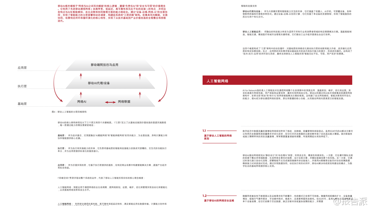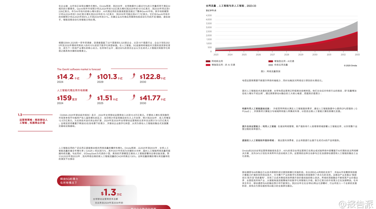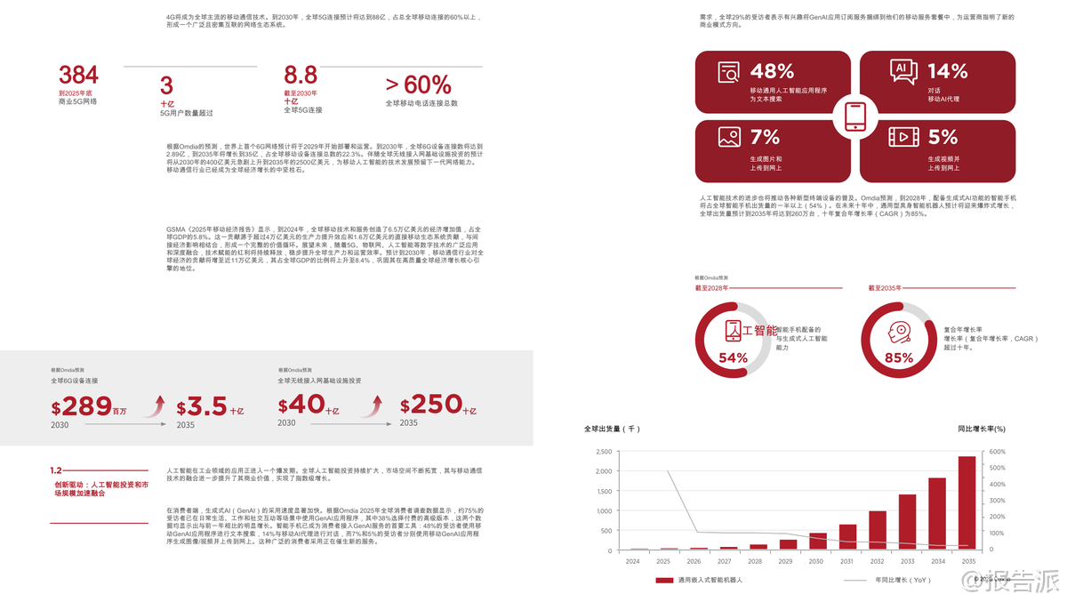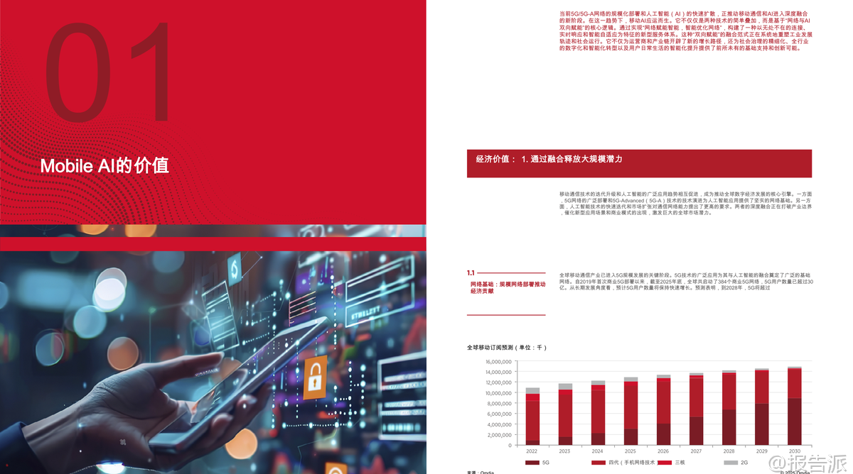 | 随着5G、5G-A的规模化部署和人工智能技术的迅猛发展,全球正迈向“移动人工智能”(Mobile AI)的新纪元。 这份由GSMA与GTI联合发布的《2026移动人工智能行业白皮书》系统性地阐述了Mobile AI的核心价值、技术架构、实施路径及未来发展方向,为产业界提供了权威的战略指引。 Mobile AI并非通信与AI的简单叠加,而是基于“网络与AI双向赋能”的深度融合范式。 其核心逻辑在于“网络赋能智能,智能优化网络”,通过构建一个覆盖“设备-边缘-网络-云”的协同智能体系,实现智能服务的无处不在、安全可信与高效可用。 这一融合正在重塑全球数字经济格局,成为推动高质量发展的关键引擎。 从经济价值看,Mobile AI释放出巨大的市场潜力。 截至2025年底,全球已启动384个商用5G网络,用户超30亿。 预计到2030年,移动产业对全球GDP的贡献将接近11万亿美元,占比达8.4%。 与此同时,生成式AI(GenAI)在消费端快速普及,75%的受访者已在日常生活中使用GenAI应用,其中近四成愿意为高级功能付费。 企业端同样展现出强劲需求,超过90%的企业认为GenAI对其数字化转型具有战略意义。 Omdia预测,到2030年,全球数据中心超70%的工作负载将用于AI计算,GenAI软件市场规模将突破1200亿美元,AI代理应用的复合年增长率更是高达85%,显示出爆发式增长态势。 在此背景下,电信运营商正积极转型,探索三大商业路径:一是构建专用AI基础设施,如建设AI数据中心提供GPU即服务(GPUaaS);二是利用AI提升自身运营效率,如在网络管理、客户服务中部署AI代理;三是直接进入AI软件服务领域,推出面向C端和B端的AI产品。 目前已有40%的全球运营商在现网部署了AI驱动的自主网络解决方案,另有34%计划在未来两年内推进相关项目。 Mobile AI的技术内涵体现在“三层四维”架构中。 “三层”指基础层、执行层和应用层,形成从底层支撑到价值落地的完整链条;“四维”则涵盖AI for Network、Network for AI、Mobile AI Agents/Terminals和Mobile AI Applications,共同驱动生态系统演进。 其中,AI for Network致力于实现网络的自动化规划、运维、优化与安全,推动向L4级及以上自主网络迈进;而Network for AI则强调通过增强连接、细粒度保障和跨层协作,满足AI应用对高带宽、低时延、高可靠性的严苛要求。 终端层面,智能设备正经历智能化跃迁。 白皮书提出终端智能化五级划分(L1-L5),当前L3级辅助型代理快速发展,预计2030年有望实现L4专家级能力。 典型实践包括家庭服务机器人、工业多机协作、机械导盲犬等,均依托“终端-边缘-云”协同架构,在保证实时响应的同时降低硬件成本与能耗。 特别是针对中低端设备,云代理架构使其无需高性能芯片即可获得持续升级的智能服务能力,有效促进AI普惠化。 应用场景上,Mobile AI已在多个垂直行业落地生根。 在智能制造中,通过“端侧推理+边缘协作”实现缺陷检测、AR辅助装配,提升生产安全性与灵活性;城市治理借助“计算前置”策略,仅上传异常事件数据,显著降低传输压力并保护公民隐私;智能交通采用车路云一体化方案,结合C-V2X与边缘计算,突破单车智能局限,为L3/L4自动驾驶铺路;智慧医疗则通过便携式AI终端赋能基层诊疗,实现院前急救预警与远程会诊,推动“以治病为中心”向“以健康为中心”转变;能源电力领域利用AI无人机与防爆机器人完成高危巡检,提升作业安全与效率。 面向未来,报告呼吁全产业协同推进五大关键路径:一是加强基础设施建设,重点突破上行链路瓶颈,发展AI原生网络;二是开展前瞻性频谱规划,加快6GHz与毫米波部署;三是推动技术创新,构建端到端可信的安全体系;四是加速终端生态进化,实现软硬件深度融合;五是建立全球统一标准体系,破解接口碎片化难题。 总体而言,Mobile AI正处于从“融合应用”向“原生共生”演进的关键阶段。 随着5G-A全面商用和6G研发推进,一个以智能为核心、连接为基础、安全为底线的全新数字生态正在形成。 唯有政策引导、技术突破与商业创新多方合力,才能真正释放其变革潜力,构建开放、包容、负责任的移动AI未来。 本文由【报告派】研读,输出观点仅作为行业分析! 原文标题:原文标题:2026-03-05-GTI&GSMA-2026移动人工智能行业白皮书(英译中) 发布时间:2026年 出品方:GSMA 文档页数:39页