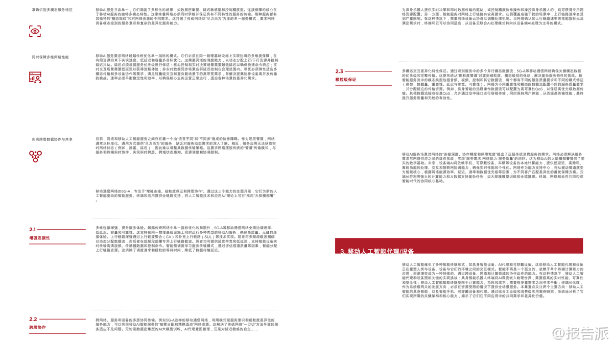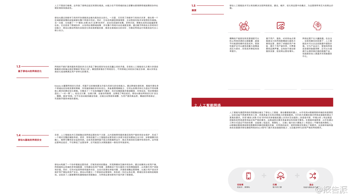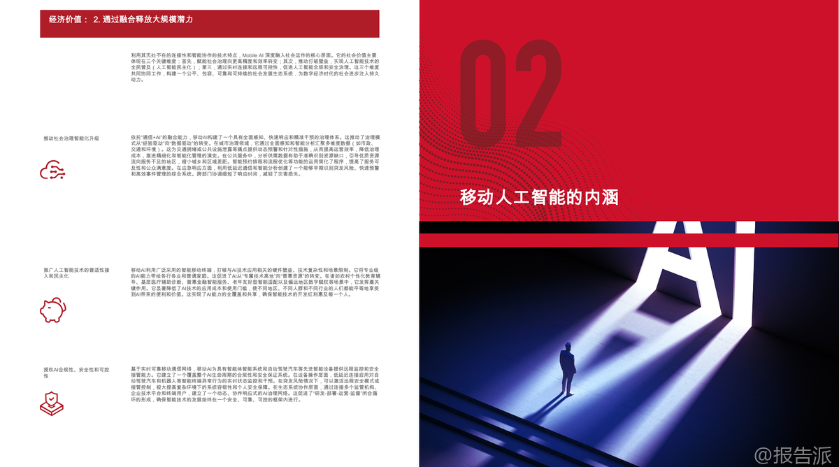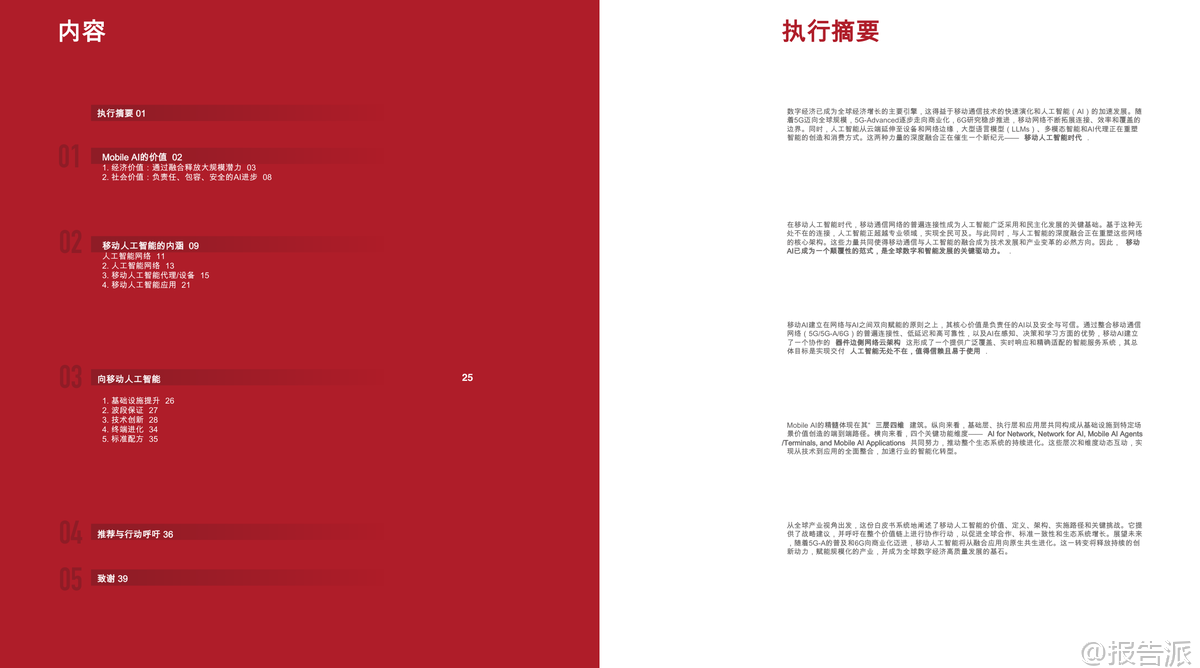 | 随着5G、5G-A的规模化部署和人工智能技术的迅猛发展,全球正迈向“移动人工智能”(Mobile AI)的新纪元。 这份由GSMA与GTI联合发布的《2026移动人工智能行业白皮书》系统性地阐述了Mobile AI的核心价值、技术架构、实施路径及未来发展方向,为产业界提供了权威的战略指引。 Mobile AI并非通信与AI的简单叠加,而是基于“网络与AI双向赋能”的深度融合范式。 其核心逻辑在于“网络赋能智能,智能优化网络”,通过构建一个覆盖“设备-边缘-网络-云”的协同智能体系,实现智能服务的无处不在、安全可信与高效可用。 这一融合正在重塑全球数字经济格局,成为推动高质量发展的关键引擎。 从经济价值看,Mobile AI释放出巨大的市场潜力。 截至2025年底,全球已启动384个商用5G网络,用户超30亿。 预计到2030年,移动产业对全球GDP的贡献将接近11万亿美元,占比达8.4%。 与此同时,生成式AI(GenAI)在消费端快速普及,75%的受访者已在日常生活中使用GenAI应用,其中近四成愿意为高级功能付费。 企业端同样展现出强劲需求,超过90%的企业认为GenAI对其数字化转型具有战略意义。 Omdia预测,到2030年,全球数据中心超70%的工作负载将用于AI计算,GenAI软件市场规模将突破1200亿美元,AI代理应用的复合年增长率更是高达85%,显示出爆发式增长态势。 在此背景下,电信运营商正积极转型,探索三大商业路径:一是构建专用AI基础设施,如建设AI数据中心提供GPU即服务(GPUaaS);二是利用AI提升自身运营效率,如在网络管理、客户服务中部署AI代理;三是直接进入AI软件服务领域,推出面向C端和B端的AI产品。 目前已有40%的全球运营商在现网部署了AI驱动的自主网络解决方案,另有34%计划在未来两年内推进相关项目。 Mobile AI的技术内涵体现在“三层四维”架构中。 “三层”指基础层、执行层和应用层,形成从底层支撑到价值落地的完整链条;“四维”则涵盖AI for Network、Network for AI、Mobile AI Agents/Terminals和Mobile AI Applications,共同驱动生态系统演进。 其中,AI for Network致力于实现网络的自动化规划、运维、优化与安全,推动向L4级及以上自主网络迈进;而Network for AI则强调通过增强连接、细粒度保障和跨层协作,满足AI应用对高带宽、低时延、高可靠性的严苛要求。 终端层面,智能设备正经历智能化跃迁。 白皮书提出终端智能化五级划分(L1-L5),当前L3级辅助型代理快速发展,预计2030年有望实现L4专家级能力。 典型实践包括家庭服务机器人、工业多机协作、机械导盲犬等,均依托“终端-边缘-云”协同架构,在保证实时响应的同时降低硬件成本与能耗。 特别是针对中低端设备,云代理架构使其无需高性能芯片即可获得持续升级的智能服务能力,有效促进AI普惠化。 应用场景上,Mobile AI已在多个垂直行业落地生根。 在智能制造中,通过“端侧推理+边缘协作”实现缺陷检测、AR辅助装配,提升生产安全性与灵活性;城市治理借助“计算前置”策略,仅上传异常事件数据,显著降低传输压力并保护公民隐私;智能交通采用车路云一体化方案,结合C-V2X与边缘计算,突破单车智能局限,为L3/L4自动驾驶铺路;智慧医疗则通过便携式AI终端赋能基层诊疗,实现院前急救预警与远程会诊,推动“以治病为中心”向“以健康为中心”转变;能源电力领域利用AI无人机与防爆机器人完成高危巡检,提升作业安全与效率。 面向未来,报告呼吁全产业协同推进五大关键路径:一是加强基础设施建设,重点突破上行链路瓶颈,发展AI原生网络;二是开展前瞻性频谱规划,加快6GHz与毫米波部署;三是推动技术创新,构建端到端可信的安全体系;四是加速终端生态进化,实现软硬件深度融合;五是建立全球统一标准体系,破解接口碎片化难题。 总体而言,Mobile AI正处于从“融合应用”向“原生共生”演进的关键阶段。 随着5G-A全面商用和6G研发推进,一个以智能为核心、连接为基础、安全为底线的全新数字生态正在形成。 唯有政策引导、技术突破与商业创新多方合力,才能真正释放其变革潜力,构建开放、包容、负责任的移动AI未来。 本文由【报告派】研读,输出观点仅作为行业分析! 原文标题:原文标题:2026-03-05-GTI&GSMA-2026移动人工智能行业白皮书(英译中) 发布时间:2026年 出品方:GSMA 文档页数:39页