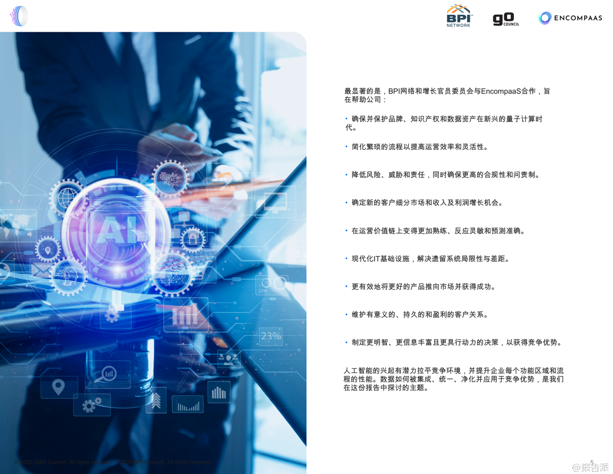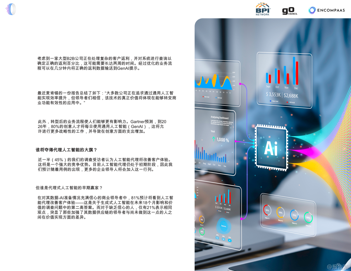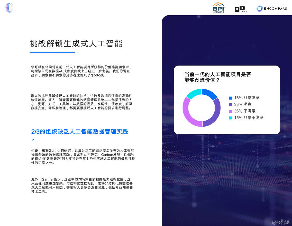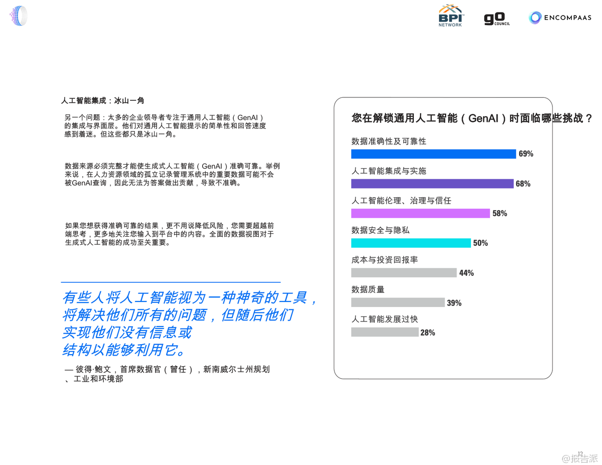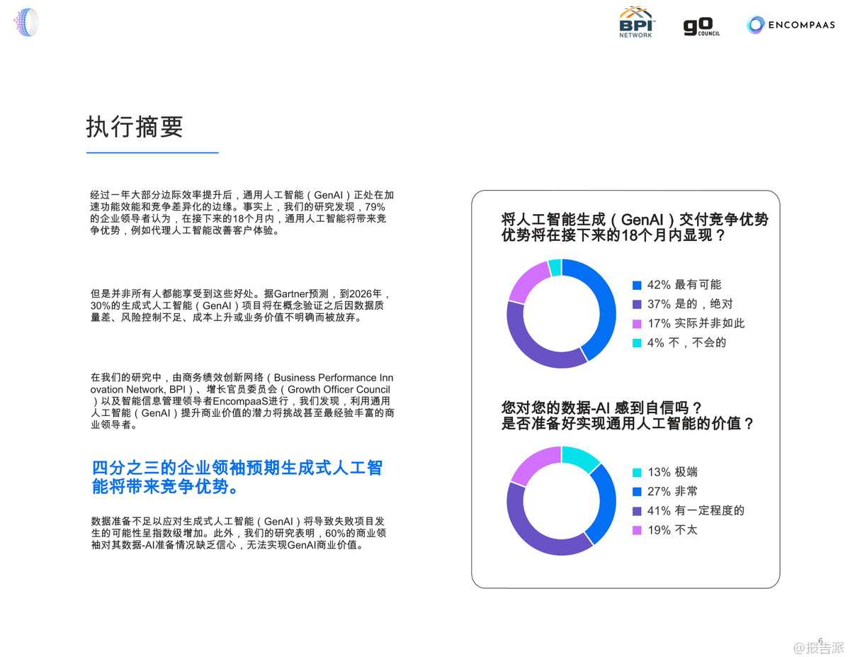 | 生成式人工智能(GenAI)正以前所未有的速度重塑全球产业格局,成为企业争夺竞争优势的核心引擎。 然而,尽管79%的企业领导者相信GenAI将在未来18个月内带来显著优势,现实却揭示了一个严峻的悖论:60%的商业领袖对其组织的数据-AI准备程度缺乏信心。 这一“雄心与执行”之间的巨大鸿沟,正是决定谁能真正兑现GenAI商业价值的关键分水岭。 本报告由BPI网络联合增长官委员会与智能信息管理领导者EncompaaS共同发布,通过对全球171位企业高管的深度调研,揭示了GenAI落地过程中的四大核心挑战:数据质量、准确性与可靠性、安全与隐私,以及成本与投资回报率。 研究指出,Gartner预测到2026年,30%的GenAI项目将因数据质量问题、风险控制不足或价值不明确而被终止,凸显出“AI-ready数据”已成为成败的底层基石。 当前,企业面临的最大障碍之一是数据孤岛与非结构化数据的治理困境。 高达70%-90%的企业数据为非结构化内容,散落在文件共享、邮件、OneDrive甚至纸质档案中,未能被有效分类、索引和信任,导致GenAI无法获取完整上下文,进而引发答案不准确、合规风险上升乃至“AI幻觉”频发。 与此同时,仅有约一半的企业对自身数据质量表示满意,而数据理解有限、治理薄弱、系统陈旧等问题普遍存在。 在区域维度上,北美企业在GenAI成熟度上领先,仅38%的受访者表示当前项目未创造价值,而亚太地区高达84%的企业仍处迷茫,超80%缺乏数据准备信心。 从业务模式看,B2B企业虽整体满意度较低,但在高价值的“文档生成与个性化”等复杂场景中展现出更高成熟度,反观B2C企业更多聚焦于流程自动化等初级应用。 值得注意的是,真正的突破口不仅在于技术投入,更在于组织思维的转变。 领先企业正从“先行动、后准备”转向“先准备、再行动”,优先投资于数据治理工具、AI就绪的数据平台,并大力提升全员的数据与AI素养。 专家强调,GenAI的价值不仅是效率提升,更是释放此前无法实现的创新能力,如AI代理改善客户体验、自动生成营销内容、智能合同分析等。 最终,GenAI的竞争本质是数据准备度的竞争。 企业需构建可信赖的数据基础,融合技术、人才与治理框架,才能让GenAI从“玩具”变为“武器”,在新一轮技术浪潮中确立真正的领先地位。 出品方:BPI网络 发布时间:2025年 文档页数:41页