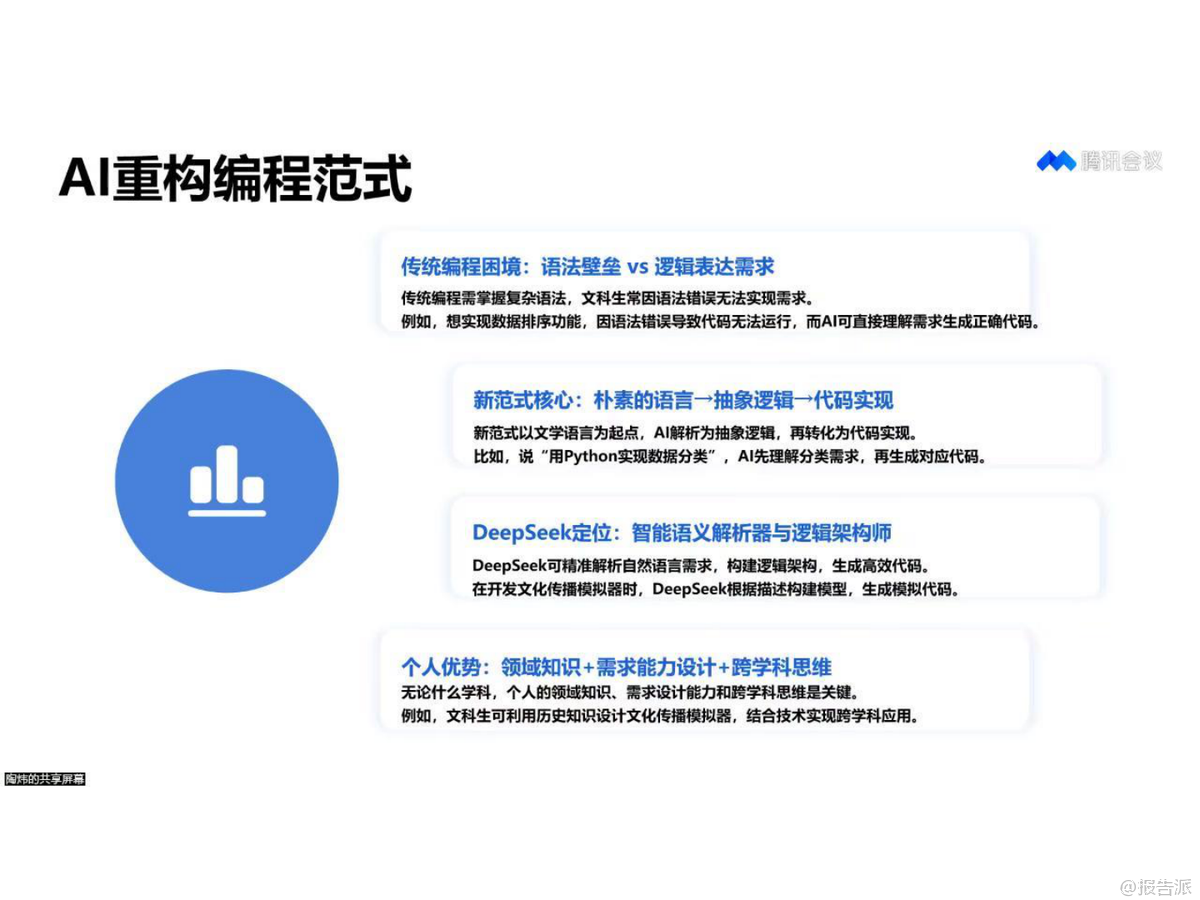 | 本文档由清华大学新闻学院与人工智能学院联合发布,聚焦于文科生如何在零基础条件下快速掌握AI编程技能,旨在提升其想象力与实操能力。 报告由新媒沈阳团队的陶炜博士生主笔,全面梳理了当前AI技术在人文社科领域的应用前景,并提出一套系统化的学习路径。 报告首先介绍了DeepSeek这一由中国科技公司开发的通用人工智能(AGI)模型,特别是其开源推理模型DeepSeek-R1,该模型在数学、代码、自然语言推理等任务上的性能已接近OpenAI的o1正式版,且具备免费商用的优势。 这为文科生提供了强大的技术支持,降低了进入AI领域的门槛。 报告强调,文科生无需掌握复杂的编程语法,只需清晰描述需求,AI即可将其转化为技术逻辑。 这种“技术翻译官”的角色定位,使得AI成为文科生的“万能助手”。 通过AI,文科生可以快速生成大量内容(人机快生),并在海量产出中筛选优质成果(人机优生),从而实现效率与质量的双重突破。 报告还提出了“破除迷思与核心心法”,指出文科生应摆脱对代码的恐惧,利用自身在故事思维、设计能力和跨学科知识上的优势,将复杂需求以叙事方式呈现,便于AI理解。 例如,在开发文化传播模拟器时,文科生可凭借历史知识设计出富有创意的传播路径,并通过AI实现逻辑构建与代码生成。 此外,报告提倡“逆向满足理论”,即借助AI技术,先满足个体高层次的认知、审美和自我实现需求,再反哺基础物质需求。 这一理念打破了传统马斯洛需求层次的线性逻辑,赋予个体在低物质条件下仍能获得高度精神满足的可能性。 在实践层面,报告提供了详尽的操作指南,包括如何安装本地代码编译器、常用Python库(如Pandas、Matplotlib、Scikit-learn)的使用方法,以及如何利用DeepSeek生成代码、图表乃至完整网站。 案例涵盖从数据可视化、时间序列分析到社会仿真建模等多个领域,充分展现了AI在人文社科研究中的巨大潜力。 最后,报告探讨了AI幻觉、伦理风险等挑战,并呼吁在享受技术红利的同时,保持批判性思维。 总体而言,这份报告为文科生拥抱AI时代提供了一份兼具理论高度与实践指导的权威指南。 出品方:清华大学 发布时间:2025年 文档页数:145页