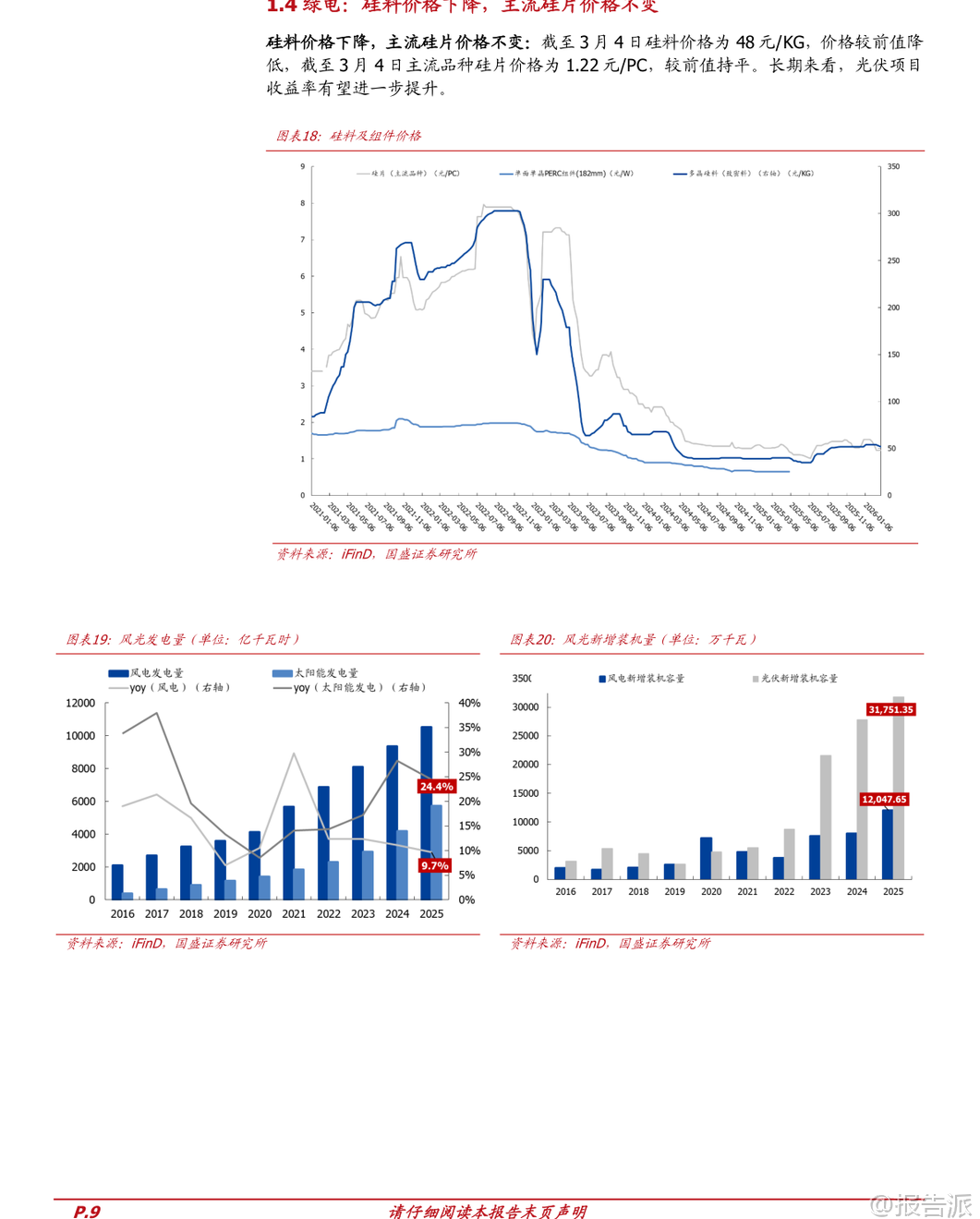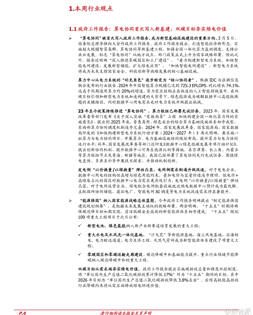 | 本周(3月2日至3月6日)资本市场整体小幅回调,上证指数下跌0.93%,沪深300指数下跌1.07%。 然而,在此背景下,中信电力及公用事业指数逆势上涨2.88%,跑赢大盘近4个百分点,位列30个一级行业板块涨幅榜第三位,展现出强劲的抗跌性与成长潜力。 这一表现背后,是政策面的重大突破——“算电协同”首次被写入2026年政府工作报告,标志着我国能源与数字基础设施融合迈入国家战略新阶段。 核心亮点一:“算电协同”正式上升为国家战略。 今年政府工作报告明确提出“实施超大规模智算集群、算电协同等新基建工程”,这是“算电协同”概念首次进入国家最高层级的政策文件,意义重大。 过去两年,“东数西算”工程推动数据中心向西部资源富集区布局,而此次升级意味着算力与电力将从物理空间的协同迈向运行机制、调度系统和商业模式的深度融合。 根据IDC与浪潮信息数据,2024年中国智能算力规模已达725.3 EFLOPS,同比增长高达74.1%,远超通用算力增速。 AI驱动的算力需求爆发式增长,对电力系统尤其是绿色电力供应提出前所未有的挑战与机遇。 未来,数据中心将不再是单纯的“用电大户”,而是新型电力系统中的“核心协同者”,参与电网调峰、储能响应甚至虚拟电厂运营。 政策层面早已铺垫。 2023年发改委发布《关于深入实施“东数西算”工程加快构建全国一体化算力网的实施意见》,提出2025年底建成普惠易用、绿色安全的综合算力基础设施体系;2024年三部委联合印发《加快构建新型电力系统行动方案(2024—2027年)》,明确要求实施一批算力与电力协同项目;同年发布的《数据中心绿色低碳发展专项行动计划》进一步强调提升可再生能源使用比例。 目前,京津冀、长三角、内蒙古、青海、新疆等算力枢纽已开展绿电直供、多能互补等先行先试任务,探索技术路径与机制创新。 核心亮点二:“能源强国”战略蓝图成型,双碳目标再加码。 本次报告首次提出“制定能源强国建设规划纲要”,并将核电、氢能、先进储能、可控核聚变等纳入“未来能源”重点方向,凸显国家对能源安全与科技自立的高度重视。 “十五五”期间(2026-2030年),我国将确保实现碳达峰目标,清洁低碳安全高效的新型能源体系初步建成。 具体目标包括:“单位GDP二氧化碳排放累计降低17%”,其中2026年目标为下降3.8%左右,并实施碳排放总量和强度双控制度。 高耗能、高排放行业将面临更严格的降碳约束,从而从需求端释放绿电的环境价值。 “十五五”109项重大工程同步公布,涵盖三大维度:一是新产业赛道,如新型电池、绿色氢能;二是新型能源体系建设七大工程,包括重大水电及水风光一体化基地、“沙戈荒”新能源基地、海上风电、沿海核电、电力输送通道等;三是碳达峰碳中和工程,涉及零碳园区、零碳运输走廊、重点行业节能降碳等。 此外,报告还提出设立“国家低碳转型基金”,培育氢能、绿色燃料(如绿氢、绿氨、可持续航空燃料)等新增长点,为绿色产业发展提供资金支持。 市场影响方面,发电侧与电网侧迎来结构性机遇。 对于发电企业,低电价叠加高绿电占比的区域将成为数据中心选址的核心吸引力,“以价换量”或“以绿换量”的弹性显著增强。 推荐关注具备区位优势的绿电运营商,如金开新能、甘肃能源等。 对于电网企业,为满足数据中心稳定、高效、绿色的供电需求,主配微网协同储能、虚拟电厂、AI智能调度等新型电力系统改造需求将加速释放,建议关注涪陵电力等具备综合能源服务能力的企业。 投资建议上,报告维持对电力行业的“增持”评级。 重点标的包括:火电板块关注盈利修复且具备高分红属性的华能国际、华电国际、国电电力等;火电灵活性改造龙头青达环保、华光环能;优质绿电资产如新天绿色能源、龙源电力、中闽能源;水电与核电防御性品种长江电力、川投能源、中国核电、中国广核;燃气板块推荐盈利稳定、分红可靠的龙头城燃企业新奥能源、华润燃气等。 风险提示包括煤炭等原料价格超预期上涨、新能源项目建设进度不及预期、电力辅助服务市场及绿证交易政策推进缓慢等。 总体来看,2026年政府工作报告将“算电协同”与“能源强国”置于突出位置,不仅为电力行业注入长期增长动能,也预示着能源系统正深度融入国家科技创新与安全发展战略,绿电价值与系统调节能力将在新经济形态下获得重估。 本文由【报告派】研读,输出观点仅作为行业分析! 原文标题:原文标题:2026-03-08-国盛证券-国盛证券-电力行业政府工作报告:算电协同首次写入新基建,双碳目标夯实绿电价值 发布时间:2026年 报告出品方:国盛证券 文档页数:15页