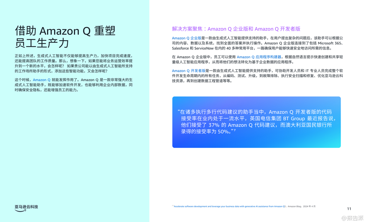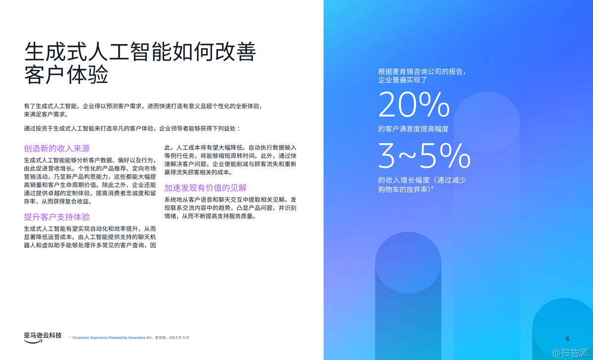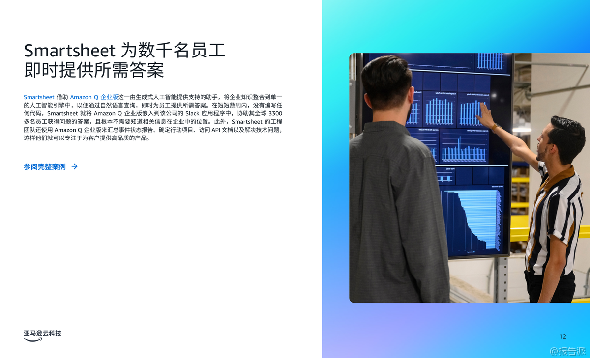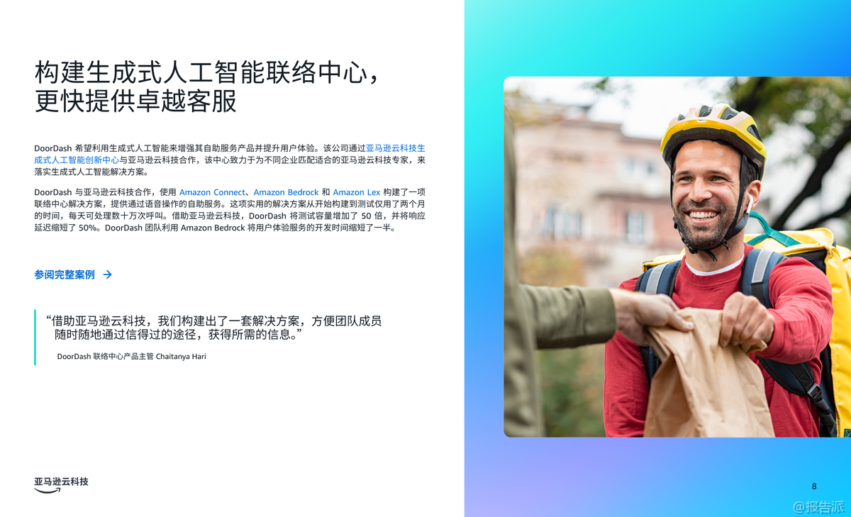 | 生成式人工智能(Generative AI)正在深刻重塑企业的运营模式,尤其在客户体验、员工生产力和流程优化三大核心领域展现出巨大的商业价值。 根据亚马逊云科技发布的《商业环境三大前沿生成式人工智能应用场景》报告,越来越多的企业正通过战略性部署生成式AI,实现效率跃升与业务增长。 Gartner预测,到2026年,80%的企业将已部署生成式AI应用,但同时也警示,高达30%的项目可能因数据质量、风险管控或价值不明确而在概念验证阶段夭折。 因此,选择正确的应用场景成为企业成功落地AI的关键。 报告指出,企业应优先聚焦能带来显著影响且风险可控的试点项目,尤其是那些能够快速呈现投资回报率(ROI)的内部流程或员工赋能场景。 通过设定清晰的KPI基准,企业不仅能衡量成效,更能积累经验,推动后续规模化应用。 报告重点提炼出三大已被验证的高价值应用场景。 第一大场景是“改善客户体验”。 生成式AI可通过个性化内容推荐、动态产品描述生成和智能对话系统,打造高度定制化的客户旅程。 Amazon Connect结合Amazon Q in Connect,可在联络中心实时分析客户对话,为座席提供处置建议,提升服务效率与满意度。 典型案例如DoorDash,通过整合Amazon Connect、Bedrock和Lex,构建语音自助服务系统,仅用两个月完成开发,日均处理数十万次呼叫,响应延迟降低50%,显著优化用户体验。 第二大场景是“提高员工生产力”。 生成式AI助手如Amazon Q企业版和开发者版,能接入企业数据系统,通过自然语言交互快速解答员工问题、生成报告、辅助代码开发等。 Smartsheet将Amazon Q嵌入Slack,使3300多名员工无需知晓数据位置即可获取信息;拜耳作物科学借助Amazon Q将新员工上手时间缩短70%,开发效率提升30%;而亚马逊自身通过Amazon Q开发者版完成Java 17升级,原本需50人日的工作压缩至几小时,年化效率增益达2.6亿美元。 第三大场景是“加快流程优化”。 针对大量纸质文档处理的痛点,亚马逊云科技智能文档处理(IDP)结合OCR、NLP与生成式AI,可自动分类、提取、验证并生成洞察报告。 Legal & General利用Amazon Textract构建Docusort系统,30分钟处理1000份文档,释放人力投入更高价值工作;纳斯达克则基于Amazon Bedrock构建Sustainable Lens平台,自动化分析ESG非结构化数据,大幅提升客户合规与对标效率。 综上,该报告为企业提供了清晰的生成式AI落地路径图——从客户、员工到流程,层层推进,务实求效。 依托亚马逊云科技的一站式AI服务,企业可加速创新,构建可持续竞争优势。 出品方:亚马逊云科技 发布时间:2025年 文档页数:20页