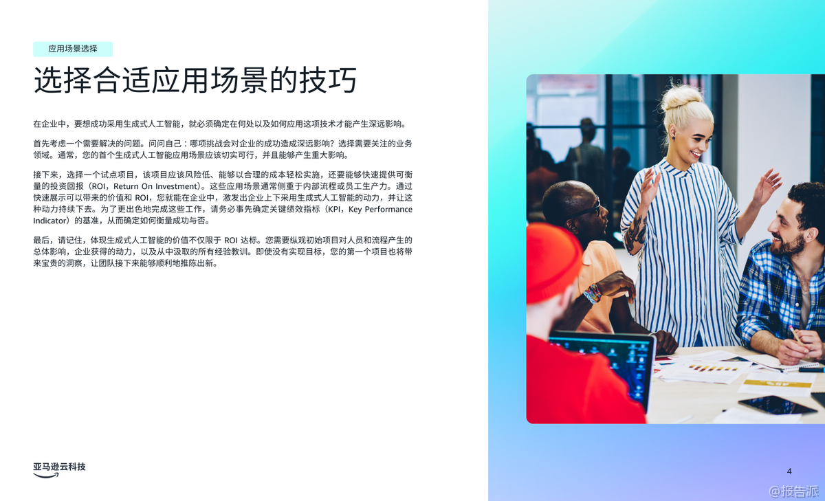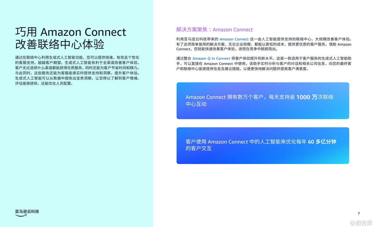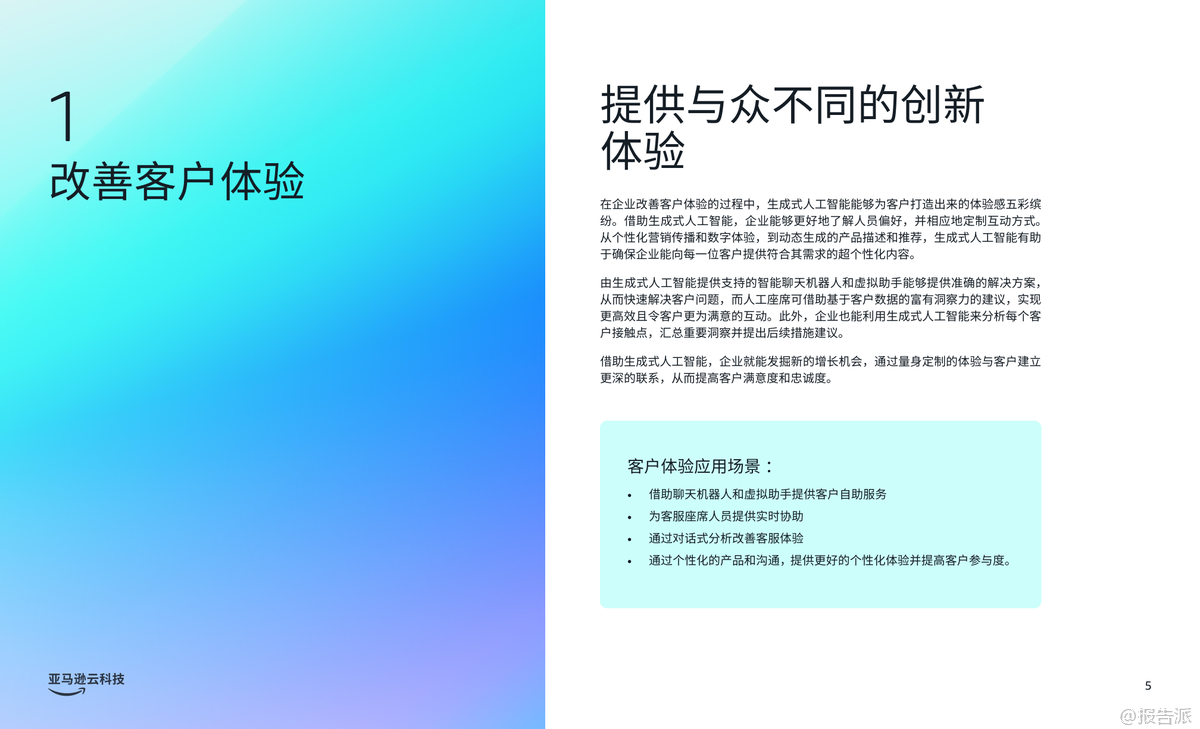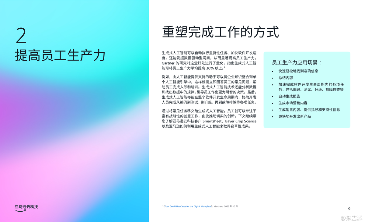 | 生成式人工智能(Generative AI)正在深刻重塑企业的运营模式,尤其在客户体验、员工生产力和流程优化三大核心领域展现出巨大的商业价值。 根据亚马逊云科技发布的《商业环境三大前沿生成式人工智能应用场景》报告,越来越多的企业正通过战略性部署生成式AI,实现效率跃升与业务增长。 Gartner预测,到2026年,80%的企业将已部署生成式AI应用,但同时也警示,高达30%的项目可能因数据质量、风险管控或价值不明确而在概念验证阶段夭折。 因此,选择正确的应用场景成为企业成功落地AI的关键。 报告指出,企业应优先聚焦能带来显著影响且风险可控的试点项目,尤其是那些能够快速呈现投资回报率(ROI)的内部流程或员工赋能场景。 通过设定清晰的KPI基准,企业不仅能衡量成效,更能积累经验,推动后续规模化应用。 报告重点提炼出三大已被验证的高价值应用场景。 第一大场景是“改善客户体验”。 生成式AI可通过个性化内容推荐、动态产品描述生成和智能对话系统,打造高度定制化的客户旅程。 Amazon Connect结合Amazon Q in Connect,可在联络中心实时分析客户对话,为座席提供处置建议,提升服务效率与满意度。 典型案例如DoorDash,通过整合Amazon Connect、Bedrock和Lex,构建语音自助服务系统,仅用两个月完成开发,日均处理数十万次呼叫,响应延迟降低50%,显著优化用户体验。 第二大场景是“提高员工生产力”。 生成式AI助手如Amazon Q企业版和开发者版,能接入企业数据系统,通过自然语言交互快速解答员工问题、生成报告、辅助代码开发等。 Smartsheet将Amazon Q嵌入Slack,使3300多名员工无需知晓数据位置即可获取信息;拜耳作物科学借助Amazon Q将新员工上手时间缩短70%,开发效率提升30%;而亚马逊自身通过Amazon Q开发者版完成Java 17升级,原本需50人日的工作压缩至几小时,年化效率增益达2.6亿美元。 第三大场景是“加快流程优化”。 针对大量纸质文档处理的痛点,亚马逊云科技智能文档处理(IDP)结合OCR、NLP与生成式AI,可自动分类、提取、验证并生成洞察报告。 Legal & General利用Amazon Textract构建Docusort系统,30分钟处理1000份文档,释放人力投入更高价值工作;纳斯达克则基于Amazon Bedrock构建Sustainable Lens平台,自动化分析ESG非结构化数据,大幅提升客户合规与对标效率。 综上,该报告为企业提供了清晰的生成式AI落地路径图——从客户、员工到流程,层层推进,务实求效。 依托亚马逊云科技的一站式AI服务,企业可加速创新,构建可持续竞争优势。 出品方:亚马逊云科技 发布时间:2025年 文档页数:20页