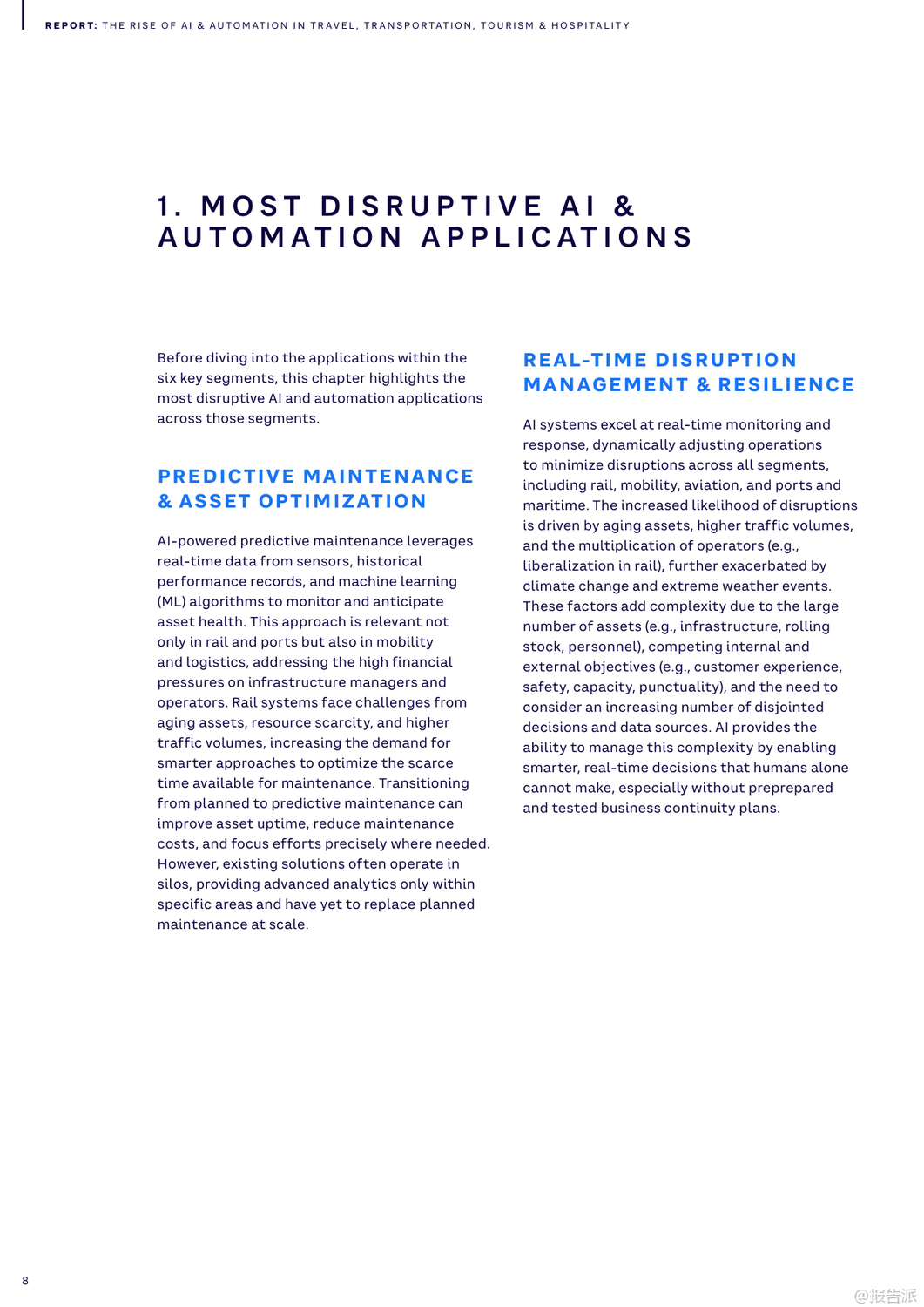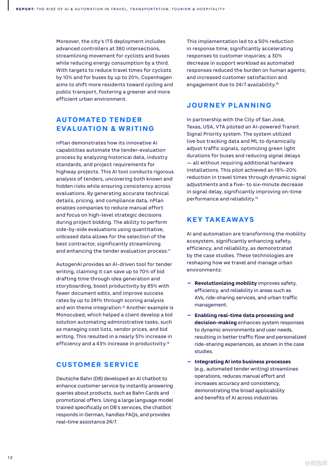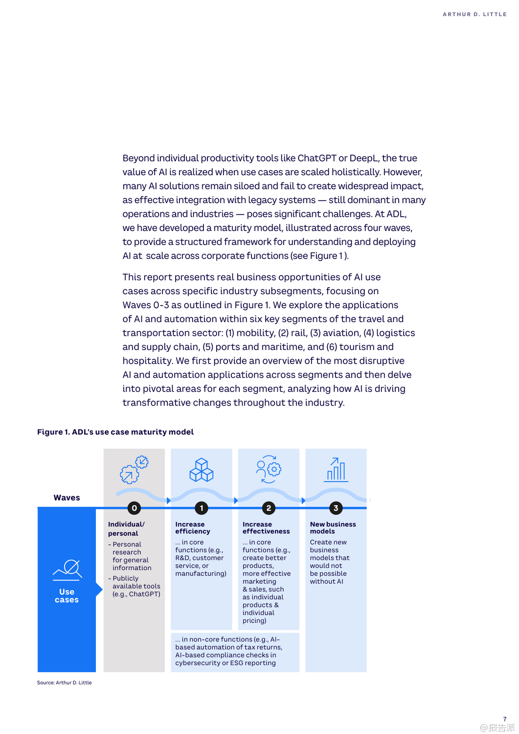 | 随着人工智能(AI)与自动化技术的迅猛发展,全球旅行、交通、旅游及酒店业正经历一场深刻的数字化变革。 这份由Arthur D. Little(ADL)发布的《2025年人工智能和自动化在旅行、交通、旅游和酒店业的兴起》报告,系统梳理了AI在六大核心领域的应用场景、实际案例与未来挑战,揭示了行业从疫情恢复后向智能化、个性化与可持续化转型的关键路径。 报告指出,AI已超越效率工具的角色,成为推动商业模式创新的核心驱动力。 尽管98%的企业已启动AI项目,但仅有13%具备全面战略,凸显出规模化落地的巨大鸿沟。 为此,ADL提出四波AI成熟度模型,强调企业需从个人效率提升迈向核心业务重构与新商业模式创造。 在出行领域,Waymo通过LiDAR与深度学习实现自动驾驶安全提升,其Waymo One服务已在多地运营;Uber与Lyft则利用AI动态定价与路径优化,显著提高供需匹配效率。 城市层面,哥本哈根借助AI信号控制系统减少25%通勤时间,展现智慧交通的巨大潜力。 铁路系统迎来智能化升级。 德铁(DB)投入6000万美元引入AI视觉检测系统E-Check,5分钟内完成列车巡检,维护效率提升25%。 JR东日本的ATOS系统实现列车自主调度,故障恢复提速40分钟。 港铁(MTR)部署TIDS障碍物识别系统,可在300米外预警风险,大幅提升运行安全。 航空业聚焦运营优化与旅客体验。 汉莎航空AI系统为调度员提供90%采纳率的航班调整建议,有效降低燃油消耗。 美国航空通过客户画像实现精准推荐与自动客服,60%咨询由AI处理。 新加坡樟宜机场启用生物识别通关,平均过检时间从25秒降至10秒,实现“无护照通行”。 物流与供应链加速自动化进程。 DHL与AutoStore合作使Puma仓库效率提升92%,订单准确率达99%。 亚马逊Prime Air无人机实现一小时内配送,虽受限于载重仍具前瞻意义。 UPS的DeliveryDefense系统通过地址风险评分,将包裹丢失率降低40%,同时防范退货欺诈。 港口与海运方面,青岛港全自动码头年吞吐量达150万标箱,设备调度效率提升四倍;厦门远海码头借助5G+AI将配载计划时间从1小时压缩至5分钟。 马士基与美国海军均采用AI预测性维护,提前发现设备隐患,延长资产寿命。 酒店旅游业同样迎来AI革新。 希尔顿的虚拟助手Connie可处理80%宾客问询,赋能员工专注高价值服务。 Duetto与IDeaS的动态定价系统帮助酒店实时调价,最大化收益管理。 Booking.com推出AI行程规划器,支持对话式交互与动态推荐,重塑预订体验。 然而,报告也警示五大挑战:老旧系统集成难、网络安全威胁上升、岗位替代引发的社会问题、伦理决策困境以及高昂成本导致的数字鸿沟。 对此,ADL建议企业开展AI成熟度评估、强化数据基建、构建人机协同机制,并平衡采购与自研策略。 总体而言,2025年将是AI从单点突破走向系统整合的关键年。 唯有将技术深度融入战略顶层设计,才能真正释放智能时代的增长红利。 出品方:ADL 发布时间:2025年 文档页数:40页