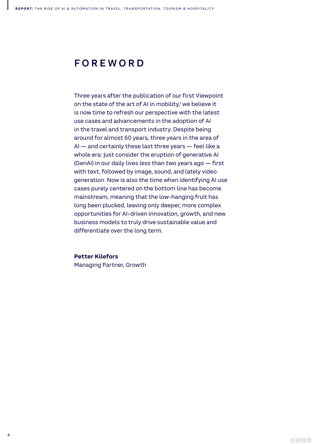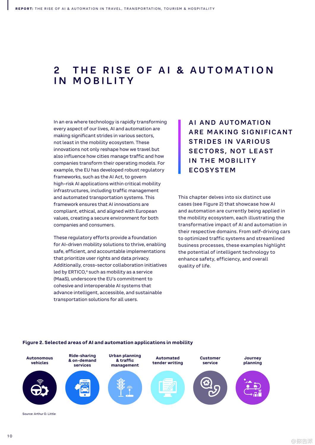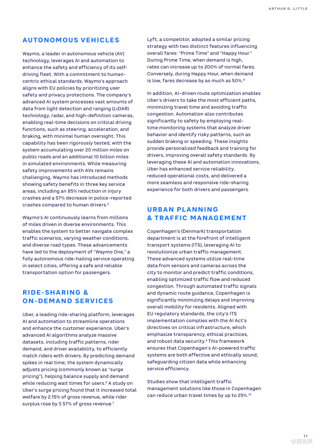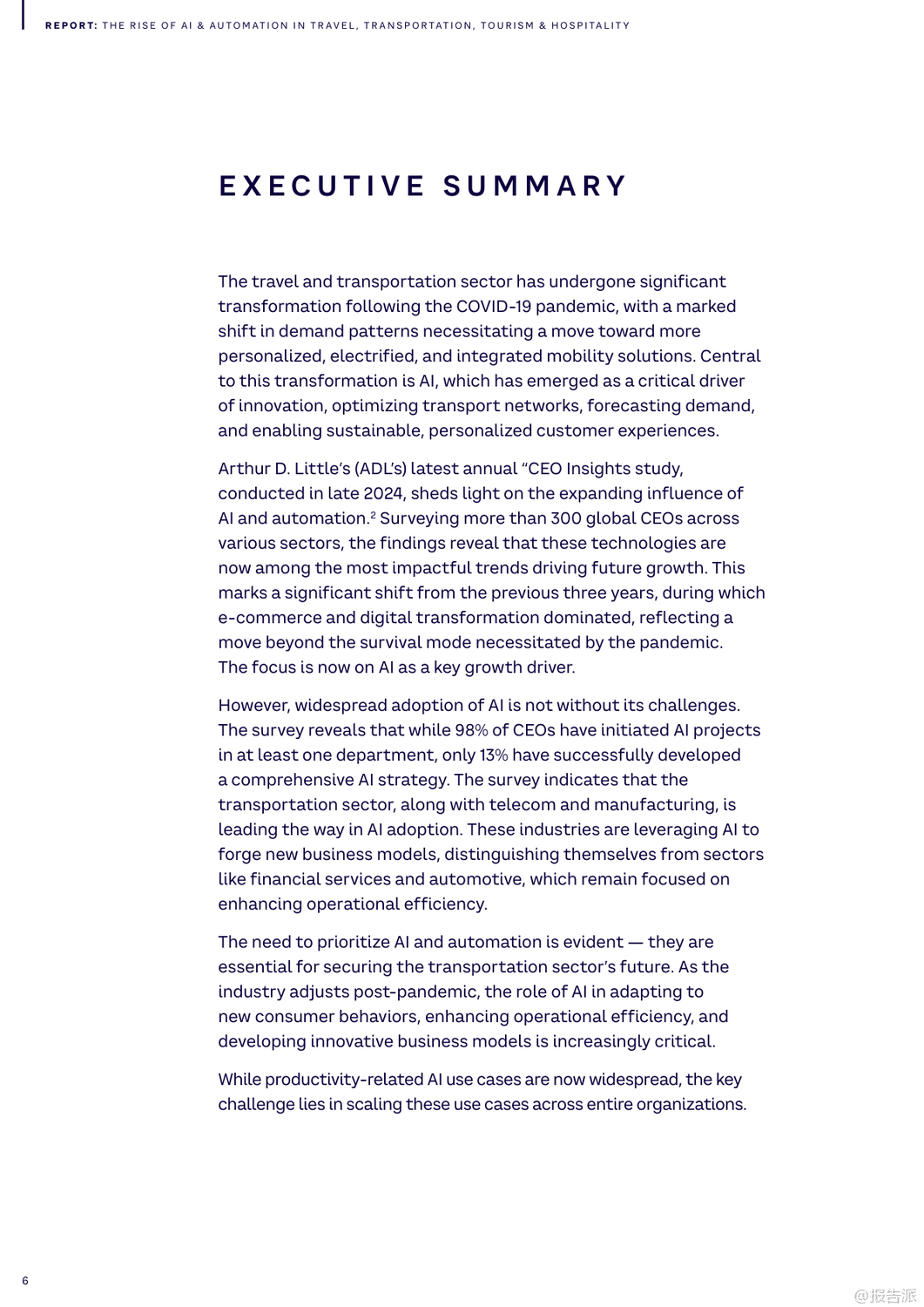 | 随着人工智能(AI)与自动化技术的迅猛发展,全球旅行、交通、旅游及酒店业正经历一场深刻的数字化变革。 这份由Arthur D. Little(ADL)发布的《2025年人工智能和自动化在旅行、交通、旅游和酒店业的兴起》报告,系统梳理了AI在六大核心领域的应用场景、实际案例与未来挑战,揭示了行业从疫情恢复后向智能化、个性化与可持续化转型的关键路径。 报告指出,AI已超越效率工具的角色,成为推动商业模式创新的核心驱动力。 尽管98%的企业已启动AI项目,但仅有13%具备全面战略,凸显出规模化落地的巨大鸿沟。 为此,ADL提出四波AI成熟度模型,强调企业需从个人效率提升迈向核心业务重构与新商业模式创造。 在出行领域,Waymo通过LiDAR与深度学习实现自动驾驶安全提升,其Waymo One服务已在多地运营;Uber与Lyft则利用AI动态定价与路径优化,显著提高供需匹配效率。 城市层面,哥本哈根借助AI信号控制系统减少25%通勤时间,展现智慧交通的巨大潜力。 铁路系统迎来智能化升级。 德铁(DB)投入6000万美元引入AI视觉检测系统E-Check,5分钟内完成列车巡检,维护效率提升25%。 JR东日本的ATOS系统实现列车自主调度,故障恢复提速40分钟。 港铁(MTR)部署TIDS障碍物识别系统,可在300米外预警风险,大幅提升运行安全。 航空业聚焦运营优化与旅客体验。 汉莎航空AI系统为调度员提供90%采纳率的航班调整建议,有效降低燃油消耗。 美国航空通过客户画像实现精准推荐与自动客服,60%咨询由AI处理。 新加坡樟宜机场启用生物识别通关,平均过检时间从25秒降至10秒,实现“无护照通行”。 物流与供应链加速自动化进程。 DHL与AutoStore合作使Puma仓库效率提升92%,订单准确率达99%。 亚马逊Prime Air无人机实现一小时内配送,虽受限于载重仍具前瞻意义。 UPS的DeliveryDefense系统通过地址风险评分,将包裹丢失率降低40%,同时防范退货欺诈。 港口与海运方面,青岛港全自动码头年吞吐量达150万标箱,设备调度效率提升四倍;厦门远海码头借助5G+AI将配载计划时间从1小时压缩至5分钟。 马士基与美国海军均采用AI预测性维护,提前发现设备隐患,延长资产寿命。 酒店旅游业同样迎来AI革新。 希尔顿的虚拟助手Connie可处理80%宾客问询,赋能员工专注高价值服务。 Duetto与IDeaS的动态定价系统帮助酒店实时调价,最大化收益管理。 Booking.com推出AI行程规划器,支持对话式交互与动态推荐,重塑预订体验。 然而,报告也警示五大挑战:老旧系统集成难、网络安全威胁上升、岗位替代引发的社会问题、伦理决策困境以及高昂成本导致的数字鸿沟。 对此,ADL建议企业开展AI成熟度评估、强化数据基建、构建人机协同机制,并平衡采购与自研策略。 总体而言,2025年将是AI从单点突破走向系统整合的关键年。 唯有将技术深度融入战略顶层设计,才能真正释放智能时代的增长红利。 出品方:ADL 发布时间:2025年 文档页数:40页