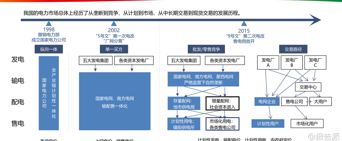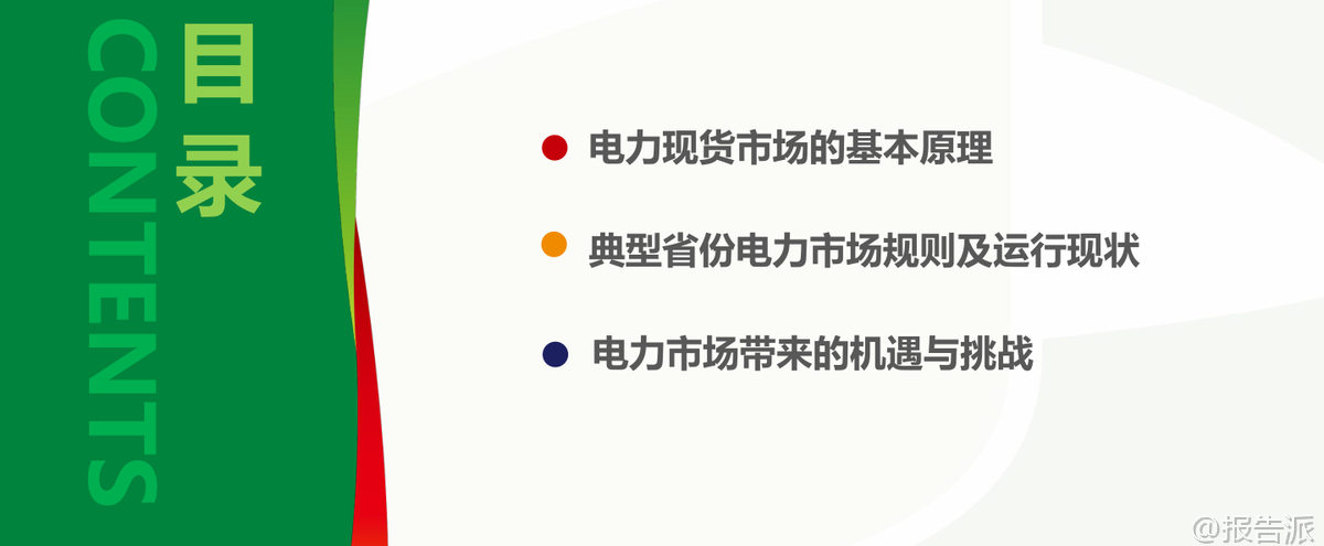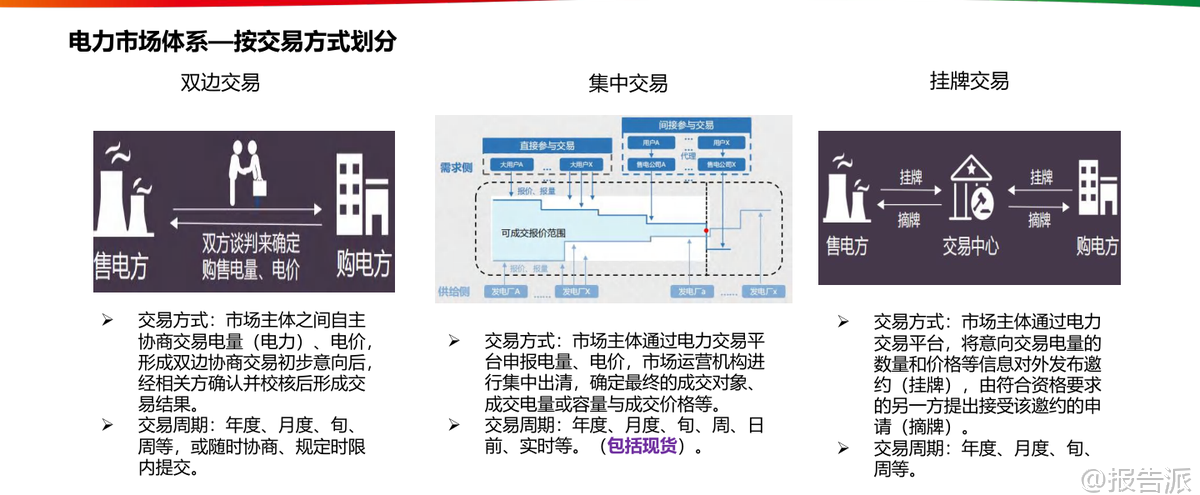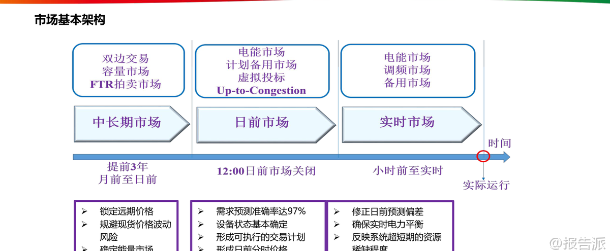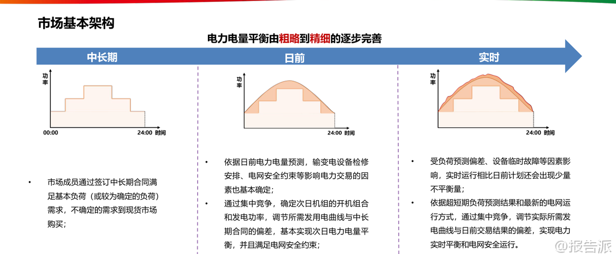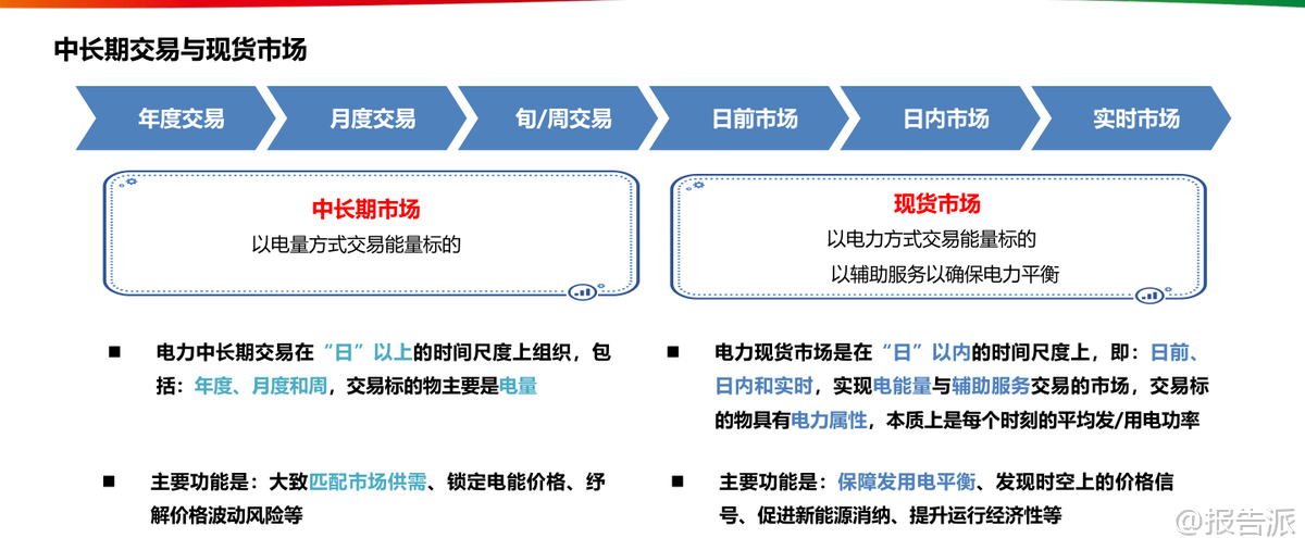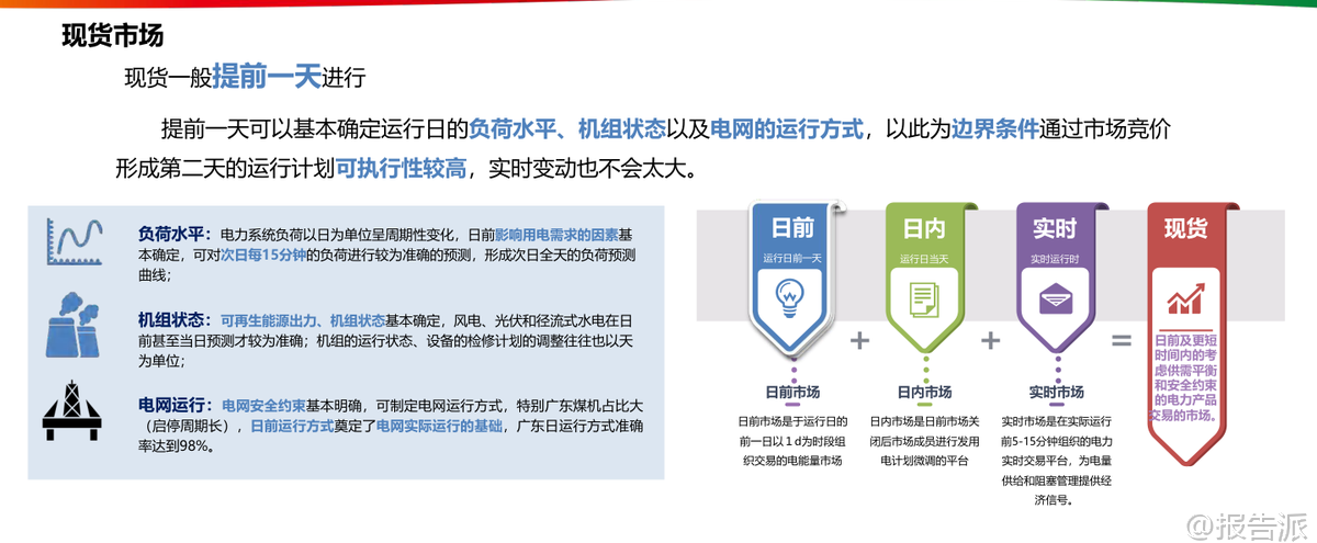 | 电力现货市场作为我国电力体制改革的核心环节,正在深刻重塑能源行业的运行逻辑与商业模式。 这份由国家电投发布的《电力现货市场的基本原理及其带来的挑战》报告系统梳理了当前中国电力市场的发展脉络、核心机制与未来趋势,为理解新型电力系统的构建路径提供了权威视角。 我国电力市场经历了从垄断到竞争、从计划到市场的重大转型。 1998年撤销电力部成立国家电力公司,2002年“厂网分离”启动第一次电改,2015年“9号文”推动售电侧放开,标志着电力市场化改革进入深水区。 当前市场结构已形成发电、输电、配电、售电四环节分离的格局,市场主体包括五大发电集团、各类社会资本电厂以及国家电网、南方电网等输配企业。 在这一背景下,电力现货市场应运而生,成为发现电力商品时空价值的关键机制。 电力现货市场本质上是在“日”以内时间尺度上组织的电能量与辅助服务交易,主要包括日前、日内和实时三个层级。 其中,日前市场提前一天运行,基于较为准确的负荷预测、机组状态和电网安全约束,通过集中竞价形成次日96点(每15分钟一个时段)的机组开机组合与发电曲线;实时市场则在实际运行前5-15分钟滚动出清,修正偏差并确保电力实时平衡。 这种“中长期+现货”的双轨制架构中,中长期合同主要用于锁定价格、规避风险,而现货市场负责实现全电量集中优化调度,二者通过差价合约机制衔接——当现货价格高于合约价时卖方向买方支付差额,反之亦然。 报告特别强调节点边际电价(LMP)机制的重要性。 LMP由系统能量价格、输电阻塞成本和网络损耗成本构成,能够精准反映电力在不同时间和空间上的稀缺程度。 广东、山西、山东等集中式市场均已采用或试点该机制,用户侧结算则多采用全省加权平均价以降低波动性。 这种价格信号不仅引导短期用电行为,更在长期内为电网投资与电源布局提供经济激励。 典型省份的实践展现了多元化的市场探索。 广东构建了“中长期差价为主+现货偏差结算为补充”的全电量竞争模式,2023年全社会用电量达8502亿千瓦时,供需比平均1.79,市场结构属低集中寡占型。 山西明确虚拟电厂可作为独立主体参与交易,要求调节能力不低于10兆瓦。 山东则大力推动新型储能入市,现有27家独立储能设施全部参与市场,收益来源涵盖新能源租赁、现货套利与容量补偿。 四川因水电主导实行丰枯双期市场,蒙西更是国内首个取消日前市场、直接采用“预出清+实时”模式的地区,并首次将居民、农业和外送电全面纳入现货结算。 新能源大规模接入正带来结构性变革。 预计2024年我国新能源装机将达13.7亿千瓦,占总装机41.3%,发电量贡献率超53%。 但其波动性也导致系统调节需求激增,2023年上半年辅助服务费用达278亿元,占上网电费1.9%,其中调峰补偿占比高达60%。 火电机组虽发电比例下降,却转型为主要调节资源,获得91.4%的辅助服务补偿。 与此同时,高比例新能源压低边际电价的趋势显现,山东曾出现连续22小时负电价,加州与德国也频现负价时段。 面对新挑战,报告提出六大应对思路:一是研究绿电交易政策,把握市场化消纳机遇;二是挖掘省间通道潜力,拓展跨区交易空间;三是提升负荷与新能源出力预测精度,降低申报偏差风险;四是发展虚拟电厂运营策略,聚合分布式资源参与市场;五是优化“光伏+储能+负荷”一体化运行模式,提升自平衡能力;六是构建AI驱动的自动交易决策系统,实现多时间尺度的智能申报与风险控制。 总体来看,电力现货市场不仅是价格形成的场所,更是推动能源清洁低碳转型的关键制度设计。 它倒逼传统电源向灵活性调节转变,激发新型储能与需求响应等新业态发展,并促使分布式光伏通过聚合商形式融入主网体系。 随着市场机制持续完善,电力将真正作为一种具有时空属性的商品,在全国统一电力市场体系下实现高效配置,为碳达峰、碳中和目标提供坚实支撑。 本文由【报告派】研读,输出观点仅作为行业分析! 原文标题:2026-03-09-国家电投-电力行业:电力现货市场的基本原理及其带来的挑战 发布时间:2022年 出品方:国家电投 文档页数:48页