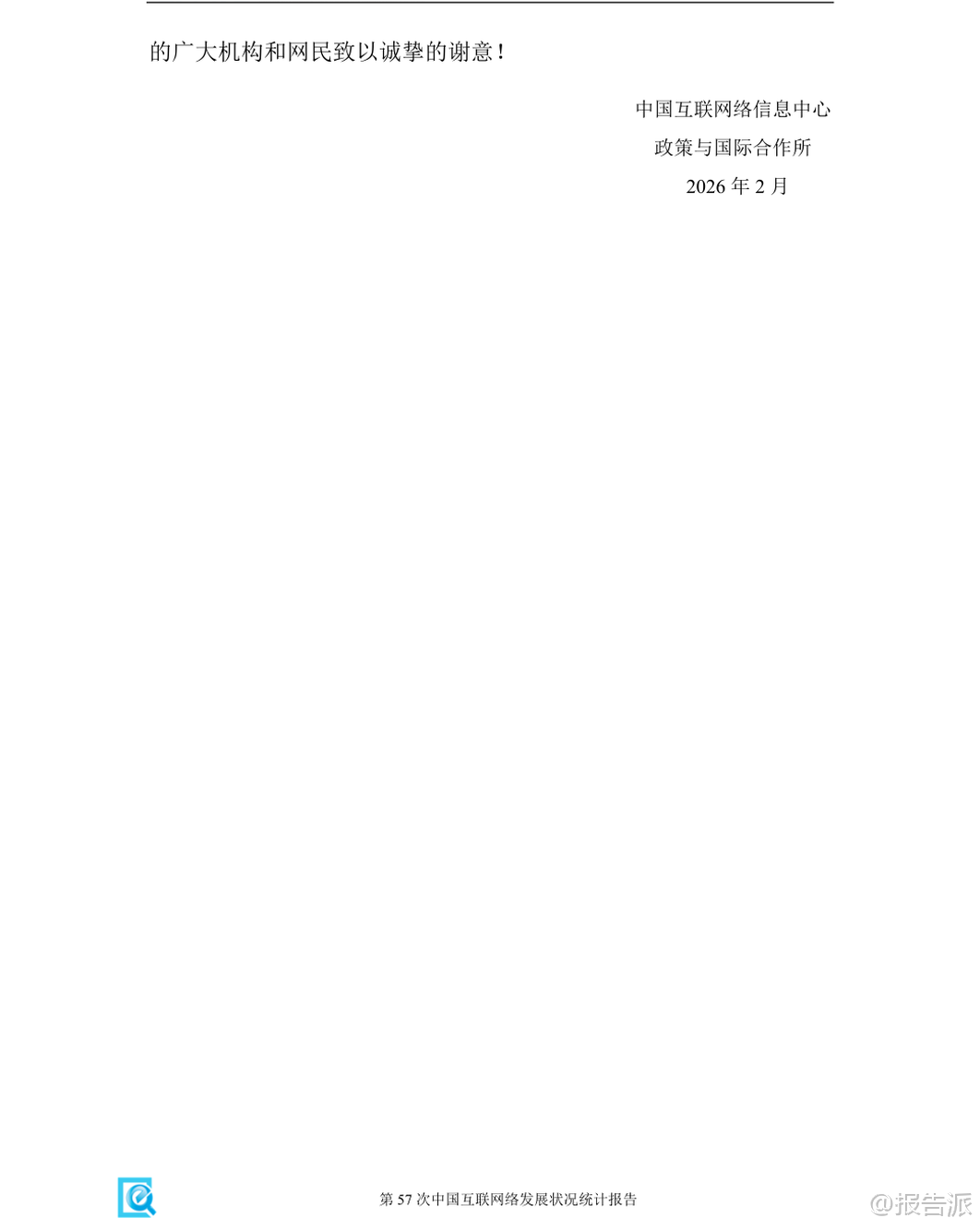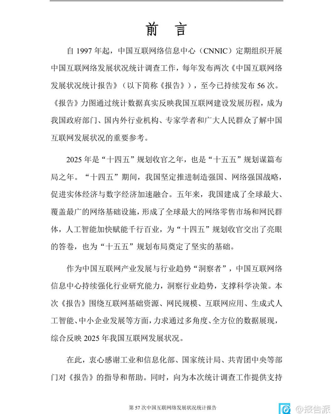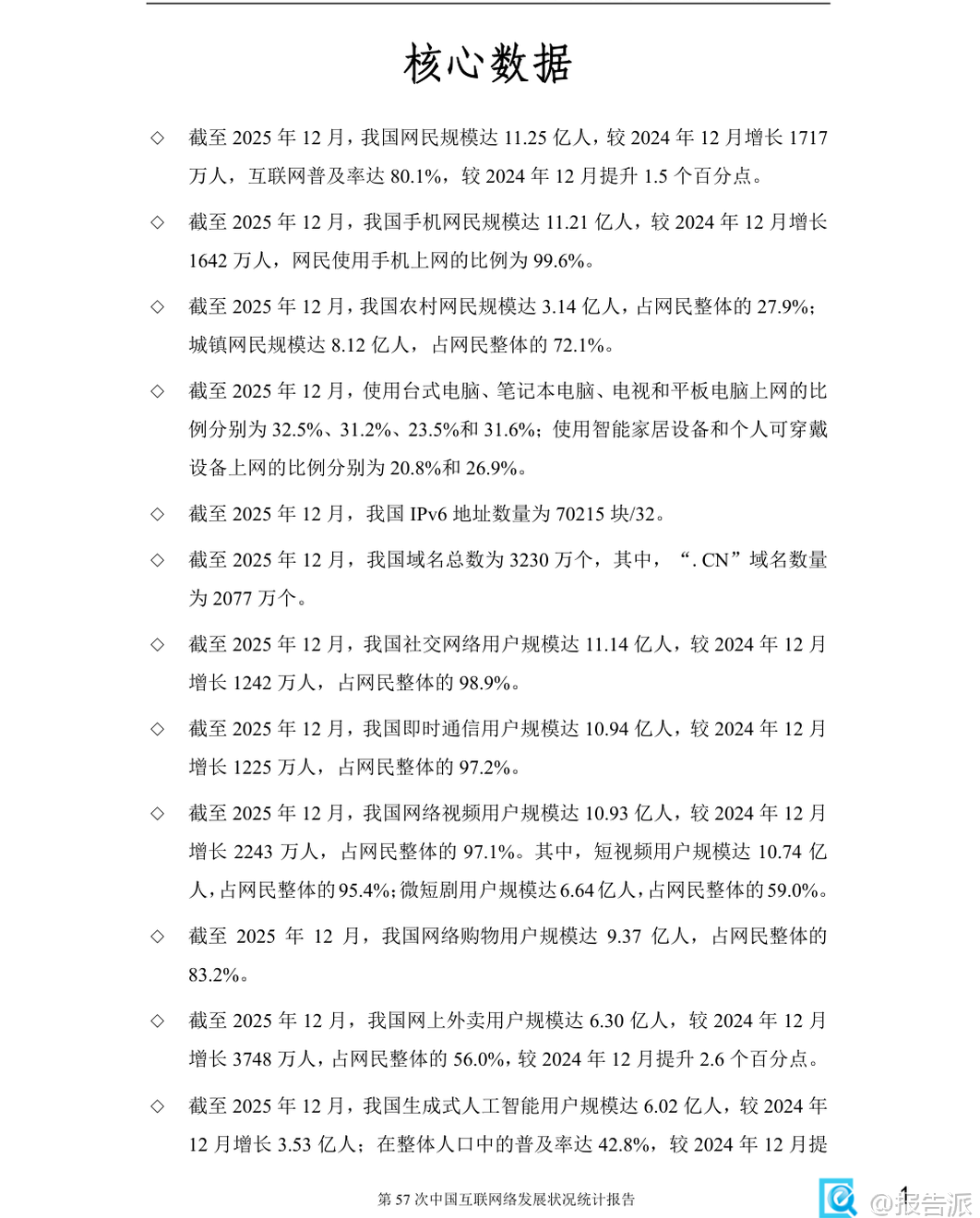 | 《第57次中国互联网络发展状况统计报告》由中国互联网络信息中心(CNNIC)于2026年2月发布,全面呈现了截至2025年12月我国互联网发展的最新图景。 作为“十四五”规划收官之年的重要数据总结,该报告不仅记录了基础设施的持续完善,更深刻揭示了人工智能与实体经济深度融合所带来的结构性变革。 在基础资源方面,我国已建成全球规模最大、覆盖最广的信息通信网络。 截至2025年底,5G基站总数达483.8万个,占移动基站总数的37.6%,实现了“县县通千兆、乡乡通5G、村村通宽带”的历史性目标。 IPv6地址数量达到70215块/32,活跃用户数高达8.5亿,标志着我国在下一代互联网技术布局上取得决定性进展。 与此同时,光缆线路总长度突破7499万公里,为数字中国的高质量发展提供了坚实的“大动脉”。 网民规模稳步增长,普及程度再创新高。 报告数据显示,截至2025年12月,我国网民规模已达11.25亿人,互联网普及率攀升至80.1%。 其中,手机网民占比高达99.6%,显示出移动端已成为绝对主流。 值得注意的是,城乡数字鸿沟进一步缩小,农村网民规模达3.14亿,占整体网民的27.9%;农村地区互联网普及率提升至69.5%,较上年提高2.2个百分点。 这得益于十年来电信普遍服务政策的持续推进,累计支持超13万个行政村光纤建设和10万个4G/5G基站建设,有效弥合了接入能力差距。 各类互联网应用蓬勃发展,应用场景不断深化。 即时通信和社交网络用户规模分别达到10.94亿和11.14亿,渗透率均超过97%,依然是国民级应用。 网络视频用户规模达10.93亿,其中短视频用户达10.74亿,微短剧用户也突破6.64亿,内容形态日益丰富。 数字消费持续升温,网络购物用户达9.37亿,网上外卖用户激增至6.30亿,同比增长6.3%。 网约车、在线医疗、在线教育等服务类应用也在加速渗透,分别为用户提供便捷出行、远程问诊和智慧学习的新选择。 本年度报告的最大亮点在于生成式人工智能(AIGC)的爆发式增长。 截至2025年底,我国生成式AI用户规模达6.02亿人,普及率从2024年的17.6%跃升至42.8%,半年内增长近25个百分点,堪称“现象级”普及。 用户使用目的以回答问题(76.0%)、生成图片/视频(47.8%)和处理文本(37.6%)为主。 APP是主要使用载体,使用率达86.0%。 投融资方面同样火热,全年披露AI相关投融资事件1534起,金额约1528.85亿元,机器人领域成为投资热点。 AI正从“互联网+”迈向“人工智能+”,在科研、制造、农业、服务业等领域催生新模式新业态,如智能助手、AI眼镜、陪伴型机器人等产品不断涌现,推动产业智能化跃迁。 中小企业数字化转型稳步推进。 报告显示,全国登记在册中小企业数量达6469万户,其中微型企业占比73.6%。 东部地区集聚效应明显,广东、江苏、山东、浙江、河南五省合计占比超四成。 批发零售、租赁商务、科技服务、制造业和建筑业是中小企业主要分布领域。 业务实力方面,拥有专利或软件著作权的企业数量同比显著增长,逾四成企业采取线上线下融合经营模式,积极拓展线上渠道。 政务数字化水平全面提升。 在线政务服务用户规模达9.40亿人,占网民总数的83.5%。 全国一体化政务服务平台持续推进“高效办成一件事”,通过数据共享实现基层报表“只报一次”。 多地探索部署政务大模型,如深圳推出AI“数智员工”,公文审核效率提升90%。 政府网站集约化趋势加强,平台整合与标准规范建设不断完善,电子印章互认、政务服务码等国家标准陆续出台,助力打造更加智能、高效的数字政府。 总体而言,2025年中国互联网发展呈现出“基建领先、应用深化、智能跃迁”的鲜明特征。 随着人工智能技术的普惠化落地,我国正从网络大国向网络强国、智能社会加速迈进,为经济社会高质量发展注入强劲动能。 本文由【报告派】研读,输出观点仅作为行业分析! 原文标题:第57次中国互联网络发展状况统计报告 发布时间:2026年 出品方:CNNIC 文档页数:74页