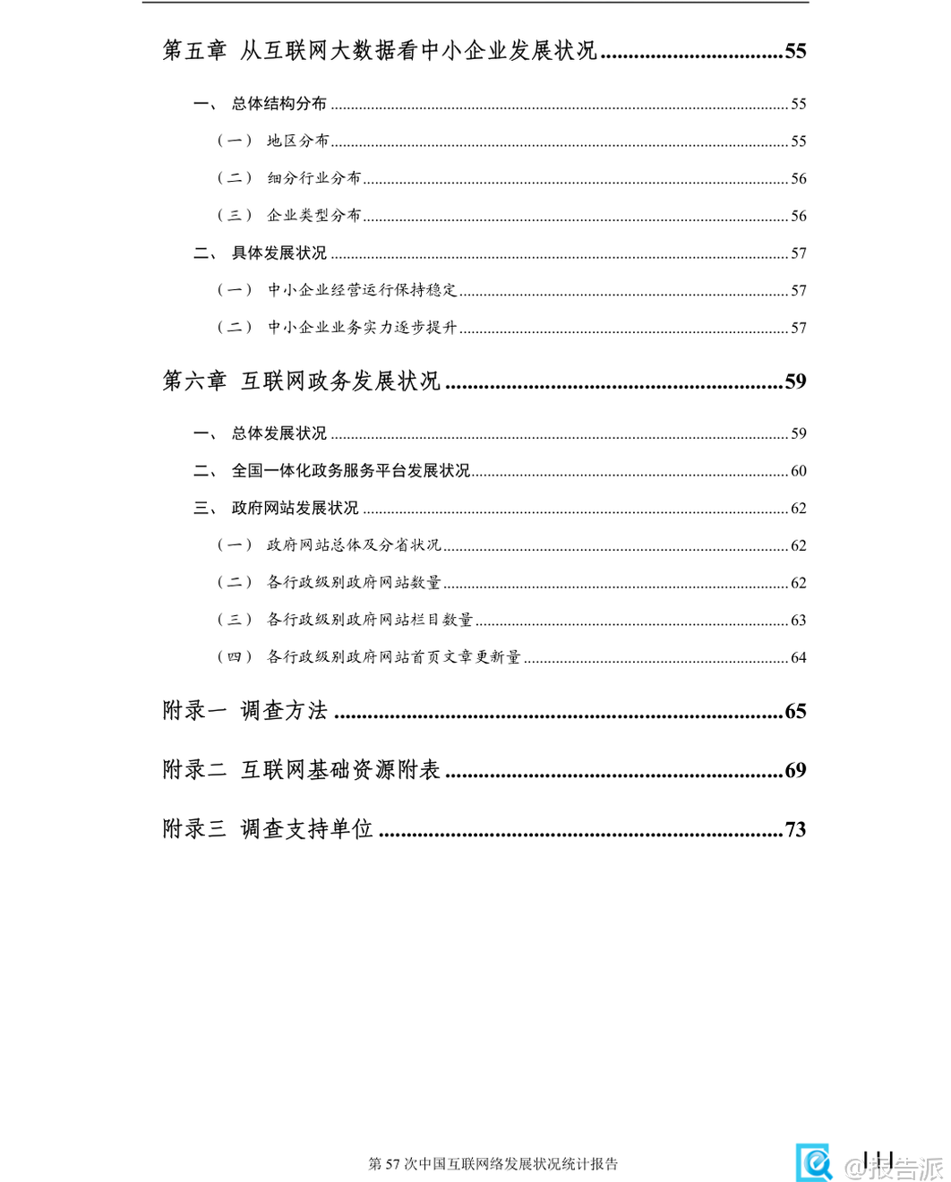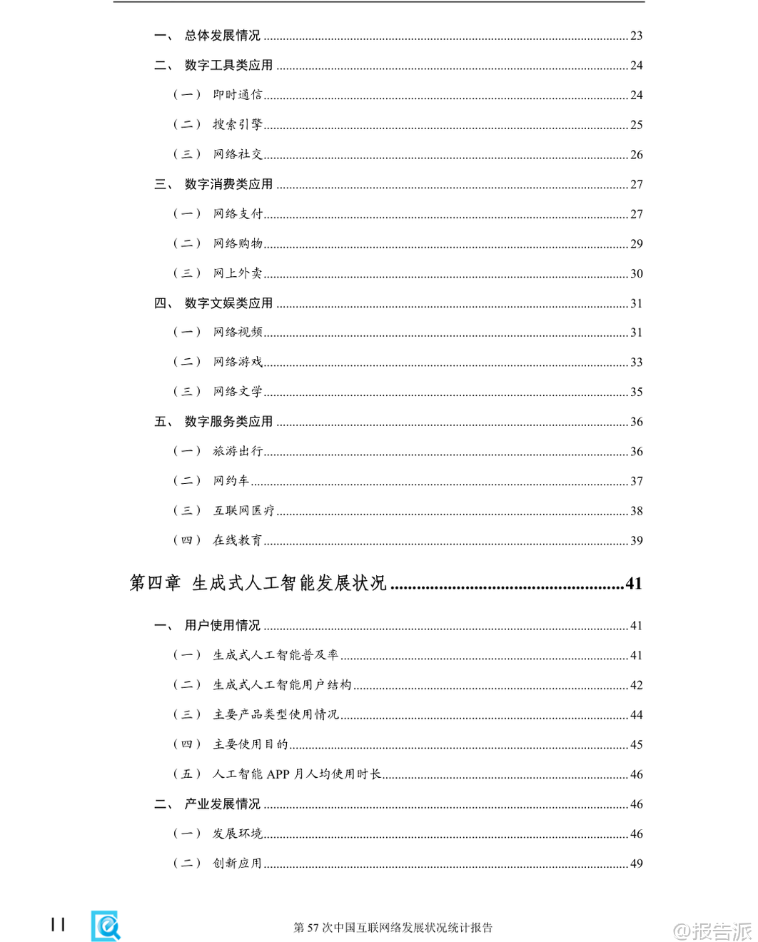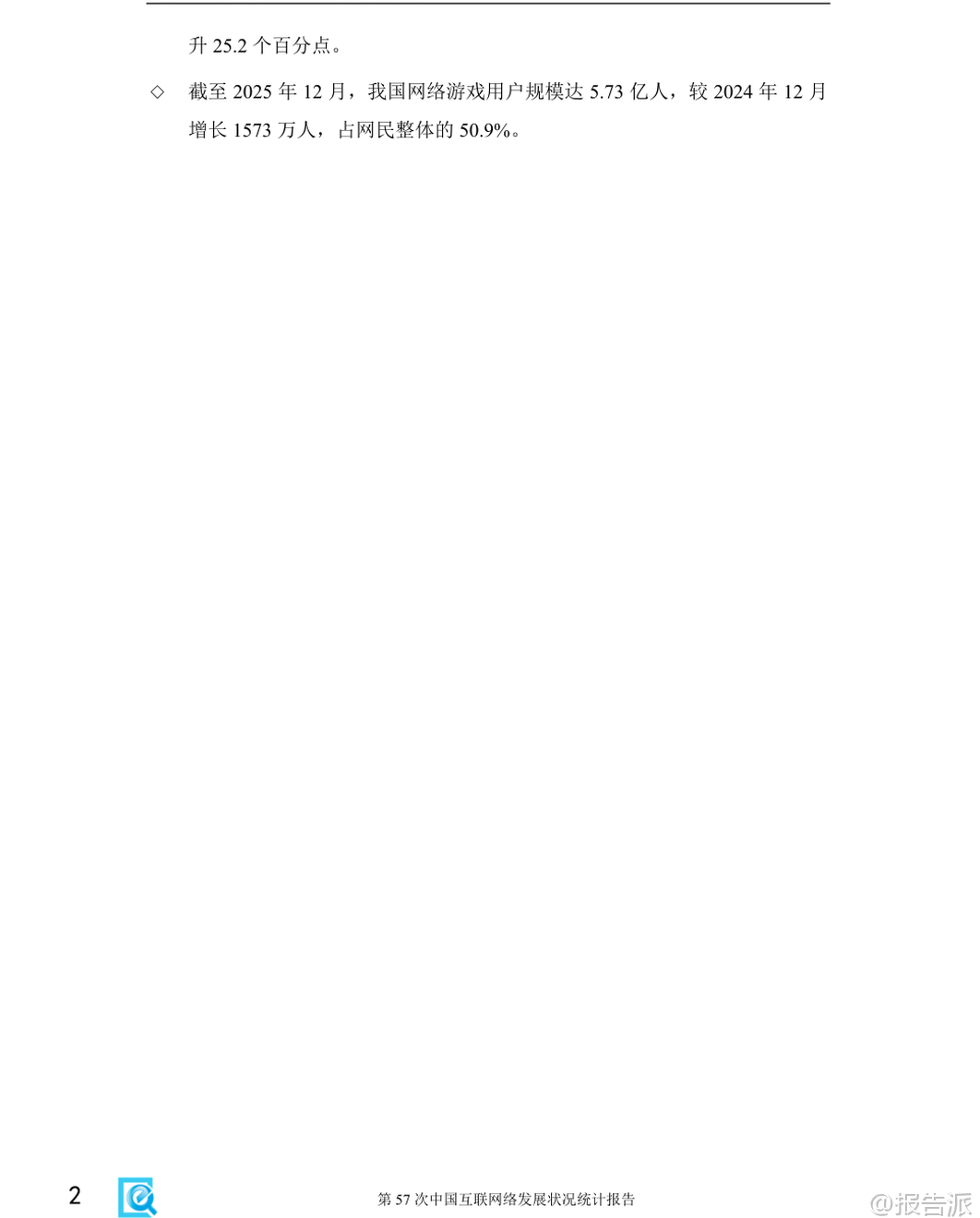 | 《第57次中国互联网络发展状况统计报告》由中国互联网络信息中心(CNNIC)于2026年2月发布,全面呈现了截至2025年12月我国互联网发展的最新图景。 作为“十四五”规划收官之年的重要数据总结,该报告不仅记录了基础设施的持续完善,更深刻揭示了人工智能与实体经济深度融合所带来的结构性变革。 在基础资源方面,我国已建成全球规模最大、覆盖最广的信息通信网络。 截至2025年底,5G基站总数达483.8万个,占移动基站总数的37.6%,实现了“县县通千兆、乡乡通5G、村村通宽带”的历史性目标。 IPv6地址数量达到70215块/32,活跃用户数高达8.5亿,标志着我国在下一代互联网技术布局上取得决定性进展。 与此同时,光缆线路总长度突破7499万公里,为数字中国的高质量发展提供了坚实的“大动脉”。 网民规模稳步增长,普及程度再创新高。 报告数据显示,截至2025年12月,我国网民规模已达11.25亿人,互联网普及率攀升至80.1%。 其中,手机网民占比高达99.6%,显示出移动端已成为绝对主流。 值得注意的是,城乡数字鸿沟进一步缩小,农村网民规模达3.14亿,占整体网民的27.9%;农村地区互联网普及率提升至69.5%,较上年提高2.2个百分点。 这得益于十年来电信普遍服务政策的持续推进,累计支持超13万个行政村光纤建设和10万个4G/5G基站建设,有效弥合了接入能力差距。 各类互联网应用蓬勃发展,应用场景不断深化。 即时通信和社交网络用户规模分别达到10.94亿和11.14亿,渗透率均超过97%,依然是国民级应用。 网络视频用户规模达10.93亿,其中短视频用户达10.74亿,微短剧用户也突破6.64亿,内容形态日益丰富。 数字消费持续升温,网络购物用户达9.37亿,网上外卖用户激增至6.30亿,同比增长6.3%。 网约车、在线医疗、在线教育等服务类应用也在加速渗透,分别为用户提供便捷出行、远程问诊和智慧学习的新选择。 本年度报告的最大亮点在于生成式人工智能(AIGC)的爆发式增长。 截至2025年底,我国生成式AI用户规模达6.02亿人,普及率从2024年的17.6%跃升至42.8%,半年内增长近25个百分点,堪称“现象级”普及。 用户使用目的以回答问题(76.0%)、生成图片/视频(47.8%)和处理文本(37.6%)为主。 APP是主要使用载体,使用率达86.0%。 投融资方面同样火热,全年披露AI相关投融资事件1534起,金额约1528.85亿元,机器人领域成为投资热点。 AI正从“互联网+”迈向“人工智能+”,在科研、制造、农业、服务业等领域催生新模式新业态,如智能助手、AI眼镜、陪伴型机器人等产品不断涌现,推动产业智能化跃迁。 中小企业数字化转型稳步推进。 报告显示,全国登记在册中小企业数量达6469万户,其中微型企业占比73.6%。 东部地区集聚效应明显,广东、江苏、山东、浙江、河南五省合计占比超四成。 批发零售、租赁商务、科技服务、制造业和建筑业是中小企业主要分布领域。 业务实力方面,拥有专利或软件著作权的企业数量同比显著增长,逾四成企业采取线上线下融合经营模式,积极拓展线上渠道。 政务数字化水平全面提升。 在线政务服务用户规模达9.40亿人,占网民总数的83.5%。 全国一体化政务服务平台持续推进“高效办成一件事”,通过数据共享实现基层报表“只报一次”。 多地探索部署政务大模型,如深圳推出AI“数智员工”,公文审核效率提升90%。 政府网站集约化趋势加强,平台整合与标准规范建设不断完善,电子印章互认、政务服务码等国家标准陆续出台,助力打造更加智能、高效的数字政府。 总体而言,2025年中国互联网发展呈现出“基建领先、应用深化、智能跃迁”的鲜明特征。 随着人工智能技术的普惠化落地,我国正从网络大国向网络强国、智能社会加速迈进,为经济社会高质量发展注入强劲动能。 本文由【报告派】研读,输出观点仅作为行业分析! 原文标题:第57次中国互联网络发展状况统计报告 发布时间:2026年 出品方:CNNIC 文档页数:74页