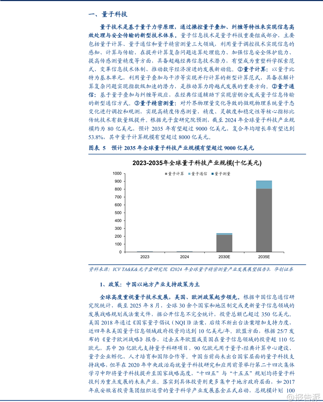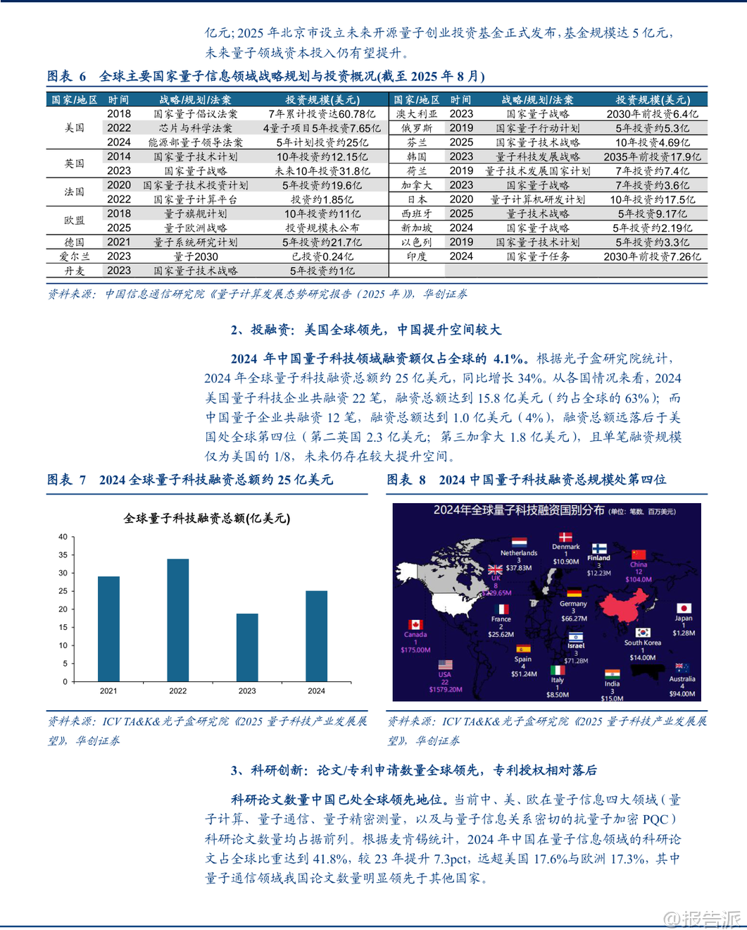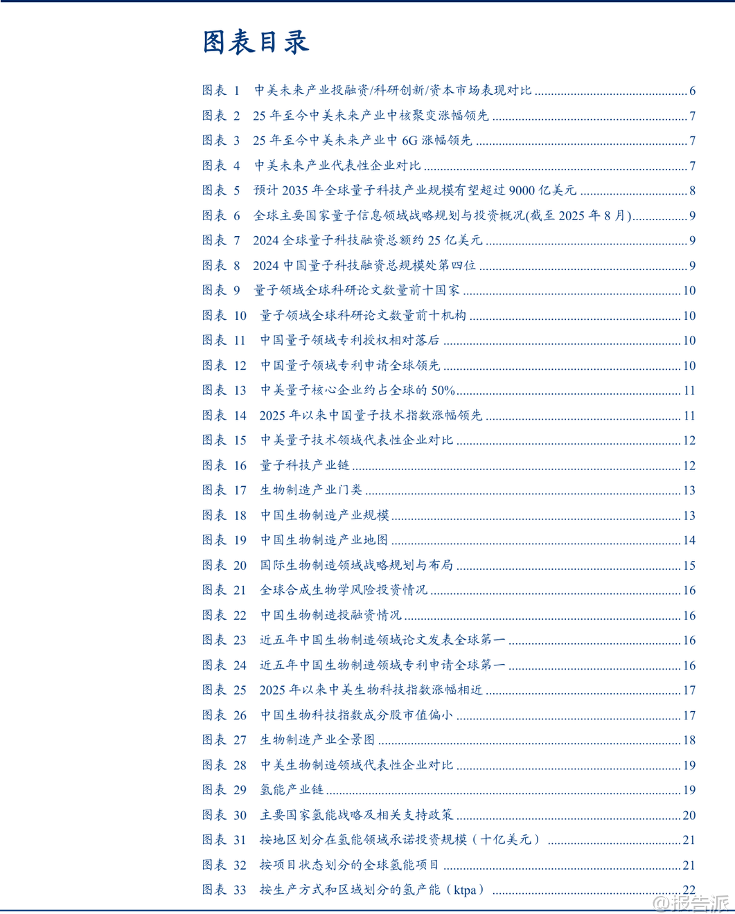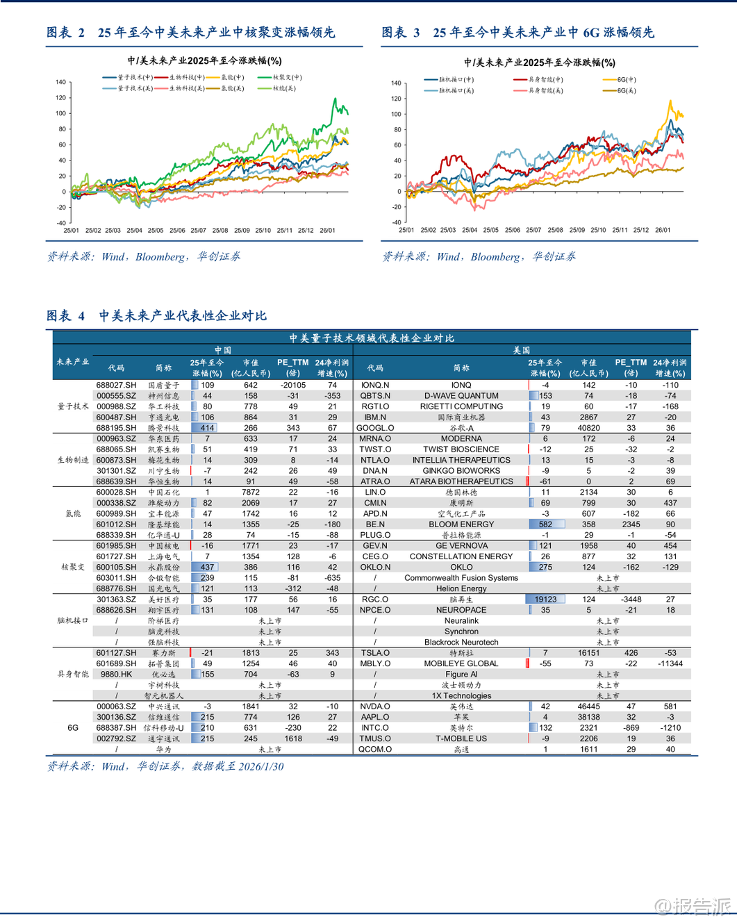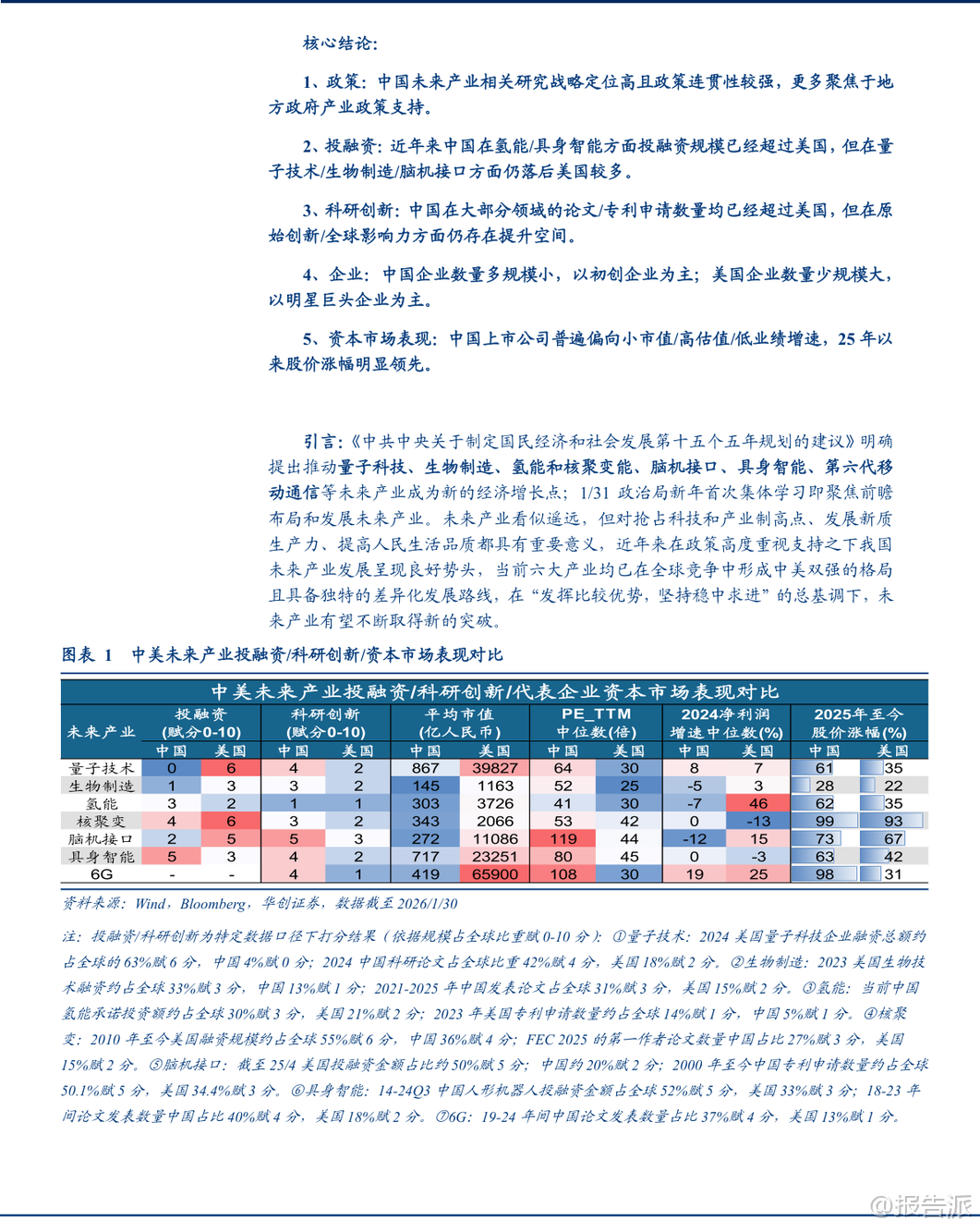 | 近日,华创证券发布《【策略专题】决胜未来:中美六大未来产业演进图景》研究报告,系统梳理了量子科技、生物制造、氢能、核聚变、脑机接口、具身智能和第六代移动通信(6G)等七大前沿领域的全球竞争格局,重点对比了中国与美国在投融资、科研创新、企业布局及资本市场表现等方面的差异与趋势。 该报告为理解未来10-15年全球科技产业演进提供了极具价值的参考框架。 在量子科技领域,美国在资本投入方面遥遥领先。 2024年,美国量子科技企业融资总额达15.8亿美元,占全球63%;而中国仅为1.0亿美元,占比4%,显示出中国在商业化融资环节仍有巨大提升空间。 但在科研创新方面,中国已实现“论文引领”,2024年中国在量子信息领域的科研论文占全球比重高达41.8%,远超美国的17.6%。 专利申请数量也全球领先,但专利授权相对落后,反映出国产技术从“量”到“质”的转化仍需加强。 企业层面,中美核心企业数量双强,但中国企业普遍呈现小市值、高估值特征,2025年以来股价涨幅领先于美国同行。 生物制造作为合成生物学的产业化方向,中美差距主要体现在资金规模上。 2023年,美国相关企业吸引投资567.9亿美元(占全球33.3%),中国企业为206.1亿美元(12.7%)。 然而,在科研端,中国已全面领跑。 2021-2025年间,中国发表生物制造领域论文6.0万篇(占全球30.6%)、专利申请4.5万件(占全球42.4%),均居世界第一。 这表明中国在基础研究和技术创新上已构筑强大优势。 企业方面,中国生物科技公司同样以小市值、高估值、低业绩增速为主,2025年以来中美生物科技指数股价涨幅相近,显示市场对两国产业前景持相对均衡看法。 氢能产业中,中国在投资力度上位居全球第一,承诺投资规模达330亿美元(占全球30%),且侧重于可再生能源制氢;美国投资约230亿美元(21%),更偏向低碳制氢技术。 产能结构上,中国在可再生能源制氢领域产能占比高达56%,是细分赛道巨头,但整体制氢产能仅为北美的1/3。 科研创新是中国短板,2023年中国专利申请量仅为欧盟的1/6、美国的1/3。 企业特征延续“小而美”模式,2025年以来股价涨幅领先。 核聚变能被视为“终极能源”,美国在基础设施建设上占据先发优势,拥有53个核聚变设施(占全球29.6%),是中国(13个,7.3%)的四倍。 但融资格局正在逆转,2010年至今,美国累计融资75.7亿美元(54.5%),中国为49.5亿美元(35.6%),且自2023年起中国企业融资规模已超过美国。 科研创新迎来爆发,2025年中国在FEC(国际核聚变能源大会)上的论文数量达到209篇,占比27%,大幅领先美国的114篇。 中国企业偏向小市值、高估值、高业绩增速,2025年以来股价涨幅显著领先。 脑机接口领域,美国投融资集中于少数明星公司,总金额超50亿美元(占全球50%);中国则以大量初创公司为主,总金额近20亿美元(20%)。 科研创新上,中国在专利申请数量上绝对领先(2000年至今3.3万件,占全球50.1%),但美国在专利质量与全球布局上更具优势。 企业生态上,中国以中小型初创企业为主,2025年以来上市公司股价涨幅领先。 具身智能(人形机器人)是当前中美竞争最激烈的赛道之一。 中国企业投融资规模已超越美国,近十年中国人形机器人投融资金额超55亿美元(占全球52%),美国为34亿美元(33%)。 中国偏向硬件先行,美国则注重数据与算法驱动。 科研创新方面,中国专利申请量占全球26%居首,论文上美国重基础研究,中国重应用研究。 企业数量上,中国人形机器人企业占比达50%,远超美国的20%。 2025年以来,该领域中国上市公司股价涨幅明显领先。 第六代移动通信(6G)是中美战略必争之地。 中国在科研创新上全面领先,6G专利申请量约1.3万件,占比40.3%居全球第一,美国以35.2%紧随其后。 2019-2024年,中国发表6G论文5130篇(占比36.8%),远超美国的1745篇(12.5%)。 企业层面,中国多为小市值、高估值公司,2025年以来股价涨幅领先。 综合来看,该报告揭示了中美在六大未来产业中的差异化竞争路径:美国在早期资本投入、高端设施建设和部分核心技术质量上保持优势;而中国在科研产出数量、产业政策支持、大规模工程化能力和资本市场热度上展现出强大后劲。 中国企业普遍具有“小市值、高估值”特征,叠加2025年以来多数领域股价领涨,反映出国内资本市场对这些未来产业的高度期待。 然而,报告也提示了宏观经济复苏不及预期、海外经济疲弱等风险。 总体而言,中国已在多个未来产业的关键指标上实现追赶甚至反超,正逐步构建起与美国分庭抗礼的科技竞争新格局。 本文由【报告派】研读,输出观点仅作为行业分析! 原文标题:原文标题:【策略专题】决胜未来:中美六大未来产业演进图景 发布时间:2026年 报告出品方:华创证券 文档页数:53页