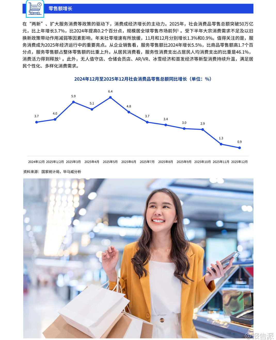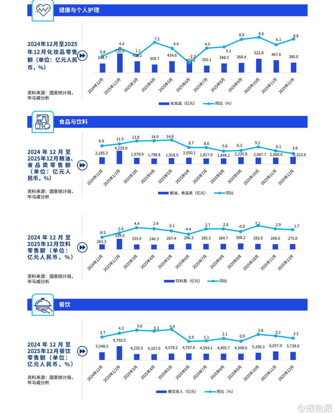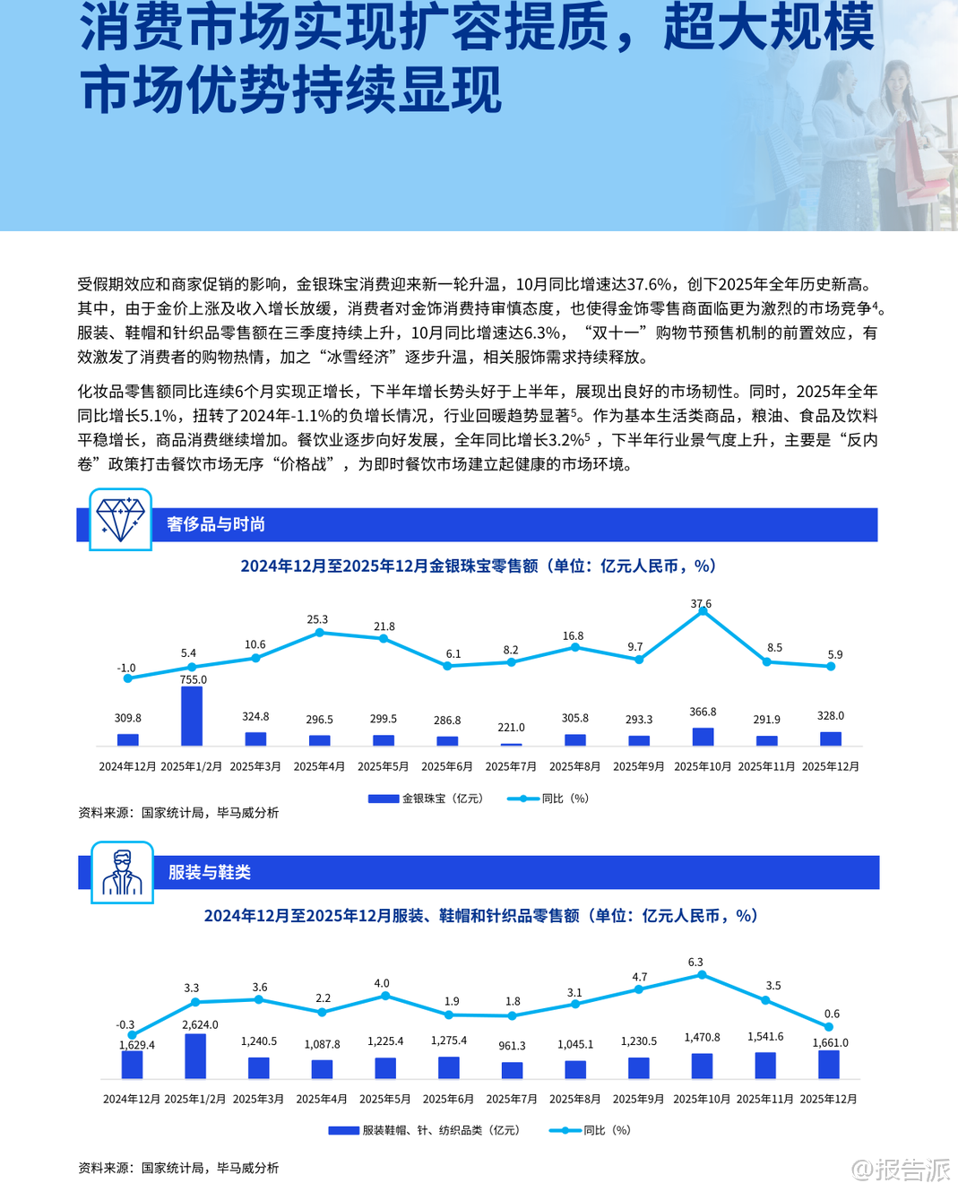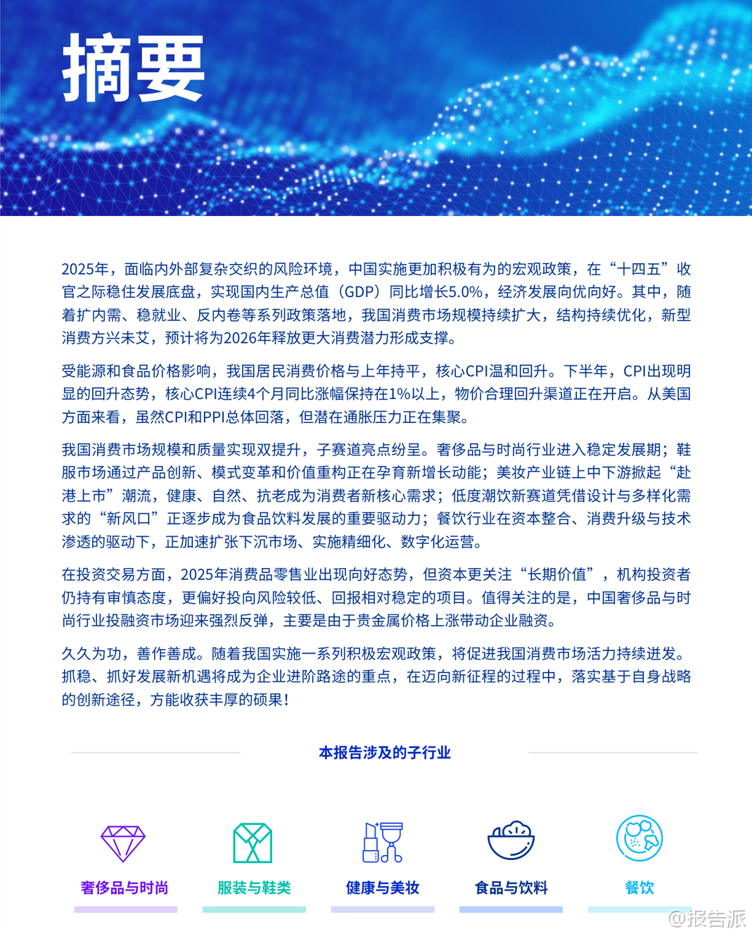 | 《2026-03-10-毕马威-消费品零售业下半年度报告》全面回顾了2025年中国宏观经济与消费品零售行业的运行态势,并对2026年的消费趋势做出前瞻预判。 报告指出,2025年是中国“十四五”规划收官之年,国内生产总值(GDP)同比增长5.0%,经济总量突破140万亿元大关,居民人均可支配收入实际增速与经济增长同步,展现出较强的韧性与发展潜力。 在宏观政策方面,政府持续实施扩内需、稳就业、反内卷等积极举措,推动最终消费支出对经济增长的贡献率超过50%。 服务消费成为亮点,服务零售额同比增长5.5%,占整体零售比重上升,银发经济、冰雪经济、首发经济等新业态加速成长。 同时,“两新”政策(设备更新与消费品以旧换新)加力扩围,为消费市场注入新动能。 从价格走势看,2025年中国CPI同比持平,核心CPI温和回升,连续四个月涨幅保持在1%以上,显示物价合理回升通道正在开启。 PPI则呈现低位回升态势,部分高技术制造业和绿色低碳行业价格止跌转涨,反映工业转型升级成效显现。 子行业层面,奢侈品与时尚行业进入稳定发展期。 尽管整体消费情绪趋于理性,但黄金价格上涨带动金银珠宝零售额同比增长12.8%,海南离岛免税市场表现亮眼,封关首月销售额达48.6亿元,同比增长46.8%。 同时,国货美妆品牌掀起赴港上市潮,林清轩、自然堂、珀莱雅等相继启动IPO进程,产业链价值重构加速。 服装与鞋类市场呈现结构性分化。 运动户外品类逆势增长,消费者偏好从基础款向高性能装备升级,“指数消费”兴起,面料成分、充绒量、防水指数等参数成为决策核心。 AI技术深入设计与生产环节,提升效率并推动个性化定制。 此外,即时零售渠道快速渗透,超百家服饰品牌入驻美团闪购,线上线下融合深化。 健康与美妆行业迎来“智性化”转型。 消费者从“信品牌”转向“信成分”,追求长期主义、功效护肤与情绪价值。 儿童彩妆、男士护发、香氛疗愈等细分赛道快速增长。 国货出海步伐加快,花知晓、橘宜集团等通过文化认同与本土化运营抢占海外市场。 食品与饮料领域,低度潮饮与功能性食品成新增长极。 白酒行业处于深度调整期,产量连续六年下滑,但头部企业凭借品牌力维持稳健增长;而低度酒如五粮液“一见倾心”、古井贡“轻度古20”广受年轻群体欢迎。 健康零食强调清洁标签与高蛋白属性,山姆、盒马等商超加速布局低GI食品。 餐饮行业迈向精细化与智能化。 全年收入达5.79万亿元,同比增长3.2%,资本整合加速,“并购潮”与“上市热”并存,海底捞收购“举高高”、蜜雪冰城赴港上市、霸王茶姬登陆美股引发关注。 企业通过“餐饮+文旅”“餐饮+数字化”拓展场景,并借助智能点餐、AI推荐、区块链溯源等技术优化全链条运营。 投资交易方面,2025年消费品零售业投融资回暖迹象明显。 奢侈品与时尚领域受益于贵金属涨价,IPO数量与募资额创五年新高;服装与鞋类IPO及并购金额显著回升;健康与美妆并购活跃度提升,PE/VC仍持审慎态度;食品饮料领域出现京东36.7亿元收购Moretide的大额交易;餐饮酒店融资金额止跌反弹,政策贴息助力中小企业缓解资金压力。 税务政策亦密集出台支持消费提振。 包括完善离境退税便利化措施、“即买即退”全国推广、跨境电商出口海外仓“离境即退税”、海南自贸港原辅料“零关税”扩容、以及针对广告费税前扣除比例放宽至30%等多项利好。 展望2026年,尽管外部环境不确定性增强,但在系列促消费政策叠加下,中国消费市场有望实现稳健增长。 企业需把握“长期价值”逻辑,在产品创新、渠道融合、可持续发展与数智化转型等方面构建差异化竞争力,方能在新一轮消费变革中赢得先机。 本文由【报告派】研读,输出观点仅作为行业分析! 原文标题:2026-03-10-毕马威-消费品零售业下半年度报告 发布时间:2026年 出品方:毕马威 文档页数:70页