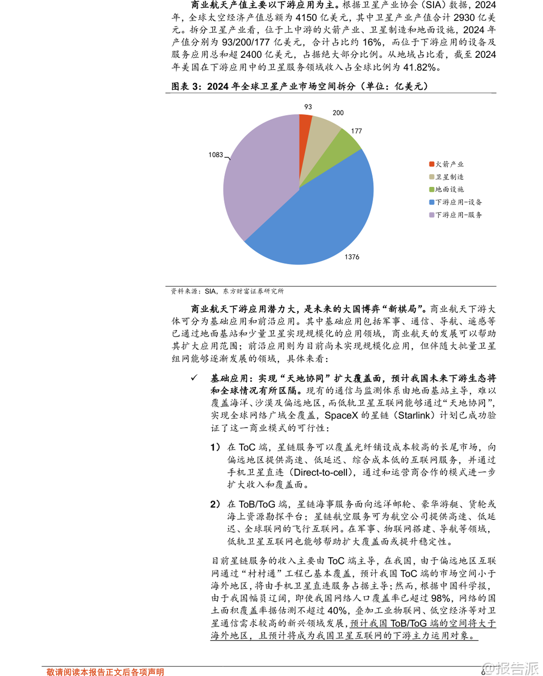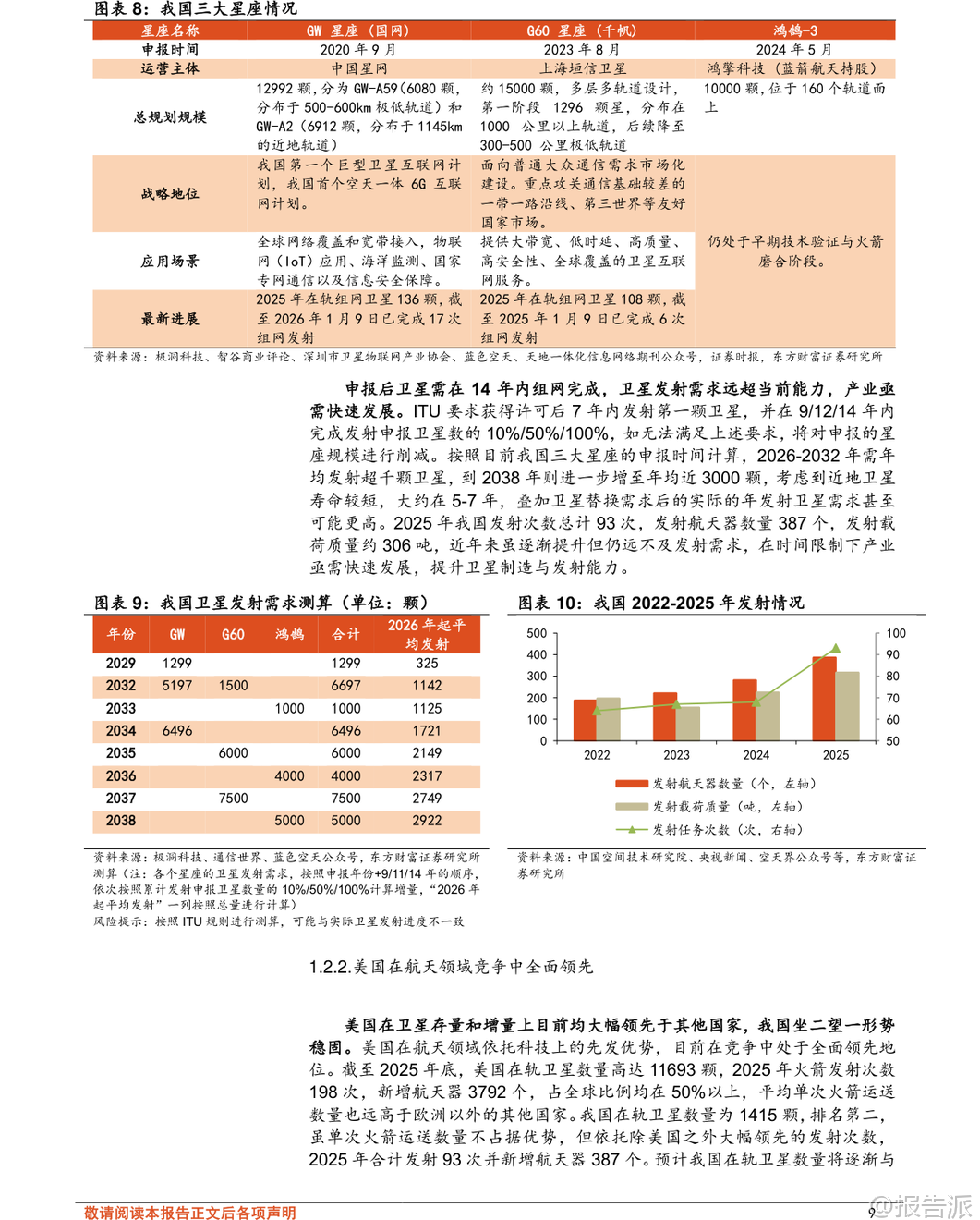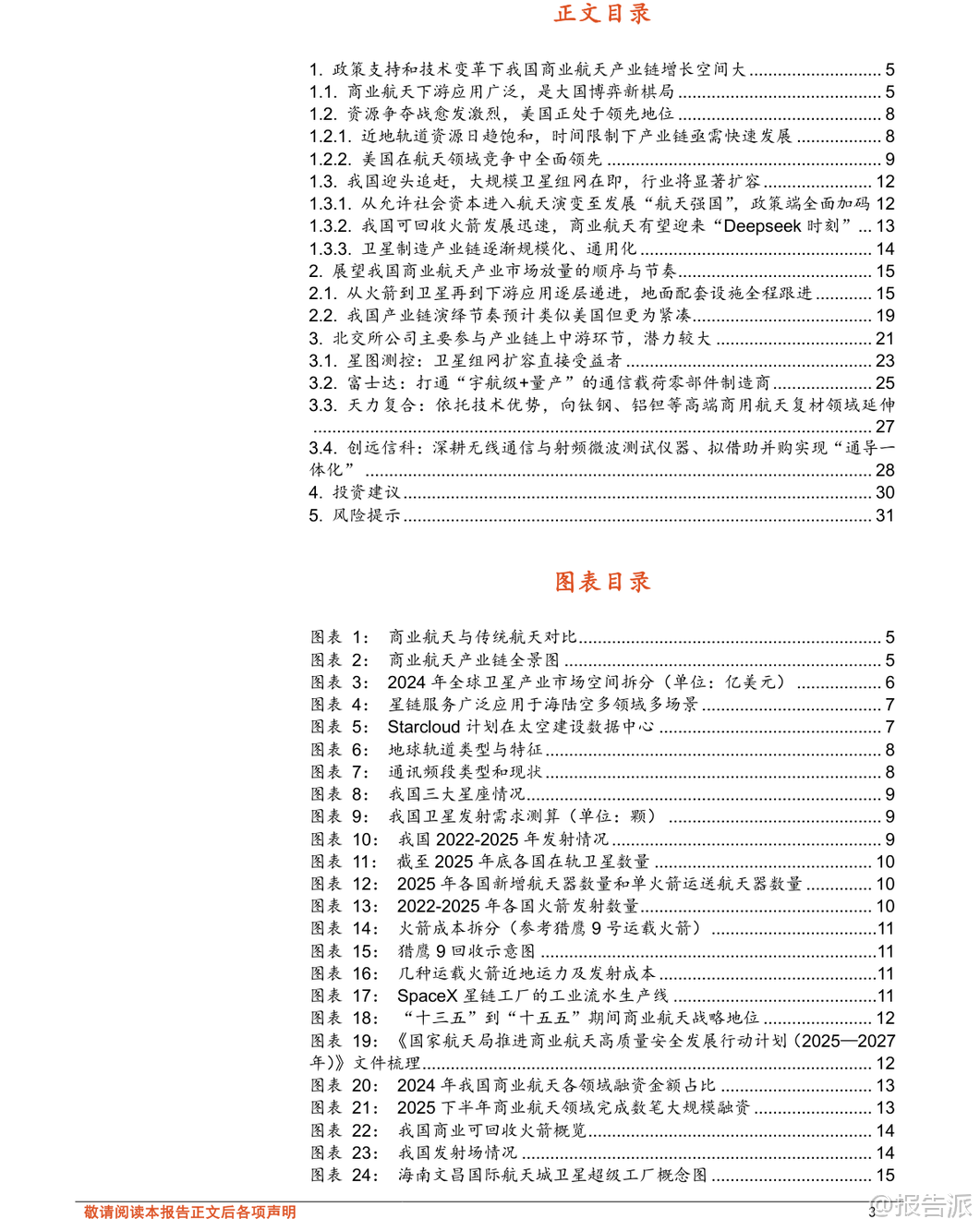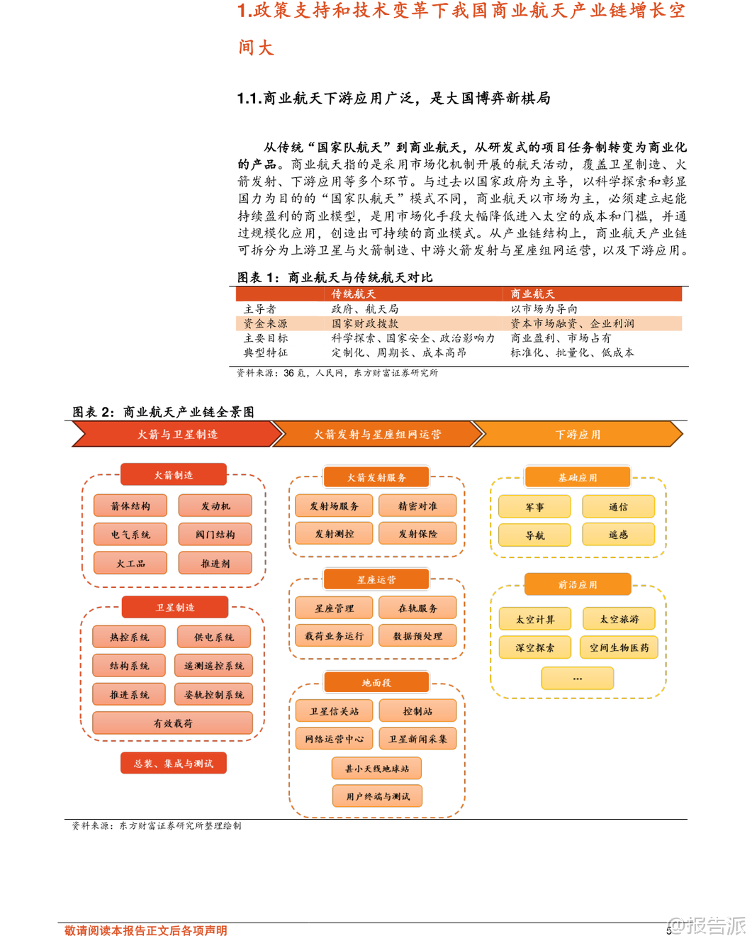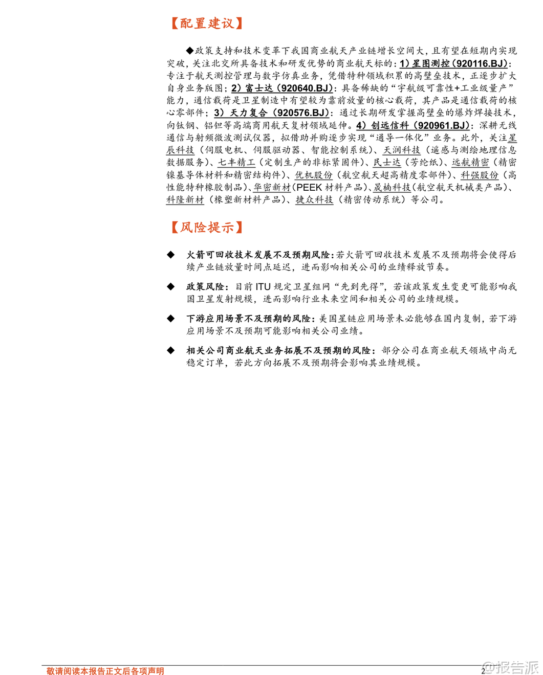 | 商业航天正迎来前所未有的战略窗口期。 随着全球太空经济在2024年达到近3万亿元人民币规模,其中下游应用占比超80%,商业航天已不仅是技术竞赛,更成为大国博弈的新战场。 中国正加速布局低轨卫星互联网,申报了GW(国网)、G60(千帆)和鸿鹄-3三大星座,合计近4万颗卫星,目标抢占稀缺的轨道与频谱资源。 根据国际电信联盟(ITU)“先占先得”规则,我国需在申报后14年内完成组网,这意味着到2032年需发射近8000颗卫星,年均发射量远超当前能力,产业扩容迫在眉睫。 当前制约我国商业航天发展的核心瓶颈在于运力不足与制造成本高企。 美国凭借SpaceX的可回收火箭技术,已将发射成本降至约1.5-2万元/公斤,而我国仍高于6万元/公斤。 同时,美国通过工业级零部件替代宇航级元器件,实现了星链卫星单颗成本仅50-100万美元,日产能达10颗,形成显著成本优势。 相比之下,我国虽在政策端全面加码,“航天强国”已上升为国家战略,并在“十五五”规划中明确支持低成本、高可靠、可复用的商业运载火箭发展,但关键技术突破仍处攻坚阶段。 2025年朱雀三号火箭一子级回收试验虽未完全成功,但着陆点距目标仅40米,标志着我国距离掌握垂直回收技术仅一步之遥。 2026年将成为关键一年,包括国家队与中国火箭公司、以及天兵科技、蓝箭航天等多家民企的大运力可回收火箭计划首飞,一旦实现突破,将彻底解除运力桎梏。 与此同时,海南商业航天发射场已建成并实现高频次发射,四川凉山、广东阳江也在规划建设新发射基地,基础设施逐步完善。 从产业链放量节奏看,我国预计将遵循“火箭制造→卫星制造与组网→下游应用”的递进路径,且节奏可能比美国更为紧凑。 短期看,火箭一级段制造是业绩最确定环节,发动机与箭体结构占成本超77%;中期随一级复用成熟,二级段及全箭回收成为焦点;长期则转向燃料、易损件维护与发射服务运营。 卫星制造端也将从定制化转向模块化、流水线生产,海南文昌超级工厂规划年产1000颗卫星,推动平台标准化以降低通用成本,使有效载荷成为价值重心。 下游应用方面,通信领域将率先起势,ToB/G端在海洋监测、物联网、低空经济等场景潜力巨大。 前沿应用如太空算力数据中心也初现曙光,Starcloud已试验搭载AI芯片的算力卫星。 地面设施则贯穿全程,信关站、测控站、网络运营中心等将伴随星座建设持续投入。 北交所作为“专精特新”企业聚集地,在商业航天上中游环节具备独特优势。 星图测控深耕航天测控管理,其“洞察者”软件对标STK,已在特种领域验证实力,并与中国星网合作,未来有望通过“星眼”太空感知星座拓展至商业服务。 富士达具备“宇航级可靠性+工业级量产”稀缺能力,产品应用于天问一号等重大工程,已进入G60星座供应链,是通信载荷核心部件供应商。 天力复合掌握高壁垒爆炸焊接技术,产品用于核聚变与航天推进系统,并向铝钽辐射屏蔽等高端商用航天材料延伸。 创远信科聚焦无线通信测试仪器,拟并购微宇天导实现“通导一体化”,打造全域测试解决方案。 此外,星辰科技(伺服系统)、天润科技(遥感数据)、七丰精工(非标紧固件)、民士达(芳纶纸)、远航精密(精密导体)等北交所企业也在各自细分领域构筑技术护城河。 尽管面临火箭回收技术不及预期、政策变动、下游应用落地缓慢等风险,但在国家意志与资本双重驱动下,我国商业航天有望在2027年后迈入大规模组网阶段,开启“天地一体”的泛在网络新时代,相关产业链公司将迎来历史性发展机遇。 本文由【报告派】研读,输出观点仅作为行业分析! 原文标题:原文标题:北交所专题:商业航天,万星组网蓄势待发,关注产业链北交所“小巨人”的投资机遇 发布时间:2026年 出品方:东方财富证券 文档页数:31页
