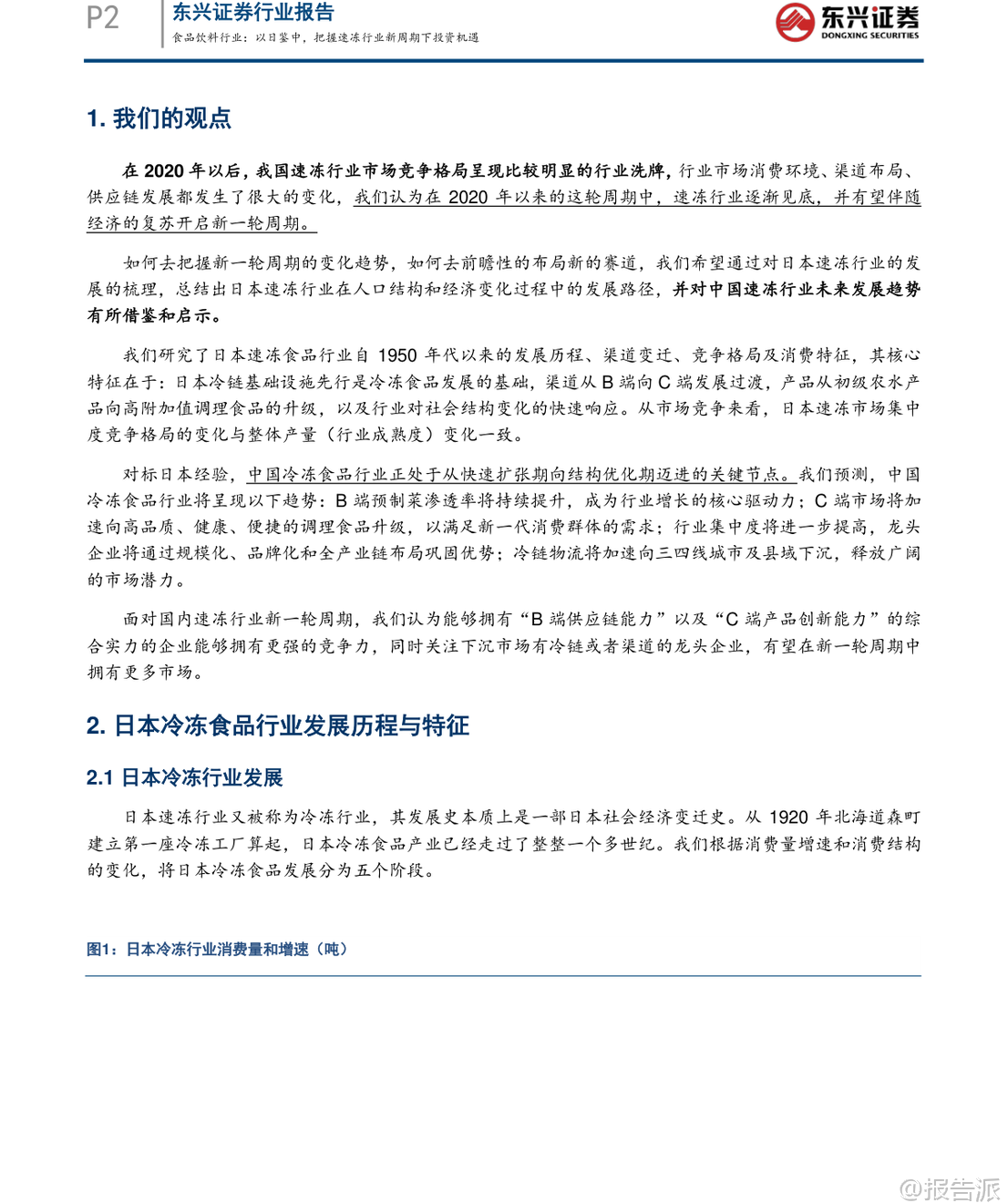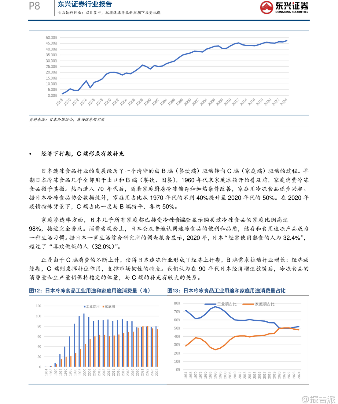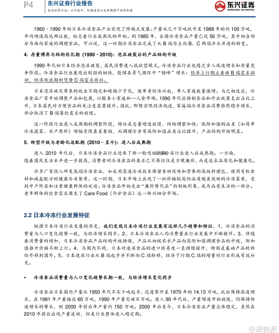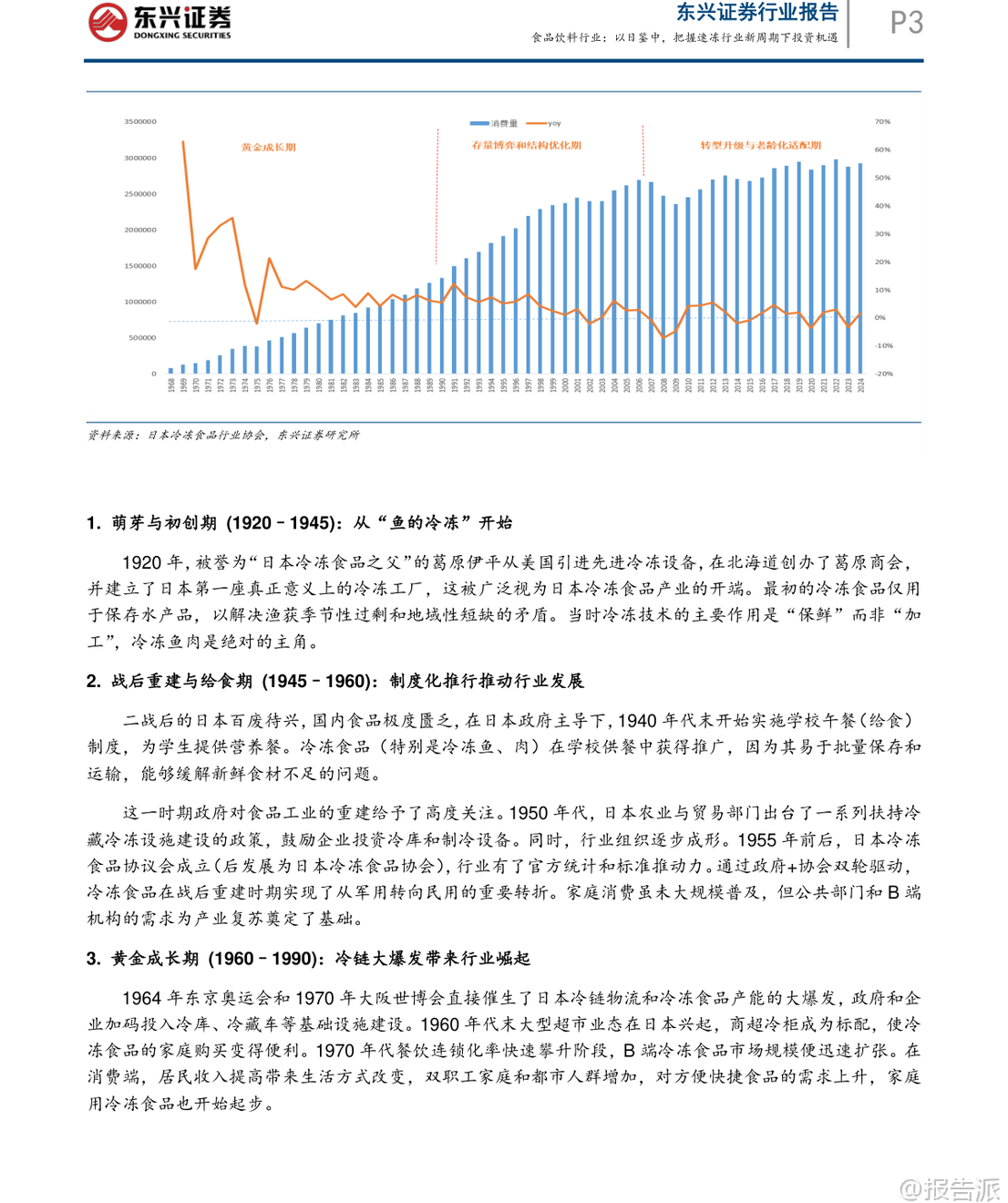 | 在2020年之后,我国速冻食品行业经历了明显的市场洗牌,消费环境、渠道布局与供应链体系均发生深刻变革。 东兴证券最新发布的《以日鉴中,把握速冻行业新周期下投资机遇》指出,当前速冻行业已逐步触底,有望伴随经济复苏开启新一轮增长周期。 本报告通过系统梳理日本速冻食品行业自1950年代以来的发展路径,提炼出对当前中国市场的关键启示,并对未来趋势作出前瞻性判断。 日本速冻行业的发展历程可划分为五个阶段:萌芽初创期(1920–1945)、战后重建期(1945–1960)、黄金成长期(1960–1990)、存量博弈期(1990–2010)以及转型升级期(2010至今)。 其核心发展特征在于:冷链基础设施先行、渠道由B端向C端延伸、产品从初级农水产品向高附加值调理食品升级,并能快速响应社会结构变化。 尤其值得注意的是,日本冷冻食品产量与人口及GDP走势高度同步,人均消费量稳步提升至23.6公斤/年,且单位价格持续上行,反映出显著的消费升级趋势。 此外,日本冷冻食品进口依存度已达47%,基础供给日益全球化。 在竞争格局方面,行业集中度持续提升,CR5达79.13%,形成“综合巨头+品类专家+渠道PB”的多层叠加结构。 对标日本经验,中国速冻食品行业正处于从快速扩张期向结构优化期过渡的关键节点。 目前中国人均消费量约10公斤,仅为日本同期水平的42%,成长空间巨大。 报告预测未来将呈现五大趋势:第一,B端预制菜渗透率将持续提升,成为行业核心驱动力。 随着餐饮连锁化率从2021年的19%升至2024年的23%,中央厨房+预制菜模式加速普及,预计2030年预制菜市场规模可达1.2万亿元。 第二,C端市场将加速向高品质、健康、便捷的调理食品升级,满足单身化、老龄化等新需求。 数据显示,2025年健康类速冻食品消费占比已升至48%,小包装、“一人食”产品需求旺盛。 第三,行业集中度将进一步提高。 当前CR5不足30%,远低于日本水平,但在成本压力与效率竞争下,中小企业加速退出,龙头企业通过规模化、品牌化与全产业链布局巩固优势。 第四,冷链物流加速下沉,县域市场潜力释放。 2025年中国冷库容量达2.67亿立方米,冷藏车保有量达58.54万辆,但县域冷链覆盖率仅25%,未来增长空间广阔。 第五,企业竞争将聚焦“B端供应链能力”与“C端产品创新能力”的综合实力比拼。 当前中国速冻行业仍存在产品结构单一、同质化严重等问题,米面制品占比高达53%,而复合菜肴类渗透率较低。 相比之下,日本家庭用冷冻食品占比已达50%,且品类丰富多样。 中国则走出“先C端起家、后B端爆发、最终双轮驱动”的独特路径。 安井食品、三全、千味央厨等企业正积极拓展B端业务,而传统C端品牌也在发力高端化与健康化创新。 投资策略上,报告重点推荐具备“双轮驱动”能力的企业。 安井食品凭借强大的B端渠道覆盖、持续的产品创新能力及全产业链把控力,被看好将在新一轮周期中维持龙头地位。 其他如千味央厨、巴比食品等也具备细分赛道竞争优势。 风险方面需关注宏观经济复苏不及预期、消费需求疲软及企业管理能力等潜在挑战。 总体来看,中国速冻食品行业正站在结构性爆发的前夜,借鉴日本成熟经验,结合本土化创新,有望在未来十年实现从“量增”到“质升”的跃迁。 对于投资者而言,把握行业集中度提升、预制菜渗透加速、冷链下沉与产品升级四大主线,将是捕捉长期价值的关键所在。 本文由【报告派】研读,输出观点仅作为行业分析! 原文标题:原文标题:2026-03-10-东兴证券-东兴证券-食品饮料行业报告:以日鉴中,把握速冻行业新周期下投资机遇 发布时间:2026年 报告出品方:东兴证券
