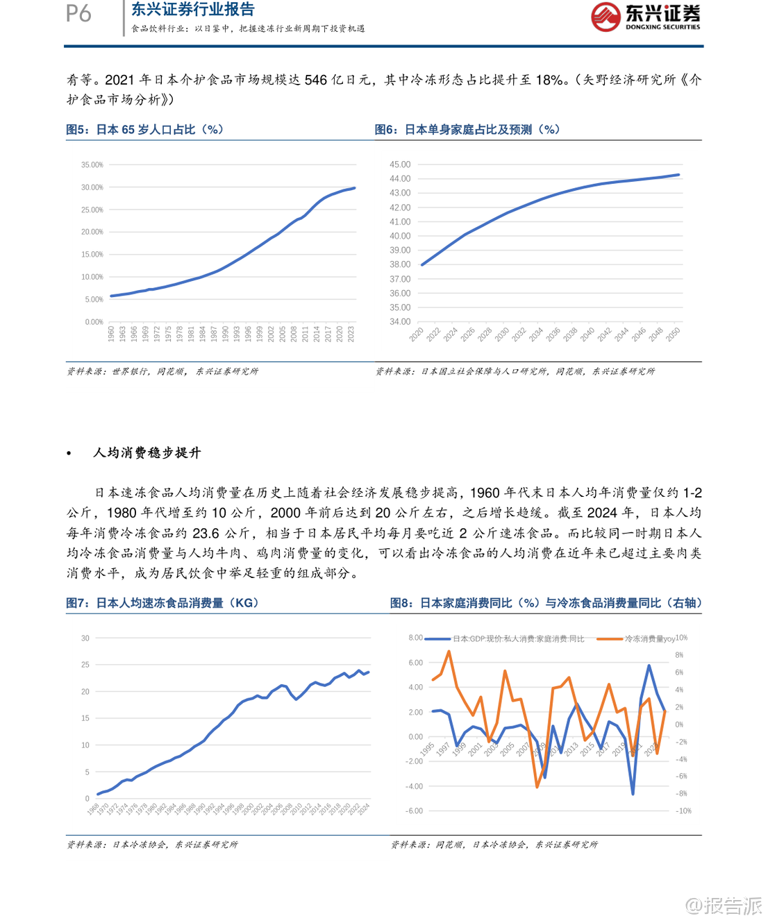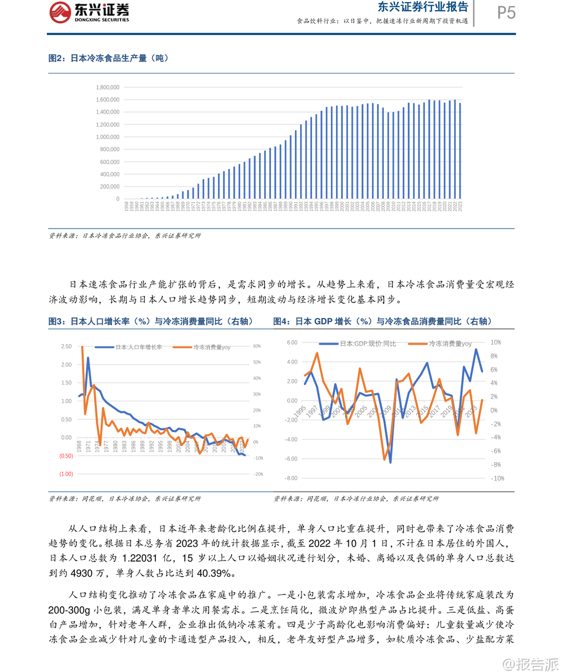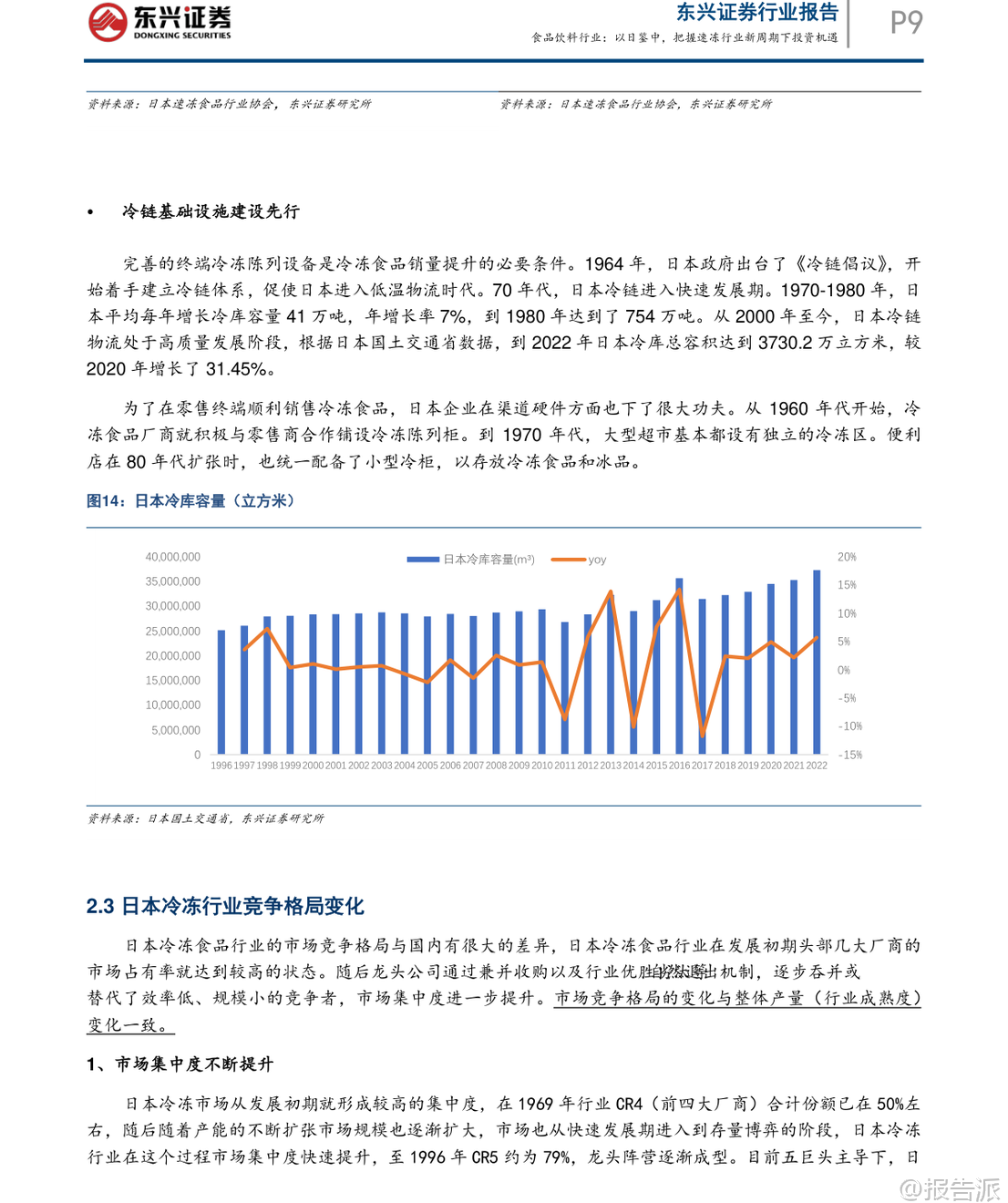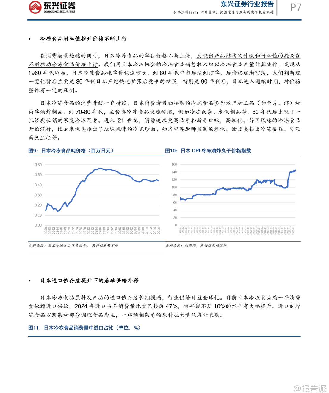 | 在2020年之后,我国速冻食品行业经历了明显的市场洗牌,消费环境、渠道布局与供应链体系均发生深刻变革。 东兴证券最新发布的《以日鉴中,把握速冻行业新周期下投资机遇》指出,当前速冻行业已逐步触底,有望伴随经济复苏开启新一轮增长周期。 本报告通过系统梳理日本速冻食品行业自1950年代以来的发展路径,提炼出对当前中国市场的关键启示,并对未来趋势作出前瞻性判断。 日本速冻行业的发展历程可划分为五个阶段:萌芽初创期(1920–1945)、战后重建期(1945–1960)、黄金成长期(1960–1990)、存量博弈期(1990–2010)以及转型升级期(2010至今)。 其核心发展特征在于:冷链基础设施先行、渠道由B端向C端延伸、产品从初级农水产品向高附加值调理食品升级,并能快速响应社会结构变化。 尤其值得注意的是,日本冷冻食品产量与人口及GDP走势高度同步,人均消费量稳步提升至23.6公斤/年,且单位价格持续上行,反映出显著的消费升级趋势。 此外,日本冷冻食品进口依存度已达47%,基础供给日益全球化。 在竞争格局方面,行业集中度持续提升,CR5达79.13%,形成“综合巨头+品类专家+渠道PB”的多层叠加结构。 对标日本经验,中国速冻食品行业正处于从快速扩张期向结构优化期过渡的关键节点。 目前中国人均消费量约10公斤,仅为日本同期水平的42%,成长空间巨大。 报告预测未来将呈现五大趋势:第一,B端预制菜渗透率将持续提升,成为行业核心驱动力。 随着餐饮连锁化率从2021年的19%升至2024年的23%,中央厨房+预制菜模式加速普及,预计2030年预制菜市场规模可达1.2万亿元。 第二,C端市场将加速向高品质、健康、便捷的调理食品升级,满足单身化、老龄化等新需求。 数据显示,2025年健康类速冻食品消费占比已升至48%,小包装、“一人食”产品需求旺盛。 第三,行业集中度将进一步提高。 当前CR5不足30%,远低于日本水平,但在成本压力与效率竞争下,中小企业加速退出,龙头企业通过规模化、品牌化与全产业链布局巩固优势。 第四,冷链物流加速下沉,县域市场潜力释放。 2025年中国冷库容量达2.67亿立方米,冷藏车保有量达58.54万辆,但县域冷链覆盖率仅25%,未来增长空间广阔。 第五,企业竞争将聚焦“B端供应链能力”与“C端产品创新能力”的综合实力比拼。 当前中国速冻行业仍存在产品结构单一、同质化严重等问题,米面制品占比高达53%,而复合菜肴类渗透率较低。 相比之下,日本家庭用冷冻食品占比已达50%,且品类丰富多样。 中国则走出“先C端起家、后B端爆发、最终双轮驱动”的独特路径。 安井食品、三全、千味央厨等企业正积极拓展B端业务,而传统C端品牌也在发力高端化与健康化创新。 投资策略上,报告重点推荐具备“双轮驱动”能力的企业。 安井食品凭借强大的B端渠道覆盖、持续的产品创新能力及全产业链把控力,被看好将在新一轮周期中维持龙头地位。 其他如千味央厨、巴比食品等也具备细分赛道竞争优势。 风险方面需关注宏观经济复苏不及预期、消费需求疲软及企业管理能力等潜在挑战。 总体来看,中国速冻食品行业正站在结构性爆发的前夜,借鉴日本成熟经验,结合本土化创新,有望在未来十年实现从“量增”到“质升”的跃迁。 对于投资者而言,把握行业集中度提升、预制菜渗透加速、冷链下沉与产品升级四大主线,将是捕捉长期价值的关键所在。 本文由【报告派】研读,输出观点仅作为行业分析! 原文标题:原文标题:2026-03-10-东兴证券-东兴证券-食品饮料行业报告:以日鉴中,把握速冻行业新周期下投资机遇 发布时间:2026年 报告出品方:东兴证券
