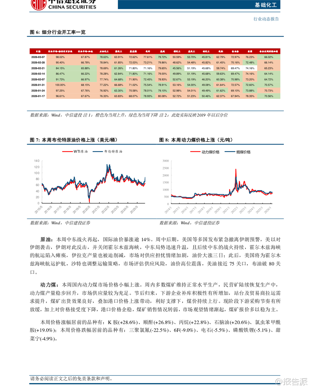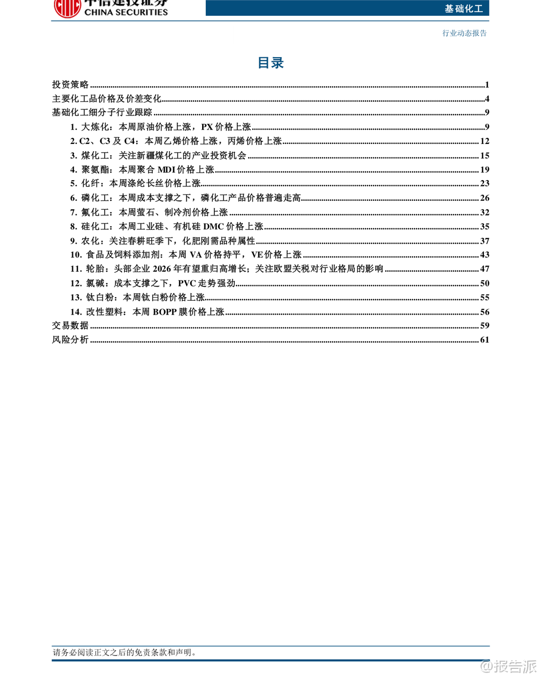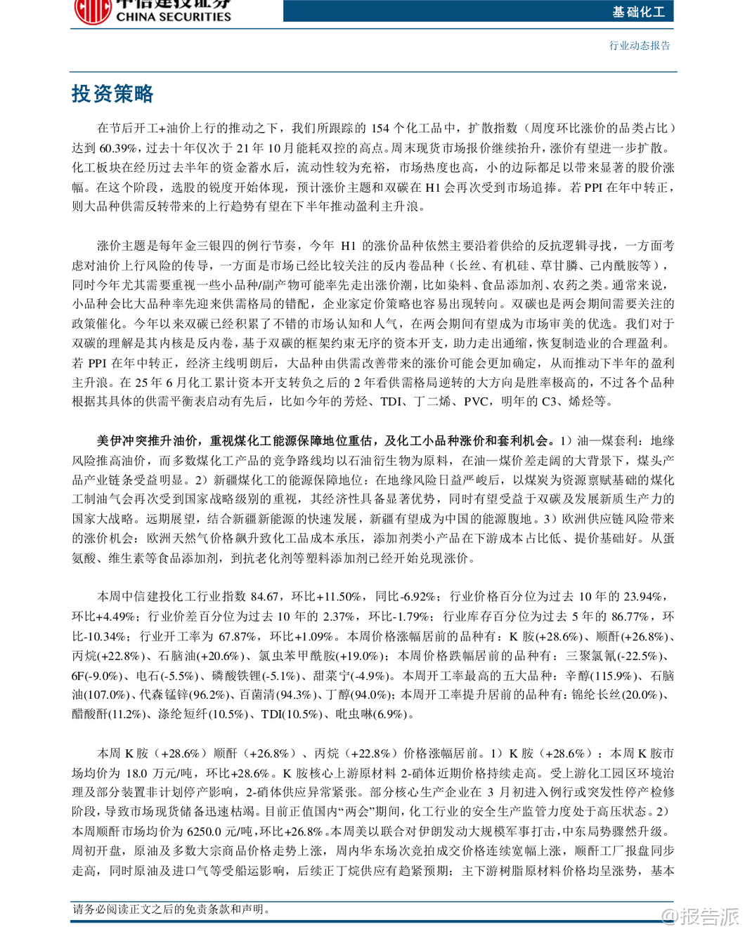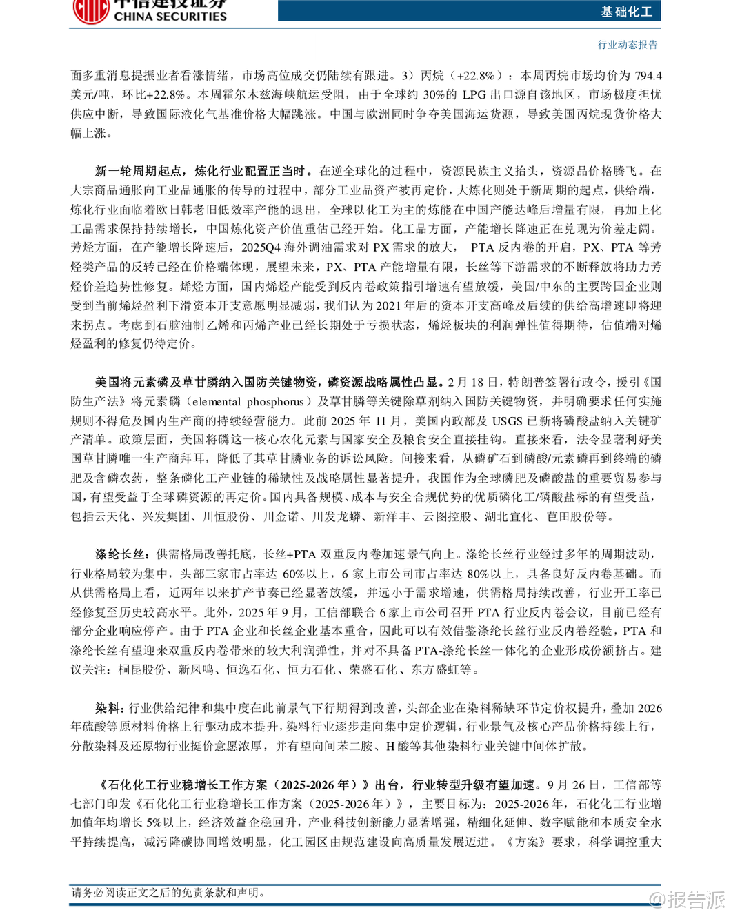 | 在2026年初,随着春节后企业开工率回升与国际原油价格大幅上涨的双重推动下,中国基础化工行业迎来新一轮涨价潮。 根据中信建投发布的行业动态报告,其所跟踪的154个化工品种中,周度环比涨价品类占比(即扩散指数)达到60.39%,为过去十年来仅次于2021年10月能耗双控时期的高点,显示出市场整体景气度显著提升。 本轮涨价的核心驱动力来自两大因素:一是地缘政治冲突引发的油价飙升。 美伊局势紧张导致霍尔木兹海峡航运受阻,全球约30%的LPG出口面临中断风险,直接推高丙烷、石脑油等能源相关产品价格;二是国内“两会”期间安全生产监管趋严叠加部分装置检修,造成如K胺、顺酐等关键中间体供应紧张,进一步加剧了产业链的价格传导效应。 具体来看,本周涨幅居前的品种包括K胺(+28.6%)、顺酐(+26.8%)、丙烷(+22.8%),而三聚氯氰(-22.5%)和6F(-9.0%)则因需求疲软或库存压力出现明显下跌。 从细分领域看,多个子行业呈现出供需格局改善的趋势。 大炼化板块受益于海外老旧产能退出和国内“减油增化”政策导向,正处于新周期起点,芳烃(如PX、PTA)和烯烃链有望迎来价差修复。 煤化工方面,在地缘风险背景下,“油—煤套利”逻辑凸显,以煤炭为原料的路线经济性优势放大,新疆作为未来能源腹地的战略地位被重估。 磷化工板块因美国将元素磷及草甘膦纳入国防关键物资,全球磷资源战略属性大幅提升,国内龙头企业有望在全球再定价中受益。 此外,染料、食品添加剂、农药等小品种同样表现亮眼,其成本支撑强劲且下游提价能力强,正逐步走向集中定价模式。 值得注意的是,行业资本开支已于2025年6月转负,预示着未来两年供需格局逆转的大方向确定性极高。 若PPI能在年中转正,则大品种由供需改善带来的盈利主升浪有望在下半年开启。 当前,氟、硅、磷三大细分赛道因其供给增量有限、需求边际向好以及政策支持明确,被机构视为具备高估值弹性的优选方向。 投资策略上,报告建议关注三条主线:一是“反内卷”逻辑下的优质龙头,如涤纶长丝行业的桐昆股份、新凤鸣,以及PTA-长丝一体化企业恒力石化、荣盛石化;二是具备能源保障价值的煤化工企业,如宝丰能源、华鲁恒升;三是受益于全球供应链重构的小品种涨价机会,涵盖维生素(新和成、浙江医药)、蛋氨酸(新和成)、染料(浙江龙盛)等领域。 同时,轮胎行业头部企业如赛轮轮胎、森麒麟凭借海外基地布局规避欧盟“双反”关税,也有望实现量利齐增。 总体而言,2026年的基础化工行业正处于“节后旺季+油价推升”的共振阶段,短期涨价趋势有望延续。 中期看,在“双碳”目标约束和资本开支放缓背景下,行业整体将从过去的产能扩张转向高质量发展,龙头企业凭借成本、技术与一体化优势将持续胜出。 投资者可重点把握供需格局逆转带来的结构性机会,优选具备强定价能力与成长潜力的优质标的。 本文由【报告派】研读,输出观点仅作为行业分析! 原文标题:原文标题:2026-03-10-中信建投-基础化工行业:节后旺季+油价推升,化工品涨价潮来临 发布时间:2026年 报告出品方:中信建投 文档页数:62页