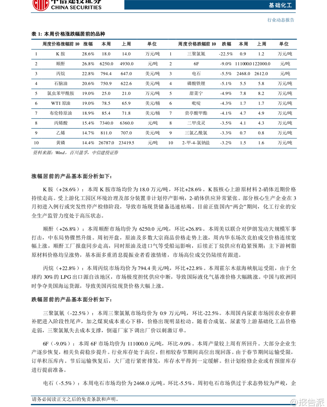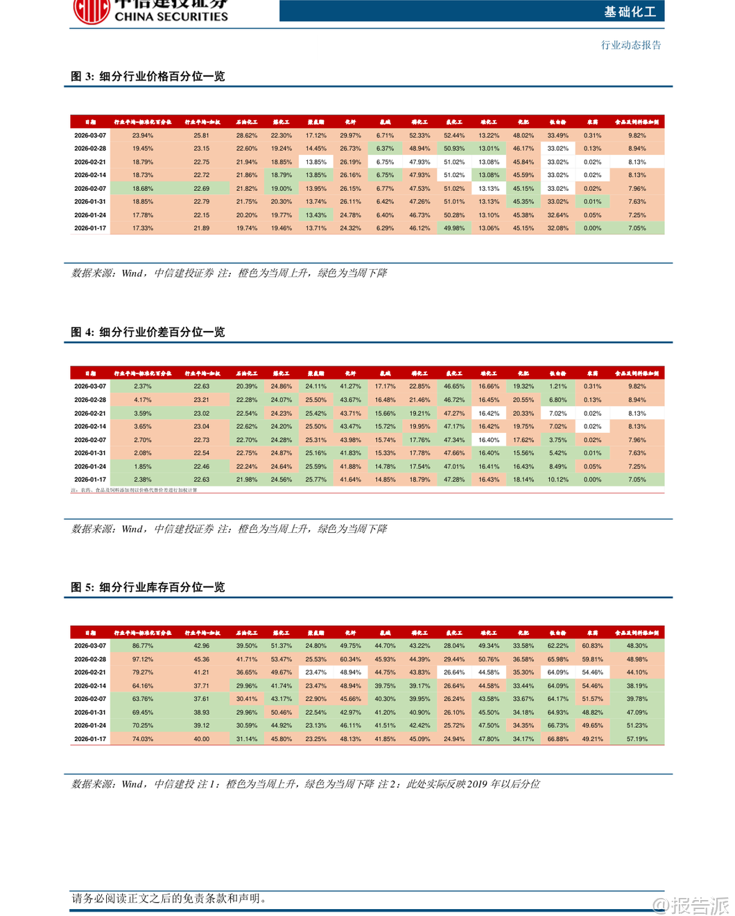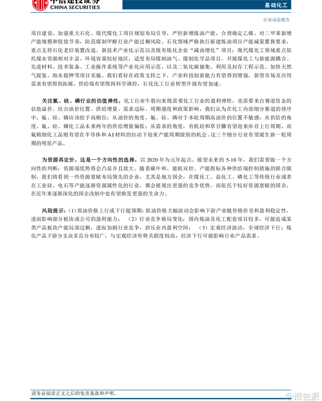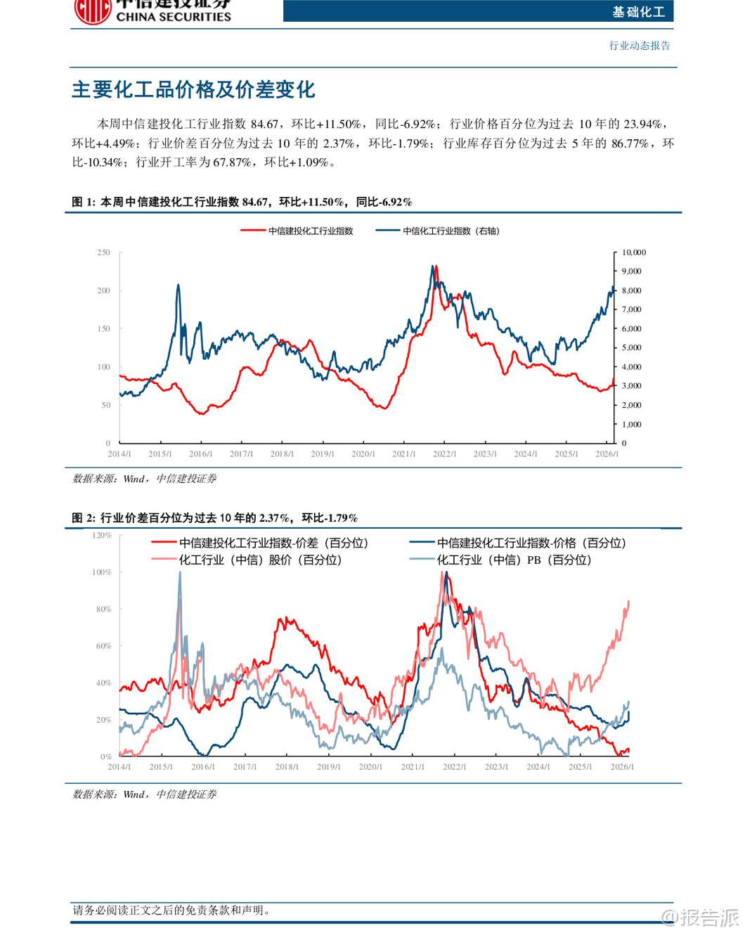 | 在2026年初,随着春节后企业开工率回升与国际原油价格大幅上涨的双重推动下,中国基础化工行业迎来新一轮涨价潮。 根据中信建投发布的行业动态报告,其所跟踪的154个化工品种中,周度环比涨价品类占比(即扩散指数)达到60.39%,为过去十年来仅次于2021年10月能耗双控时期的高点,显示出市场整体景气度显著提升。 本轮涨价的核心驱动力来自两大因素:一是地缘政治冲突引发的油价飙升。 美伊局势紧张导致霍尔木兹海峡航运受阻,全球约30%的LPG出口面临中断风险,直接推高丙烷、石脑油等能源相关产品价格;二是国内“两会”期间安全生产监管趋严叠加部分装置检修,造成如K胺、顺酐等关键中间体供应紧张,进一步加剧了产业链的价格传导效应。 具体来看,本周涨幅居前的品种包括K胺(+28.6%)、顺酐(+26.8%)、丙烷(+22.8%),而三聚氯氰(-22.5%)和6F(-9.0%)则因需求疲软或库存压力出现明显下跌。 从细分领域看,多个子行业呈现出供需格局改善的趋势。 大炼化板块受益于海外老旧产能退出和国内“减油增化”政策导向,正处于新周期起点,芳烃(如PX、PTA)和烯烃链有望迎来价差修复。 煤化工方面,在地缘风险背景下,“油—煤套利”逻辑凸显,以煤炭为原料的路线经济性优势放大,新疆作为未来能源腹地的战略地位被重估。 磷化工板块因美国将元素磷及草甘膦纳入国防关键物资,全球磷资源战略属性大幅提升,国内龙头企业有望在全球再定价中受益。 此外,染料、食品添加剂、农药等小品种同样表现亮眼,其成本支撑强劲且下游提价能力强,正逐步走向集中定价模式。 值得注意的是,行业资本开支已于2025年6月转负,预示着未来两年供需格局逆转的大方向确定性极高。 若PPI能在年中转正,则大品种由供需改善带来的盈利主升浪有望在下半年开启。 当前,氟、硅、磷三大细分赛道因其供给增量有限、需求边际向好以及政策支持明确,被机构视为具备高估值弹性的优选方向。 投资策略上,报告建议关注三条主线:一是“反内卷”逻辑下的优质龙头,如涤纶长丝行业的桐昆股份、新凤鸣,以及PTA-长丝一体化企业恒力石化、荣盛石化;二是具备能源保障价值的煤化工企业,如宝丰能源、华鲁恒升;三是受益于全球供应链重构的小品种涨价机会,涵盖维生素(新和成、浙江医药)、蛋氨酸(新和成)、染料(浙江龙盛)等领域。 同时,轮胎行业头部企业如赛轮轮胎、森麒麟凭借海外基地布局规避欧盟“双反”关税,也有望实现量利齐增。 总体而言,2026年的基础化工行业正处于“节后旺季+油价推升”的共振阶段,短期涨价趋势有望延续。 中期看,在“双碳”目标约束和资本开支放缓背景下,行业整体将从过去的产能扩张转向高质量发展,龙头企业凭借成本、技术与一体化优势将持续胜出。 投资者可重点把握供需格局逆转带来的结构性机会,优选具备强定价能力与成长潜力的优质标的。 本文由【报告派】研读,输出观点仅作为行业分析! 原文标题:原文标题:2026-03-10-中信建投-基础化工行业:节后旺季+油价推升,化工品涨价潮来临 发布时间:2026年 报告出品方:中信建投 文档页数:62页