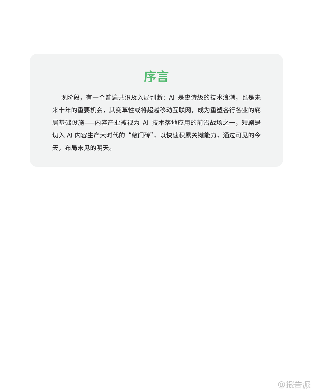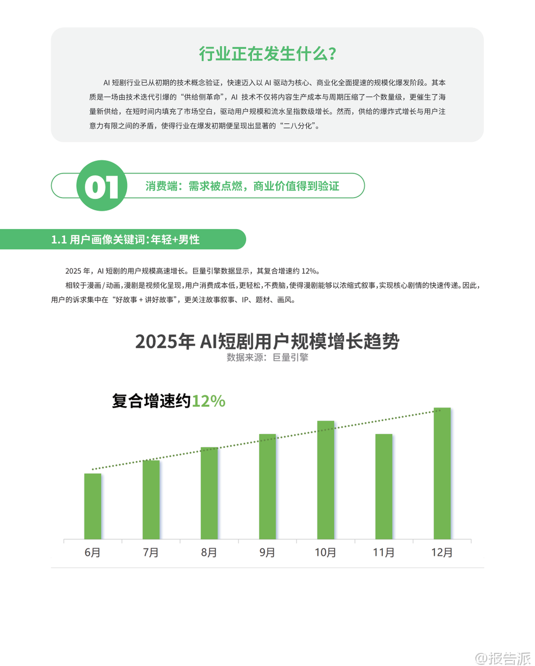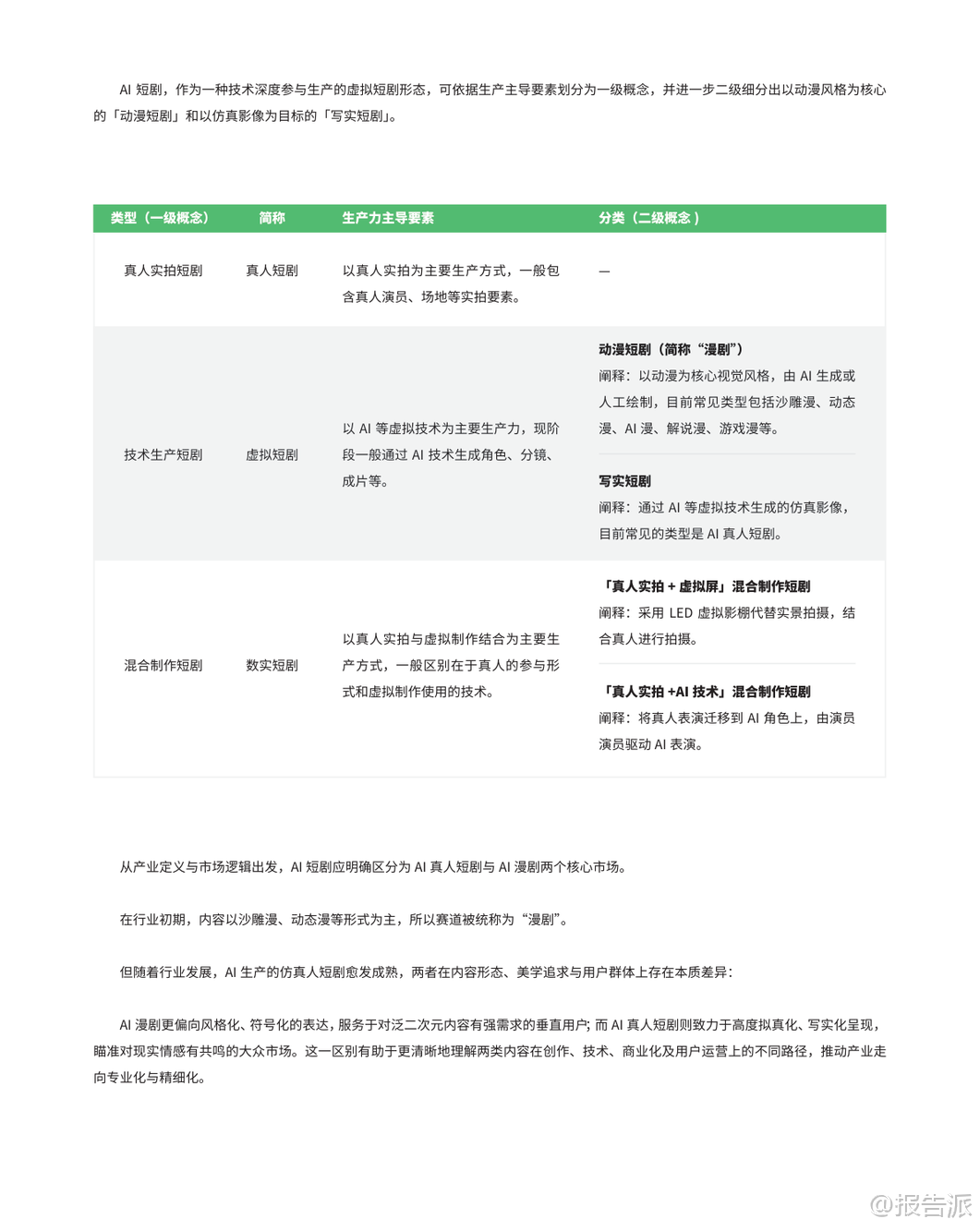 | AI短剧作为内容产业与人工智能深度融合的前沿赛道,正以惊人的速度重塑影视内容的生产逻辑与消费生态。 根据《2026-03-11-短剧自习室-AI短剧行业洞察:现状、驱动与未来趋势》报告,AI短剧已从技术概念验证阶段迈入规模化爆发期,成为继传统短剧之后又一个百亿级增长极。 本报告系统梳理了AI短剧的定义分类、市场现状、技术驱动、竞争格局及未来趋势,揭示其背后的技术革命与产业变革。 首先,在定义与分类上,AI短剧被明确划分为两大核心市场:AI漫剧与AI真人短剧。 前者以动漫风格为核心,涵盖沙雕漫、动态漫、AI漫、解说漫、游戏漫等多种细分形态,强调风格化表达;后者则致力于高度拟真化呈现,通过AI生成仿真人物与场景,追求“去AI化”的视觉真实感。 两者在用户群体、美学追求与商业化路径上存在本质差异:AI漫剧服务于泛二次元垂直用户,而AI真人短剧瞄准大众情感共鸣市场。 这一清晰划分有助于产业走向专业化与精细化发展。 从行业现状来看,AI短剧呈现出供需两旺、爆发式增长的态势。 消费端,用户规模高速增长,巨量引擎数据显示复合增速约12%。 用户画像呈现“年轻+男性”特征,男性占比超73%,31-40岁为核心受众。 抖音平台全年累计播放量突破757亿,广告流水半年内增长2135%,商业模式已被充分验证。 供给端,产业生态快速完善,制作门槛因AI技术大幅降低,催生大量新玩家入局。 传统短剧公司、影视巨头、网文平台、AI企业乃至游戏厂商纷纷布局,形成包含IP方、制作方、发行方、技术方与平台方的成熟闭环。 2025年仅抖音新上线剧目达3.7万部,总供给量破10万部,呈现指数级增长。 然而,当前仍处于“低质内容爆发、优质内容稀缺”的阶段,沙雕漫、解说漫凭借低成本高产出占据主流,但头部精品如《斩仙台下我震惊了诸神!》单部播放量破10亿,验证了高质量内容的巨大潜力。 技术是本轮爆发的核心驱动力。 AIGC模型的快速迭代击穿了内容生产的成本与周期瓶颈。 从Midjourney、Sora 2到国内的即梦AI、可灵AI、Vidu等模型持续升级,推动生成质量、一致性与分辨率不断提升。 生产流程已实现“剧本输入—AI分镜—成片生成—后期剪辑”的工业化流水线,将传统动画数月的制作周期压缩至数周甚至数天,成本降至原来的十分之一乃至百分之一。 这种确定性生产与成本革命,使得“人机协作”取代“人力密集型”团队成为新常态,一个5-7人小组即可完成整部作品,极大提升了生产效率与灵活性。 展望未来,AI短剧将进入分化与深化并行的新阶段。 技术演进方向将从精美画面生成转向连贯叙事理解,重点突破角色一致性、长镜头逻辑与物理模拟等难题。 市场层面,AI真人短剧被视为更具想象空间的“广阔平原”,因其面向的是千亿级真人影视基本盘,一旦技术成熟将直接冲击主流影视生产体系。 竞争维度也将从单一内容比拼,升级为覆盖算力、模型、工具链与创意人才的全产业链竞争。 拥有专属垂直模型与稳定算力供给的企业将建立核心壁垒,而具备高效工作流整合能力的团队将在效率上胜出。 随着产能过剩,IP与数字资产库的价值将愈发凸显,具备强辨识度的原创IP将成为沉淀用户、实现衍生变现的关键。 值得注意的是,出海已成为行业下一阶段的核心战略。 相较于依赖真人演员与本地化拍摄的传统短剧,AI短剧可通过调整角色相貌、配音语言等方式实现低成本快速本地化,有望复制国内“免费+内购”的成功模式。 中国凭借成熟的工业体系、高效的商业落地能力与庞大的数据训练池,正逐步确立全球AI内容生产中心的地位。 最终,这场由生产端发起的效率革命,或将催生新一代内容平台形态——从被动观看的“内容货架”进化为主动参与的“体验引擎”,支持实时互动、分支剧情乃至用户共创,真正开启个性化叙事时代。 本文由【报告派】研读,输出观点仅作为行业分析! 原文标题:原文标题:2026-03-11-短剧自习室-AI短剧行业洞察:现状、驱动与未来趋势 发布时间:2026年 出品方:短剧自习室