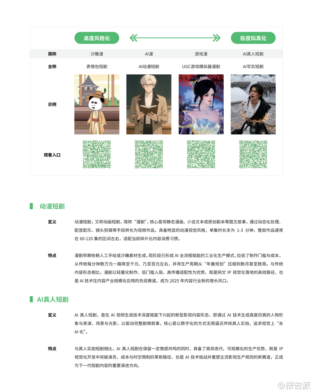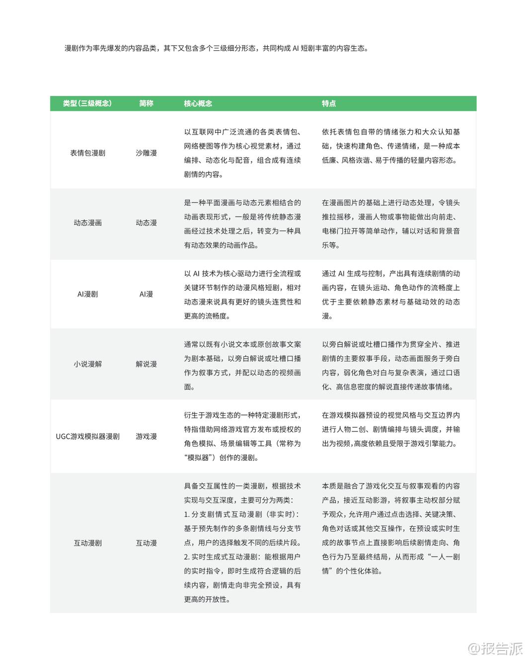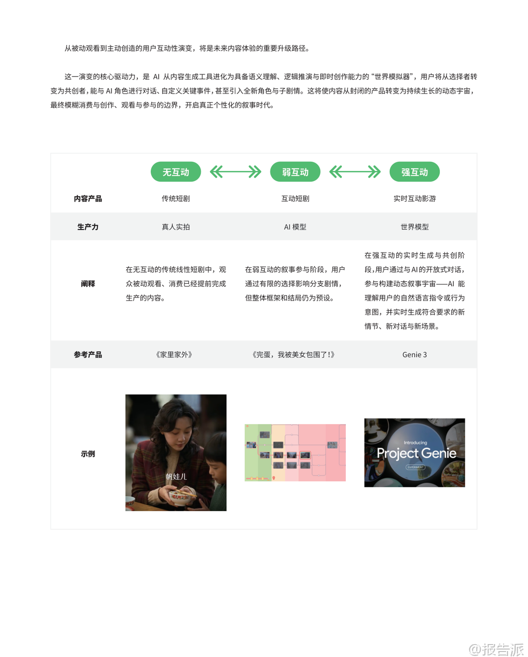 | AI短剧作为内容产业与人工智能深度融合的前沿赛道,正以惊人的速度重塑影视内容的生产逻辑与消费生态。 根据《2026-03-11-短剧自习室-AI短剧行业洞察:现状、驱动与未来趋势》报告,AI短剧已从技术概念验证阶段迈入规模化爆发期,成为继传统短剧之后又一个百亿级增长极。 本报告系统梳理了AI短剧的定义分类、市场现状、技术驱动、竞争格局及未来趋势,揭示其背后的技术革命与产业变革。 首先,在定义与分类上,AI短剧被明确划分为两大核心市场:AI漫剧与AI真人短剧。 前者以动漫风格为核心,涵盖沙雕漫、动态漫、AI漫、解说漫、游戏漫等多种细分形态,强调风格化表达;后者则致力于高度拟真化呈现,通过AI生成仿真人物与场景,追求“去AI化”的视觉真实感。 两者在用户群体、美学追求与商业化路径上存在本质差异:AI漫剧服务于泛二次元垂直用户,而AI真人短剧瞄准大众情感共鸣市场。 这一清晰划分有助于产业走向专业化与精细化发展。 从行业现状来看,AI短剧呈现出供需两旺、爆发式增长的态势。 消费端,用户规模高速增长,巨量引擎数据显示复合增速约12%。 用户画像呈现“年轻+男性”特征,男性占比超73%,31-40岁为核心受众。 抖音平台全年累计播放量突破757亿,广告流水半年内增长2135%,商业模式已被充分验证。 供给端,产业生态快速完善,制作门槛因AI技术大幅降低,催生大量新玩家入局。 传统短剧公司、影视巨头、网文平台、AI企业乃至游戏厂商纷纷布局,形成包含IP方、制作方、发行方、技术方与平台方的成熟闭环。 2025年仅抖音新上线剧目达3.7万部,总供给量破10万部,呈现指数级增长。 然而,当前仍处于“低质内容爆发、优质内容稀缺”的阶段,沙雕漫、解说漫凭借低成本高产出占据主流,但头部精品如《斩仙台下我震惊了诸神!》单部播放量破10亿,验证了高质量内容的巨大潜力。 技术是本轮爆发的核心驱动力。 AIGC模型的快速迭代击穿了内容生产的成本与周期瓶颈。 从Midjourney、Sora 2到国内的即梦AI、可灵AI、Vidu等模型持续升级,推动生成质量、一致性与分辨率不断提升。 生产流程已实现“剧本输入—AI分镜—成片生成—后期剪辑”的工业化流水线,将传统动画数月的制作周期压缩至数周甚至数天,成本降至原来的十分之一乃至百分之一。 这种确定性生产与成本革命,使得“人机协作”取代“人力密集型”团队成为新常态,一个5-7人小组即可完成整部作品,极大提升了生产效率与灵活性。 展望未来,AI短剧将进入分化与深化并行的新阶段。 技术演进方向将从精美画面生成转向连贯叙事理解,重点突破角色一致性、长镜头逻辑与物理模拟等难题。 市场层面,AI真人短剧被视为更具想象空间的“广阔平原”,因其面向的是千亿级真人影视基本盘,一旦技术成熟将直接冲击主流影视生产体系。 竞争维度也将从单一内容比拼,升级为覆盖算力、模型、工具链与创意人才的全产业链竞争。 拥有专属垂直模型与稳定算力供给的企业将建立核心壁垒,而具备高效工作流整合能力的团队将在效率上胜出。 随着产能过剩,IP与数字资产库的价值将愈发凸显,具备强辨识度的原创IP将成为沉淀用户、实现衍生变现的关键。 值得注意的是,出海已成为行业下一阶段的核心战略。 相较于依赖真人演员与本地化拍摄的传统短剧,AI短剧可通过调整角色相貌、配音语言等方式实现低成本快速本地化,有望复制国内“免费+内购”的成功模式。 中国凭借成熟的工业体系、高效的商业落地能力与庞大的数据训练池,正逐步确立全球AI内容生产中心的地位。 最终,这场由生产端发起的效率革命,或将催生新一代内容平台形态——从被动观看的“内容货架”进化为主动参与的“体验引擎”,支持实时互动、分支剧情乃至用户共创,真正开启个性化叙事时代。 本文由【报告派】研读,输出观点仅作为行业分析! 原文标题:原文标题:2026-03-11-短剧自习室-AI短剧行业洞察:现状、驱动与未来趋势 发布时间:2026年 出品方:短剧自习室