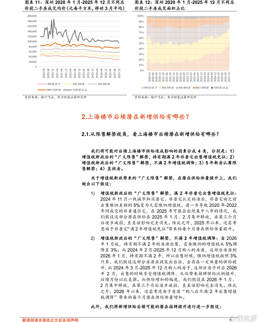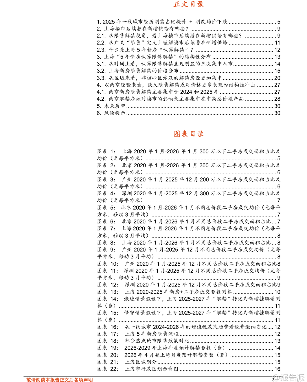 | 近期,关于“限售解禁”对上海楼市的影响成为市场关注焦点。 根据东方财富证券发布的《房地产行业深度研究:限售解禁对上海楼市有何影响?》报告,自2026年起,上海将迎来一波由“5年限售”政策到期引发的新房集中入市潮,预计在2026至2029年间将有约12.15万套新房陆续解禁进入二手房市场,其中2027年为解禁高峰,全年达4.5万套。 这一波解禁潮并非均匀释放,而是呈现三次明显的脉冲式集中入市:第一次集中在2026年6月至7月,解禁约1.37万套;第二次为2026年10月至2027年1月,解禁超2.3万套,并在2027年1月达到单月峰值,超过8000套;第三次则从2027年6月持续至年底,解禁量高达3.5万套,是三轮中规模最大、时间最长的一次。 即便如此,由于总量分布在四年周期内,年均解禁约3万套,月均最高也不足4000套,因此报告认为其对上海楼市整体量价的冲击有限。 但从结构上看,影响显著分化。 区域方面,解禁房源高度集中于非核心区,占比接近三分之二。 闵行、青浦、浦东(非主城区)、嘉定等近郊板块压力较大,而核心区如静安、黄浦、徐汇等地解禁体量相对较小,仅浦东(主城区)有一定放量。 整体呈现“外环承压、内环稳健”的格局。 价格分布上,解禁房源呈现出阶段性演进特征:首轮以5万元/㎡以下的低价盘为主,主要集中在宝山、奉贤等区域;第二轮高价盘(10万+/㎡)开始集中出现;第三轮则覆盖全价格段,尤其是7-10万元/㎡的改善型产品大量释放,标志着供给压力从外围刚需市场向全域改善市场扩散。 值得注意的是,截至2025年12月,多数区域二手房均价已较历史高点回落30%-50%,部分核心区跌幅甚至超过50%。 同时,当前二手房价格普遍低于待解禁新房的备案均价,平均折价幅度在40%以上。 这意味着解禁房源若想快速变现,可能需要接受一定程度的价格让利,尤其在竞争激烈的非核心区,短期内或加剧局部市场的价格博弈。 报告还参考了南京的限售解禁经验。 南京自2017年实施3年限售,2023至2025年迎来解禁高峰,累计超19万套。 数据显示,解禁期间中高总价段房源价格波动更为剧烈,反映出结构性冲击特征明显——即新增供给对特定价格段市场的影响远大于对整体市场的冲击。 综合来看,上海此轮回暖并非普涨逻辑。 虽然5年限售解禁不会颠覆整体市场趋势,但会在特定时间段和特定区域形成阶段性供给压力,尤其在非核心板块,可能进一步压制房价反弹空间。 对于购房者而言,2026年下半年至2027年底或是淘笋优质限售房的关键窗口期;而对于持有此类资产的业主,则需警惕集中挂牌带来的流动性竞争与议价权削弱风险。 此外,除“刚性限售”外,增值税新政也构成“广义限售解禁”。 2024年底起,一线城市取消普宅与非普宅认定,持有满2年住房出售免征增值税,叠加2026年起不满2年出售税率由5%降至3%,将进一步激活短期换房需求,增加市场挂牌量,形成复合型供给压力。 总体判断,政策调控下的“延迟供应”正逐步释放,市场正从过去的“稀缺预期”转向“真实供需”博弈。 未来上海楼市的走势,将更依赖于基本面修复、居民收入预期改善以及更大尺度的政策支持,而非短期投机情绪驱动。 本文由【报告派】研读,输出观点仅作为行业分析! 原文标题:原文标题:2026-03-11-东方财富证券-东方财富证券-房地产行业深度研究:限售解禁对上海楼市有何影响? 发布时间:2026年 报告出品方:东方财富