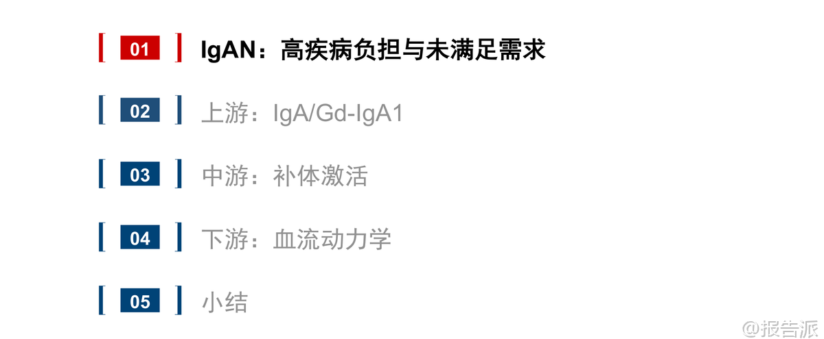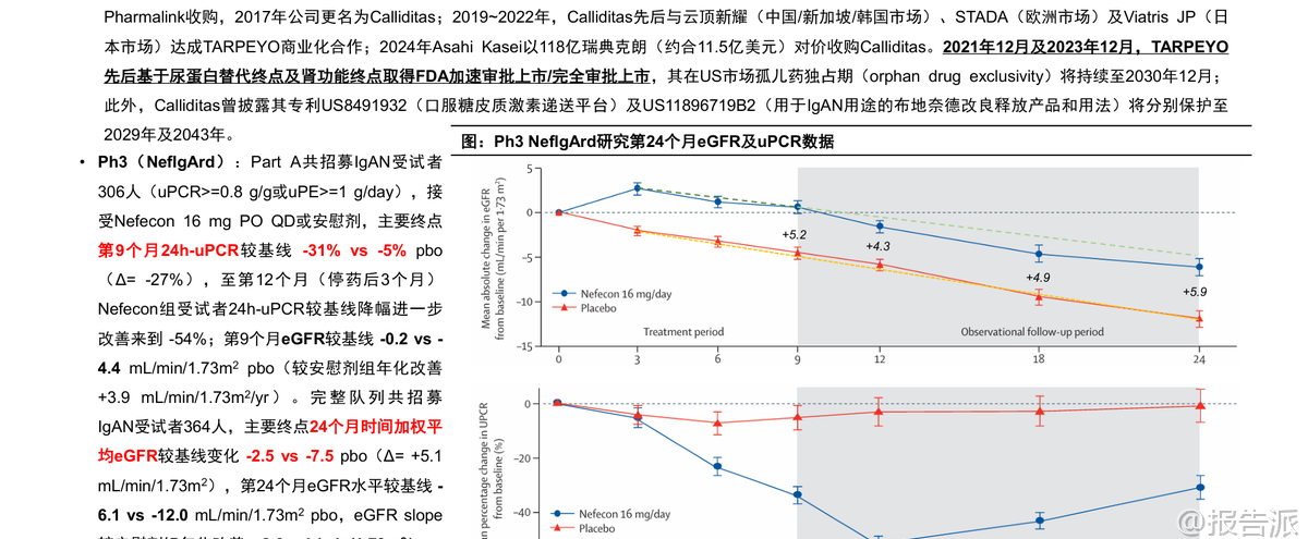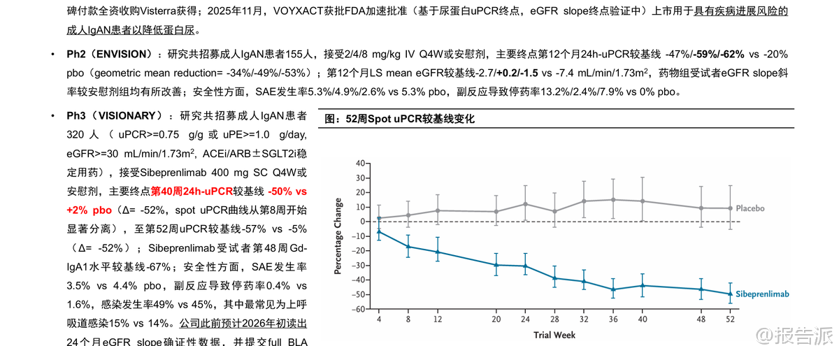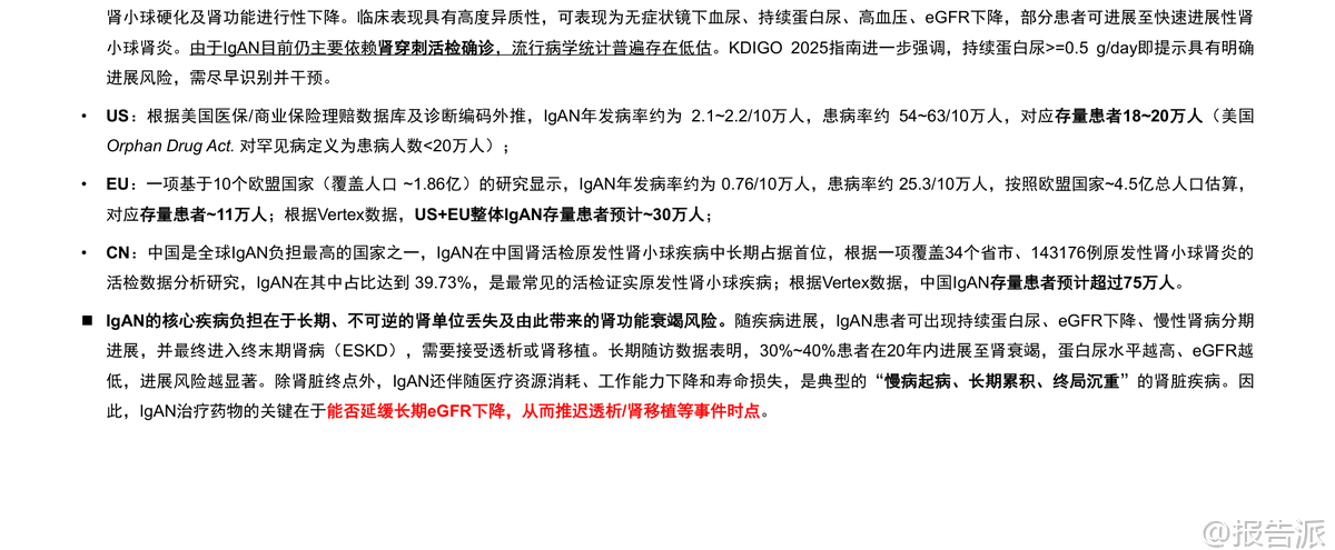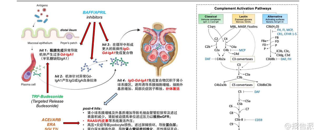 | IgA肾病(IgAN)是全球最常见的原发性肾小球疾病,病理特征为以IgA为主的免疫复合物沉积于肾小球系膜区,引发炎症反应、补体激活和肾功能进行性下降。 由于诊断依赖肾穿刺活检,流行病学数据存在低估。 据测算,美国+欧洲存量患者约30万人,中国作为全球负担最重的国家之一,存量患者预计超过75万。 长期随访数据显示,30%~40%的IgAN患者在20年内会进展至终末期肾病(ESKD),需透析或肾移植,且蛋白尿水平越高、eGFR越低,风险越大。 因此,延缓eGFR下降成为治疗核心目标。 目前标准治疗(SoC)仍以优化支持疗法为主,包括RAAS抑制剂、生活方式管理和高风险患者使用SGLT2抑制剂。 然而,这些手段多作用于疾病下游环节,难以实现深层次的疾病修饰。 近年来,随着Nefecon、Sparsentan等疾病修饰疗法陆续获批,IgAN治疗正式迈入靶向干预时代,商业化兑现周期已然开启。 从发病机制看,IgAN遵循“四击假说”:黏膜免疫异常导致半乳糖缺陷型IgA1(Gd-IgA1)产生;机体产生抗Gd-IgA1自身抗体;形成致病性免疫复合物;复合物沉积于肾小球系膜区,触发炎症与补体激活。 后续还伴随血流动力学紊乱,形成恶性循环。 基于此,当前研发策略主要围绕三大路径展开:上游干预(靶向Gd-IgA1生成)、中游调控(补体系统抑制)和下游控制(改善肾小球高压)。 在上游机制中,BAFF/APRIL双靶点抑制剂表现尤为突出。 Atacicept(Vera Therapeutics)在III期ORIGIN-3研究中,36周时使24h-uPCR较基线下降46%,安慰剂调整后降幅达-42%,同时显著降低Gd-IgA1水平。 Povetacicept(Vertex收购Alpine获得)在III期RAINIER研究的期中分析中,36周uPCR降幅达-52%,安慰剂组仅-4%,Δ=-50%,达到主要终点,且安全性良好,具备“最佳创新药”(BIC)潜质。 荣昌生物的Telitacicept在中国III期研究中也展现出-55%的uPCR降幅。 相比之下,靶向APRIL单通路的Zigakibart(Novartis)和Sibeprenlimab(Otsuka)同样表现出色,前者Ph1/2数据显示100周uPCR降幅达-60%,后者已于2025年11月获FDA加速批准上市。 中游补体通路是另一重要方向。 Iptacopan(诺华)作为口服CFB抑制剂,在III期APPLAUSE-IgAN研究中不仅实现-38%的uPCR降幅,更关键的是已确认达到eGFR slope临床终点,显示出对肾功能的实质性保护。 Sefaxersen(罗氏/Ionis)作为靶向CFB的ASO药物,Ph2a数据显示29周uPE降幅达-43%,III期IMAGINATION研究预计2026年读出数据。 Ravulizumab(阿斯利康)作为长效C5抑制剂,Ph2研究显示26周uPCR降幅-40%,III期I CAN研究将于2026年上半年读出期中分析结果。 下游机制则聚焦于血流动力学调节。 Sparsentan(Travere)作为双重ETA/AT1R拮抗剂,已在PROTECT研究中证实其在降低蛋白尿的同时,可带来每年+1.1 mL/min/1.73m²的eGFR斜率改善,并获FDA完全批准。 Atrasentan(诺华)作为高选择性ETA拮抗剂,Ph3 ALIGN研究显示36周uPCR降幅-38%,且2026年2月已宣布达成136周eGFR slope阳性终点,有望提交传统审批。 商业化前景方面,根据国信证券测算,全球IgAN治疗药物远期市场规模中值可达83亿美元。 其中,美国市场潜力约47~80亿美元,欧洲7~13亿,中国6~13亿。 市场结构预计将呈现分层:Nefecon及ERA类口服小分子因便利性和价格优势占据主流份额;BAFF/APRIL类生物制剂凭借最强效的尿蛋白降幅覆盖中高端市场;而Iptacopan等补体药物因定价高、需疫苗接种管理,可能聚焦高风险或前线失败人群。 未来18个月将是关键催化剂密集释放期:Povetacicept预计2026年Q1末提交BLA,若使用优先审评券,有望Q3末上市;Atacicept PDUFA日期为2026年7月7日;Sefaxersen与Ravulizumab的III期期中数据将在2026年内揭晓;Sibeprenlimab的确证性eGFR数据也将于2026年上半年读出。 此外,恒瑞医药、复星医药、正大天晴等本土企业也在积极布局CFB、MASP2等多个靶点,竞争格局日趋激烈。 综上所述,IgAN治疗已从传统支持走向精准干预,上游靶点因更接近病因源头,有望实现更持久的肾功能保护。 尽管市场竞争加剧、临床验证与商业化落地仍存不确定性,但整体行业已明确进入商业化兑现阶段,未来几年将见证多款重磅产品重塑诊疗格局。 本文由【报告派】研读,输出观点仅作为行业分析! 原文标题:原文标题:国信证券-医药生物·生物制品行业创新药盘点系列报告(25):IgA肾病药物已进入商业化兑现期 发布时间:2026年 出品方:国信证券