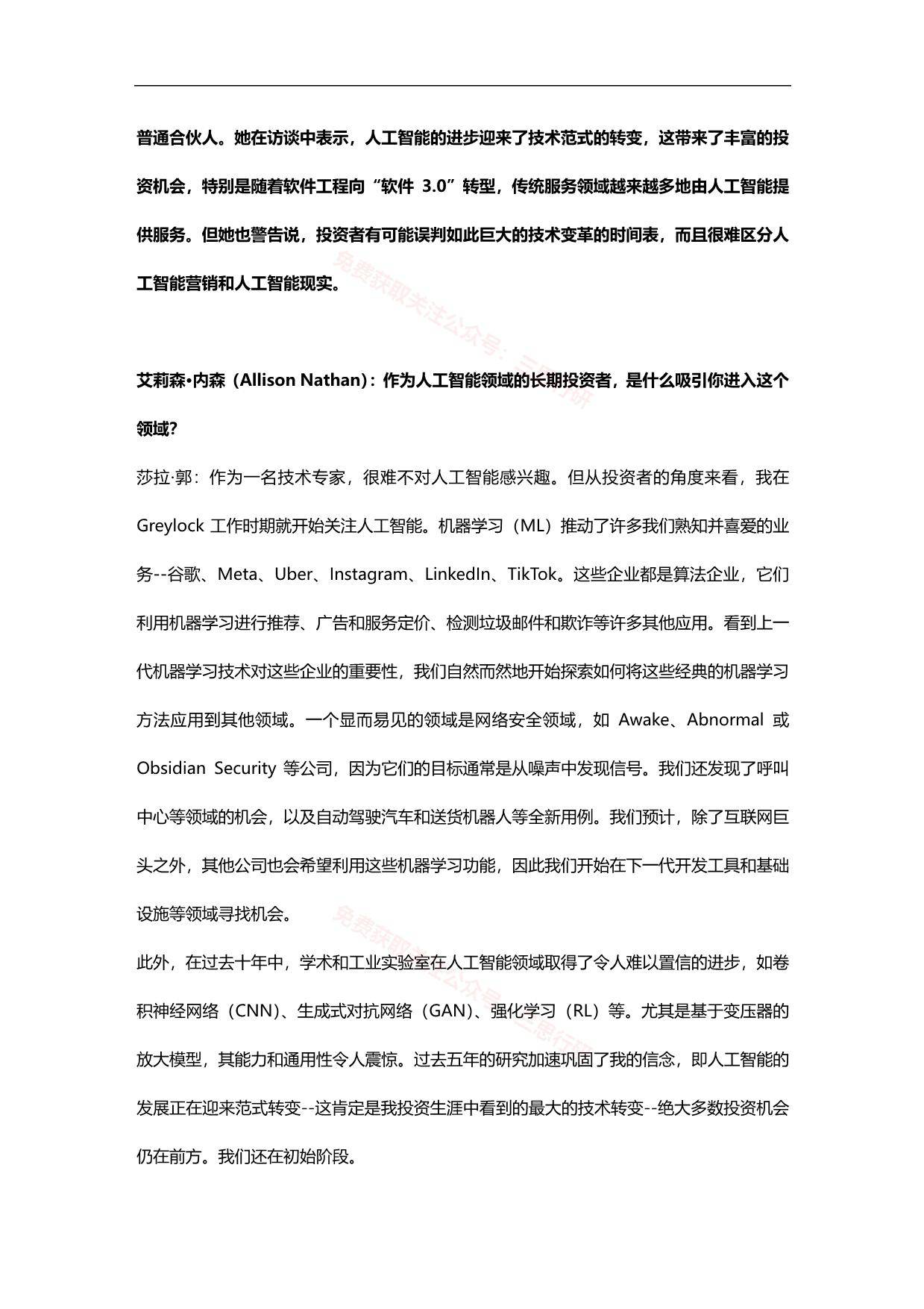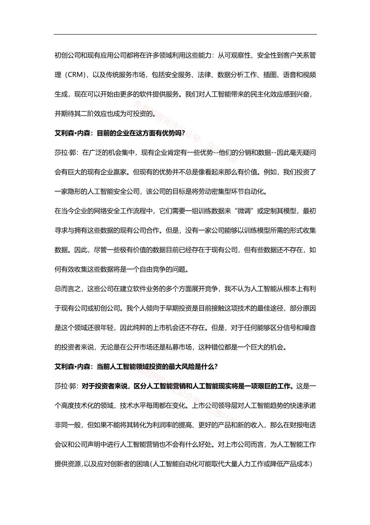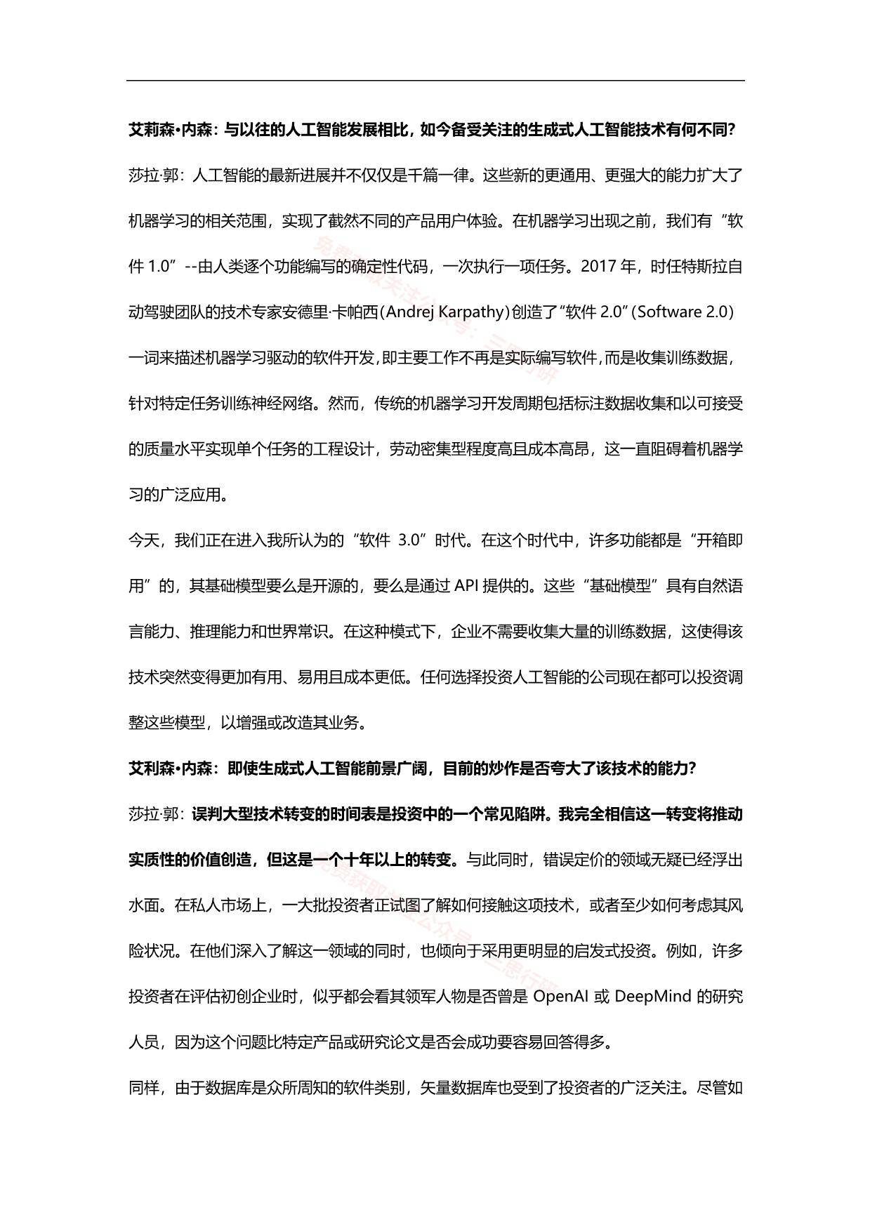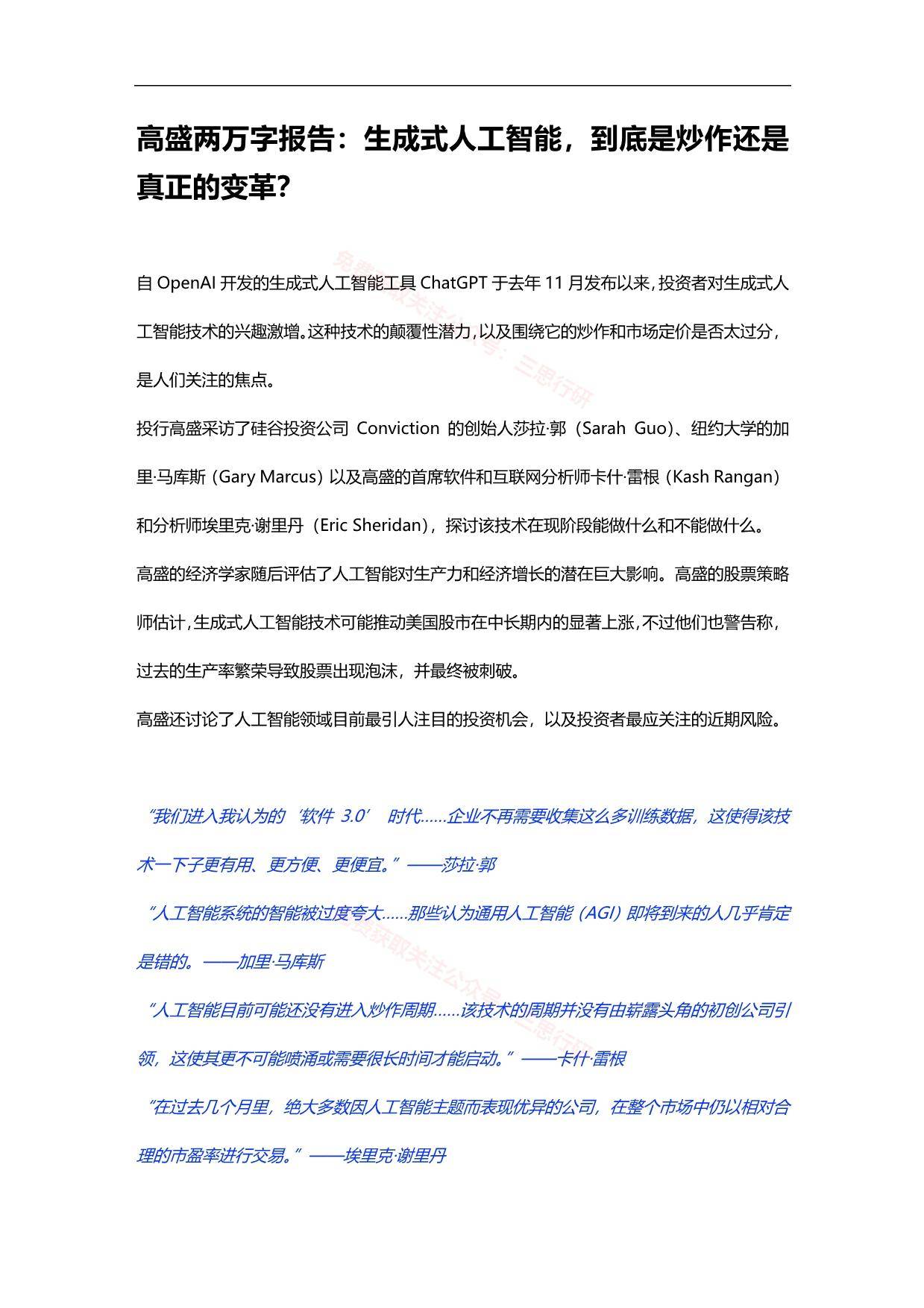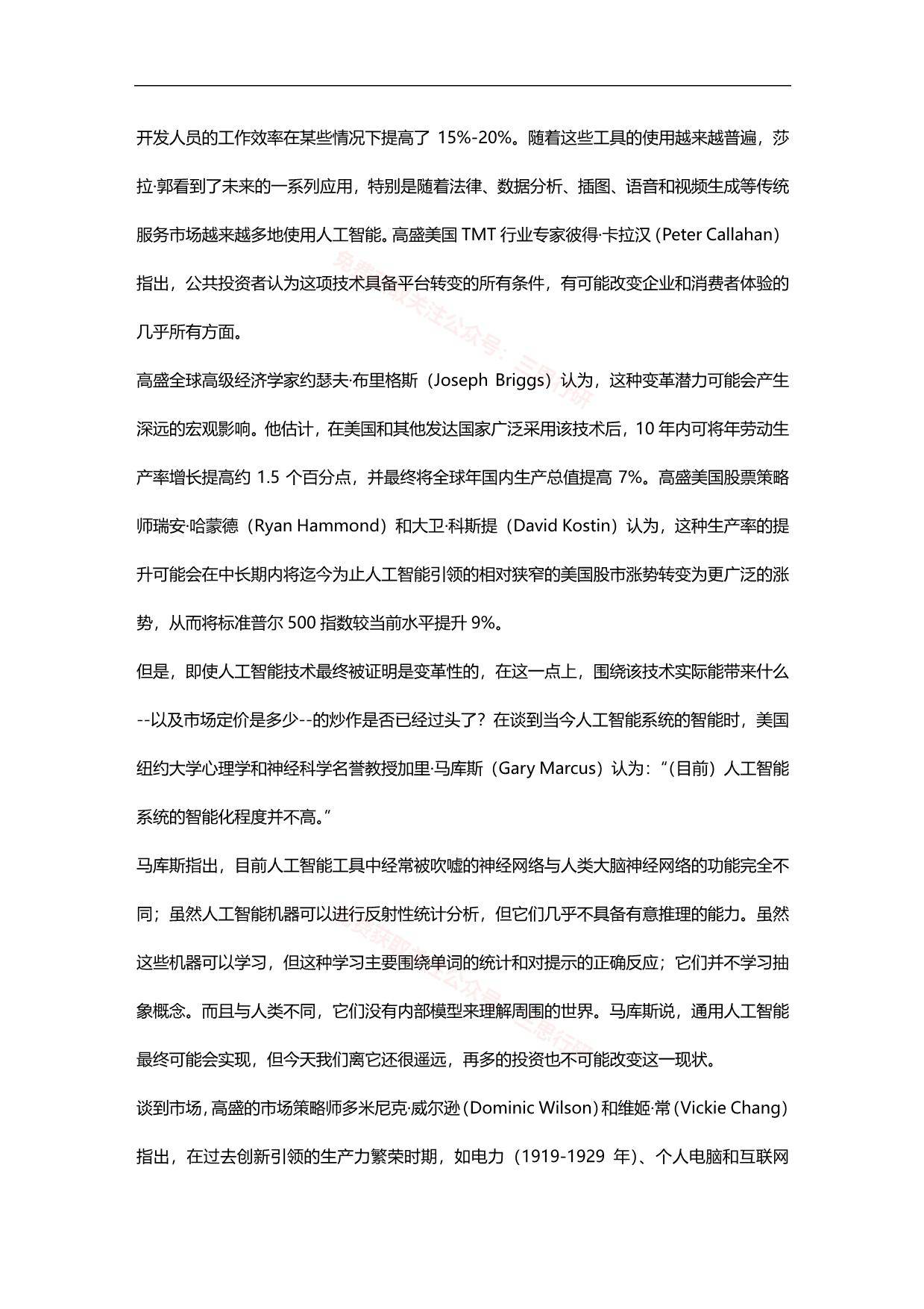 自OpenAI开发的生成式人工智能工具ChatGPT于去年11月发布以来,投资者对生成式人工智能技术的兴趣激增。这种技术的颠覆性潜力,以及围绕它的炒作和市场定价是否太过分,是人们关注的焦点。 投行高盛采访了硅谷投资公司Conviction的创始人莎拉·郭(Sarah Guo)、纽约大学的加里·马库斯(Gary Marcus)以及高盛的首席软件和互联网分析师卡什·雷根(Kash Rangan)和分析师埃里克·谢里丹(Eric Sheridan),探讨该技术在现阶段能做什么和不能做什么。 高盛的经济学家随后评估了人工智能对生产力和经济增长的潜在巨大影响。高盛的股票策略师估计,生成式人工智能技术可能推动美国股市在中长期内的显著上涨,不过他们也警告称,过去的生产率繁荣导致股票出现泡沫,并最终被刺破。 高盛还讨论了人工智能领域目前最引人注目的投资机会,以及投资者最应关注的近期风险。 “我们进入我认为的‘软件3.0’ 时代……企业不再需要收集这么多训练数据,这使得该技术一下子更有用、更方便、更便宜。”——莎拉·郭 “人工智能系统的智能被过度夸大……那些认为通用人工智能(AGI)即将到来的人几乎肯定是错的。——加里·马库斯 “人工智能目前可能还没有进入炒作周期……该技术的周期并没有由崭露头角的初创公司引领,这使其更不可能喷涌或需要很长时间才能启动。”——卡什·雷根 “在过去几个月里,绝大多数因人工智能主题而表现优异的公司,在整个市场中仍以相对合理的市盈率进行交易。”——埃里克·谢里丹 目录 一、宏观新闻和观点 二、生成式人工智能:是炒作还是真正的变革? 三、采访人工智能风投——莎拉·郭 四、采访人工智能专家学者——马库斯 五、详解人工智能 六、人工智能发展史 七、分析师——关于人工智能的讨论 八、人工智能对经济的潜在巨大影响 九、美国股市:衡量人工智能上行空间 十、过去生产力繁荣时期的市场 报告内容节选如下: ![]() ![]() ![]() ![]() ![]() ![]() ![]() ![]() ![]() ![]() ![]() ![]() ![]() ![]() ┃ 免责声明:本文版权归原发布机构及作者,如涉及侵权请联系删除。本文仅供参考,如需使用相关信息请参阅报告原文。 ┃ 获取PDF完整版报告下载方式请关注:报告派 |