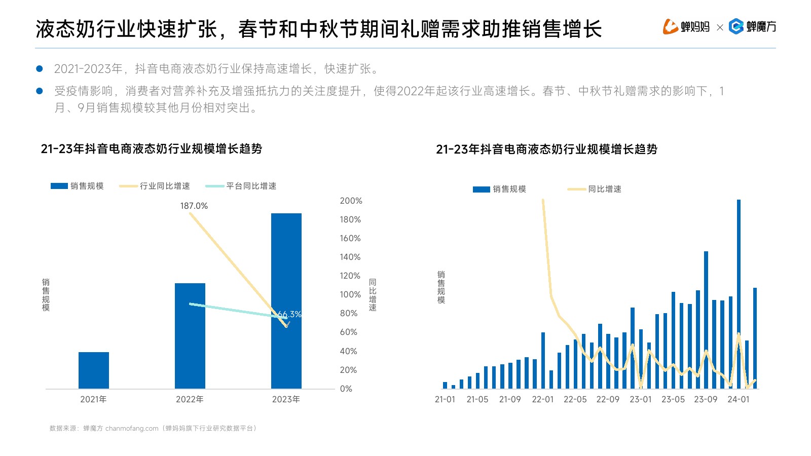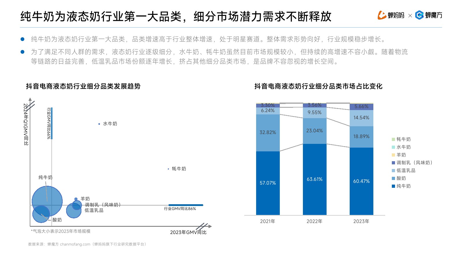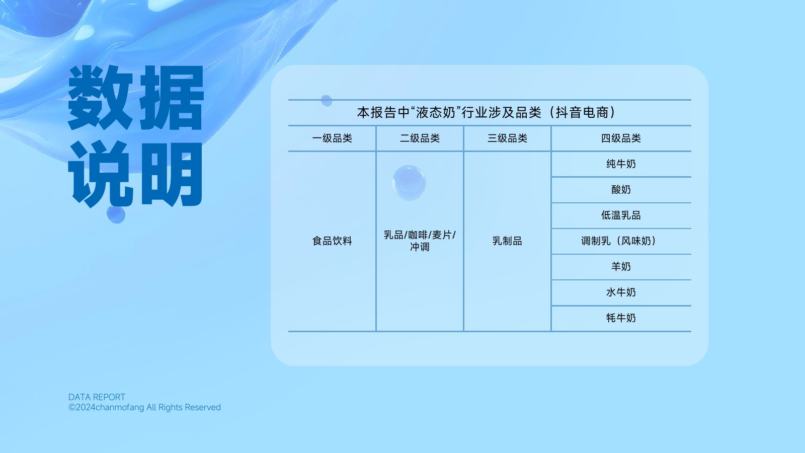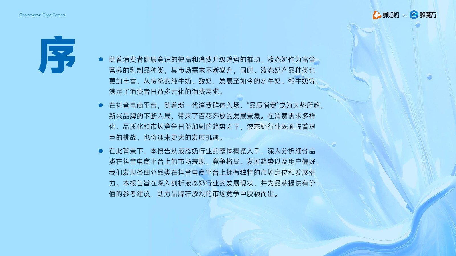 | 随着消费者健康意识的提高和消费升级趋势的推动,液态奶作为富含营养的乳制品种类,其市场需求不断攀升,同时,液态奶产品种类也更加丰富,从传统的纯牛奶、酸奶,发展至如今的水牛奶、牦牛奶等,满足了消费者日益多元化的消费需求。 在抖音电商平台,随着新一代消费群体入场,“品质消费”成为大势所趋,新兴品牌的不断入局,带来了百花齐放的发展景象。 在消费需求多样化、品质化和市场竞争日益加剧的趋势之下,液态奶行业既面临着艰巨的挑战,也将迎来更大的发展机遇。 在此背景下,本报告从液态奶行业的整体概览入手,深入分析细分品类在抖音电商平台上的市场表现、竞争格局、发展趋势以及用户偏好,我们发现各细分品类在抖音电商平台上拥有独特的市场定位和发展潜力。 本报告旨在深入剖析液态奶行业的发展现状,并为品牌提供有价值的参考建议,助力品牌在激烈的市场竞争中脱颖而出。