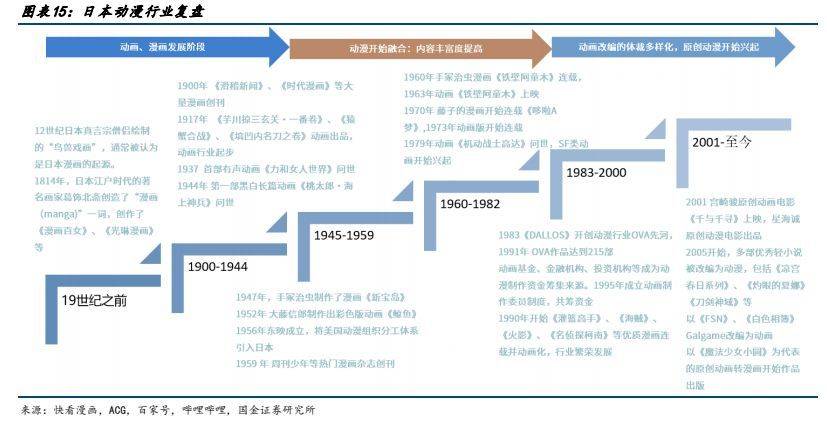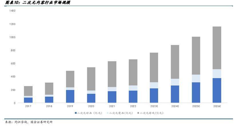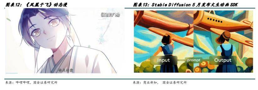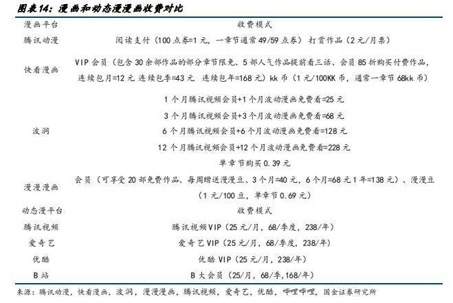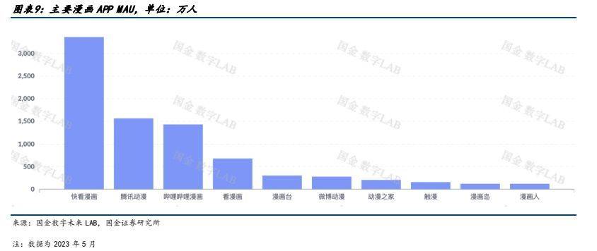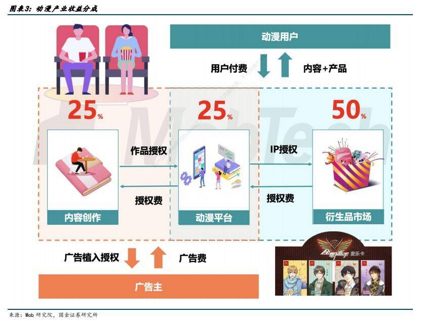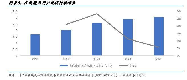 报告出品方:国金证券 以下为报告原文节选 ------ 一、漫画用户规模稳步提升,消费潜力有望释放 1.1 动漫产业链:国内动漫产业链逐渐完善,逐渐形成内容供给-内容分发-内容衍生的完整产业链 中国漫画经过多年历史发展,经历多个阶段,逐渐走向产业融合,以互联网在线平台为内容发放渠道,动漫化结合为产业新趋势。纵观来看:国内动漫发展主要按照有两条发展主线,1)按分发媒体来分,早期的漫画形式主要经历了单格漫画、多格漫画、连环画、漫画周刊、漫画单行本多次变革,但仍然以纸质媒体为呈现模式,读者需要购买纸质读本进行阅读。随 2014 年 4G 逐渐普及,移动互联时代兴起,漫画进入网络媒体分发时代以新浪微博、腾讯动漫、有妖气等在线国产漫画平台逐渐兴起。2)按内容呈现来看,早期动画和漫画内容较为割裂,动漫画内容皆为单独创作,后期随制作工艺提升,由漫画改变的动画逐渐占据市场主流,包括《火影》、《名侦探柯南》、《海贼王》等著名 IP,动画漫画深度融合形成“动+漫”产业格局。 产业链上中下游: 上游内容供给:主要指漫画作者、动画工作室、动画制作公司进行动画和漫画的创作和制作,决定动画和漫画的内核价值。 中游内容分发:主要指电影院线、电视台、在线视频平台、在线漫画平台、社交媒体、期刊等分发渠道进行动画和漫画的发布和推广,决定动漫作品的受众规模和影响力。 下游内容衍生:涉及到游戏、周边、主题公园等产品和服务,主要指动画和漫画的衍生产品和服务的开发和销售过程,决定了动漫作品的商业价值和持续性。 从变现模式来看:动画漫画行业已经形成了用户付费、广告营销和 IP 授权三种模式相结合的盈利体系。近年来,三种盈利模式逐渐完善,在用户付费方面:随着国内版权趋严,盗版打击力度增强,知识版权保护下用户付费有望提升。 广告营销变现上:广告植入模式日趋成熟,除了传统片头片尾广告营销场景,新增以小剧场场景作为广告植入,保障用户观体验。IP 授权上,随优质动漫 IP 价值逐渐提高,IP 影响力破圈,衍生品变现能力增强。 整体动漫产业盈利和产值集中于下游衍生品环节,而整体成本则位于中上游侧。根据《2019 动漫行业研究报告》,下游衍生品产值占比行业的 50%,上游创作者主要依靠稿费收入,中游动漫平台的收入多来自客户打赏付费、广告收费和 IP 版权授权,分占产业的总产值的 25%。从成本侧来看,费用主要集中在产业漫画创作和动画内容制作上、动画、原画、摄影、CG 处理等美术成本占比较高,人力成本其次,下游衍生品的制作成本和工艺成本通常不高。 1.2 用户端:二次元用户规模持续增长,为漫画行业提供强用户支撑 Z 世代用户规模增长,消费潜力逐步释放,推动二次元用户增长,在线漫画用户规模受益于整体行业增长。根据 Quest mobile,2022 年我国 Z 世代线上活跃用户规模已达 3.42 亿。Z 世代消费能力逐步增强,根据艺恩数据,我国 Z 世代用户有 40.8%为公司职员,36.6%为在校学生,学生党的月生活费多在 1000 元~2500 元;而职场人士的主要月收入在5000~15000 元。二次元为 Z 世代用户主要兴趣标签之一,用户规模及产业变现将受益于 Z 世代用户规模的扩大和消费能力的增强。根据灼识咨询,2021 年,中国泛二次元用户已经达到 4.6 亿,2026 年有望达到 5.3 亿,2022 年在线漫画行业用户规模已达到 3.04 亿,二次元用户规模的扩大有望为漫画行业提供用户支撑。 根据国金数字 LAB,目前国内主要漫画 APP 中快看漫画、腾讯动漫、哔哩哔哩漫画为第一梯队, 2023 年 5 月 MAU 分别为 3364、1566、1429 万人。 1.3 二次元漫画市场规模保持高速增长,动态漫有望打开新空间 根据灼识咨询,二次元内容行业 2017~2021 年 5 年复合增速达到 25.7%,其中 2021 年二次元漫画市场规模达到 63.2亿元,5 年复合增速达到 26.5%,未来随着二次元用户群体付费能力的提升,有望维持较高增速。目前我国国产漫画的定价水平较低,利润空间不高。根据虎嗅,国产漫画一话只要 6~8 毛钱甚至更低就能永久阅读,韩国漫画一话的定价普遍介于 1~2 元,日本漫画定价更高,平均一话漫画需要花费 5~6 元。 网文漫改动态漫有望增强 IP 价值,加速 IP 变现。动态漫是一种平面漫画与动态元素相结合的动画表现形式,在漫画图片的基础上,进行一定的动作处理,令漫画中的人物或事物可以做出简单的动作,同时加入旁白、对话和背景音乐等辅助效果,超脱原有静态限制,使得漫画的表现力更强。和动画相比,动态漫因为仅仅对简单动作和部分画面进行动态元素的处理,从连贯性和画面精细化要求比动画更低,考虑制作成本、制作工艺难度,动态漫的制作转化效率相比动漫更高。目前我国网文资源丰富,写手众多,头部 IP 内容公司握有大量优质 IP,随目前大模型发展有望快速实现文字至漫画端、漫画端向动态漫/动漫的转变,例如 Stable Diffusion 5 月发布的新 SDK 已经支持,文本转动画、文本+图转动画、视频+文本输入转动画三种创建动画的形式。 成本:漫画目前存在的问题原画成本高昂,受制于国内后付费模式的影响,漫画产业通常难以收回成本或成本回收周期较长,动态漫相较动漫制作成本较低的同时,商业化的产品标准及制作时长也更短。根据骨朵数据,市面上普通动画的成本是 2 万元/分钟起步,优质动画的制作价格在 3~5 万元/分钟,更高的在每分钟 5 万到 10 万,一季动画