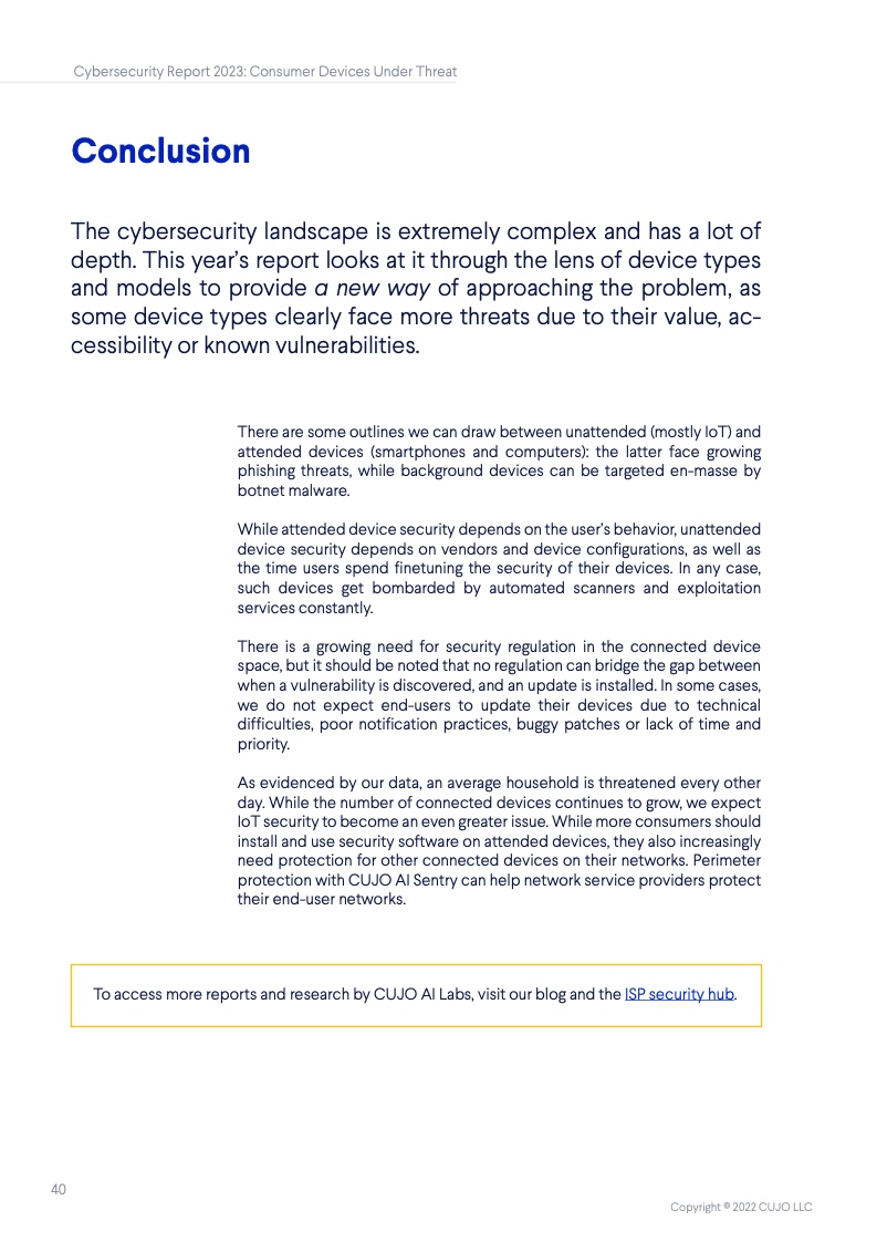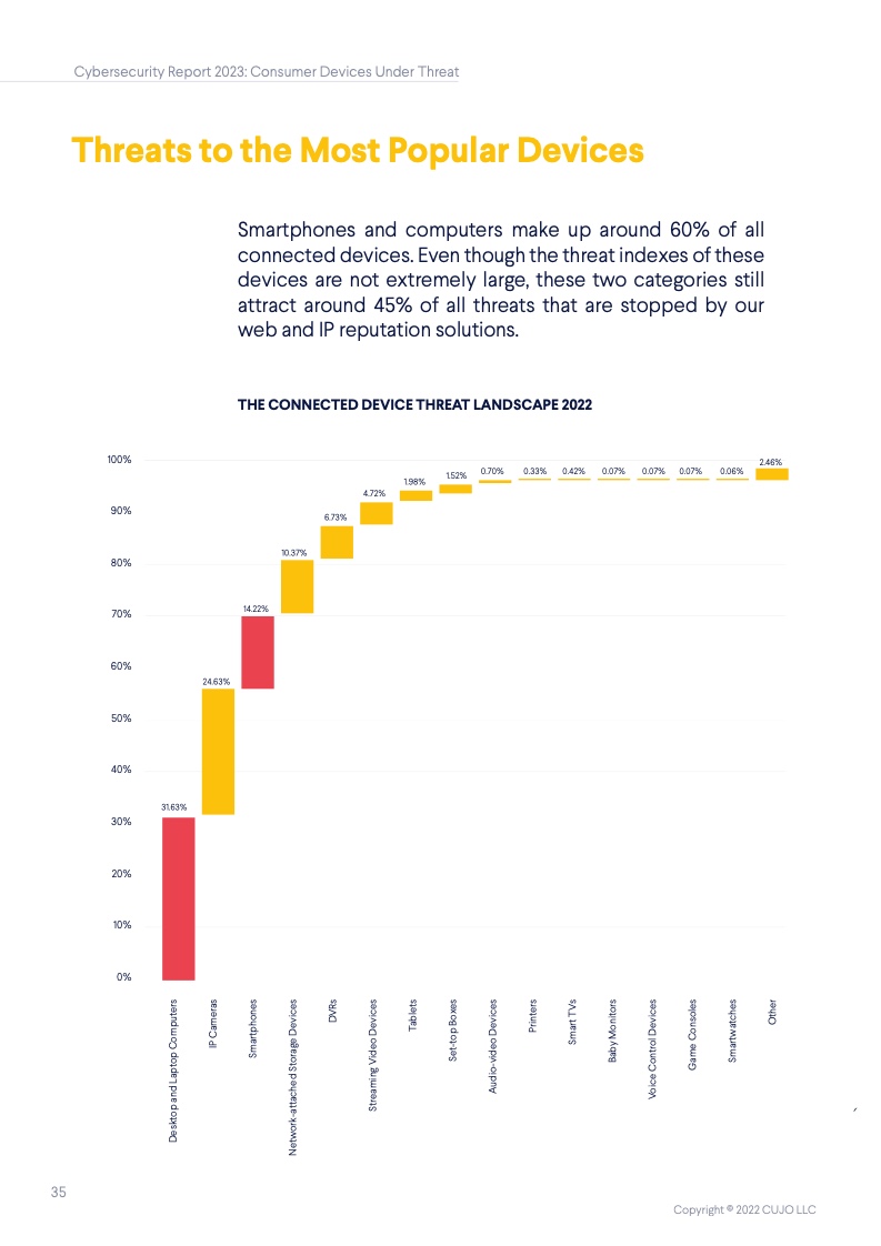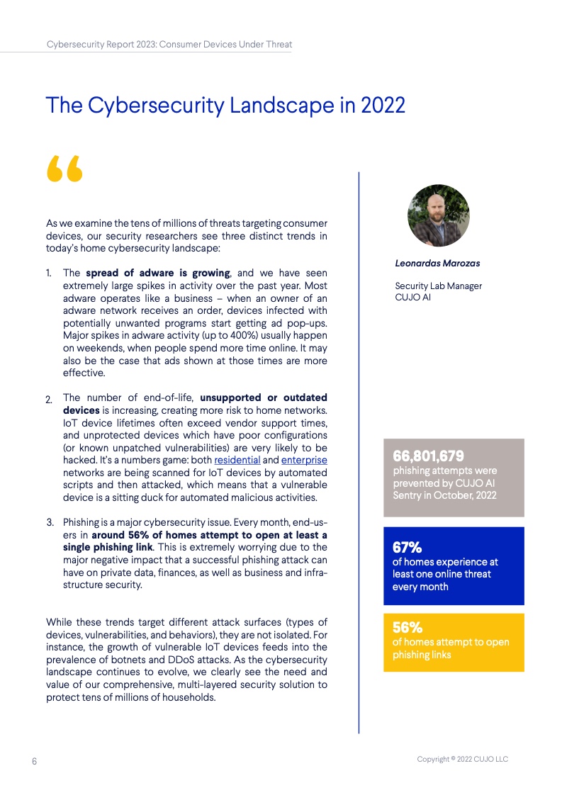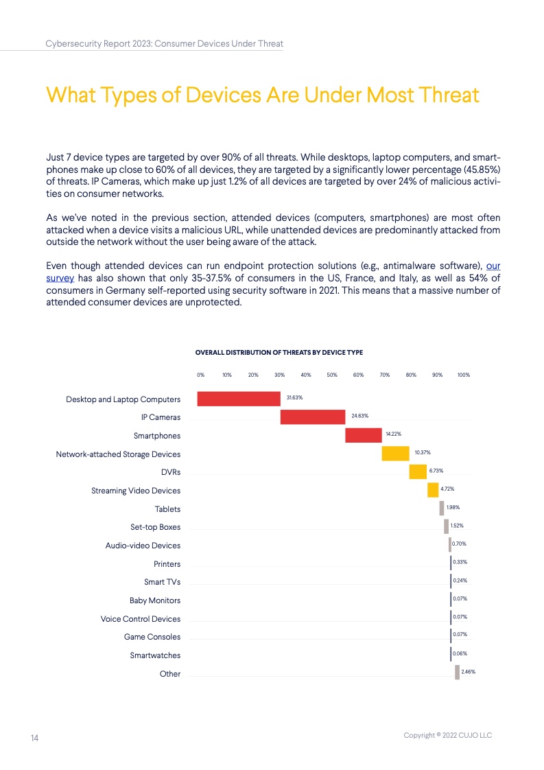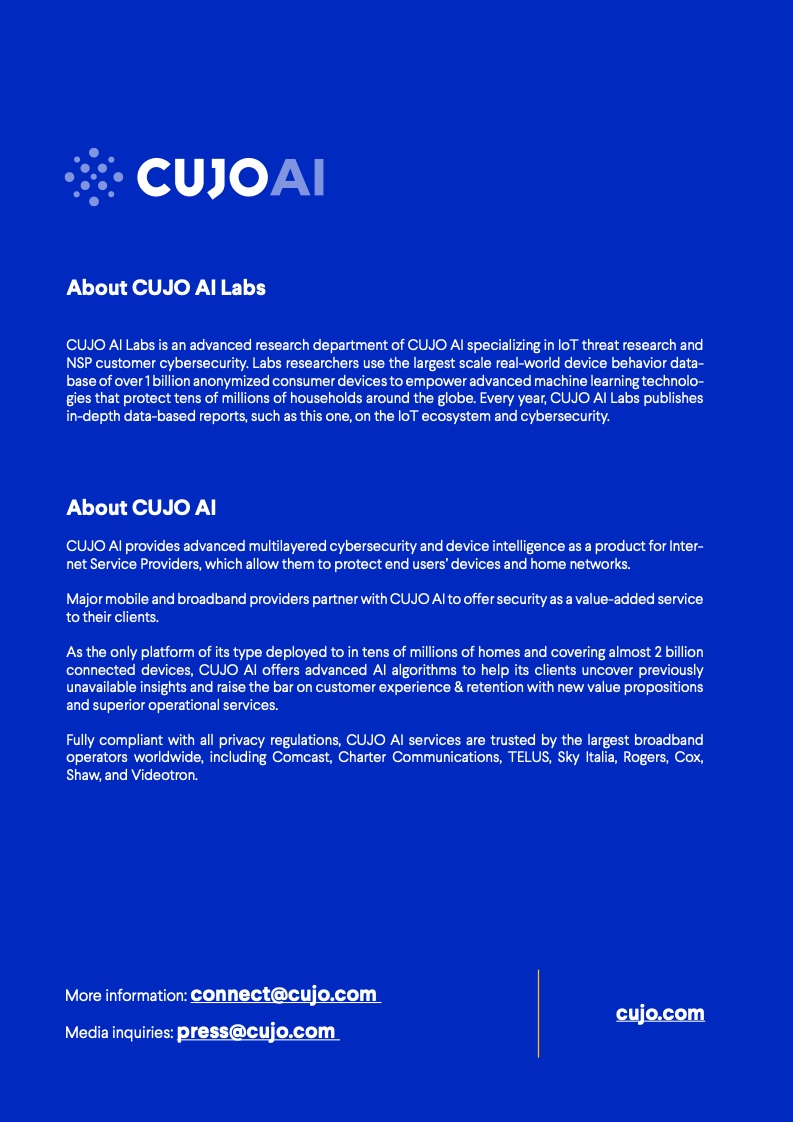 根据CUJO AI实验室的研究,这一数字高达67%。这些家庭网络的安全,对于互联网整体的健康和韧性来说至关重要,但到底是谁该承担起保护它们的重任? 随着消费者使用的联网设备越来越多,家庭网络的保护越发变得困难,其中有许多设备甚至都无法运行网络安全软件。 由于每个设备都有不同的攻击面和漏洞,消费者设备的日益多样化正在改变网络安全的整体格局。物联网(IoT)设备最常受到来自恶意IP地址的自动攻击,而用于网络浏览和程序应用的设备则更常被恶意网站所影响。 IP信誉威胁是指用户网络与信誉低的IP地址之间的连接。无人值守设备(如物联网设备)最常面临这些威胁,它们大多是自动化的,不需要用户操作。 网络信誉威胁则包括各种可以被用户、电子邮件客户端或其他软件访问的恶意网络链接。这些类型的威胁对于需要用户投入注意力的设备(如智能手机、笔记本电脑和台式电脑)是最为普遍的,因为设备所有者会主动地使用它们。 从整体上看,对家庭网络的威胁包括有针对性的社会工程(网络钓鱼)、恶意软件、僵尸网络、拒绝服务(DoS)攻击,以及基于网络扫描的自动攻击(自动扫描网络以寻找有价值的脆弱设备并攻击其安全软肋)。