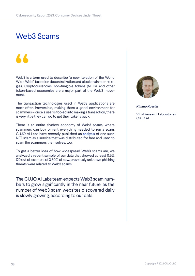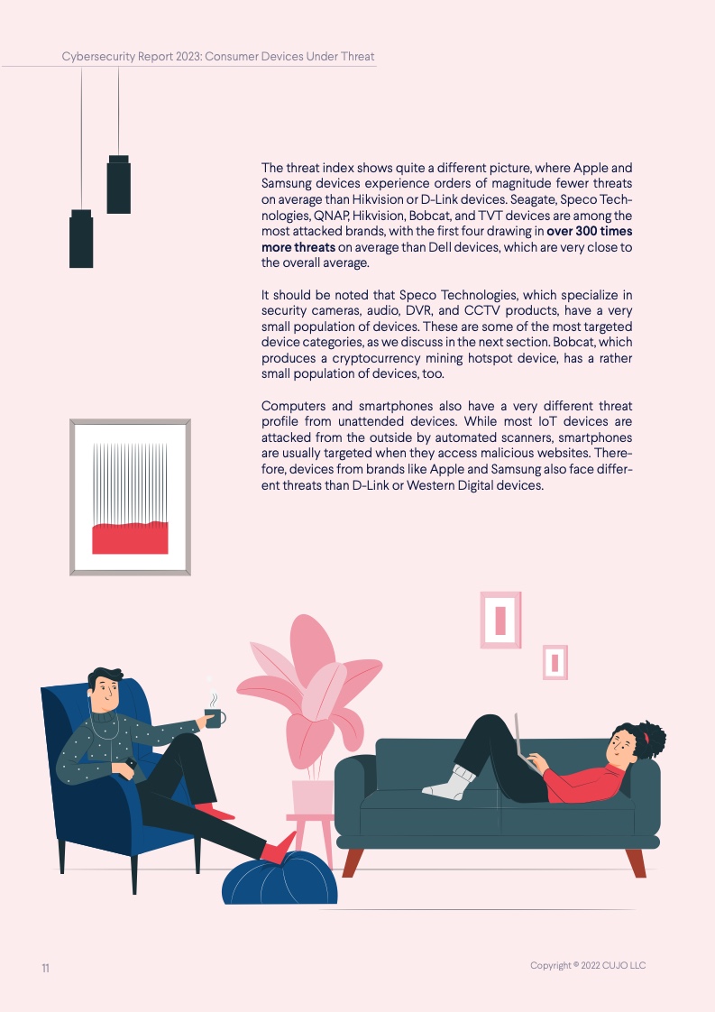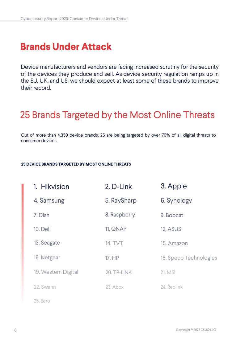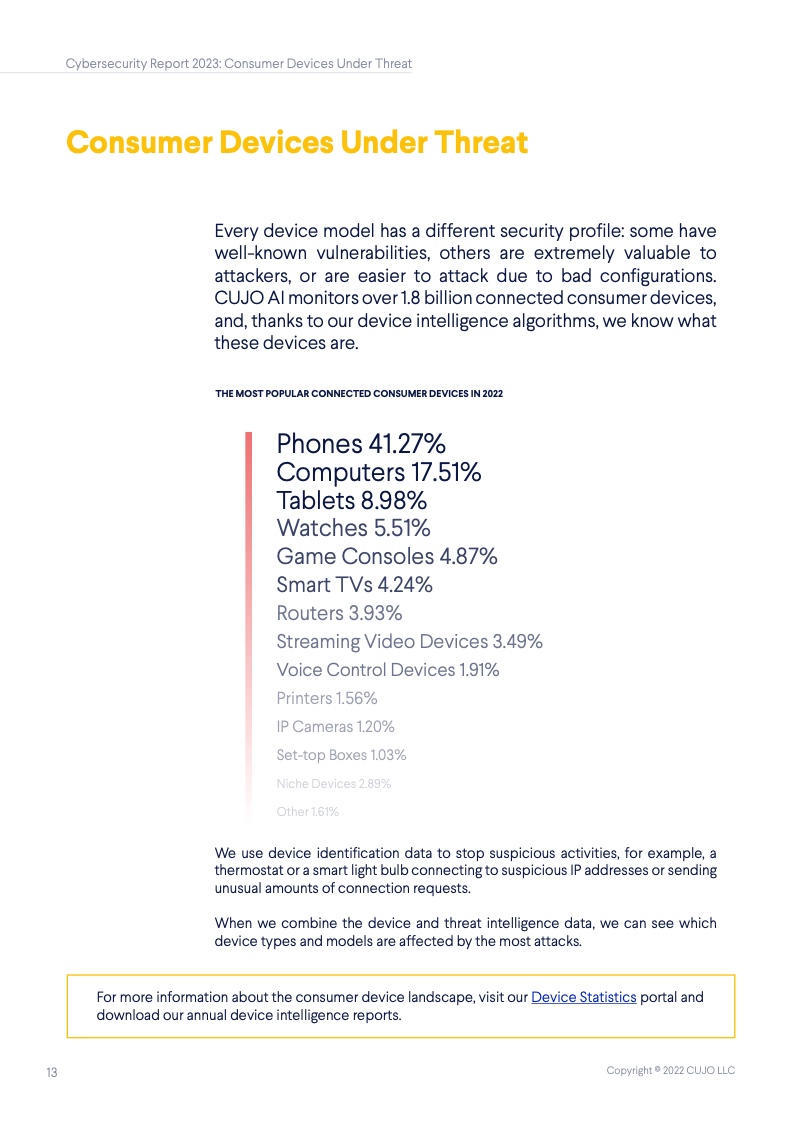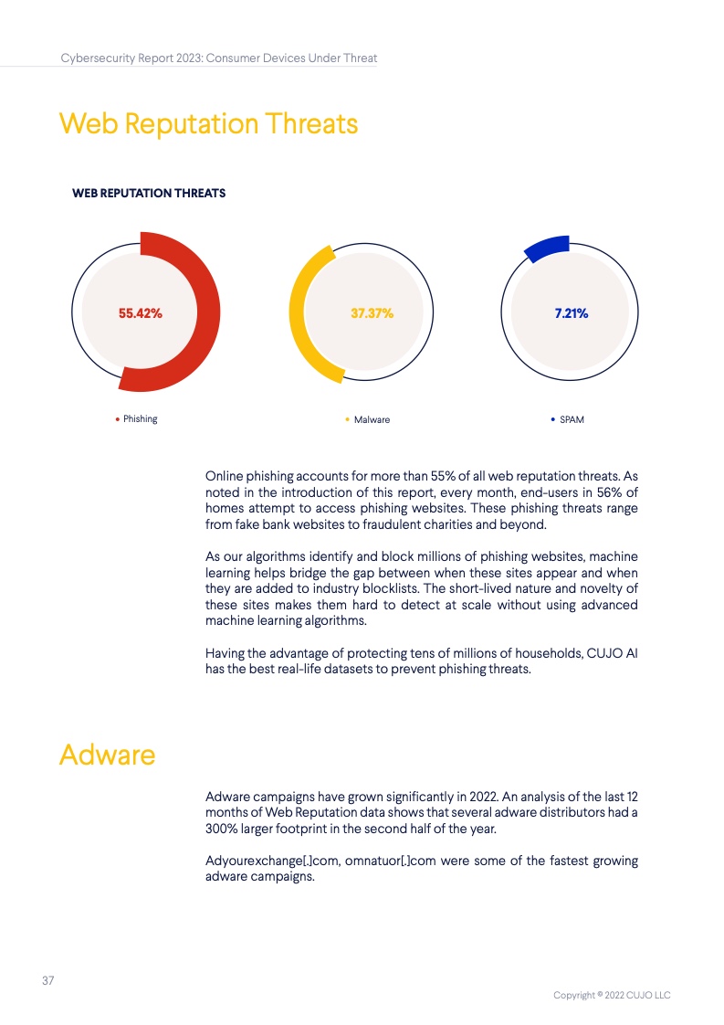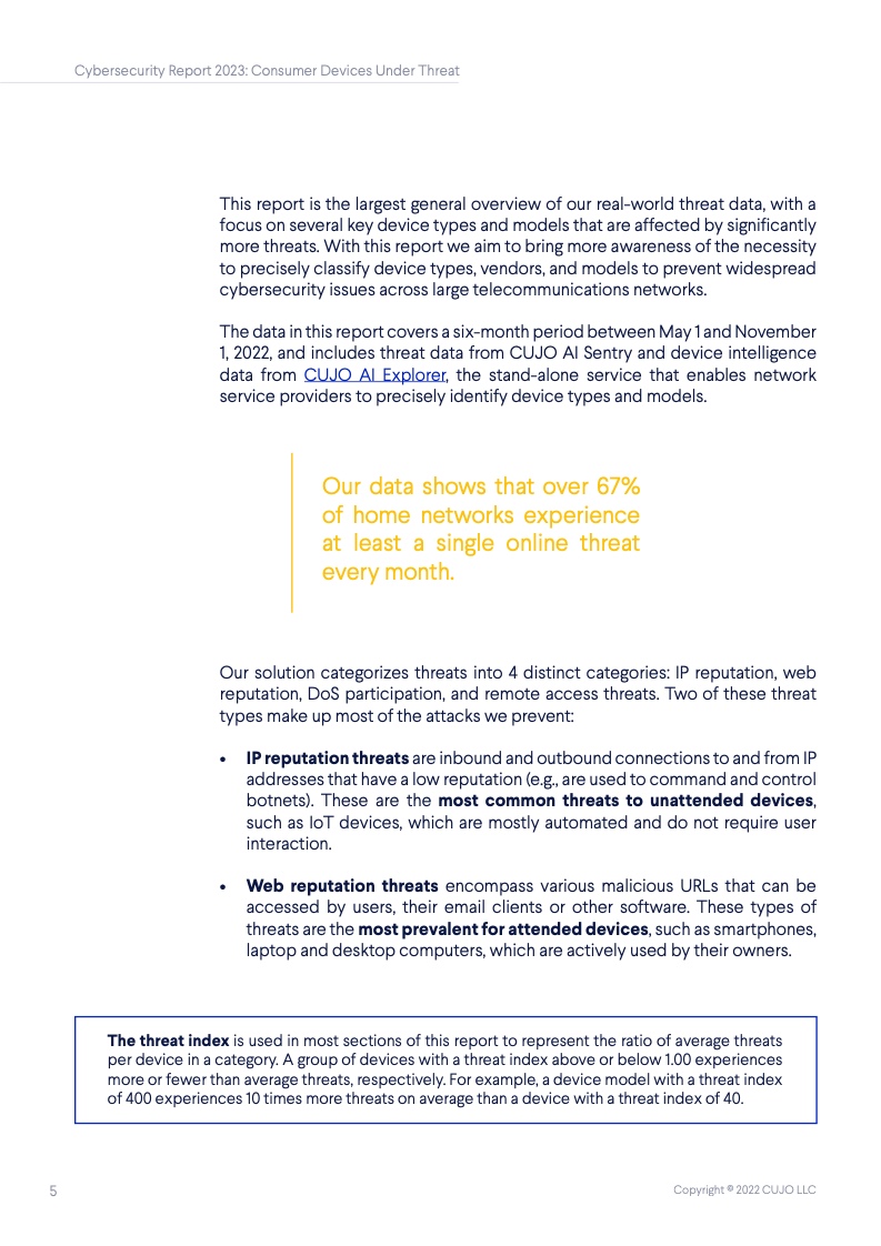 根据CUJO AI实验室的研究,这一数字高达67%。这些家庭网络的安全,对于互联网整体的健康和韧性来说至关重要,但到底是谁该承担起保护它们的重任? 随着消费者使用的联网设备越来越多,家庭网络的保护越发变得困难,其中有许多设备甚至都无法运行网络安全软件。 由于每个设备都有不同的攻击面和漏洞,消费者设备的日益多样化正在改变网络安全的整体格局。物联网(IoT)设备最常受到来自恶意IP地址的自动攻击,而用于网络浏览和程序应用的设备则更常被恶意网站所影响。 IP信誉威胁是指用户网络与信誉低的IP地址之间的连接。无人值守设备(如物联网设备)最常面临这些威胁,它们大多是自动化的,不需要用户操作。 网络信誉威胁则包括各种可以被用户、电子邮件客户端或其他软件访问的恶意网络链接。这些类型的威胁对于需要用户投入注意力的设备(如智能手机、笔记本电脑和台式电脑)是最为普遍的,因为设备所有者会主动地使用它们。 从整体上看,对家庭网络的威胁包括有针对性的社会工程(网络钓鱼)、恶意软件、僵尸网络、拒绝服务(DoS)攻击,以及基于网络扫描的自动攻击(自动扫描网络以寻找有价值的脆弱设备并攻击其安全软肋)。