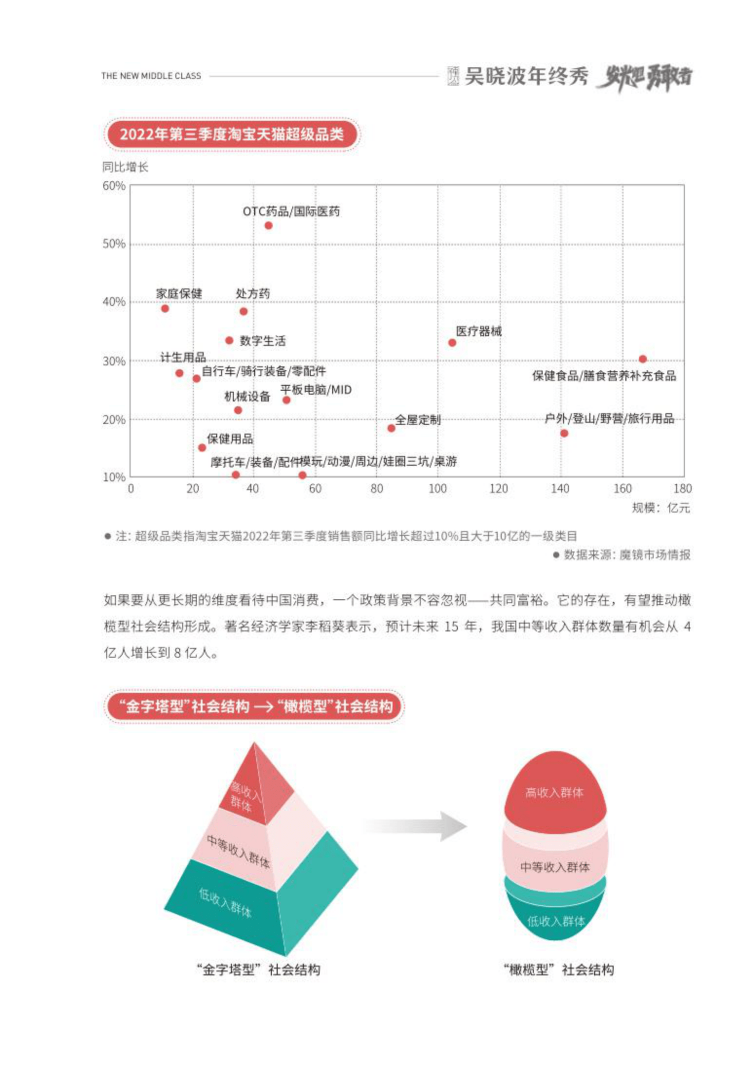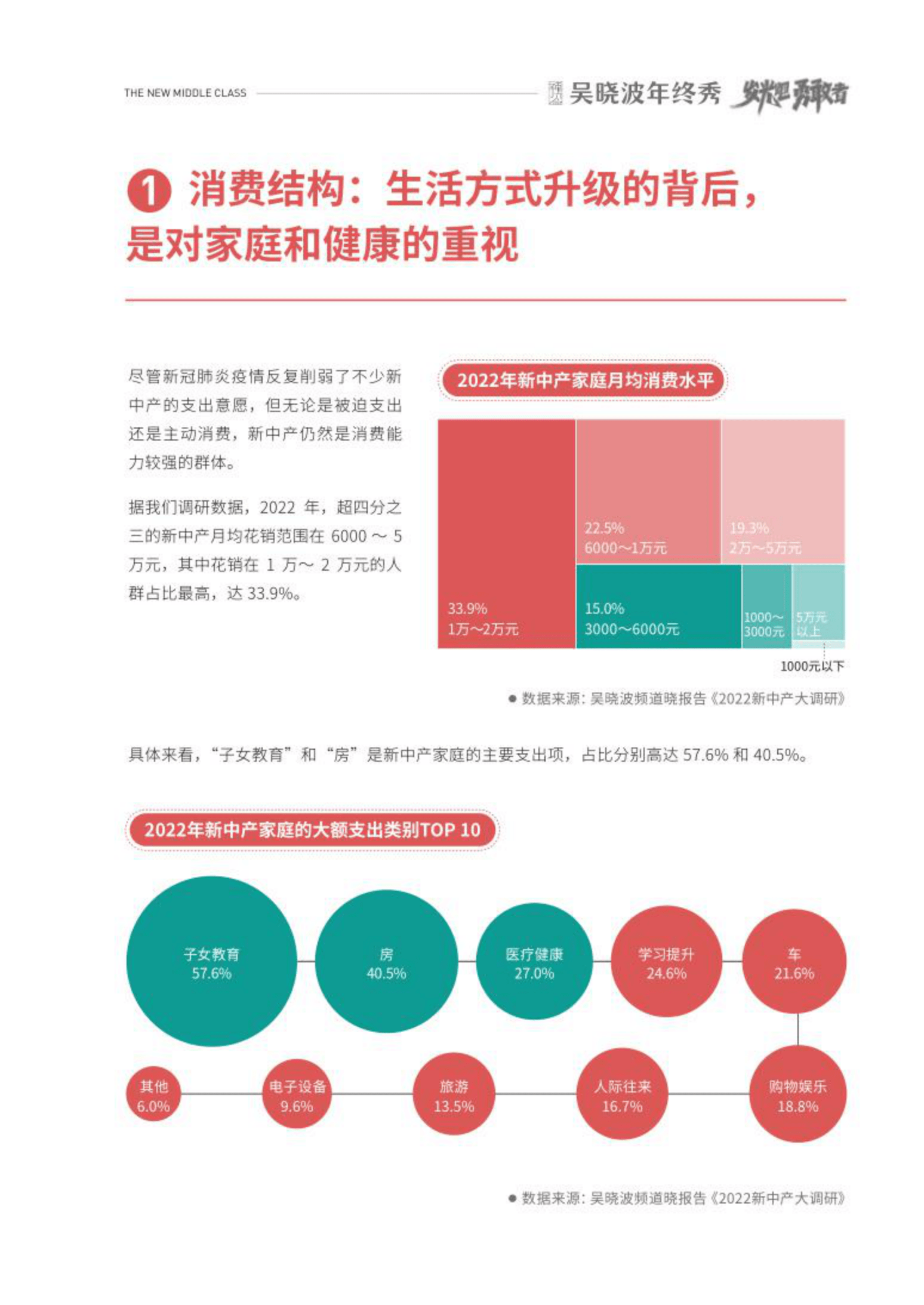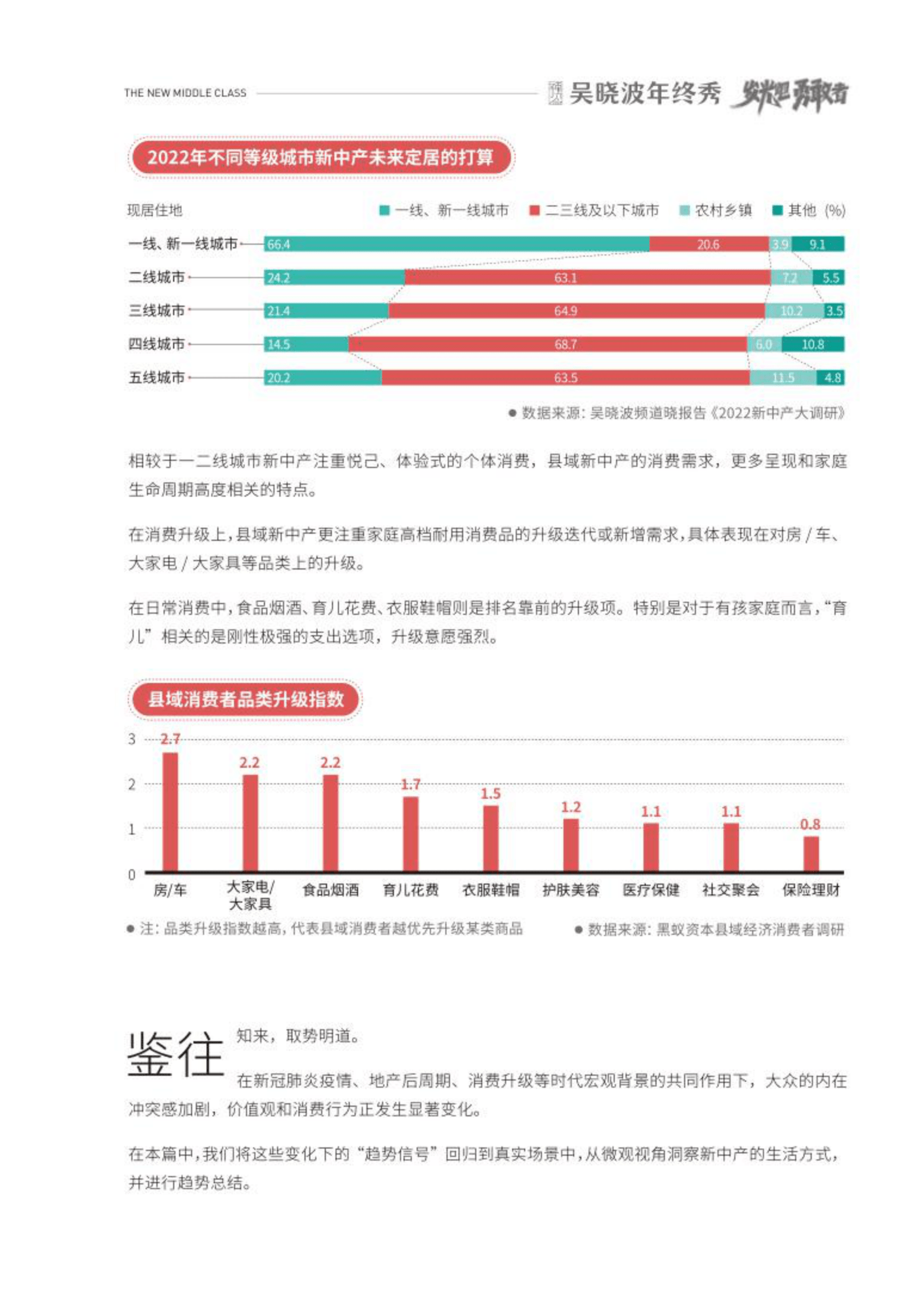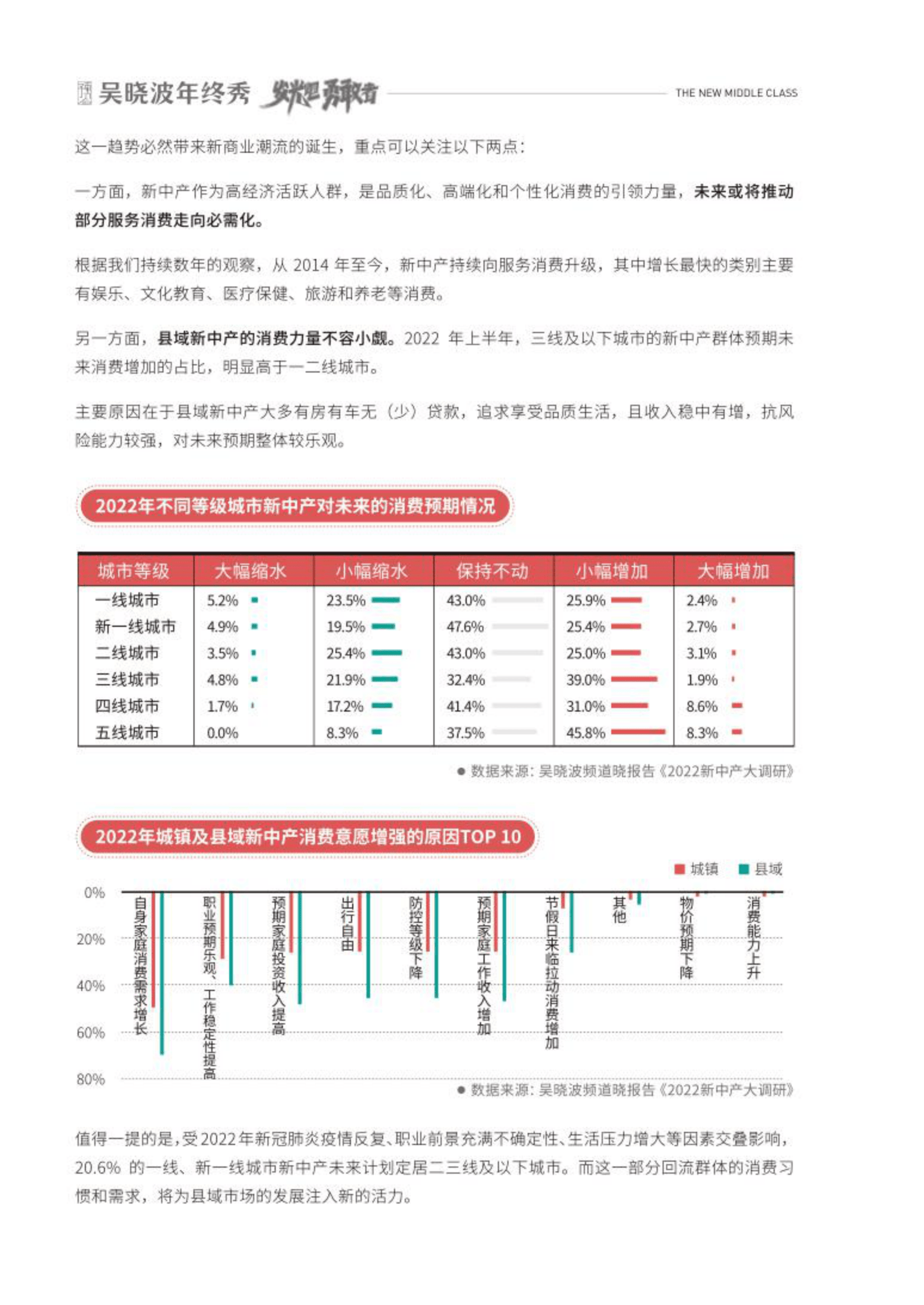 根据我们持续数年的观察,从2014年至今,新中产持续向服务消费升级,其中增长最快的类别主要有娱乐、文化教育、医疗保健、旅游和养老等消费。另一方面,县域新中产的消费力量不容小靓。2022年上半年,三线及以下城市的新中产群体预期末来消费增加的占比,明显高于一二线城市。