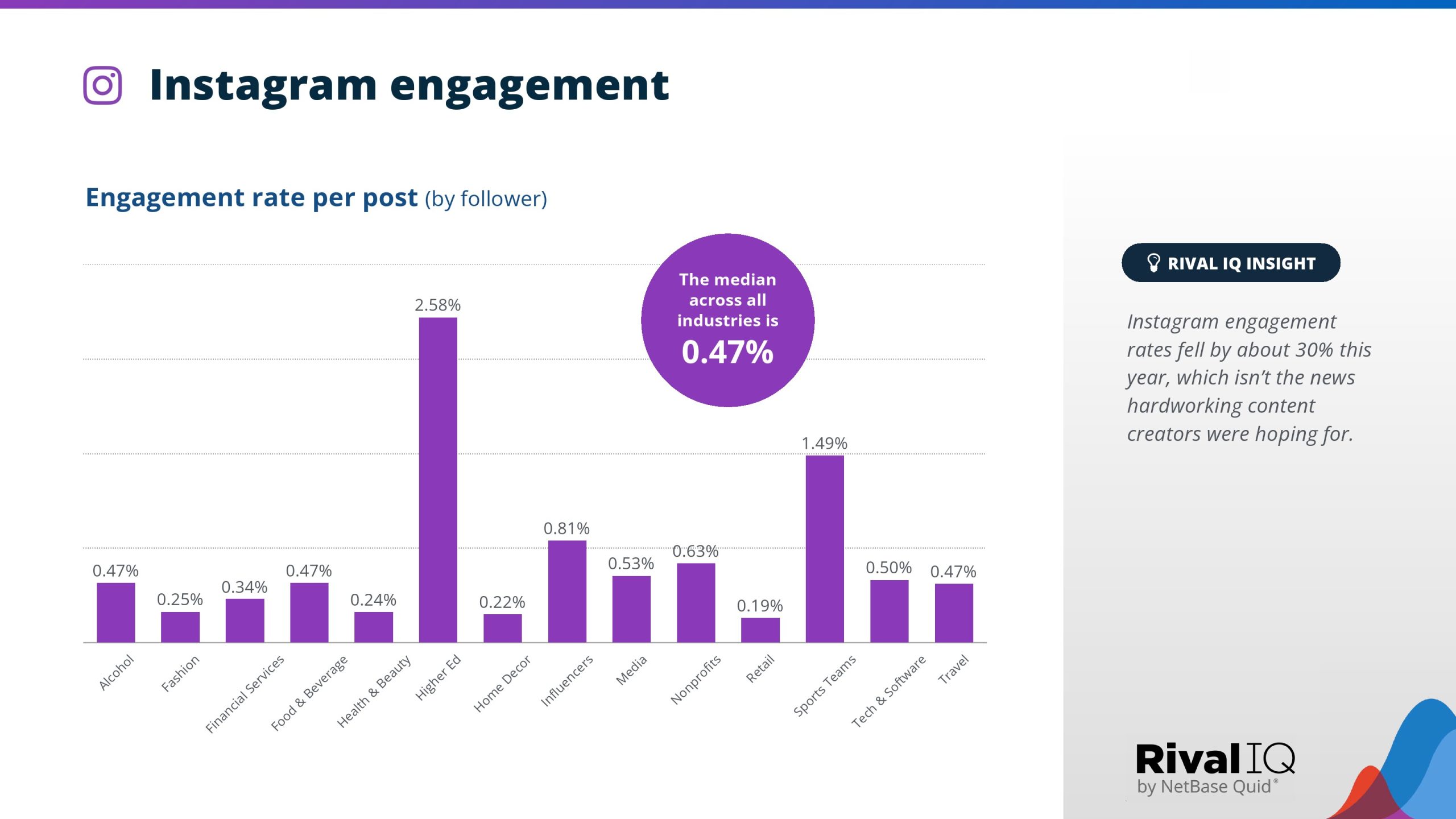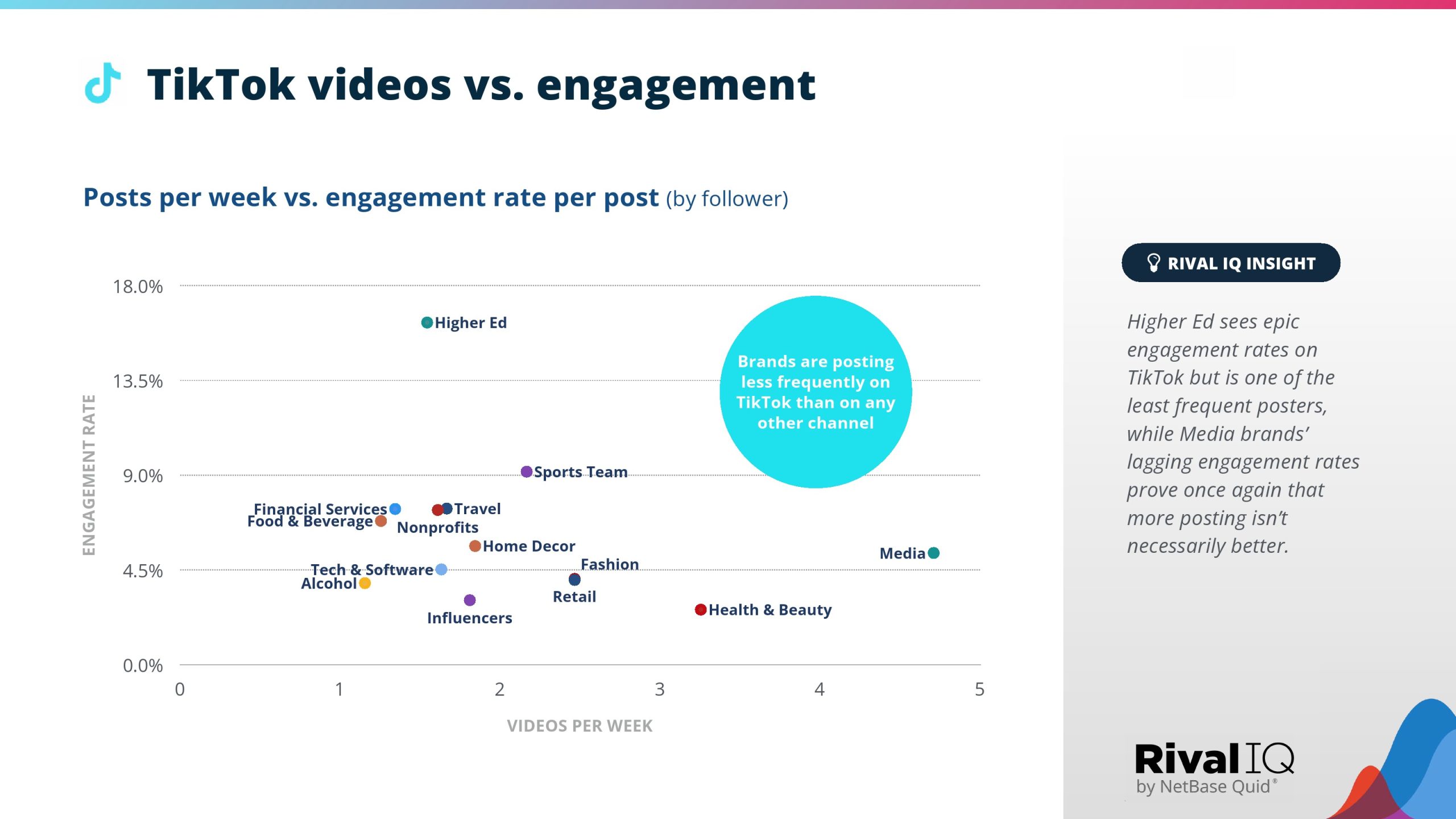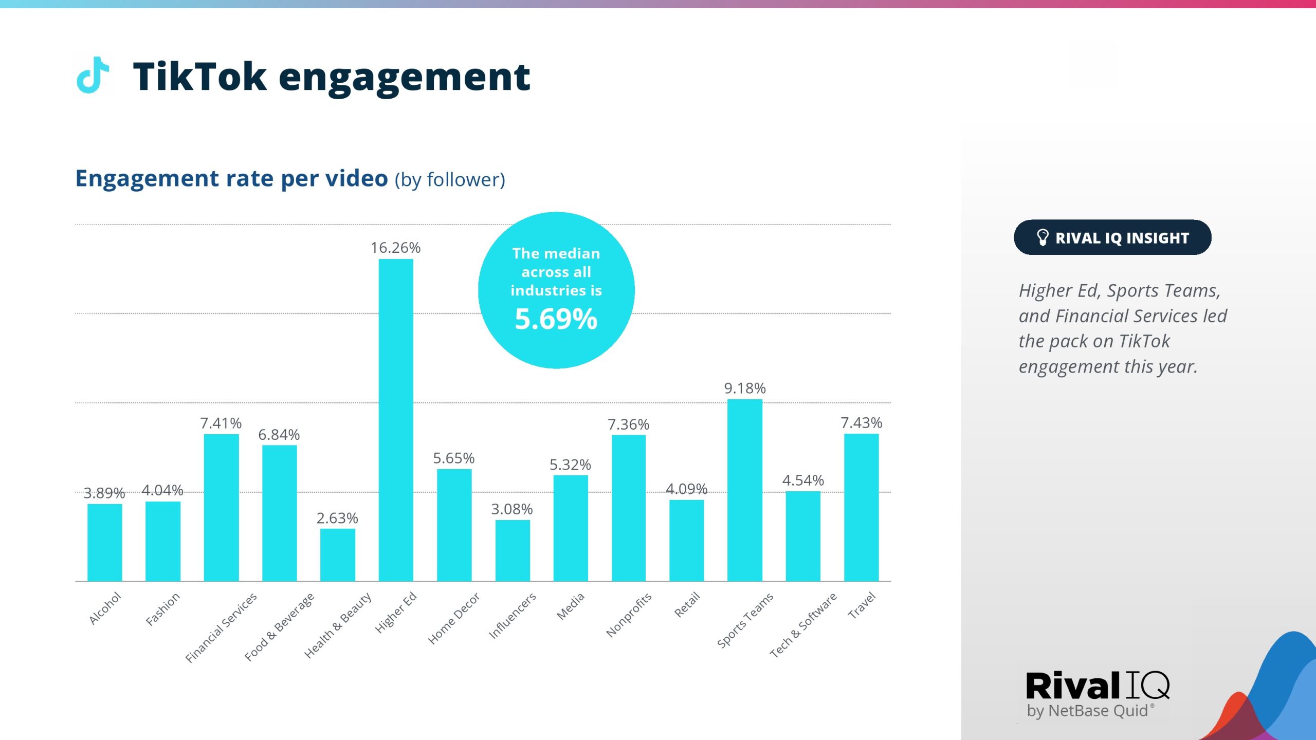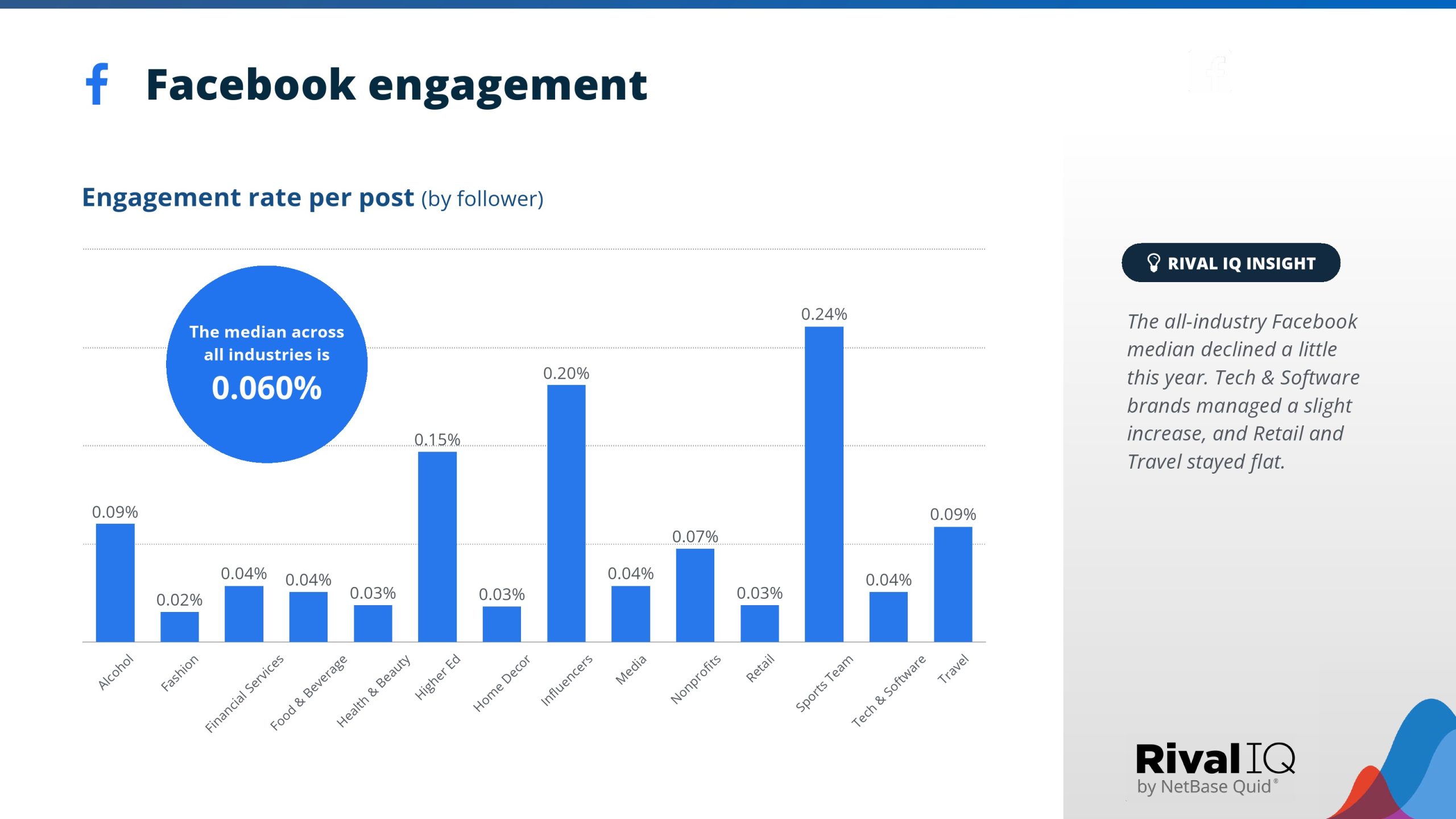 RivalIQ发布了“2023年社交媒体行业基准报告”。今年的品牌有机参与度有所下降。Instagram的参与度连续三年下降,但Facebook和Twitter的参与度保持稳定。 发布频率也在下降。Instagram上的发帖频率持平,但Facebook和Twitter上的发帖率下降了约20%。 这都是关于节日标签的。几乎每个行业都从节日主题帖子中获得了最高的参与度,而比赛和赠品则不如其他年份受欢迎。 每个品牌都应该在Instagram上发布Reels。Reels已经正式进入Instagram的聊天室,在最吸引人的帖子类型的竞争中,它取代了许多行业一直使用的Carousels。 TikTok在排行榜上名列前茅,平均参与度为5.69%,是今年各个行业最好的伙伴。 Facebook参与度 今年,全行业的Facebook中值略有下降。科技和软件品牌略有增长,零售和旅游保持平稳。 Facebook广告活动 今年,Facebook上的发帖频率中值下降了几个百分点。 Facebook帖子与互动 意见领袖(很少发帖)和运动团队(经常发帖)在Facebook上获得了一致的高分,尽管发帖频率有很大的差异。 Instagram互动率 今年,Instagram的互动率下降了约30%,这并不是勤奋的内容创作者所希望的。 Instagram广告活动 今年在Instagram上,所有行业的平均发帖频率都增长了一点点。 Instagram帖子与互动 尽管在Instagram上的发帖频率低于媒体,但高等教育显然是参与度的赢家,这表明在Instagram上更多并不总是更好,尽管第二名的运动业可能会有所不同。 Twitter参与度 Twitter上的参与度几乎持平,这提醒我们,有时没有消息就是好消息。 Twitter广告活动 今年,所有行业的平均发帖频率都下降了约20%,考虑到Twitter的动荡,这并不太令人惊讶。 推特推文与互动 今年,经常发推特的高等教育和运动团队在推特上遥遥领先,但并不是发帖频率越高就越好。