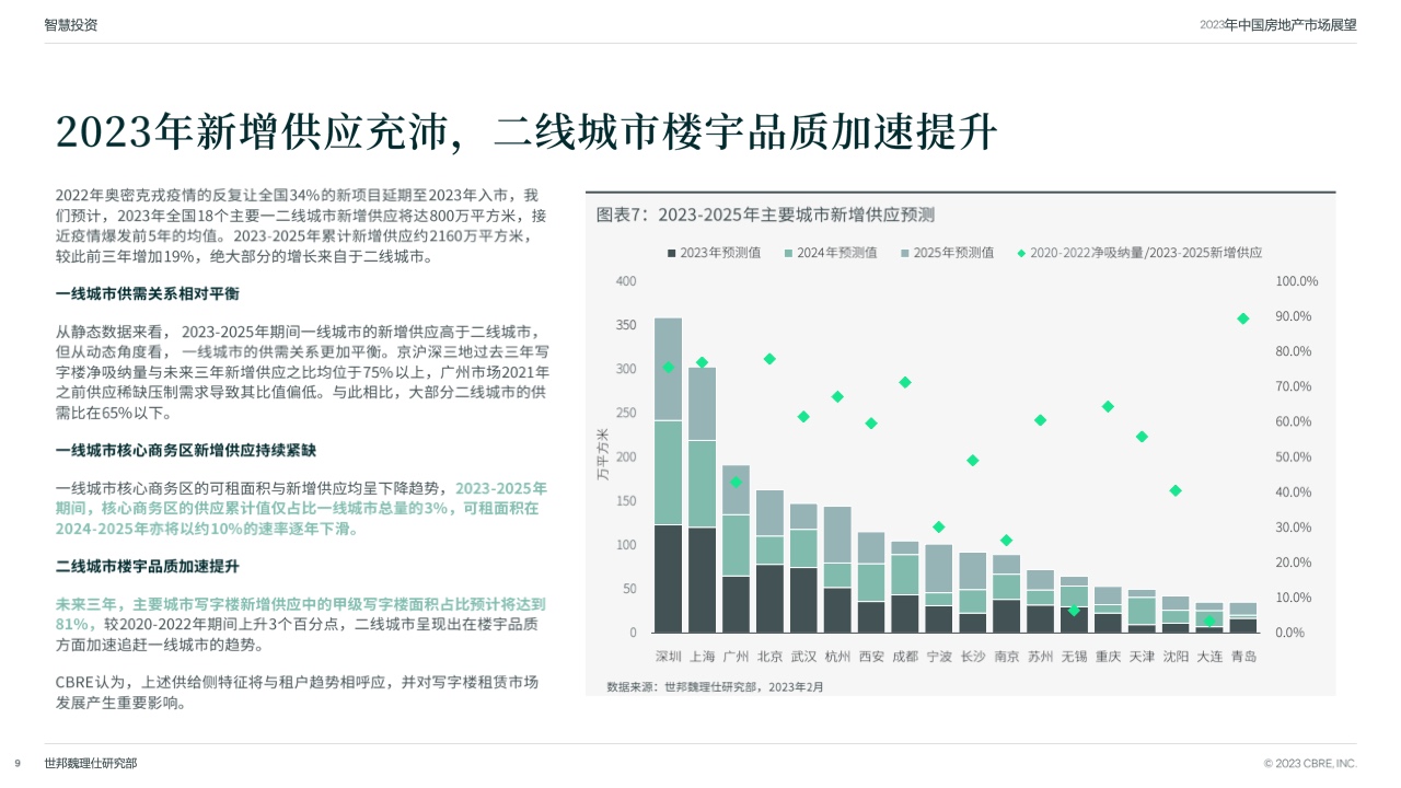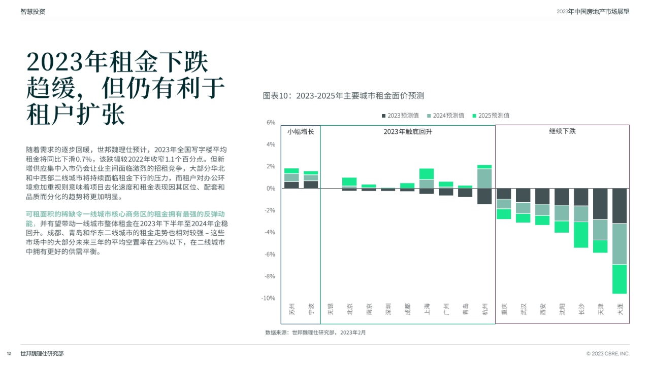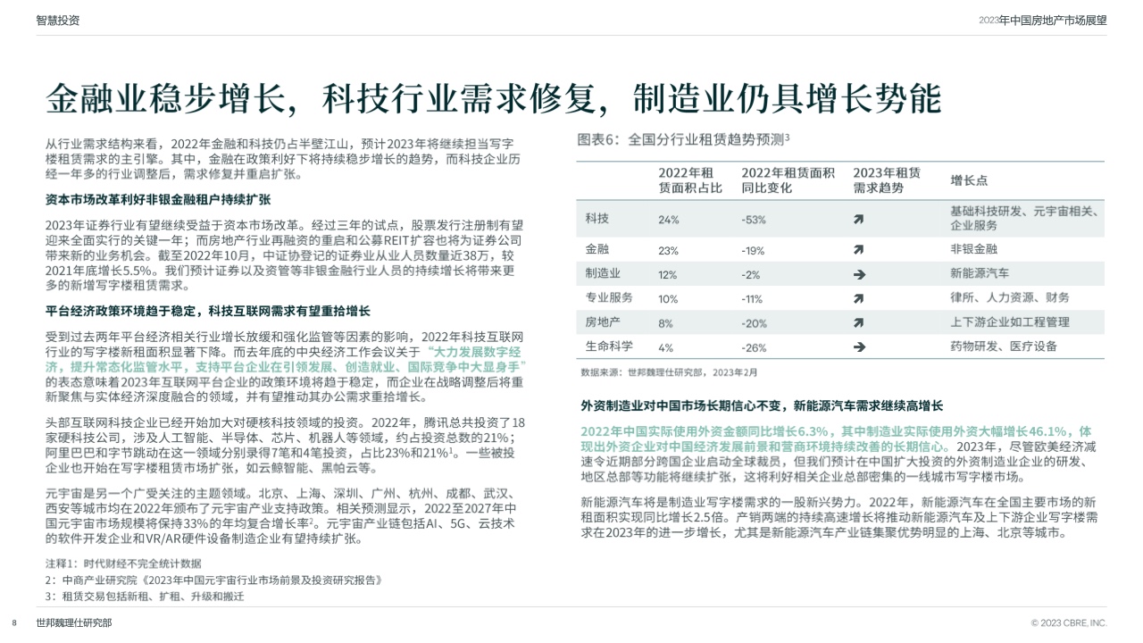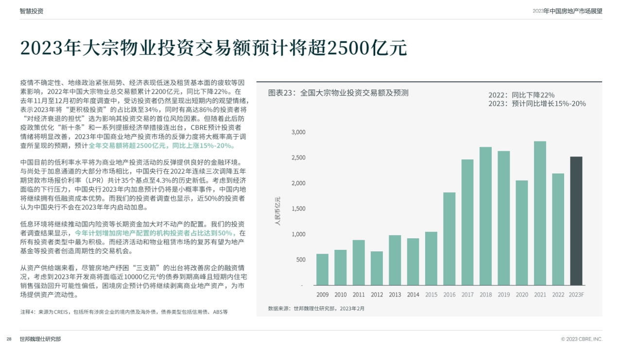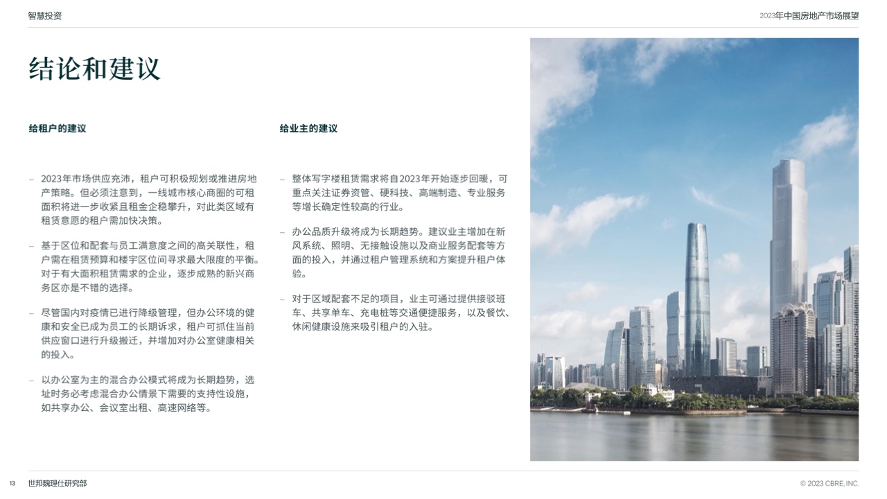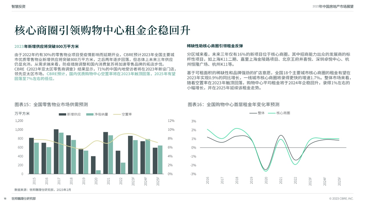 日前,CBRE世邦魏理仕发布《2023年中国房地产市场展望》报告指出,防疫措施的全面优化和全国感染率快速过峰成为2023年中国经济转折的关键动因,并有望大幅度提振商业地产市场表现。 其中,率先受益的消费和旅游市场在带动购物中心租金回温的同时,进一步利好仓储物流市场。经济动能和企业景气度的提升也将使写字楼市场需求企稳回升。与此同时,低息环境为商业地产投资活动的反弹提供了良好的金融环境,投资者情绪明显改善,预计2023年中国商业地产投资市场全年交易额超2500亿元,同比上涨15%-20%。 从写字楼市场看,租赁需求企稳回升。随着企业扩张信心增强,世邦魏理仕预计2023年写字楼租赁需求将于二季度企稳回升,全年有望实现500万平方米的净吸纳量。 受益于宏观经济刺激措施的金融、行业政策环境改善的科技互联网和房地产,以及防疫优化和经济复苏利好的下游服务业的写字楼需求有望出现明显提升。其中,金融和科技将继续担当写字楼租赁需求的主引擎。受外资对中国市场长期信心的利好,制造业仍具增长势能。 同时,随着消费市场回暖,同步推动优质零售物业需求反弹。世邦魏理仕预计,2023年全国主要城市优质零售物业新增供应将突破800万平方米。分区域来看,未来三年仅有16%的新项目位于核心商圈,基于可租面积的稀缺性和品牌强劲的扩店意愿,全国18个主要城市核心商圈的租金有望在2023年实现0.9%的同比增长。整体市场方面,购物中心平均租金将于2024年企稳回升。