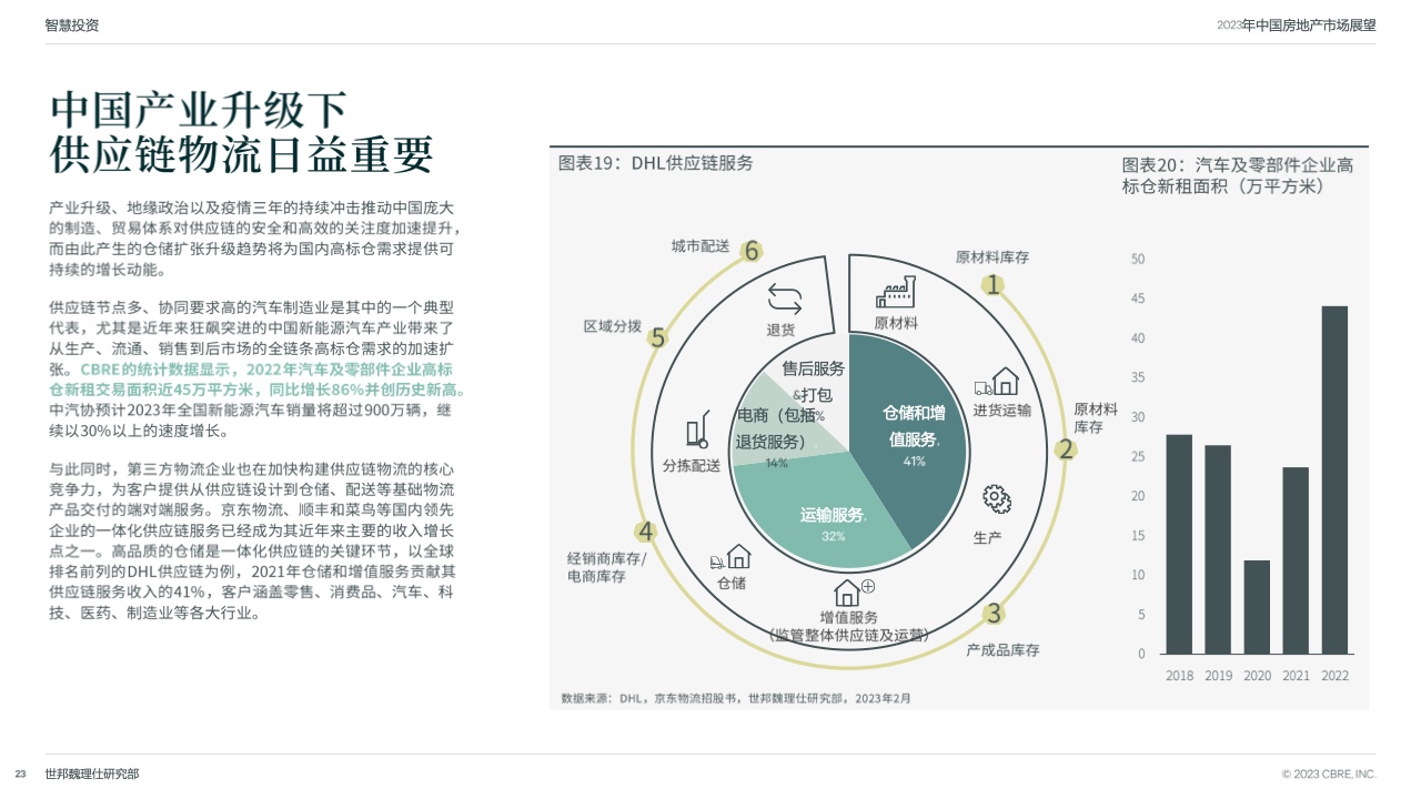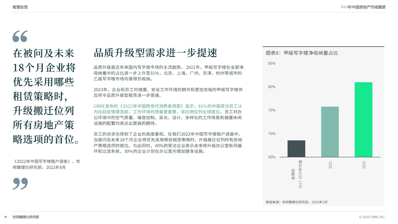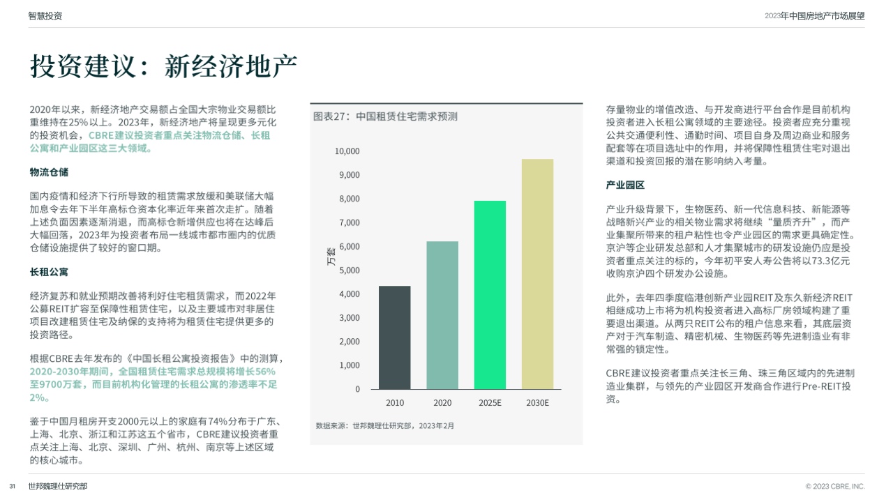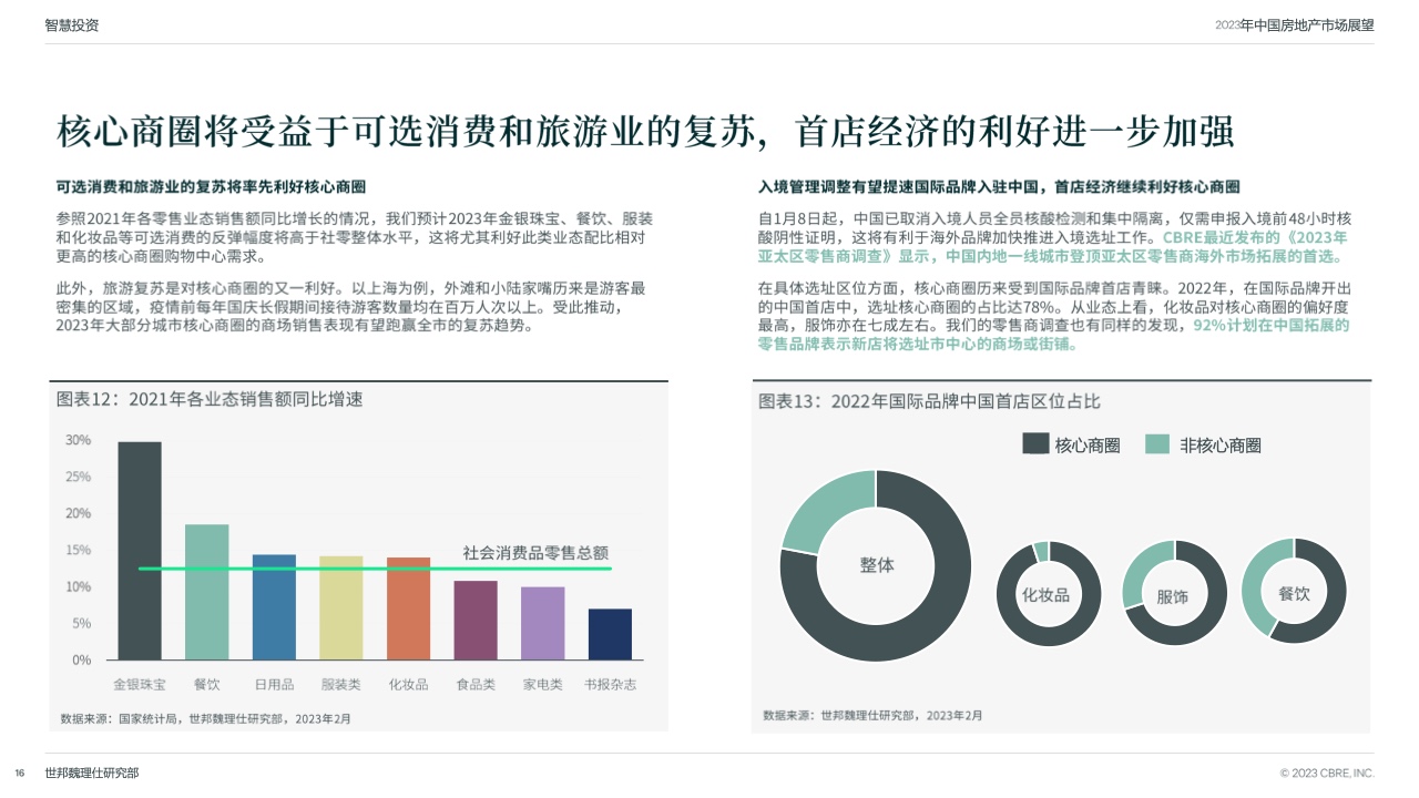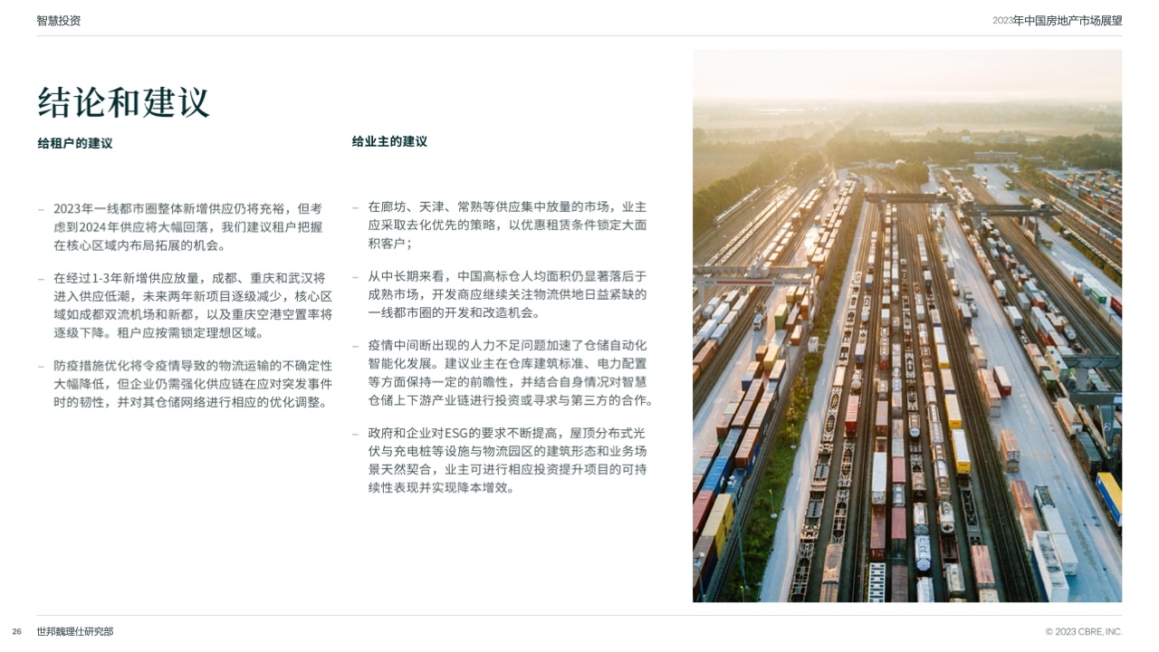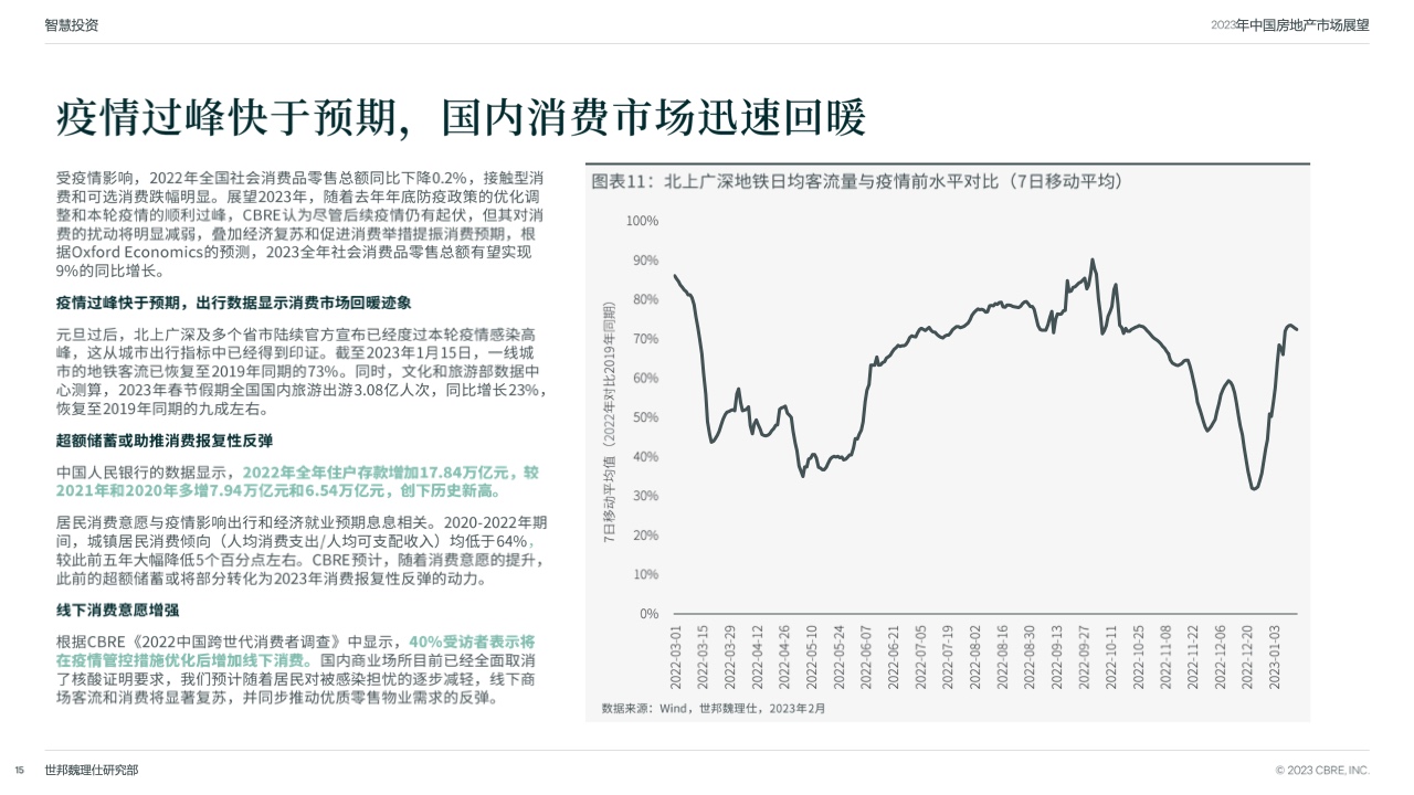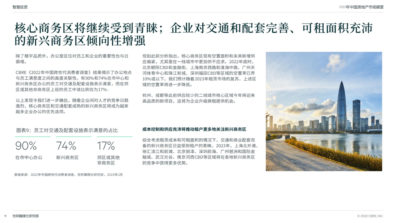 日前,CBRE世邦魏理仕发布《2023年中国房地产市场展望》报告指出,防疫措施的全面优化和全国感染率快速过峰成为2023年中国经济转折的关键动因,并有望大幅度提振商业地产市场表现。 其中,率先受益的消费和旅游市场在带动购物中心租金回温的同时,进一步利好仓储物流市场。经济动能和企业景气度的提升也将使写字楼市场需求企稳回升。与此同时,低息环境为商业地产投资活动的反弹提供了良好的金融环境,投资者情绪明显改善,预计2023年中国商业地产投资市场全年交易额超2500亿元,同比上涨15%-20%。 从写字楼市场看,租赁需求企稳回升。随着企业扩张信心增强,世邦魏理仕预计2023年写字楼租赁需求将于二季度企稳回升,全年有望实现500万平方米的净吸纳量。 受益于宏观经济刺激措施的金融、行业政策环境改善的科技互联网和房地产,以及防疫优化和经济复苏利好的下游服务业的写字楼需求有望出现明显提升。其中,金融和科技将继续担当写字楼租赁需求的主引擎。受外资对中国市场长期信心的利好,制造业仍具增长势能。 同时,随着消费市场回暖,同步推动优质零售物业需求反弹。世邦魏理仕预计,2023年全国主要城市优质零售物业新增供应将突破800万平方米。分区域来看,未来三年仅有16%的新项目位于核心商圈,基于可租面积的稀缺性和品牌强劲的扩店意愿,全国18个主要城市核心商圈的租金有望在2023年实现0.9%的同比增长。整体市场方面,购物中心平均租金将于2024年企稳回升。