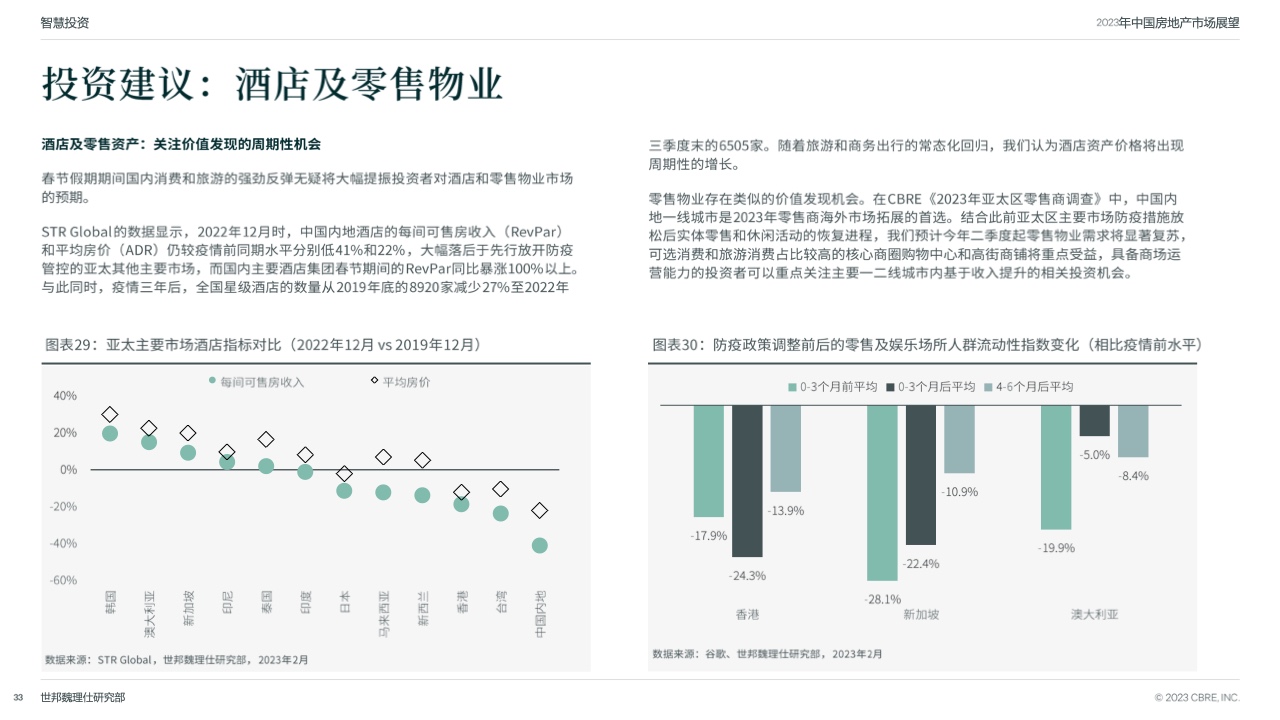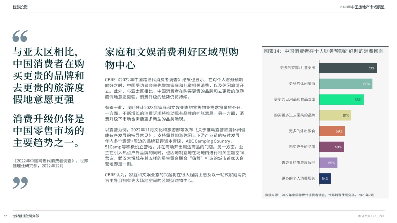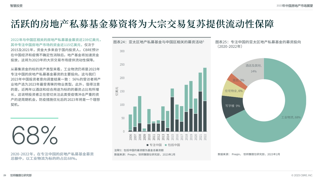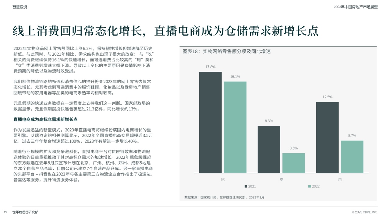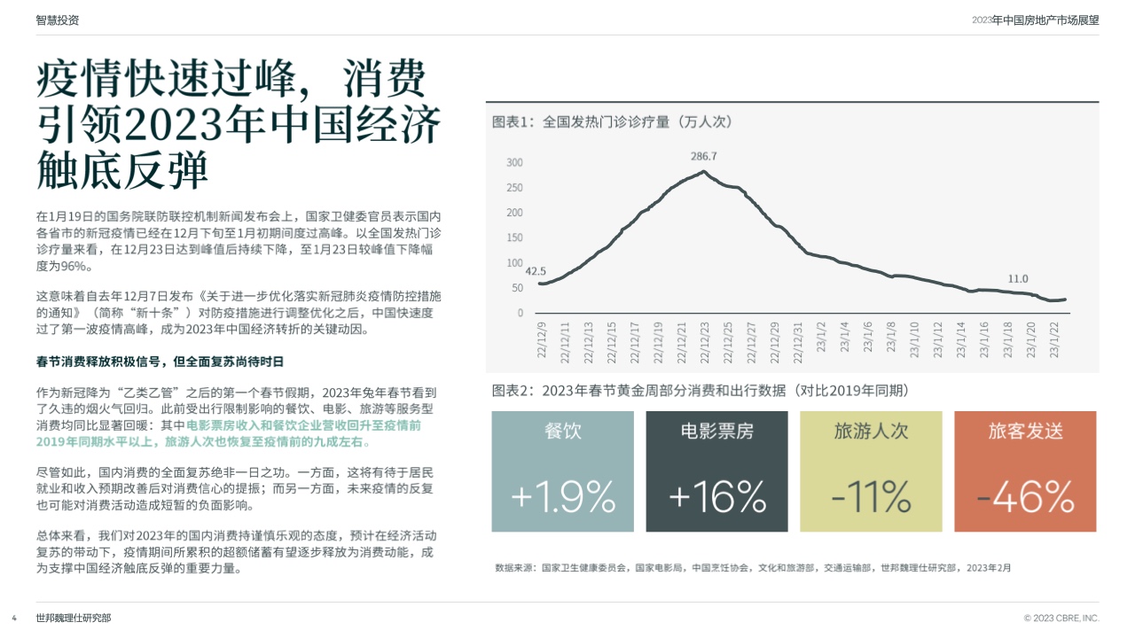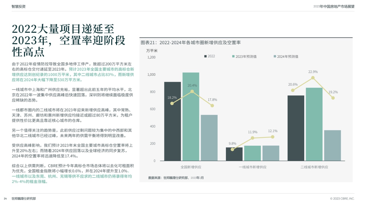 日前,CBRE世邦魏理仕发布《2023年中国房地产市场展望》报告指出,防疫措施的全面优化和全国感染率快速过峰成为2023年中国经济转折的关键动因,并有望大幅度提振商业地产市场表现。 其中,率先受益的消费和旅游市场在带动购物中心租金回温的同时,进一步利好仓储物流市场。经济动能和企业景气度的提升也将使写字楼市场需求企稳回升。与此同时,低息环境为商业地产投资活动的反弹提供了良好的金融环境,投资者情绪明显改善,预计2023年中国商业地产投资市场全年交易额超2500亿元,同比上涨15%-20%。 从写字楼市场看,租赁需求企稳回升。随着企业扩张信心增强,世邦魏理仕预计2023年写字楼租赁需求将于二季度企稳回升,全年有望实现500万平方米的净吸纳量。 受益于宏观经济刺激措施的金融、行业政策环境改善的科技互联网和房地产,以及防疫优化和经济复苏利好的下游服务业的写字楼需求有望出现明显提升。其中,金融和科技将继续担当写字楼租赁需求的主引擎。受外资对中国市场长期信心的利好,制造业仍具增长势能。 同时,随着消费市场回暖,同步推动优质零售物业需求反弹。世邦魏理仕预计,2023年全国主要城市优质零售物业新增供应将突破800万平方米。分区域来看,未来三年仅有16%的新项目位于核心商圈,基于可租面积的稀缺性和品牌强劲的扩店意愿,全国18个主要城市核心商圈的租金有望在2023年实现0.9%的同比增长。整体市场方面,购物中心平均租金将于2024年企稳回升。